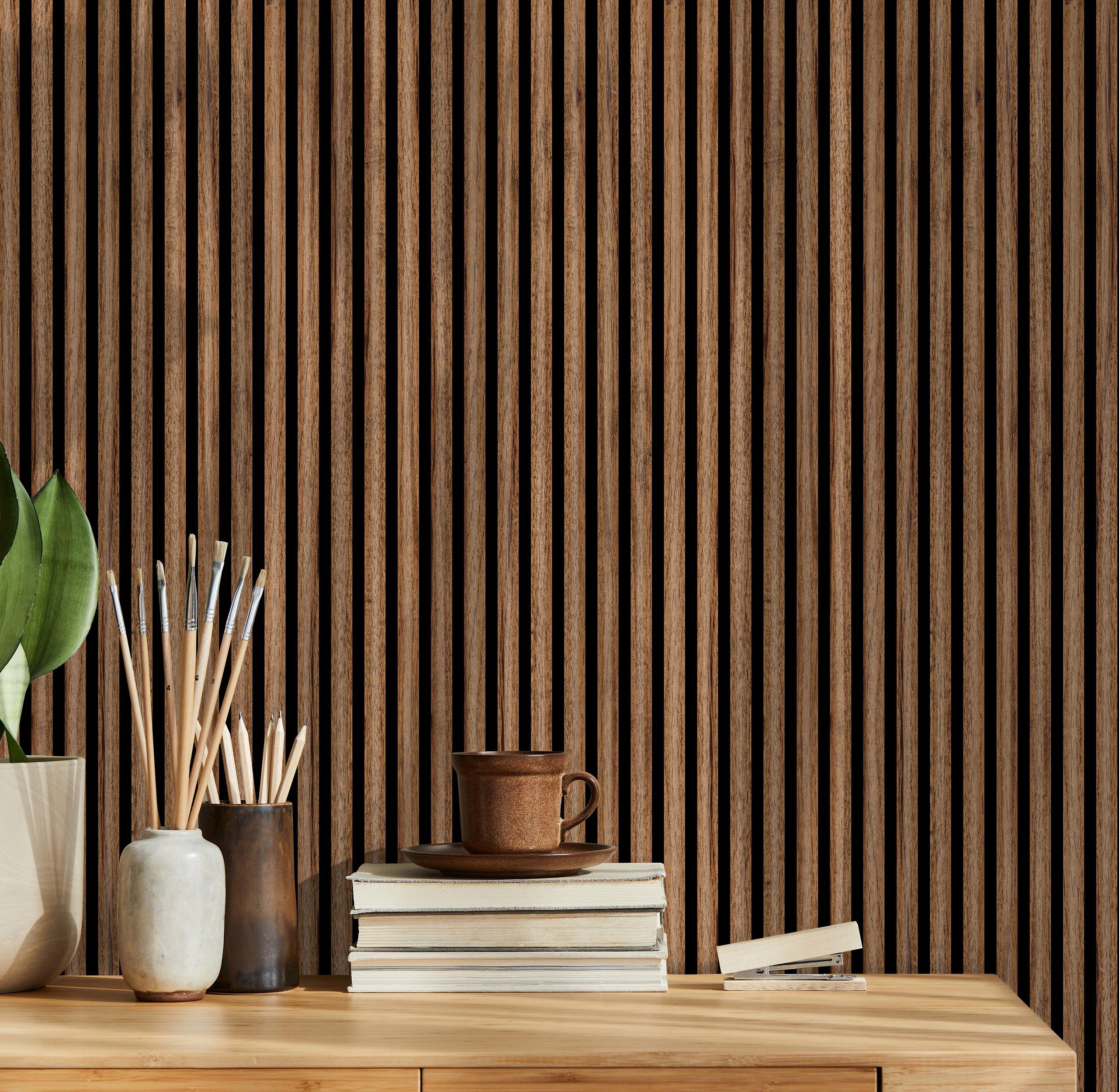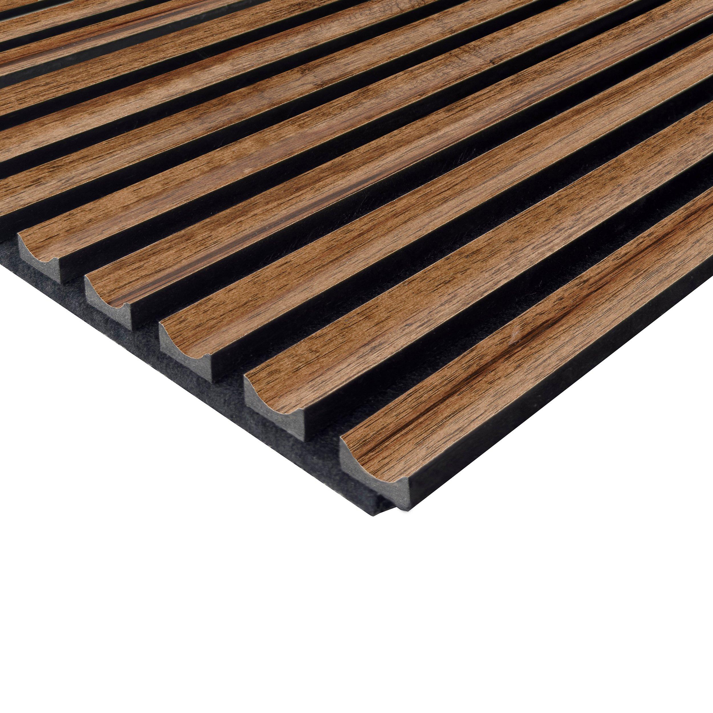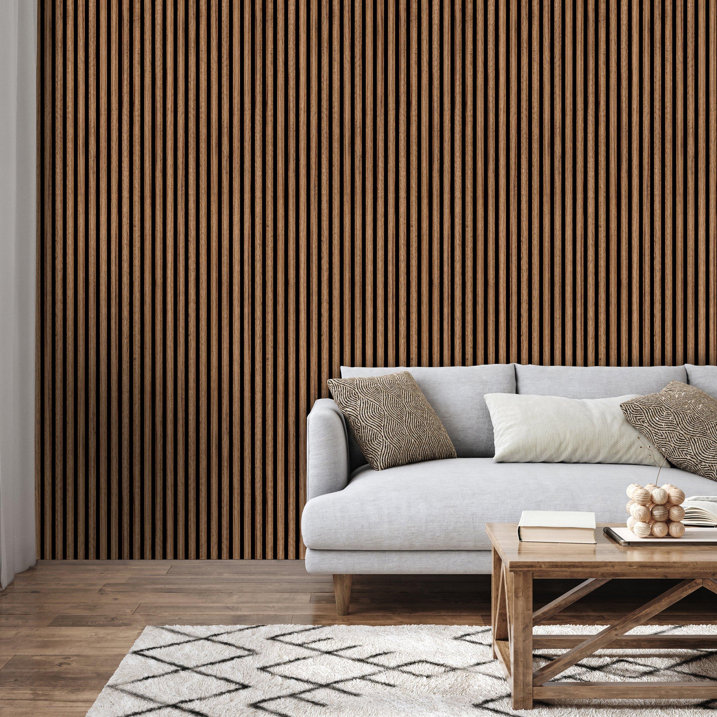Acoustic Wall Panels are made up of recycled PET panel backer, MDF slat with real wood veneer. Black acoustic backing with real wood veneer give a modern and trendy look for any room. With a quick and easy install, transform any space in a day. Perfect for walls, ceilings, and even cabinet paneling. The acoustic backing dampens the reflective noises within a home, office, or commercial space.