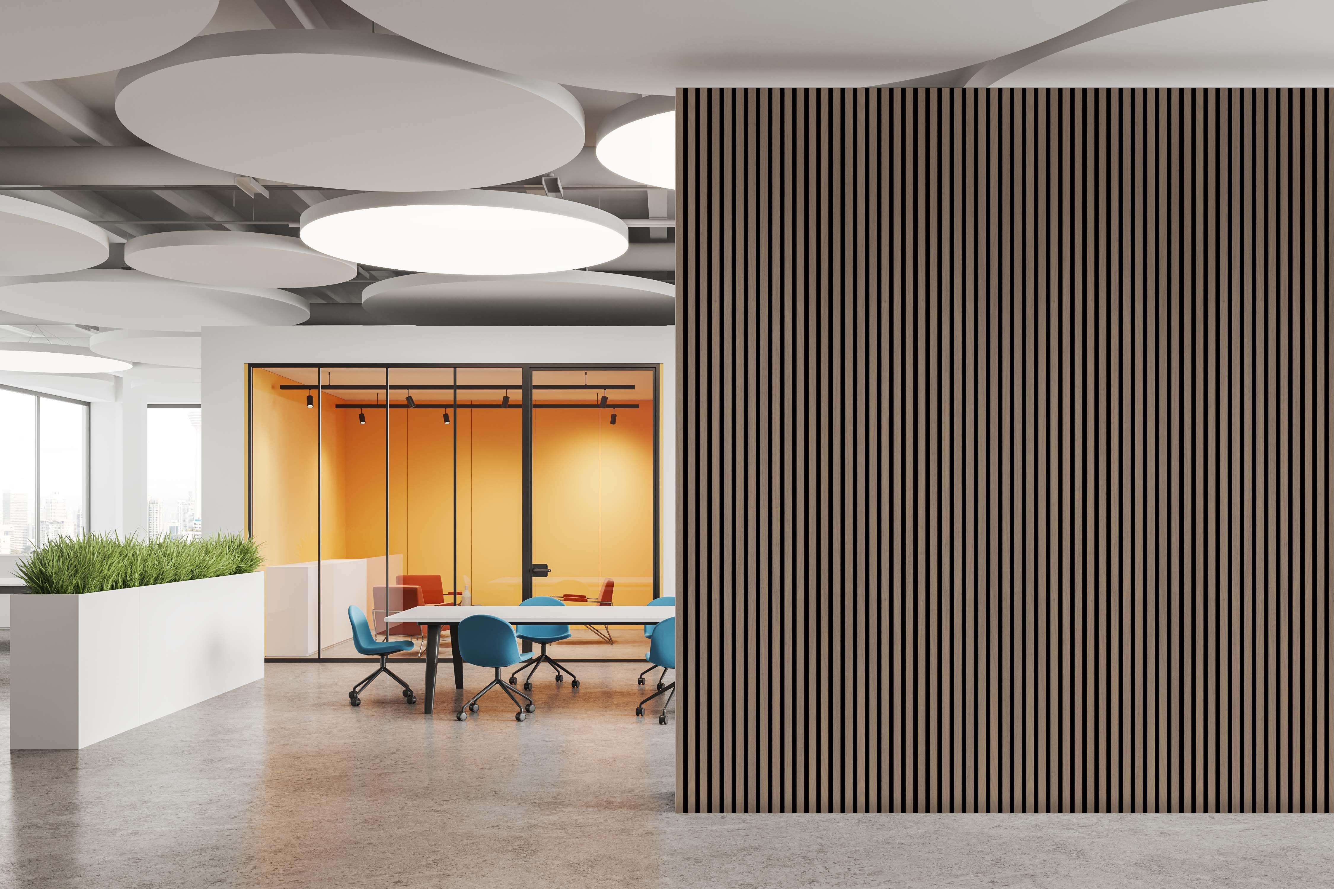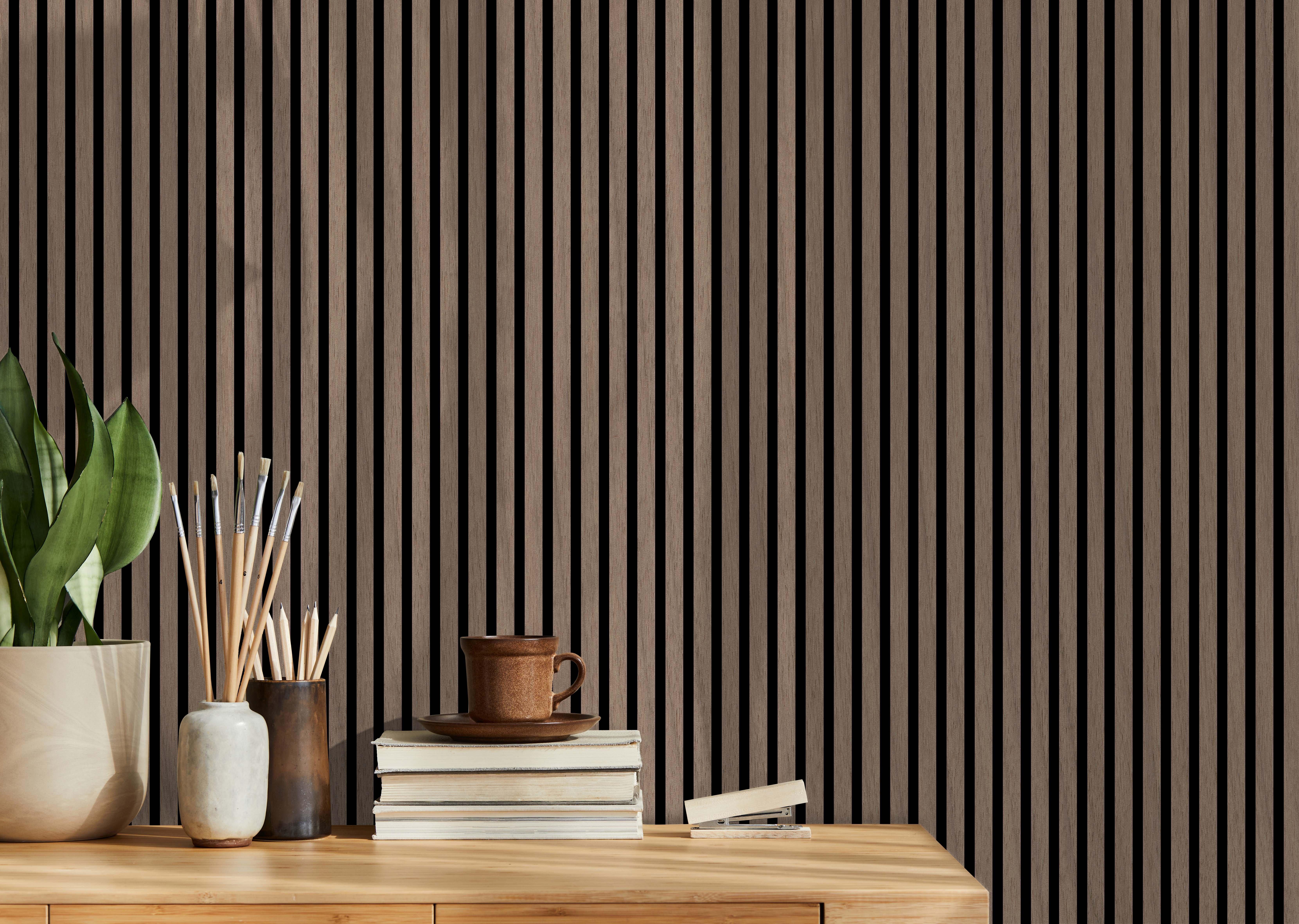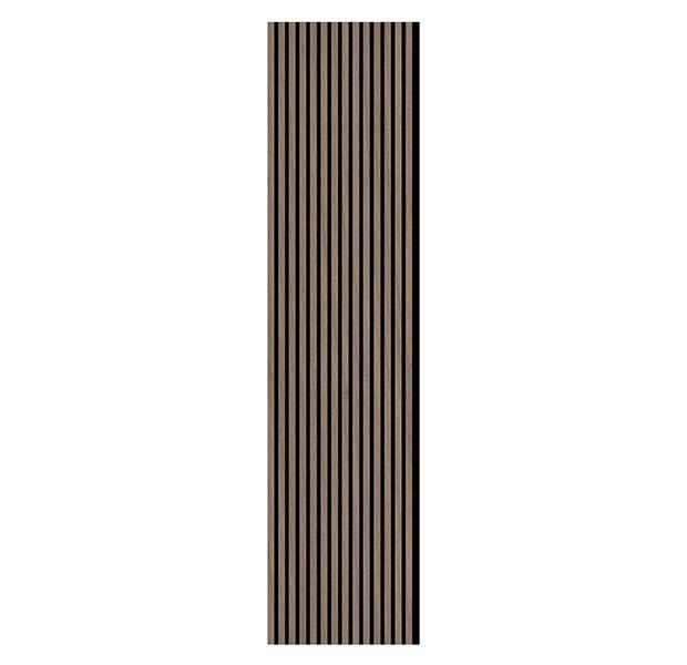 Acoustic Wall Panels are made up of recycled PET panel backer, MDF slat with real wood veneer. Black acoustic backing with real wood veneer give a modern and trendy look for any room. With a quick and easy install, transform any space in a day. Perfect for walls, ceilings, and even cabinet paneling. The acoustic backing dampens the reflective noises within a home, office, or commercial space.