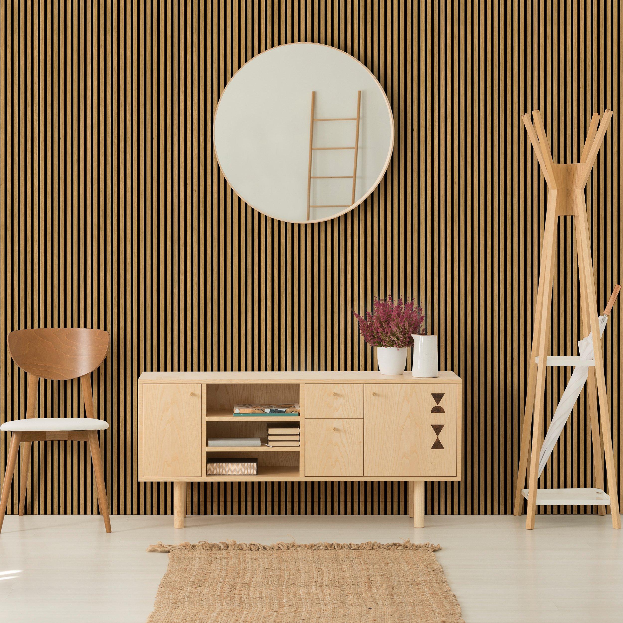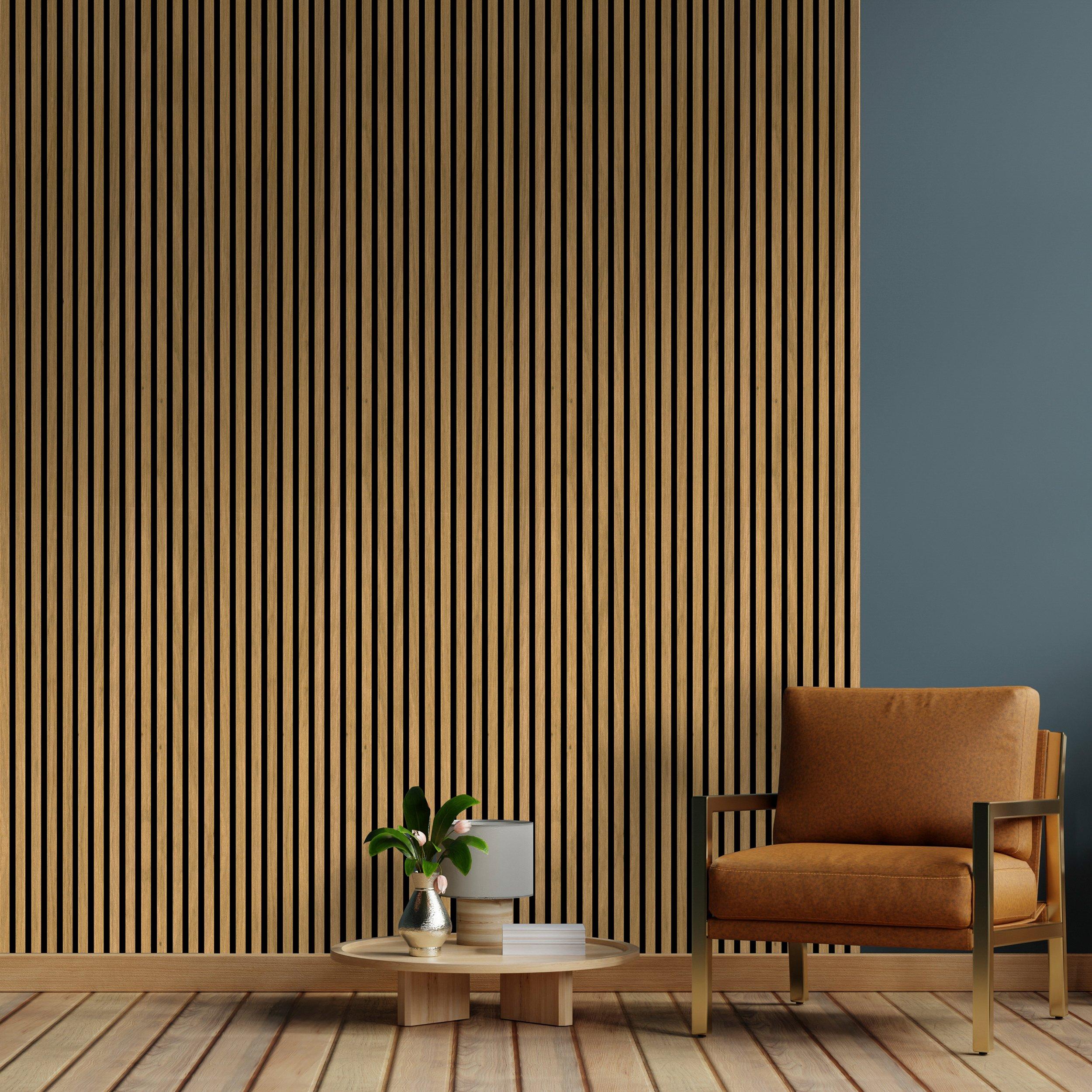 Acoustic Wall Panels are made up of recycled PET panel backer, MDF slat with real wood veneer. Black acoustic backing with real wood veneer give a modern and trendy look for any room. With a quick and easy install, transform any space in a day. Perfect for walls, ceilings, and even cabinet paneling. The acoustic backing dampens the reflective noises within a home, office, or commercial space.