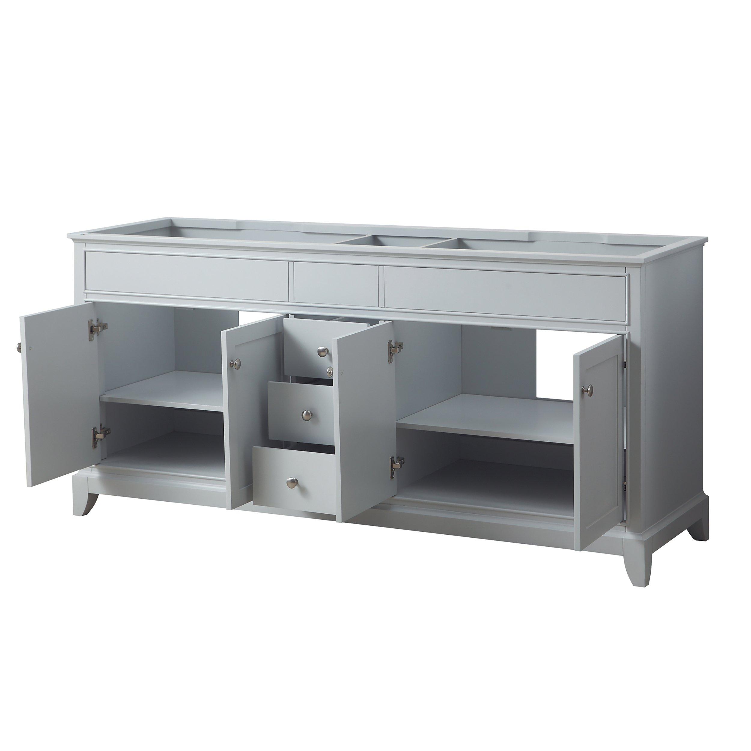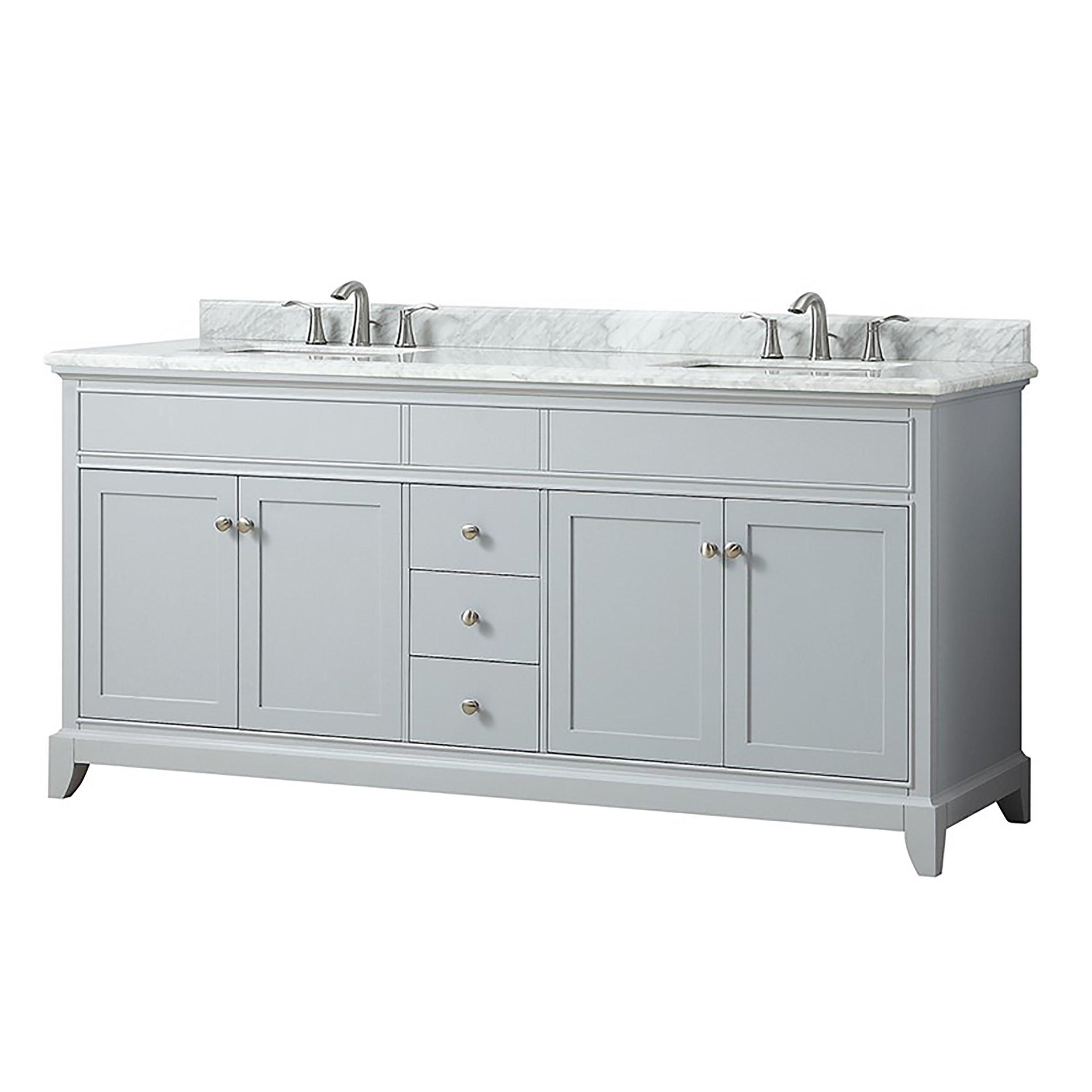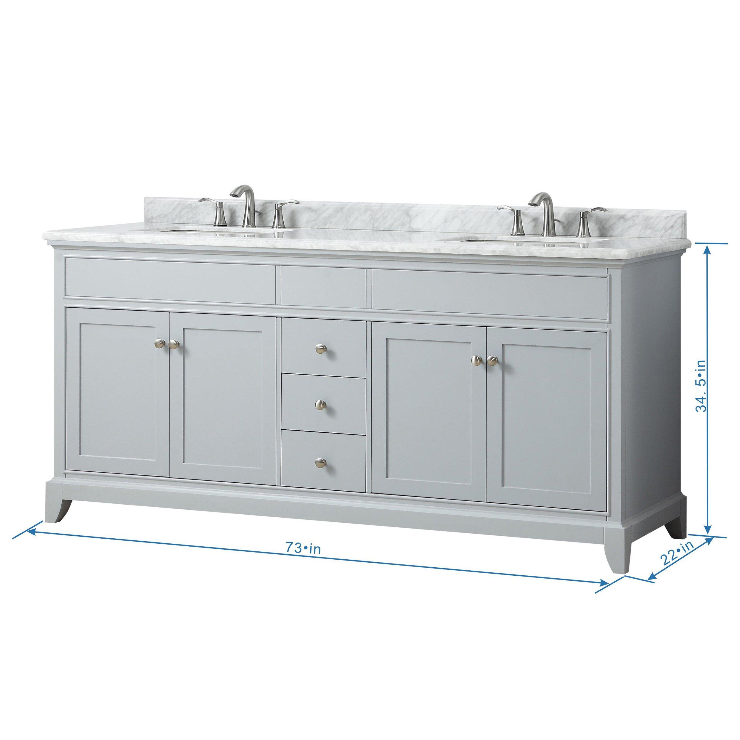 The Aurora 73 in. Vanity with Carrara Marble Top possesses a timeless aesthetic, establishing it as a versatile choice to anchor multiple bathroom settings. This 73in. vanity ensemble features a light gray finish with brushed nickel hardware. It announces its quality with its solid poplar wood frame and soft-close storage compartments. The Aurora vanity combination includes a Carrara marble top and single rectangular undermount sink. Match the vanity with the coordinating mirror and faucet, and Aurora will delight for years to come.• Freestanding Installation• Soft Closing Doors & Drawers• Rectangular Undermount Sink• Adjustable Height Levelers• Warranty: 1 Year Limited• Faucet Sold SeparatelyVANITY DETAILS• Cabinet Color: Light Gray• Cabinet Materials: Hardwood & MDF• Vanity Top Materials: Carrara White Marble• Number of Drawers: 3• Number of Doors: 4• Number of Shelves: 2