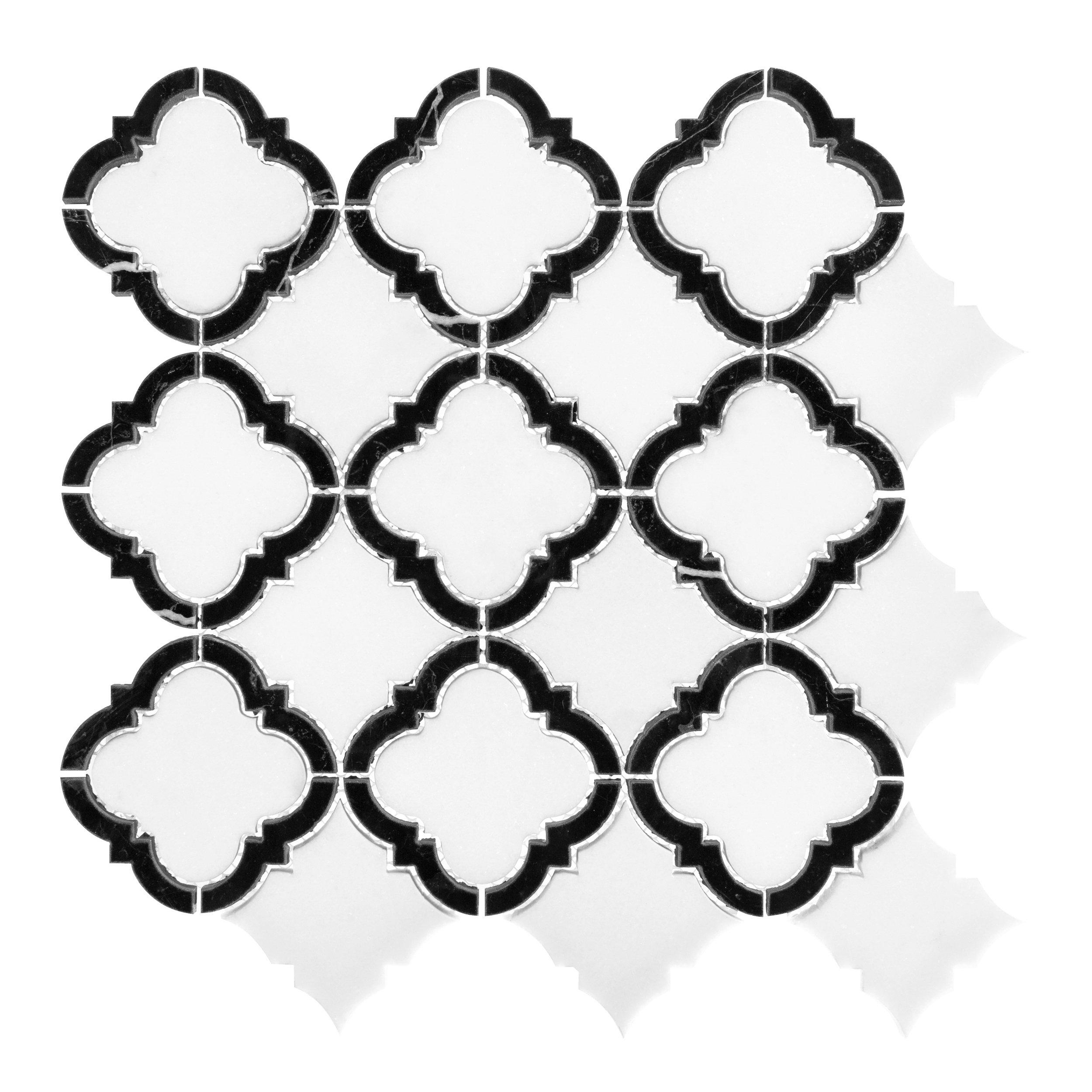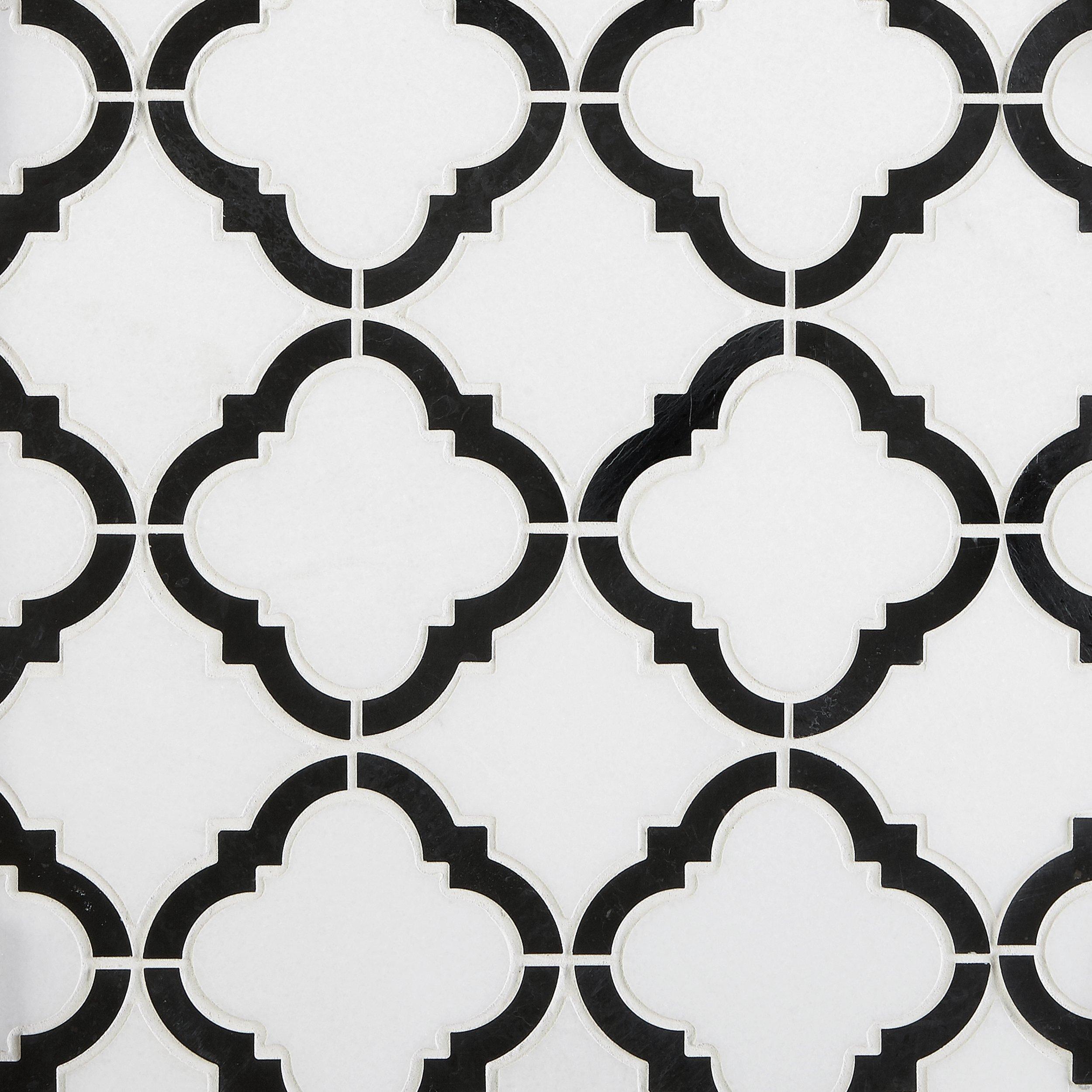 Pool InteriorsCreate a timeless statement with this gorgeous Daphne Thassos Nero Quatrefoil Marble Mosaic. It is easy to clean and makes it an addition to the room that’s both practical and attractive. This 13 x 13 decorative tile comes in white and has a polished or high gloss finish, giving a refined elegance to interior spaces and providing endless design possibilities.