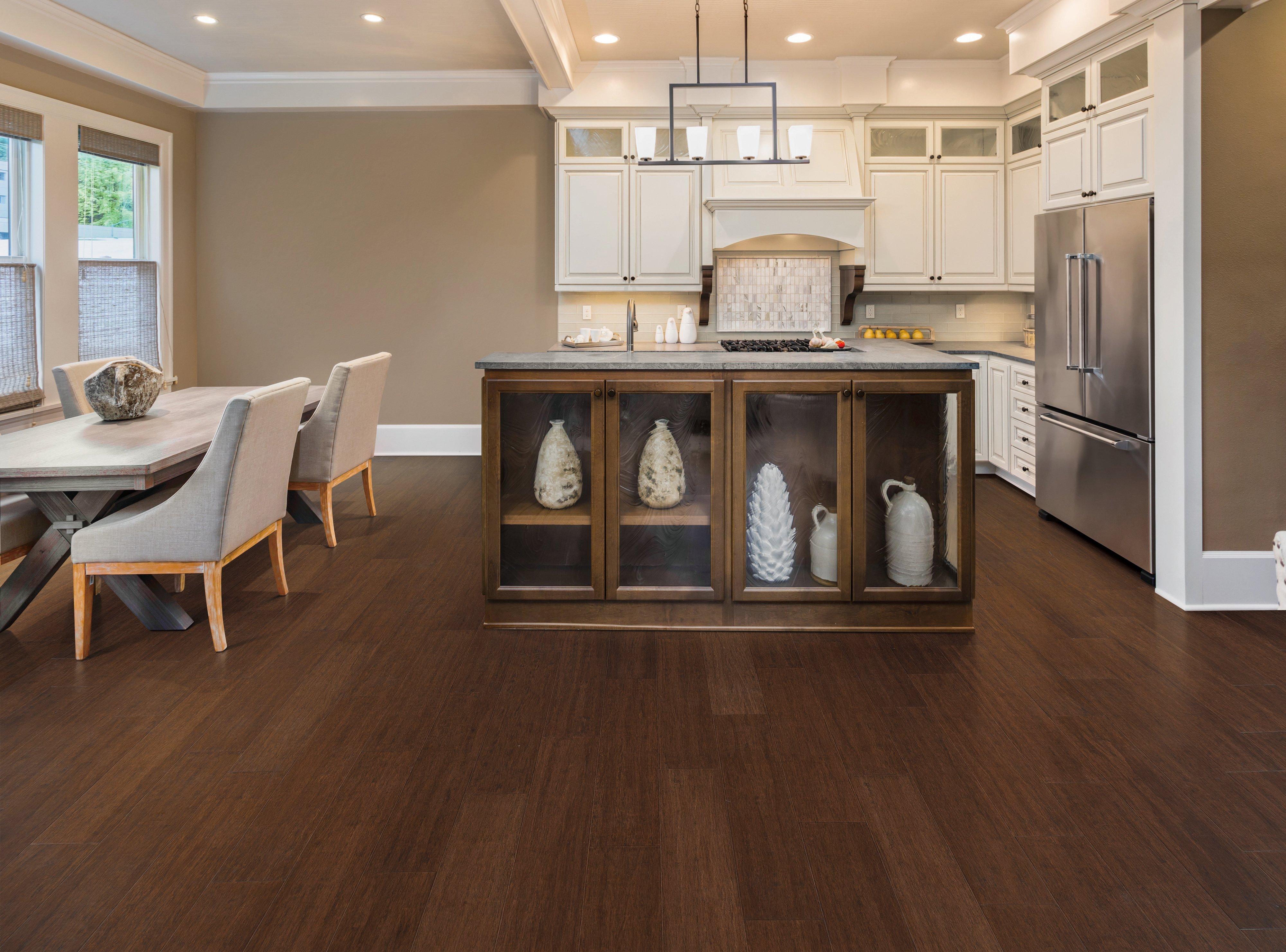 Exclusive to Floor & Decor, 7mm x 5in. AquaGuard Bamboo Amaretto Carbonized Stranded Water Resistant Engineered Bamboo is a water-resistant bamboo flooring that is durable and stylish---its the next generation of bamboo flooring. Strong and water-resistant, AquaGuard Bamboo can go in every room in the house, including kitchens, mudrooms, and even full bathrooms. Plus, with a 25 year residential warranty, its sure to be a long-lasting flooring option for any room.