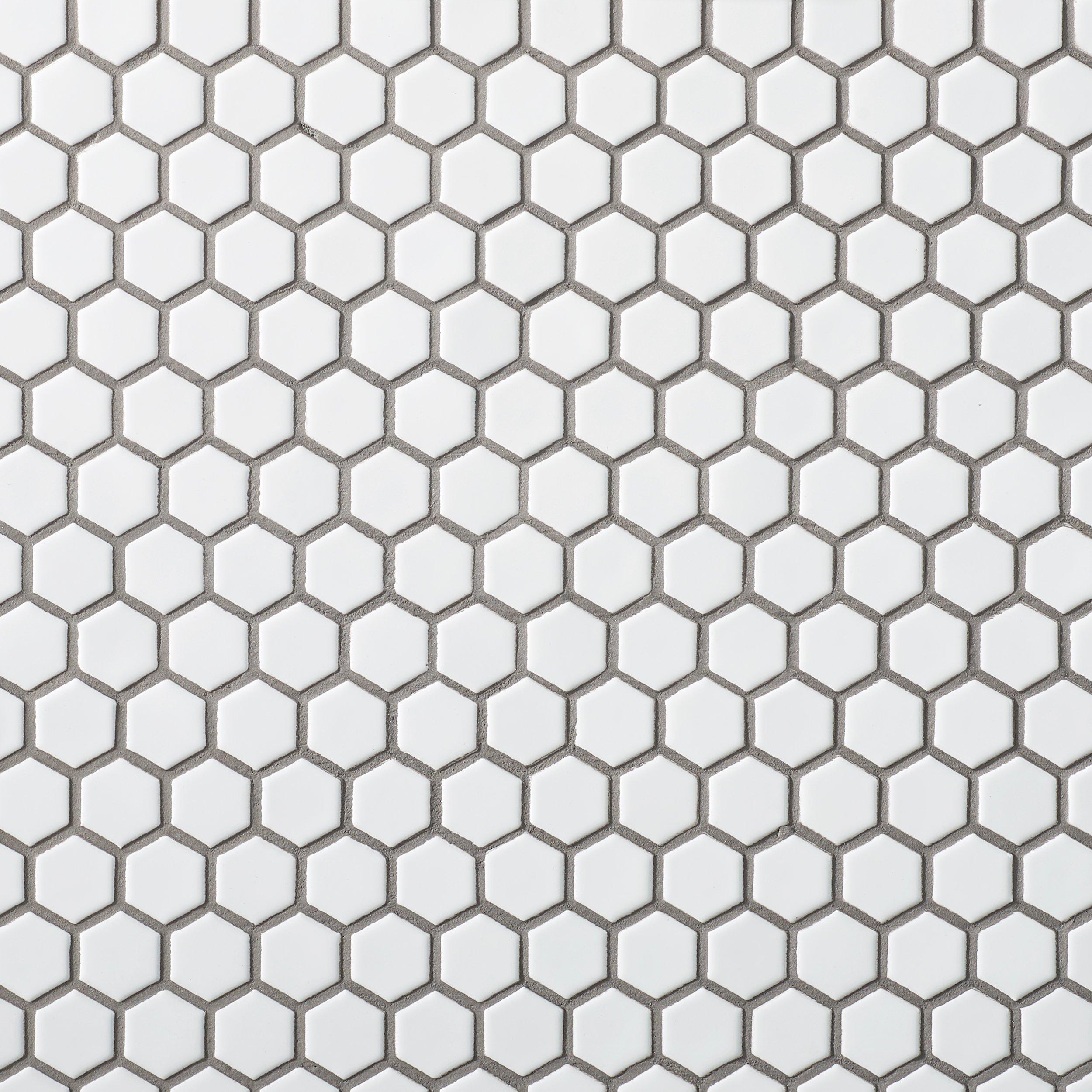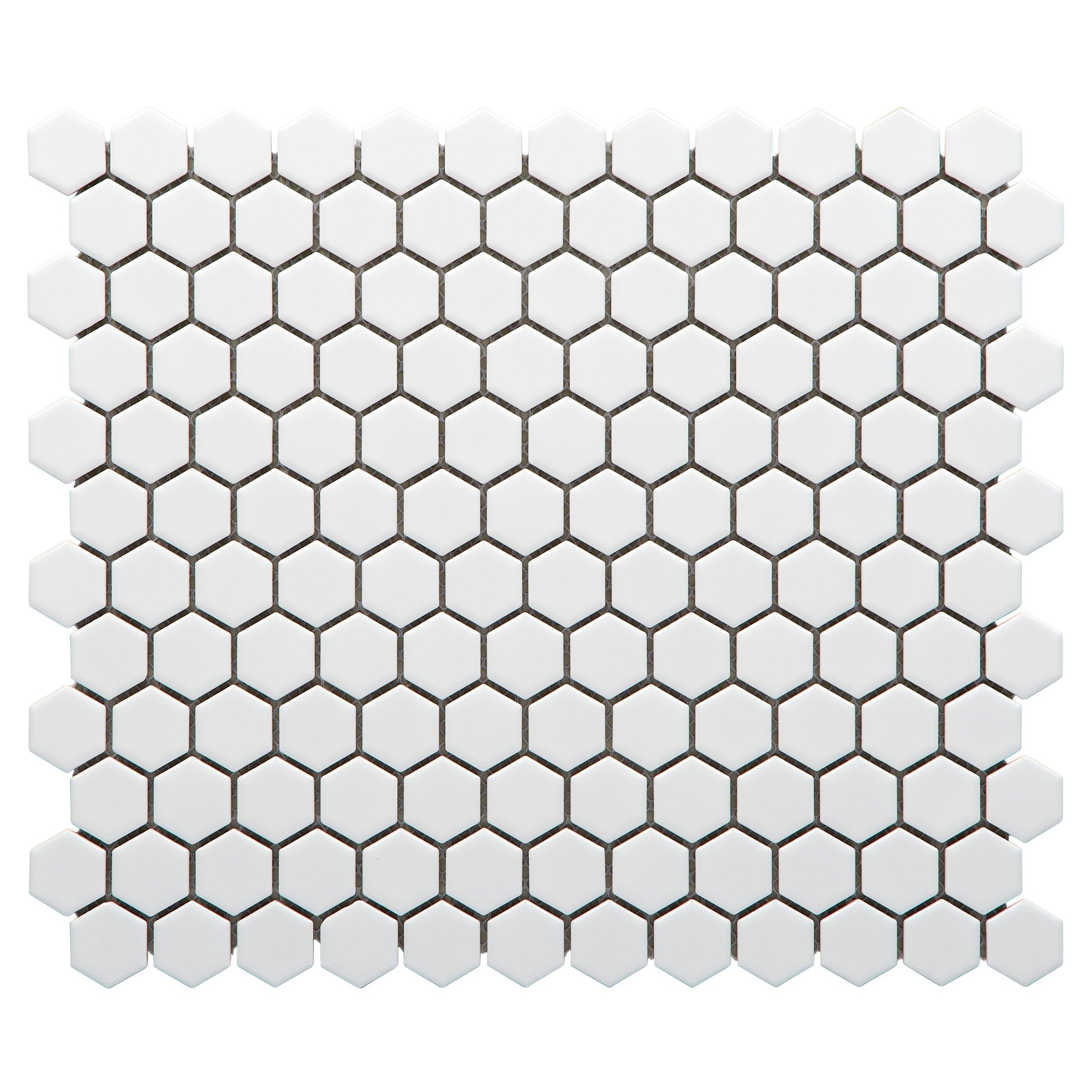 Personalize your space with the White Small Hexagon Polished Porcelain Mosaic. This white matte finish tile will make a great impact in small areas like the bathroom, den, or other overlooked spaces.