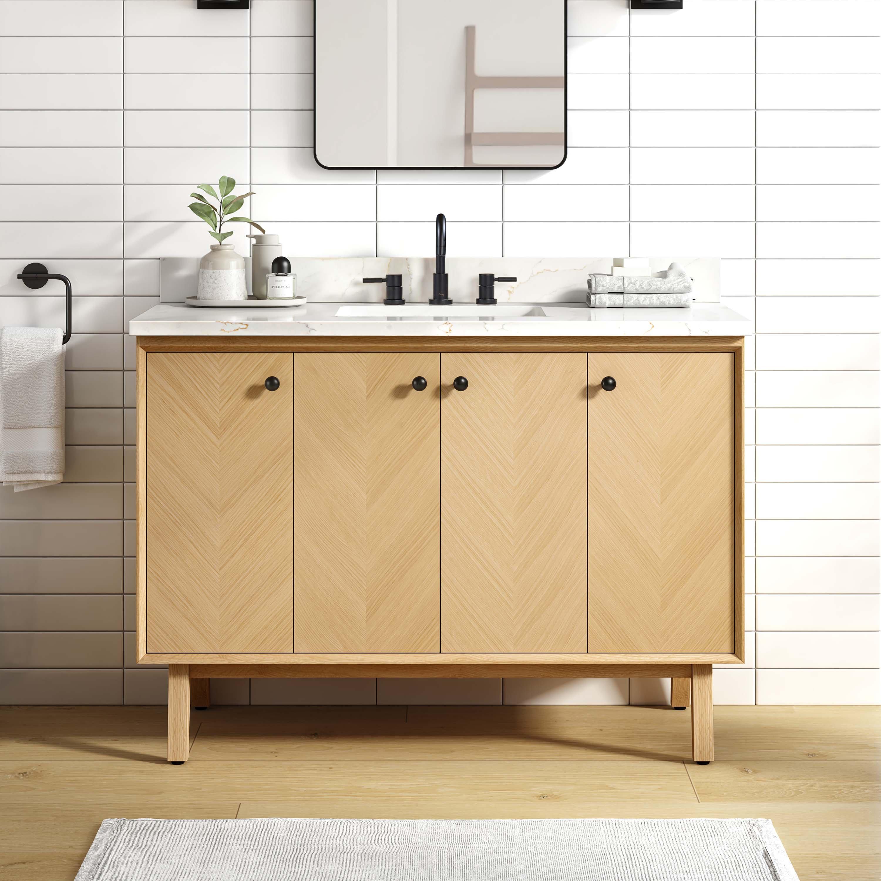 Complete your bathroom with the beautiful Adrian 49 in. Natural Oak Vanity with Calacatta Quartz Top. This freestanding features durable solid wood, mdf cabinets in stunning natural with a white quartz vanity top and matte black hardware. A charming single undermount sink in brilliant white is included. The Adrian 49 in. Natural Oak Vanity with Calacatta Quartz Top is a versatile choice to customize multiple bathroom settings.