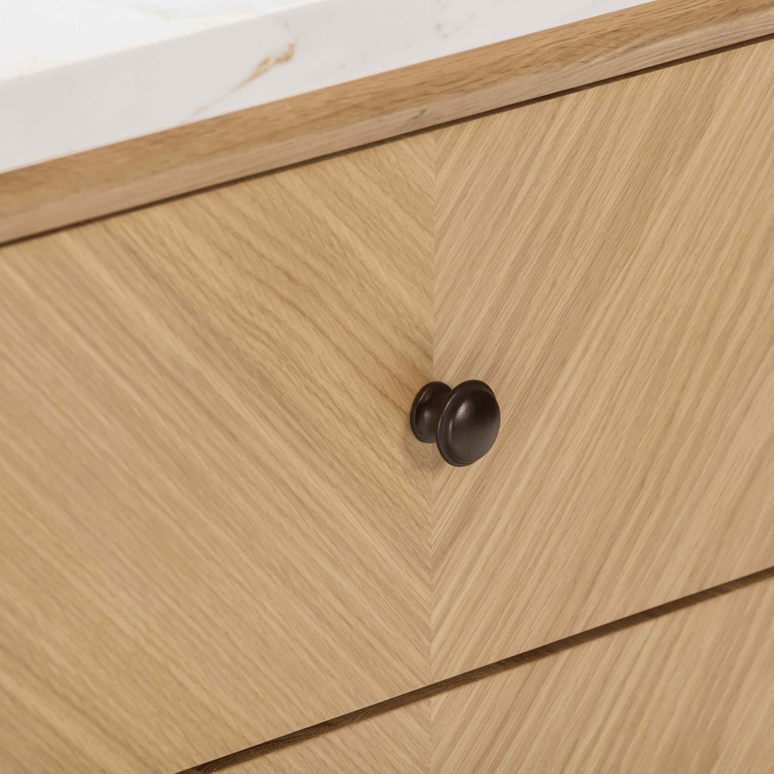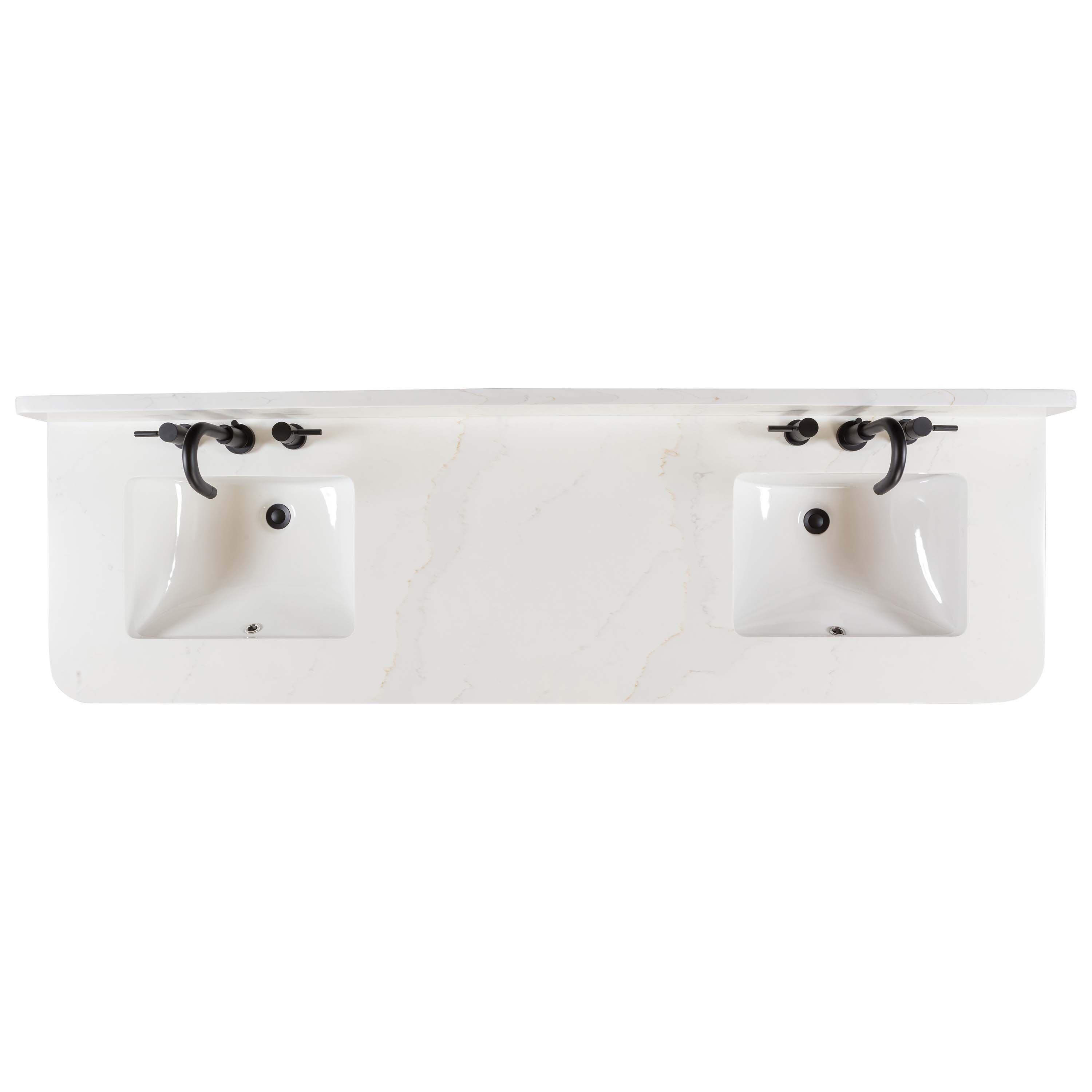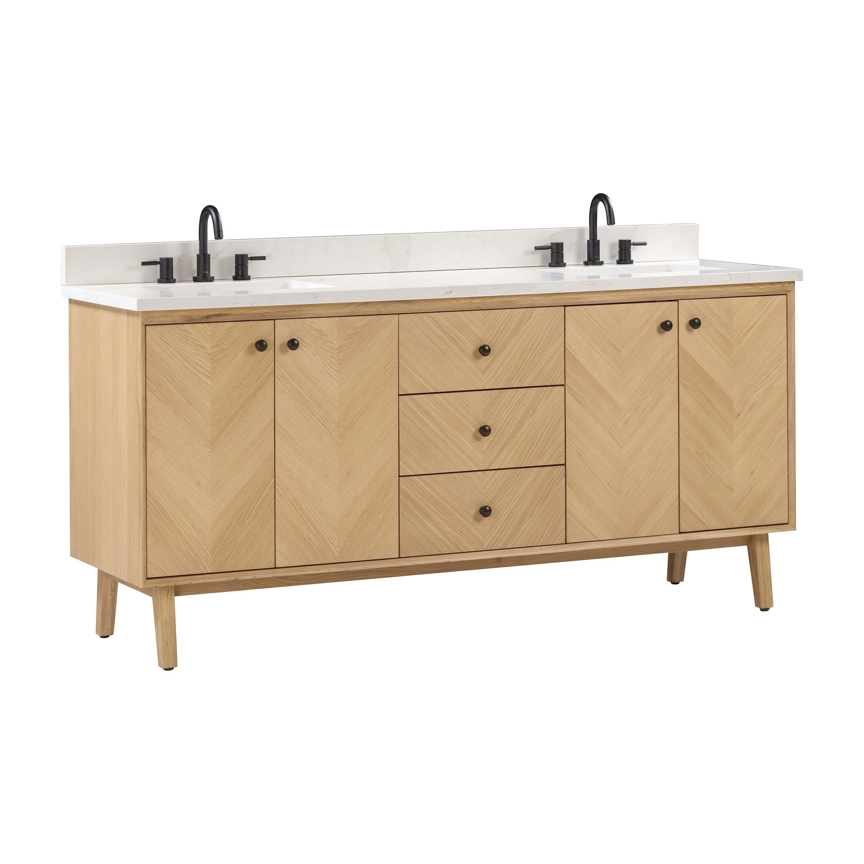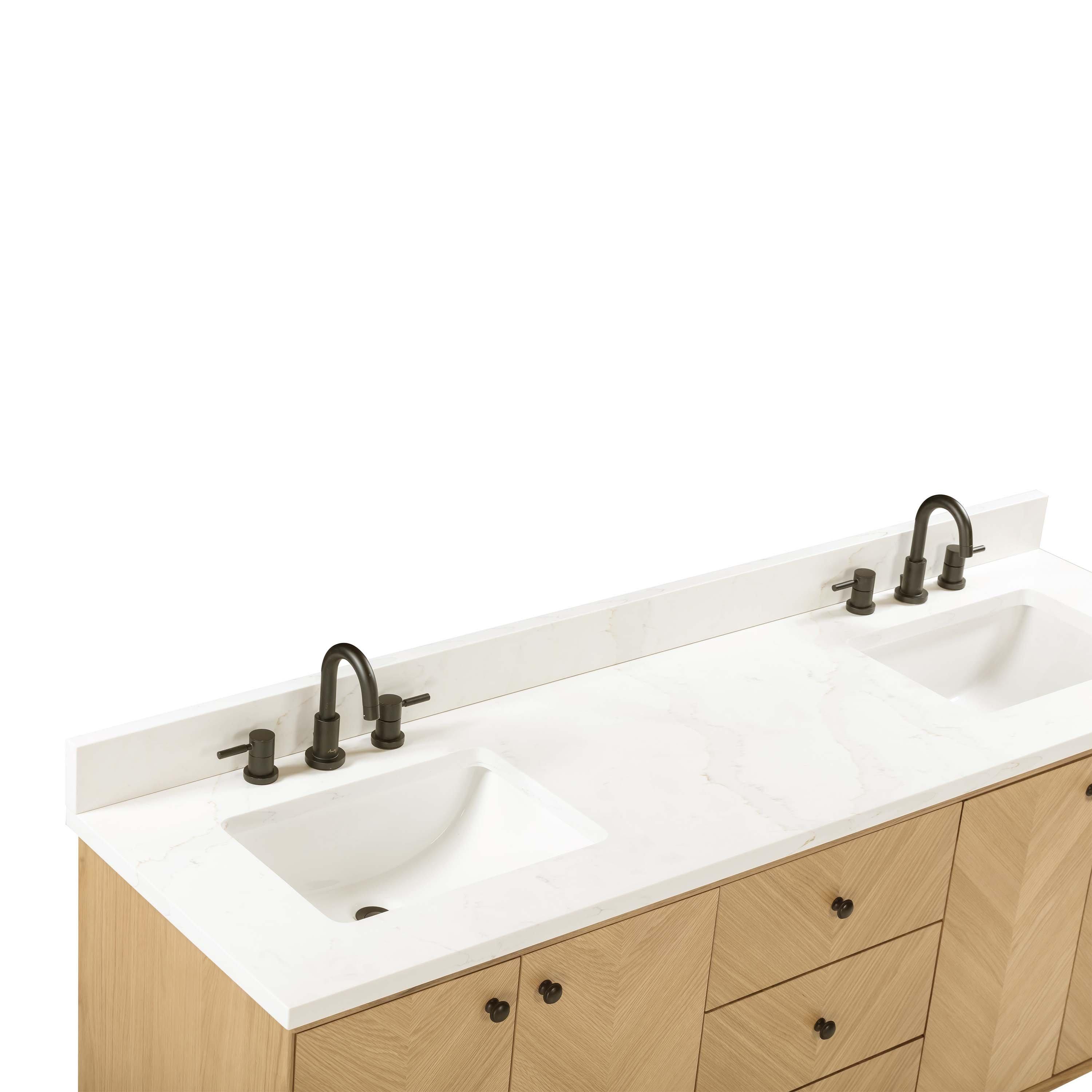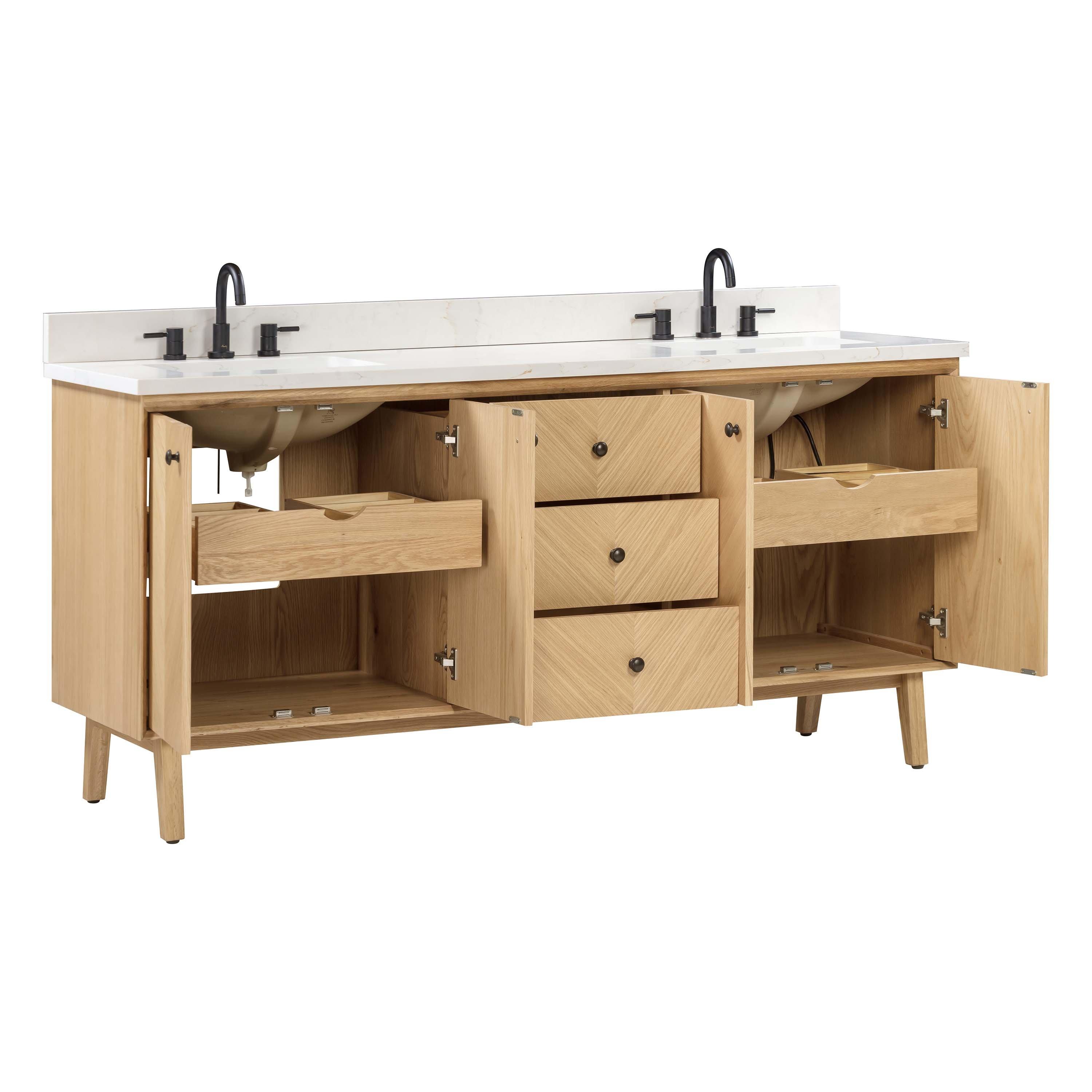 Tailor the look of your bathroom with the Adrian 72 in. Natural Oak Vanity with Calacatta Quartz Top featuring gorgeous solid wood, mdf in natural with 4 doors, 5 drawers, and 0 shelves. This piece is completed with beautiful matte black hardware and a double undermount white sink. The Adrian 72 in. Natural Oak Vanity with Calacatta Quartz Top is a stunning addition to any bathroom setting.