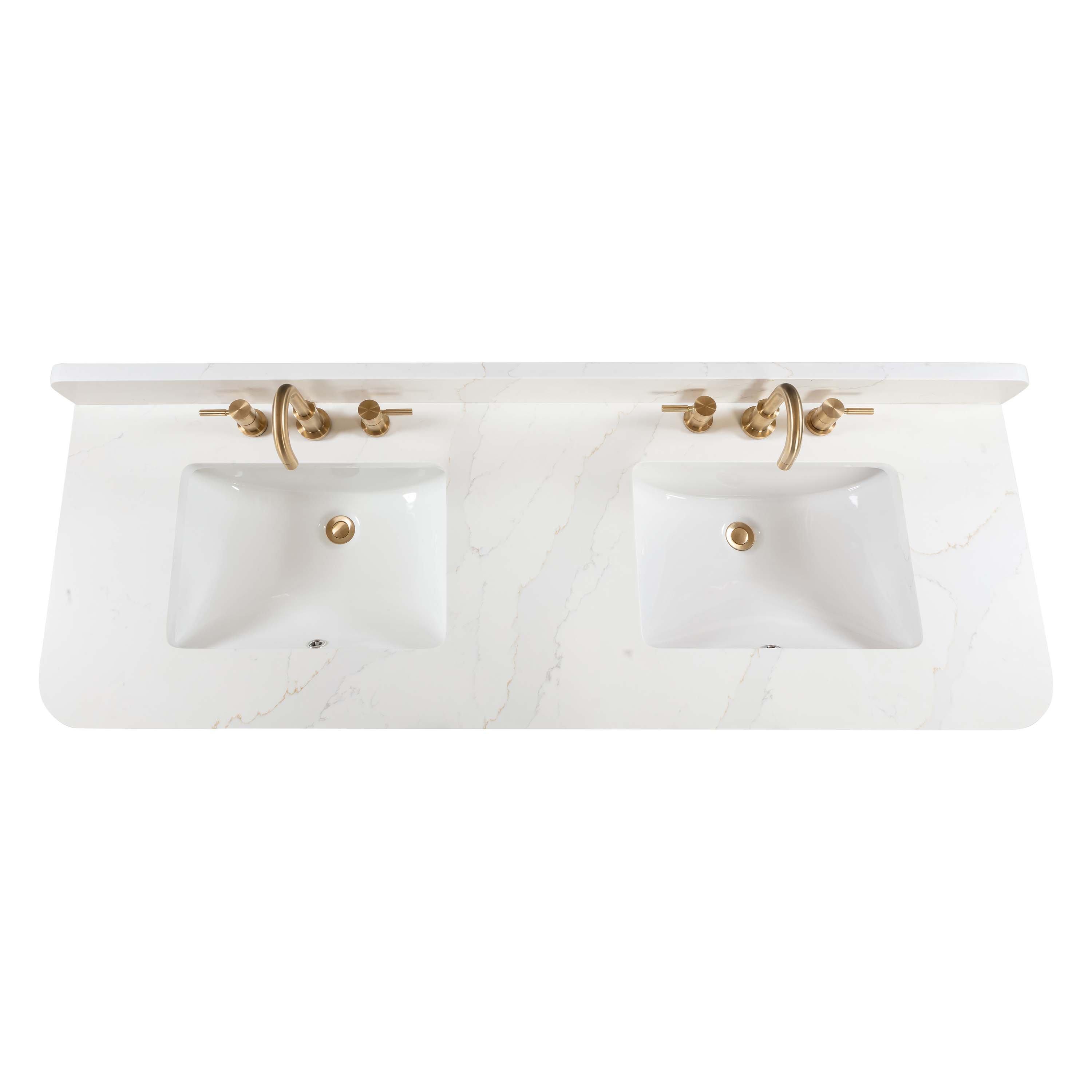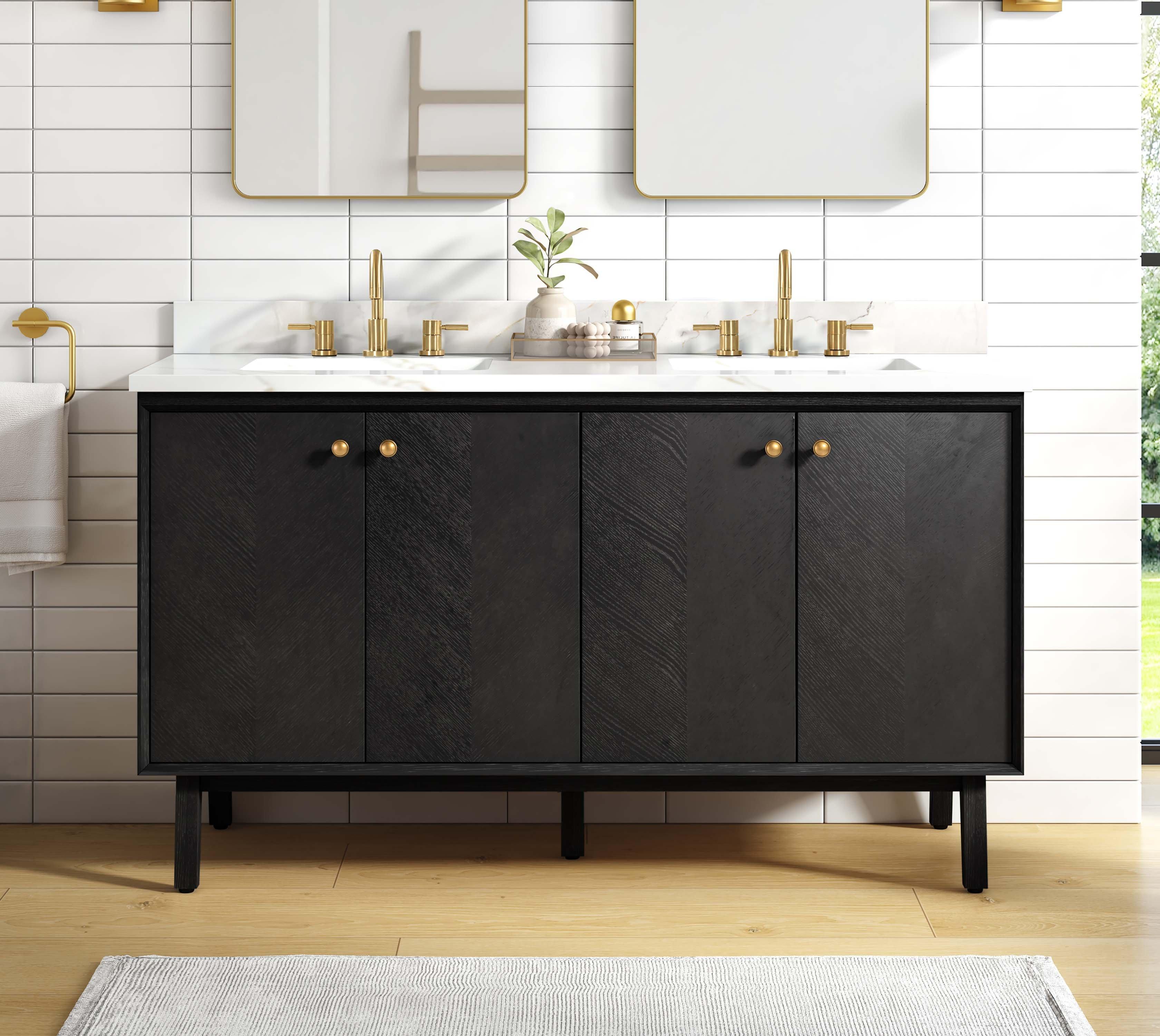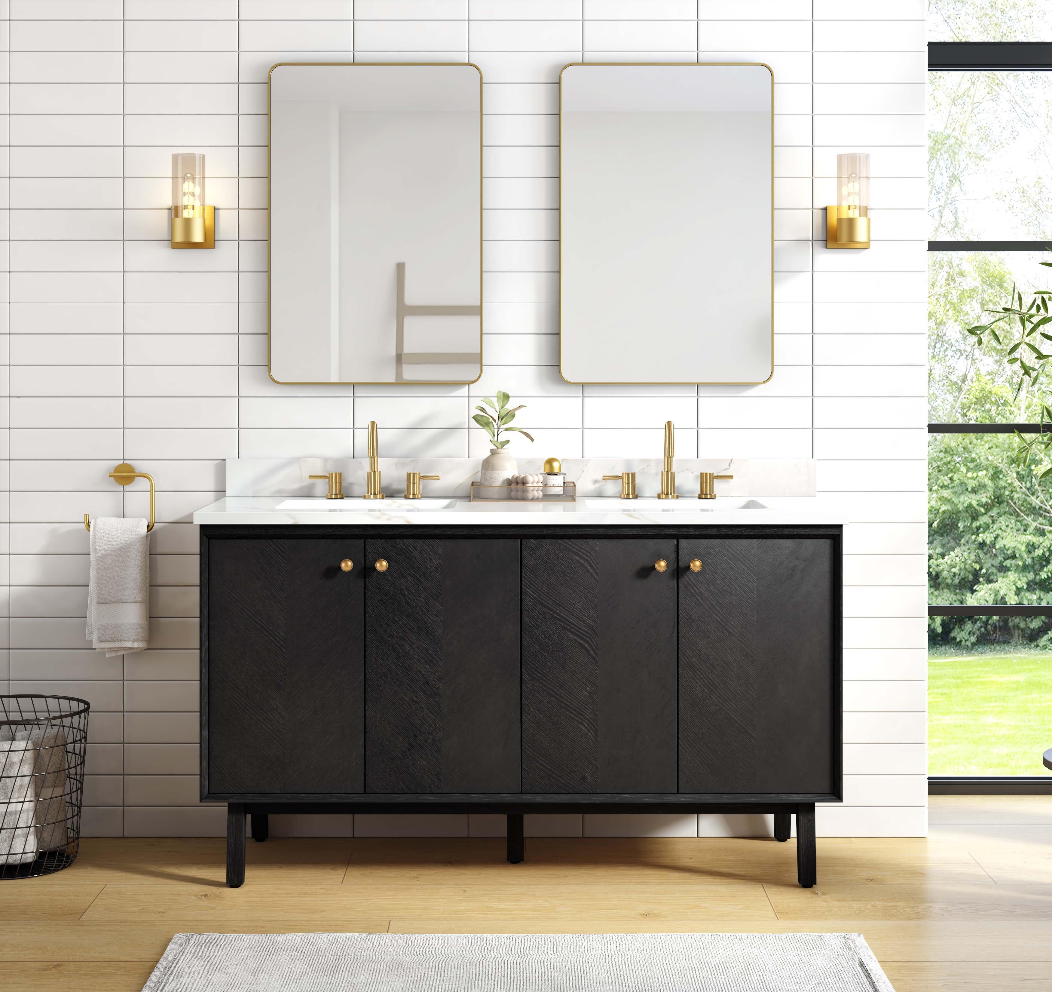 Tailor the look of your bathroom with the Adrian 61 in. Black Oak Vanity with Calacatta Quartz Top featuring gorgeous solid wood, mdf in black with 4 doors, 2 drawers, and 0 shelves. This piece is completed with beautiful matte gold hardware and a double undermount white sink. The Adrian 61 in. Black Oak Vanity with Calacatta Quartz Top is a stunning addition to any bathroom setting.
