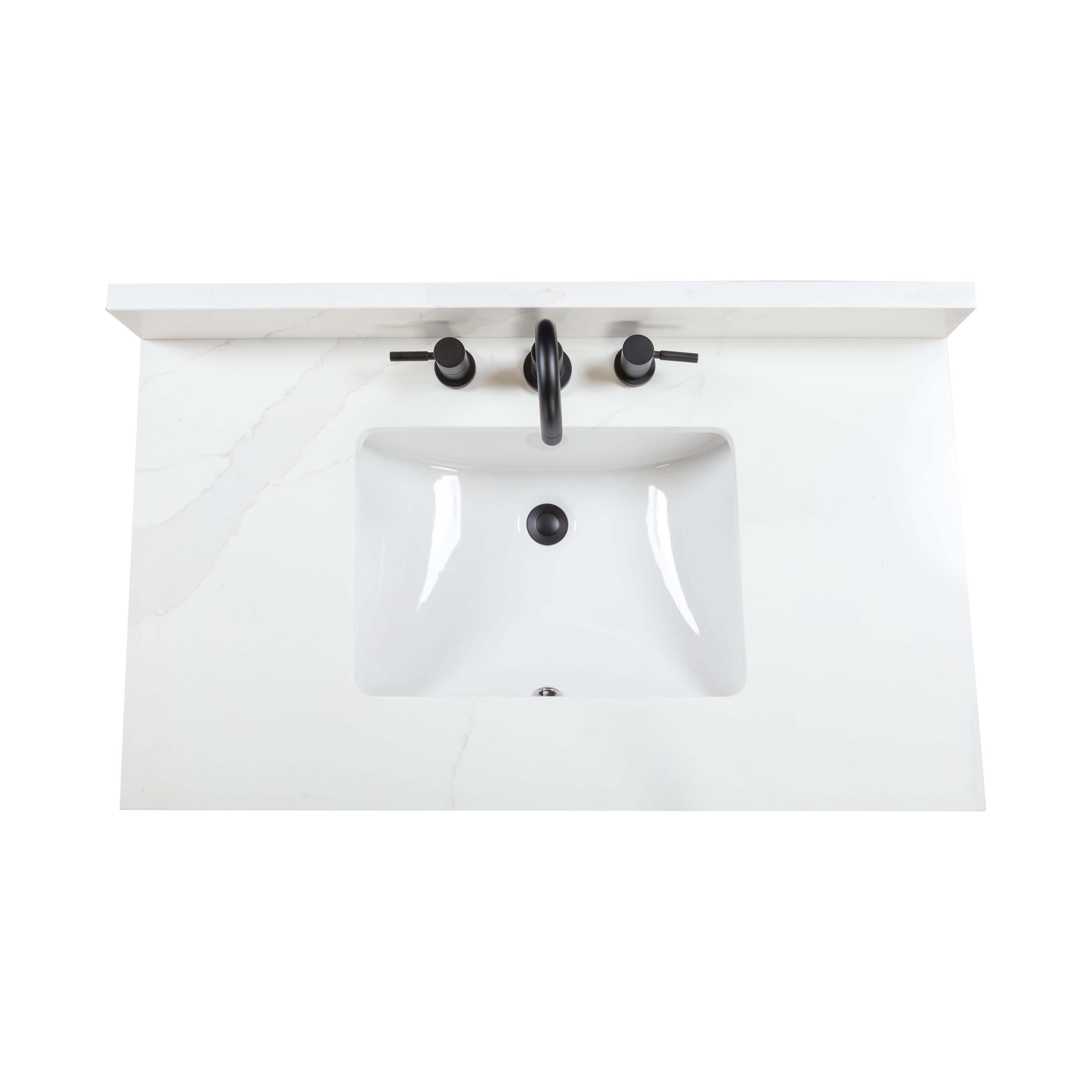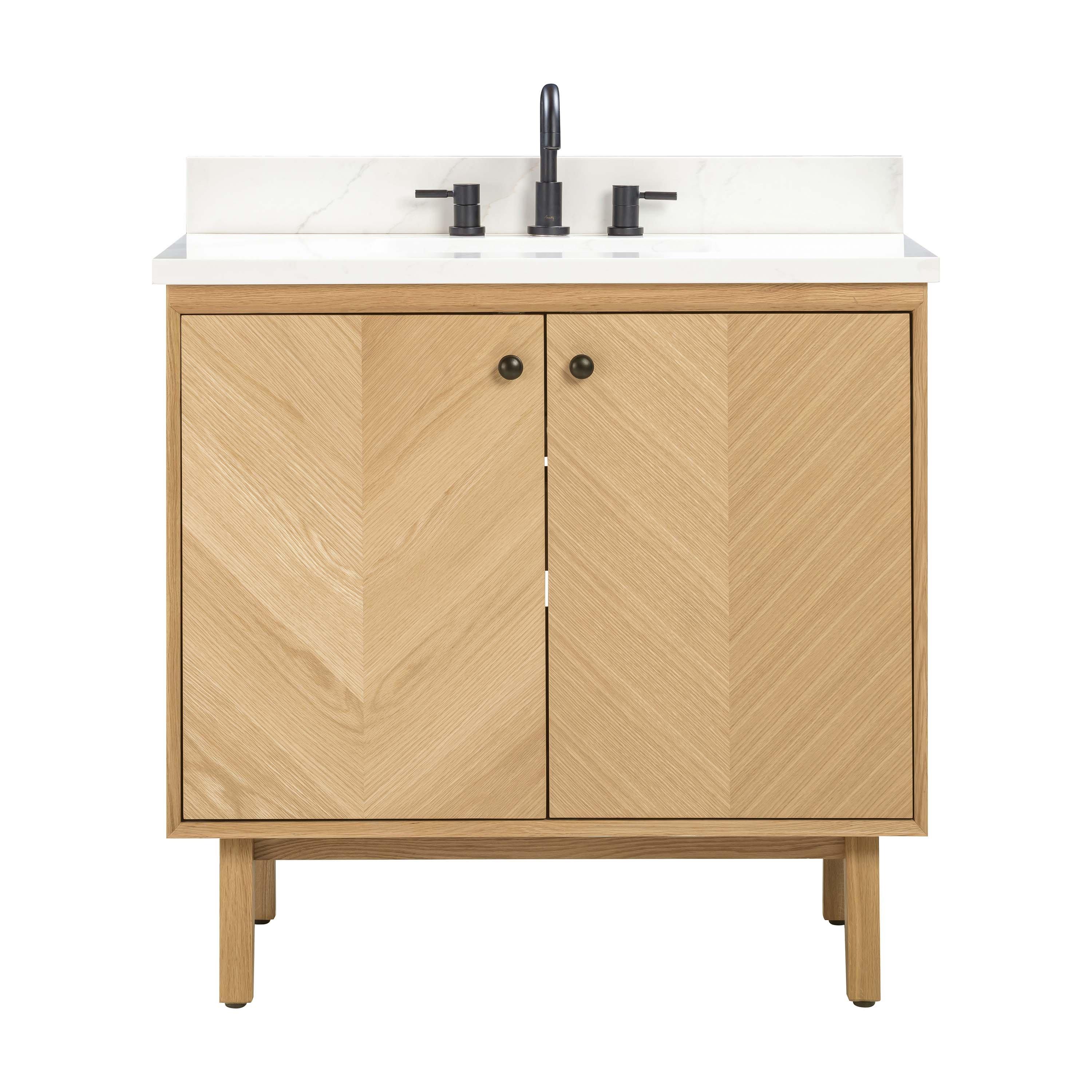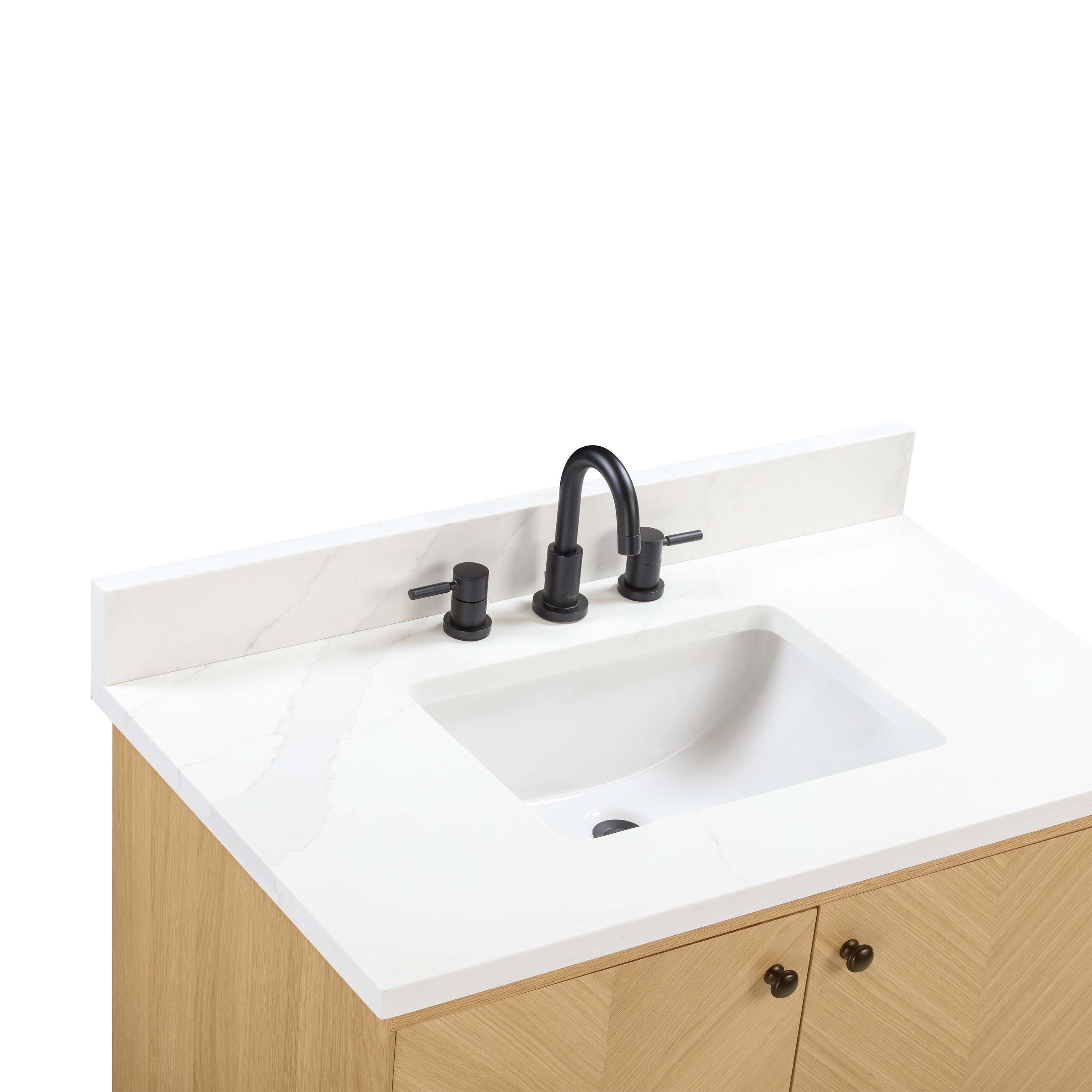 Complete your bathroom with the beautiful Adrian 37 in. Natural Oak Vanity with Calacatta Quartz Top. This freestanding features durable solid wood, mdf cabinets in stunning natural with a white quartz vanity top and matte black hardware. A charming single undermount sink in brilliant white is included. The Adrian 37 in. Natural Oak Vanity with Calacatta Quartz Top is a versatile choice to customize multiple bathroom settings.