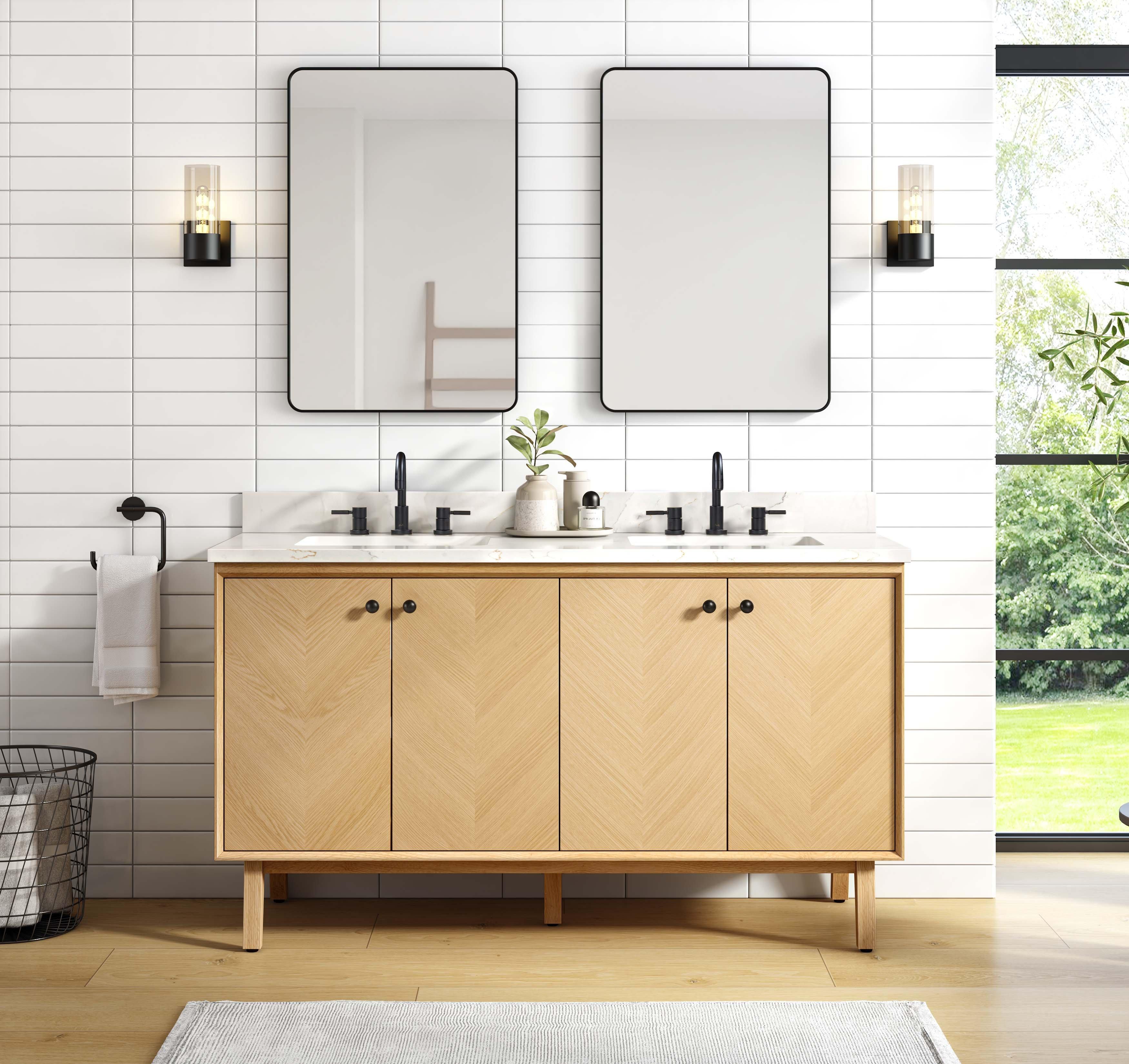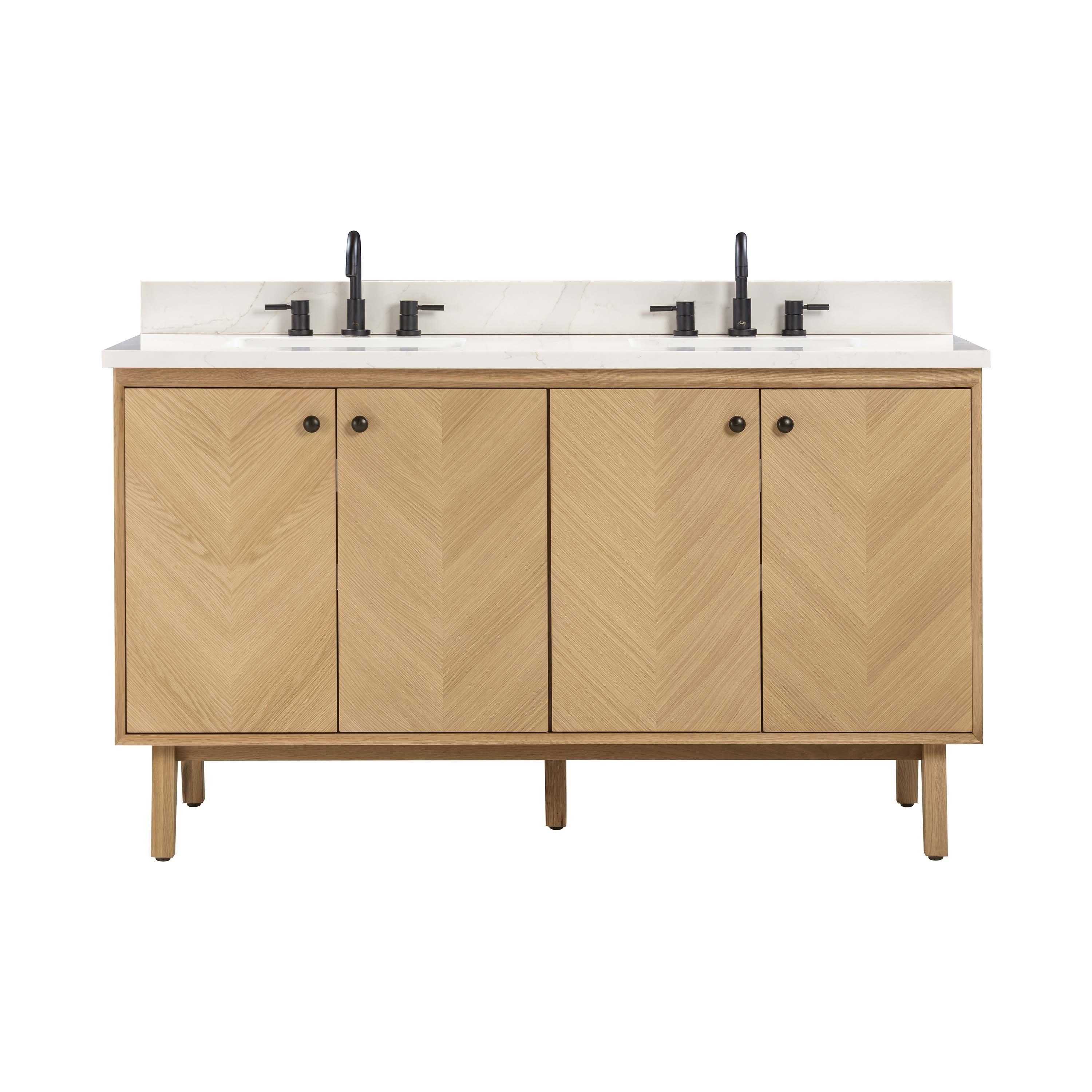 Complete your bathroom with the beautiful Adrian 61 in. Natural Oak Vanity with Calacatta Quartz Top. This freestanding features durable solid wood, mdf cabinets in stunning natural with a white quartz vanity top and matte black hardware. A charming double undermount sink in brilliant white is included. The Adrian 61 in. Natural Oak Vanity with Calacatta Quartz Top is a versatile choice to customize multiple bathroom settings.