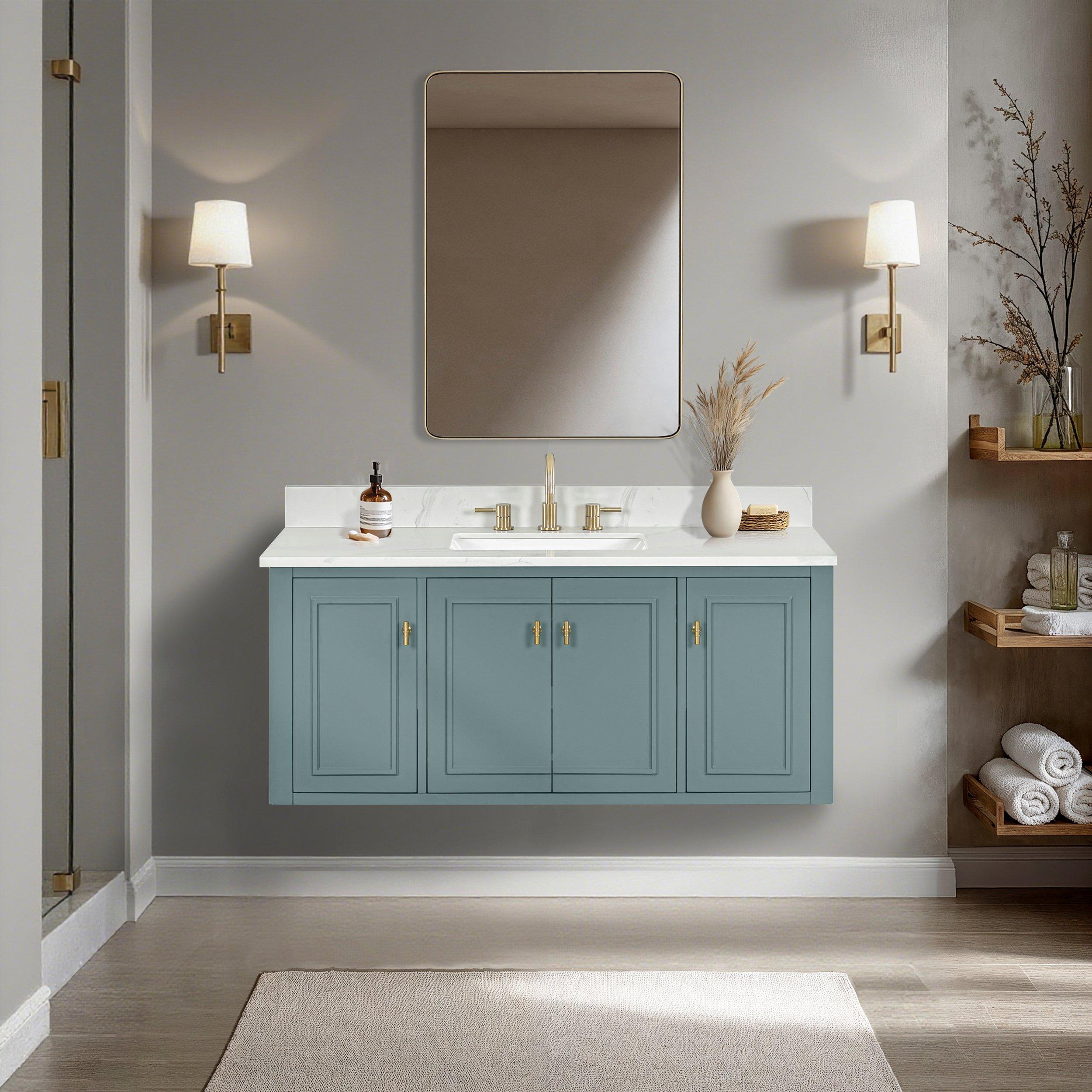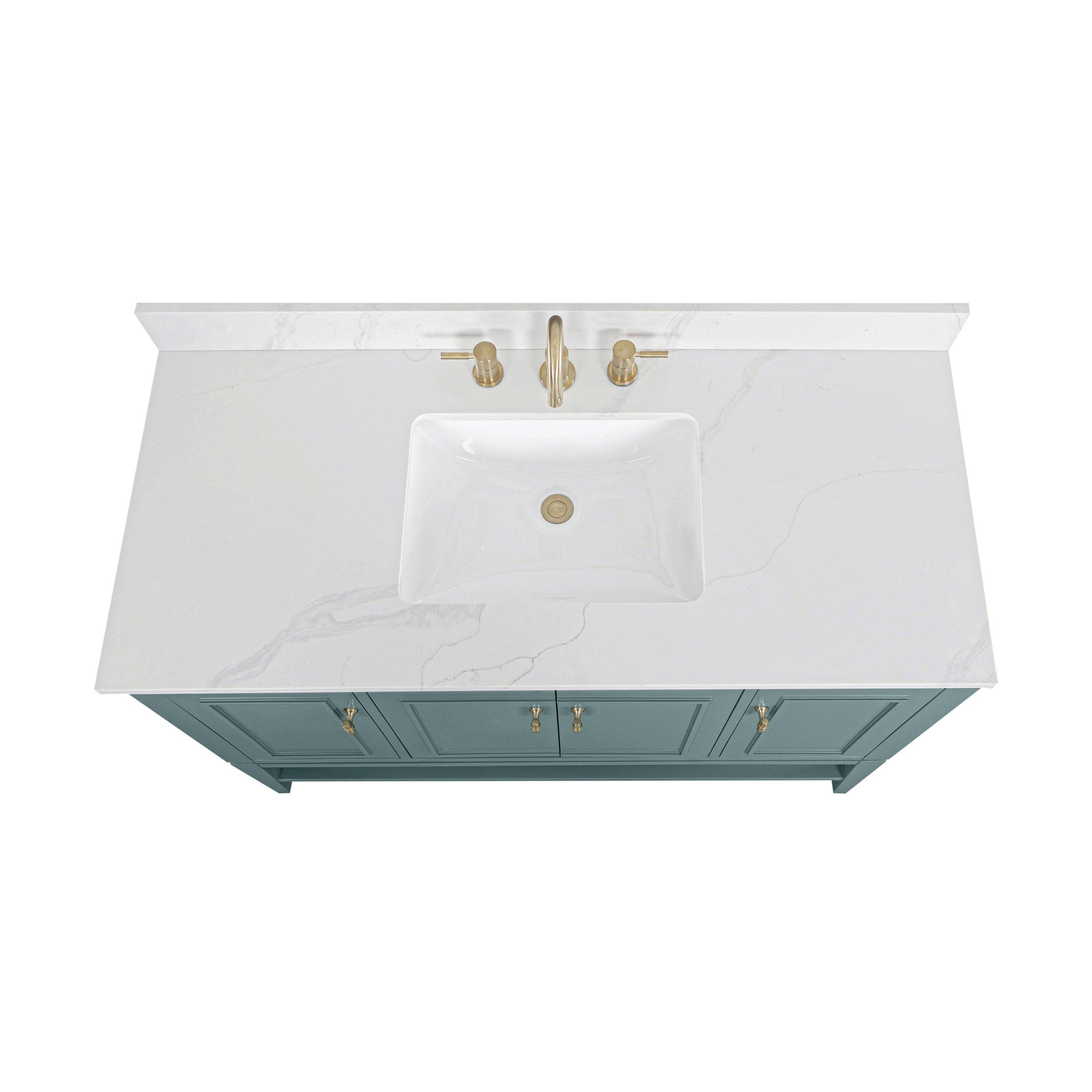 Tailor the look of your bathroom with the Arietta 49 in. Ocean Vanity with Quartz Top featuring gorgeous solid wood, mdf in green with 4 doors, 1 drawers, and 0 shelves. This piece is completed with beautiful matte gold hardware and a single undermount white sink. The Arietta 49 in. Ocean Vanity with Quartz Top is a stunning addition to any bathroom setting.