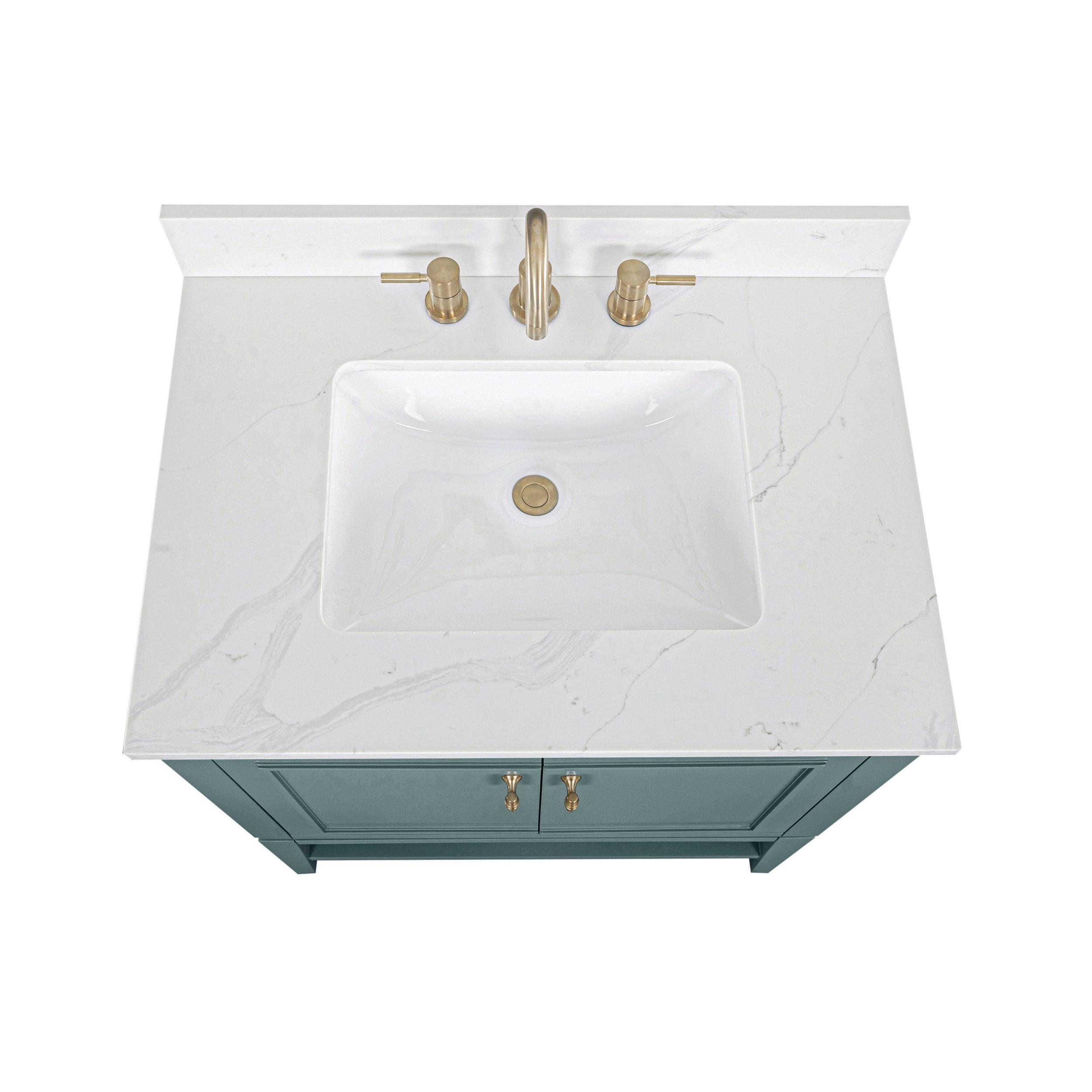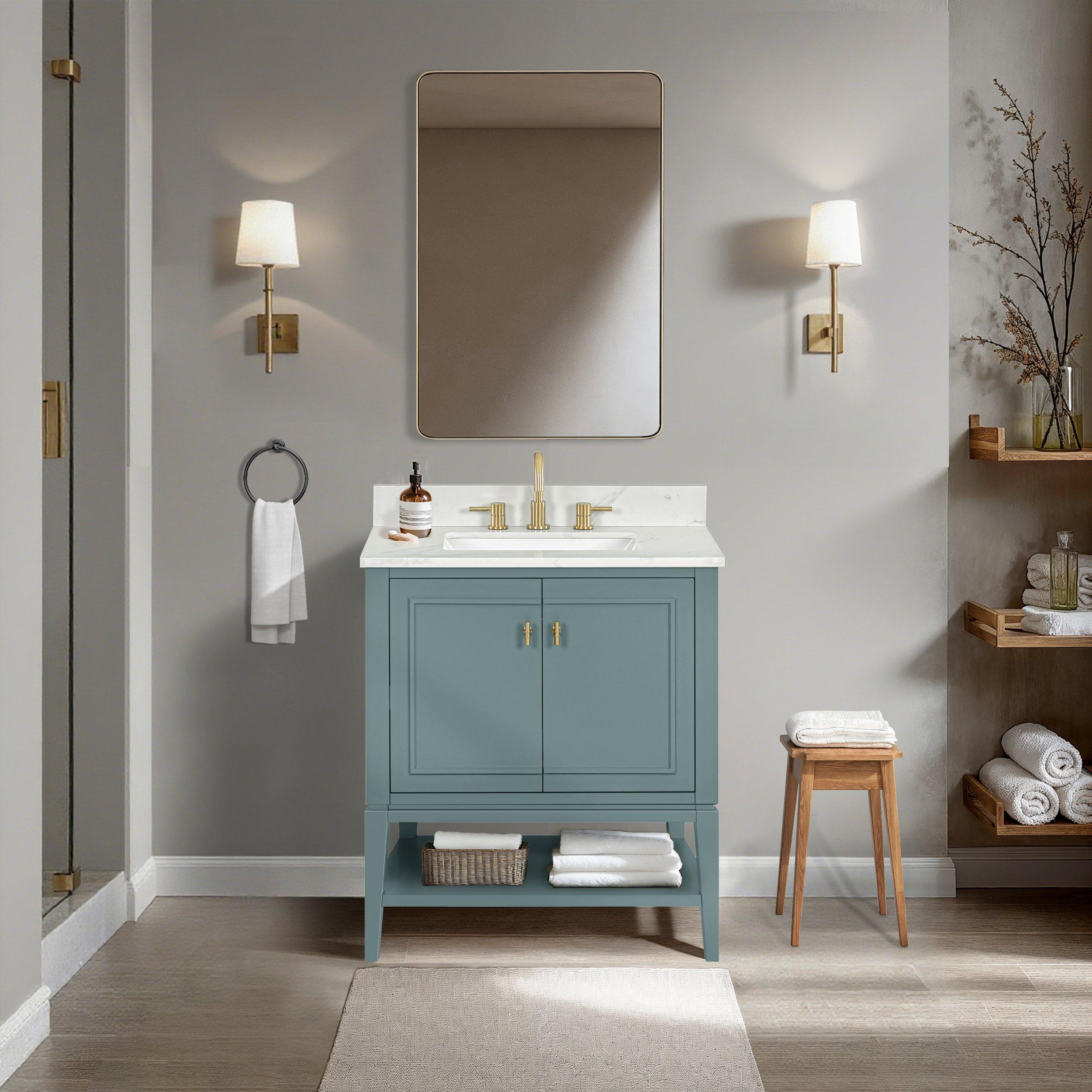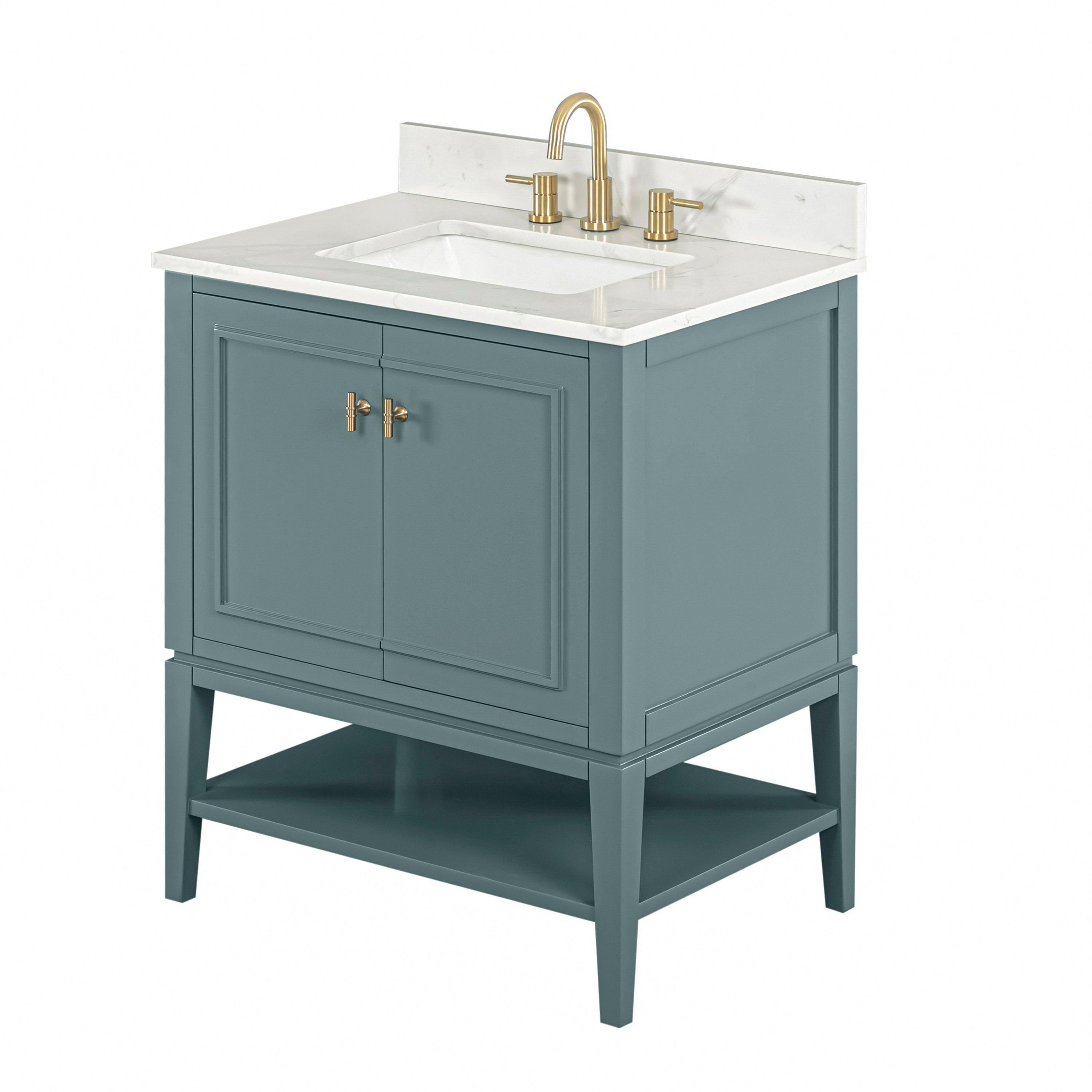 Tailor the look of your bathroom with the Arietta 31 in. Ocean Vanity with Quartz Top featuring gorgeous solid wood, mdf in green with 2 doors, 1 drawers, and 0 shelves. This piece is completed with beautiful matte gold hardware and a single undermount white sink. The Arietta 31 in. Ocean Vanity with Quartz Top is a stunning addition to any bathroom setting.
