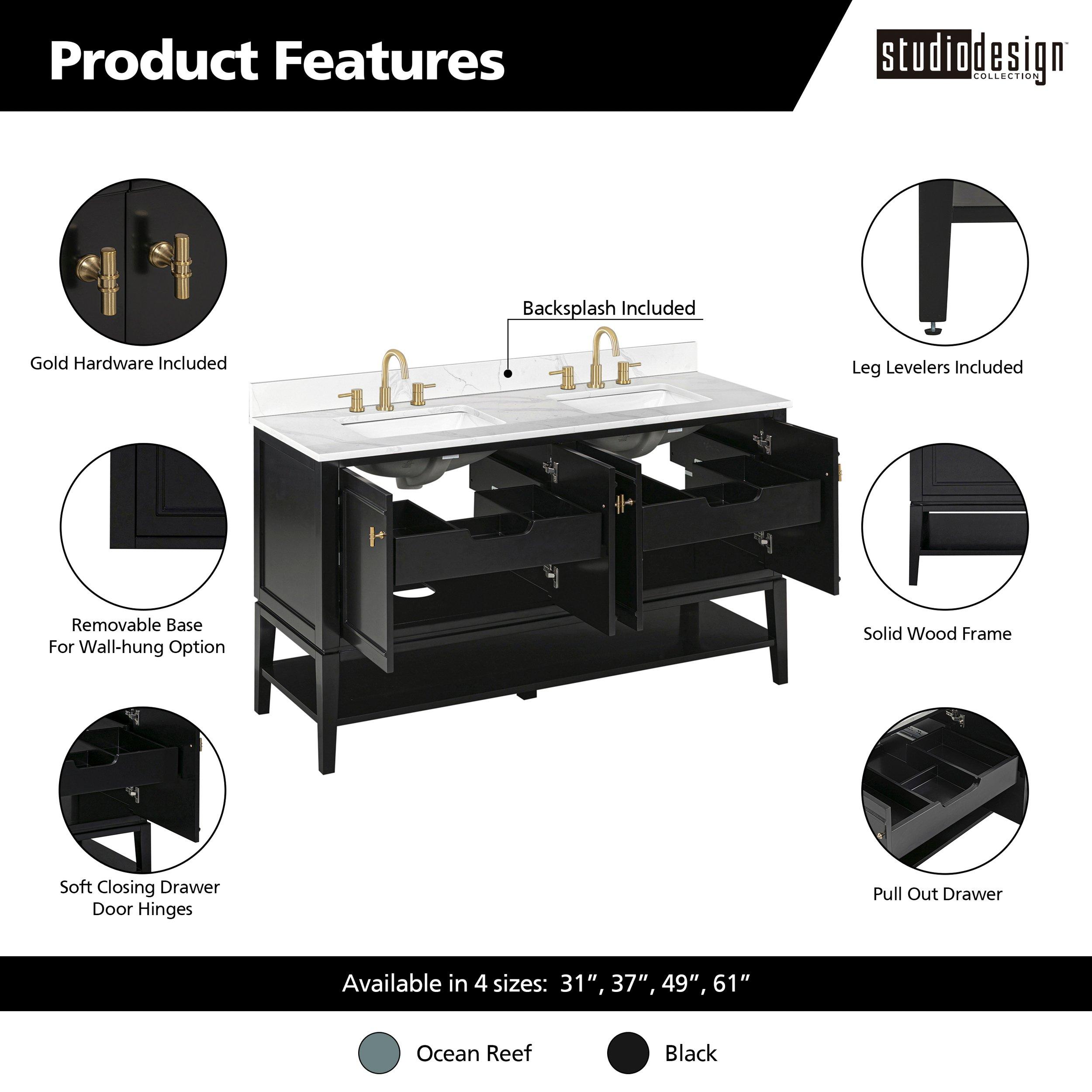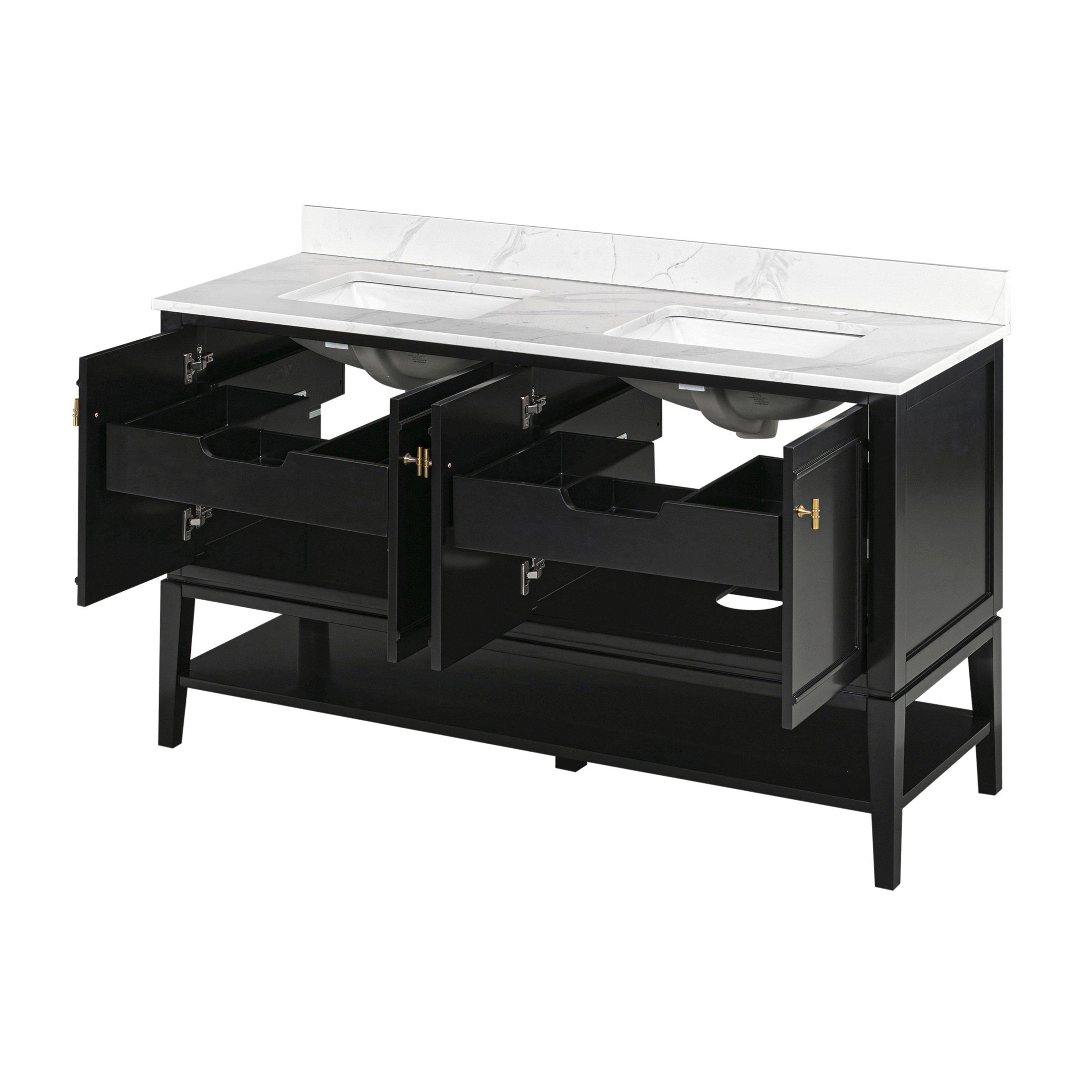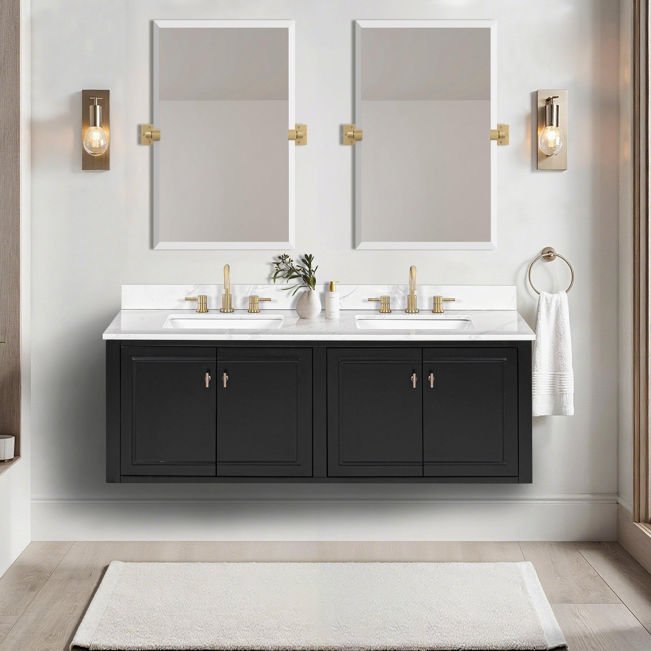 Complete your bathroom with the beautiful Arietta 61 in. Black Vanity with Quartz Top. This wall mounted or freestanding features durable solid wood, mdf cabinets in stunning black with a white quartz vanity top and matte gold hardware. A charming double undermount sink in brilliant white is included. The Arietta 61 in. Black Vanity with Quartz Top is a versatile choice to customize multiple bathroom settings.