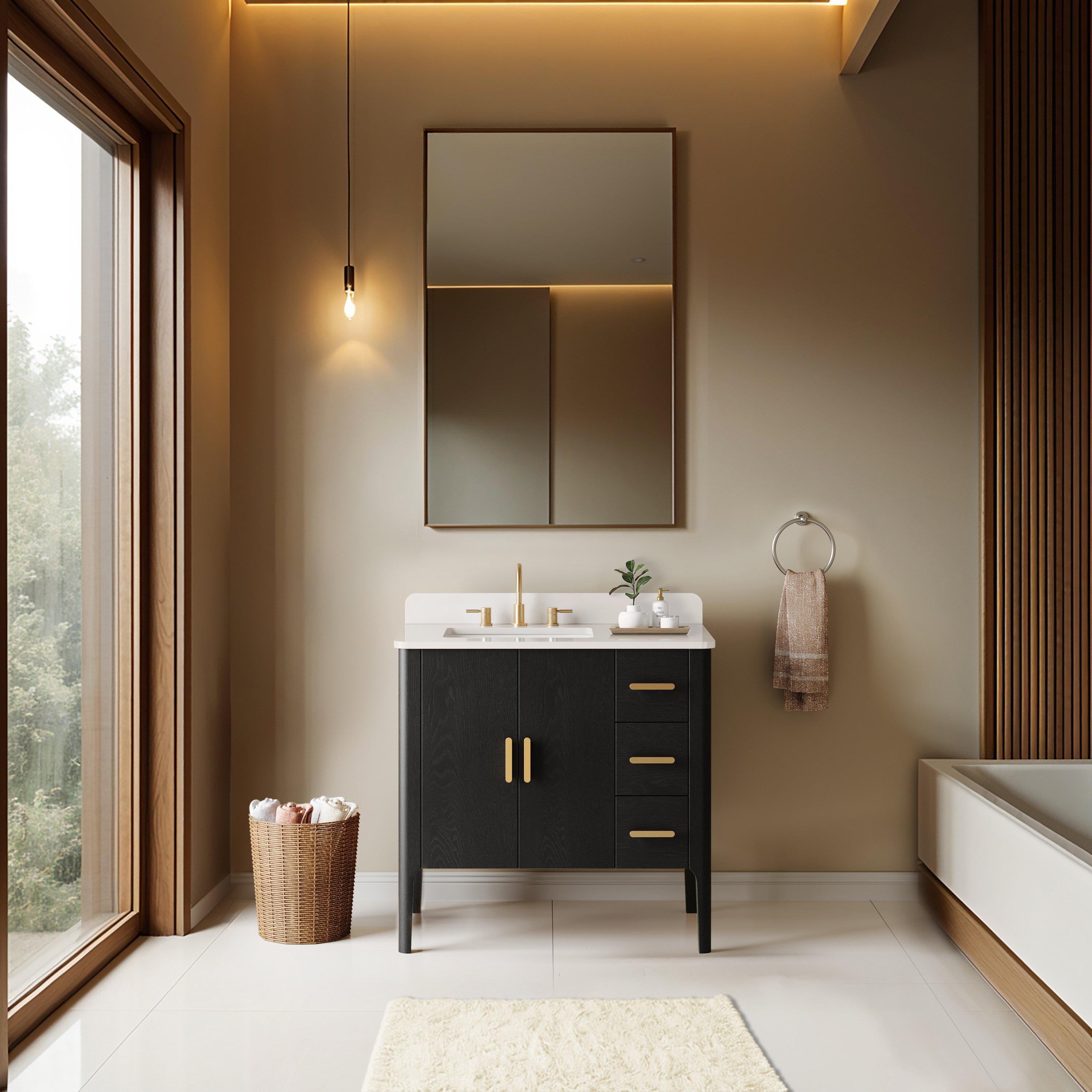 Tailor the look of your bathroom with the Aspen 37 in. Black Vanity with Quartz Top featuring gorgeous solid wood, mdf in black with 2 doors, 3 drawers, and 0 shelves. This piece is completed with beautiful matte gold hardware and a single undermount white sink. The Aspen 37 in. Black Vanity with Quartz Top is a stunning addition to any bathroom setting.