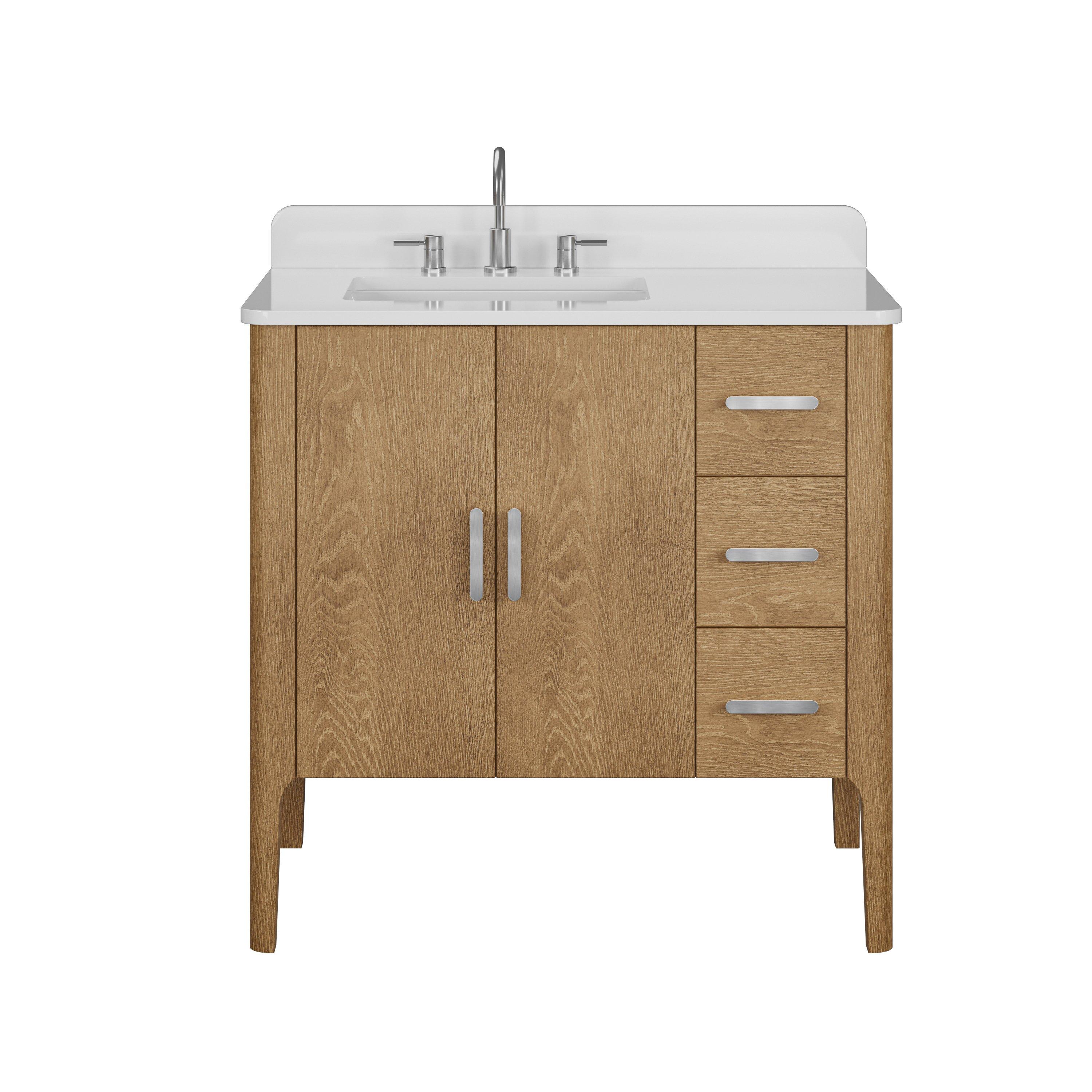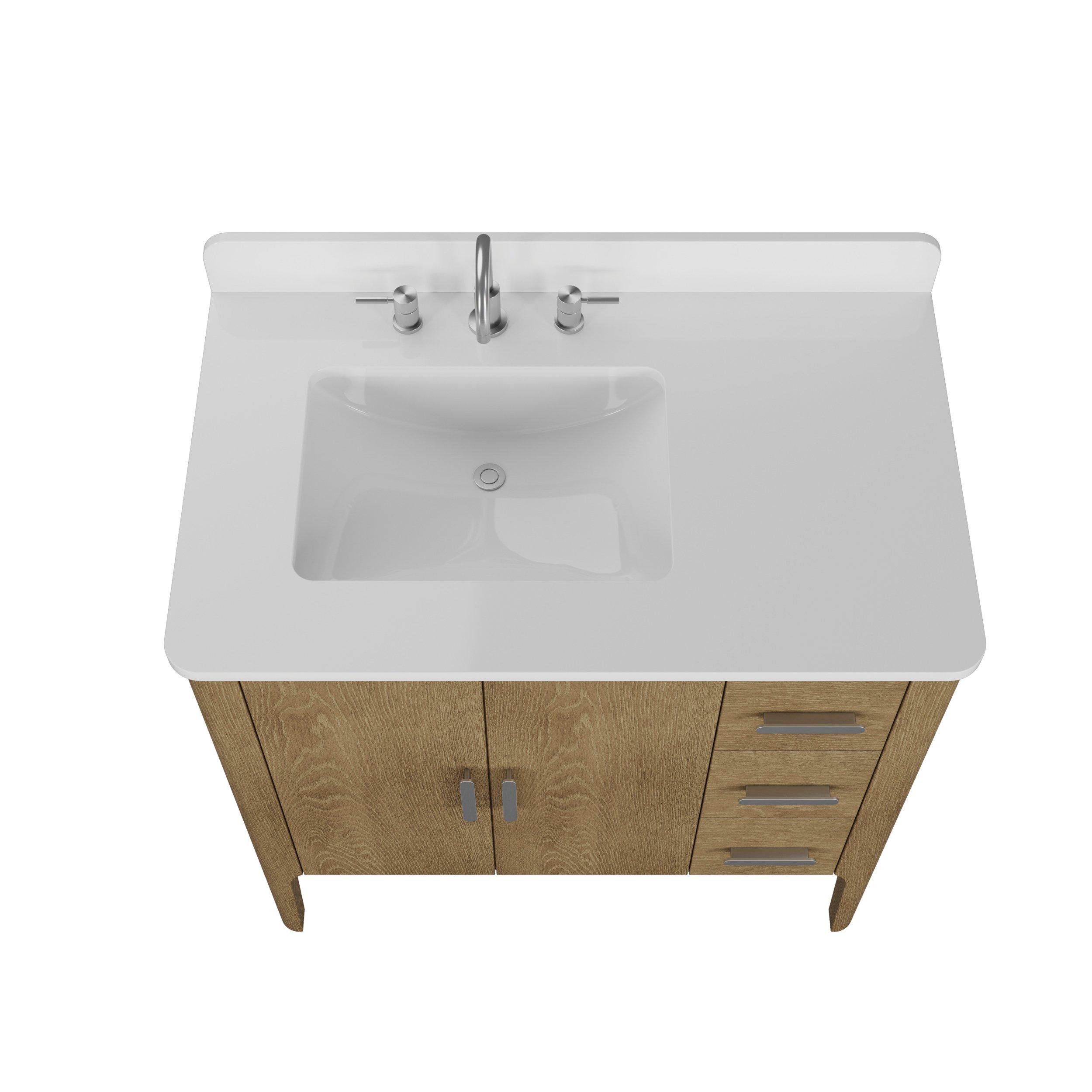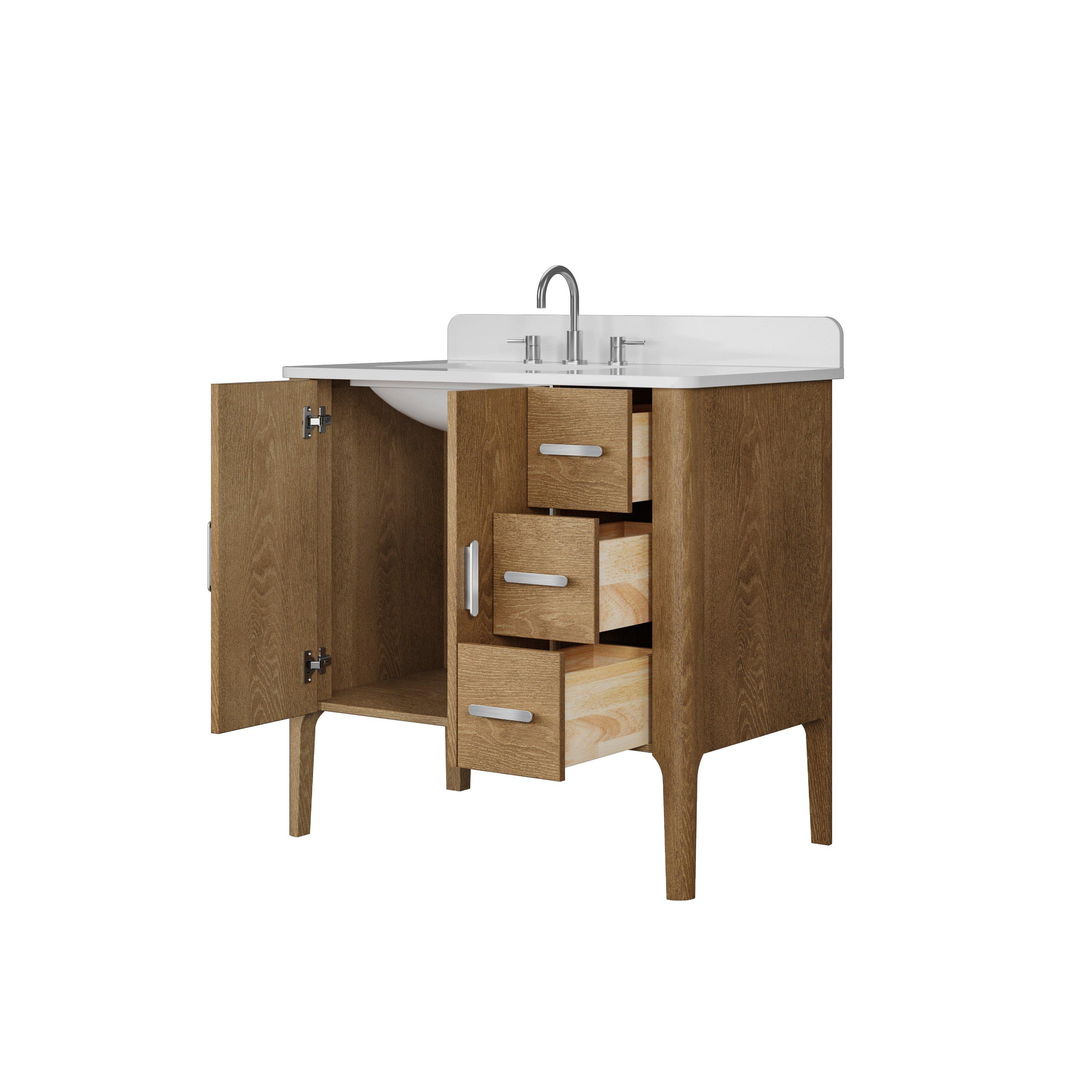 Tailor the look of your bathroom with the Aspen 37 in. Oak Vanity with Quartz Top featuring gorgeous solid wood, mdf in natural with 2 doors, 3 drawers, and 0 shelves. This piece is completed with beautiful brushed nickel hardware and a single undermount white sink. The Aspen 37 in. Oak Vanity with Quartz Top is a stunning addition to any bathroom setting.
