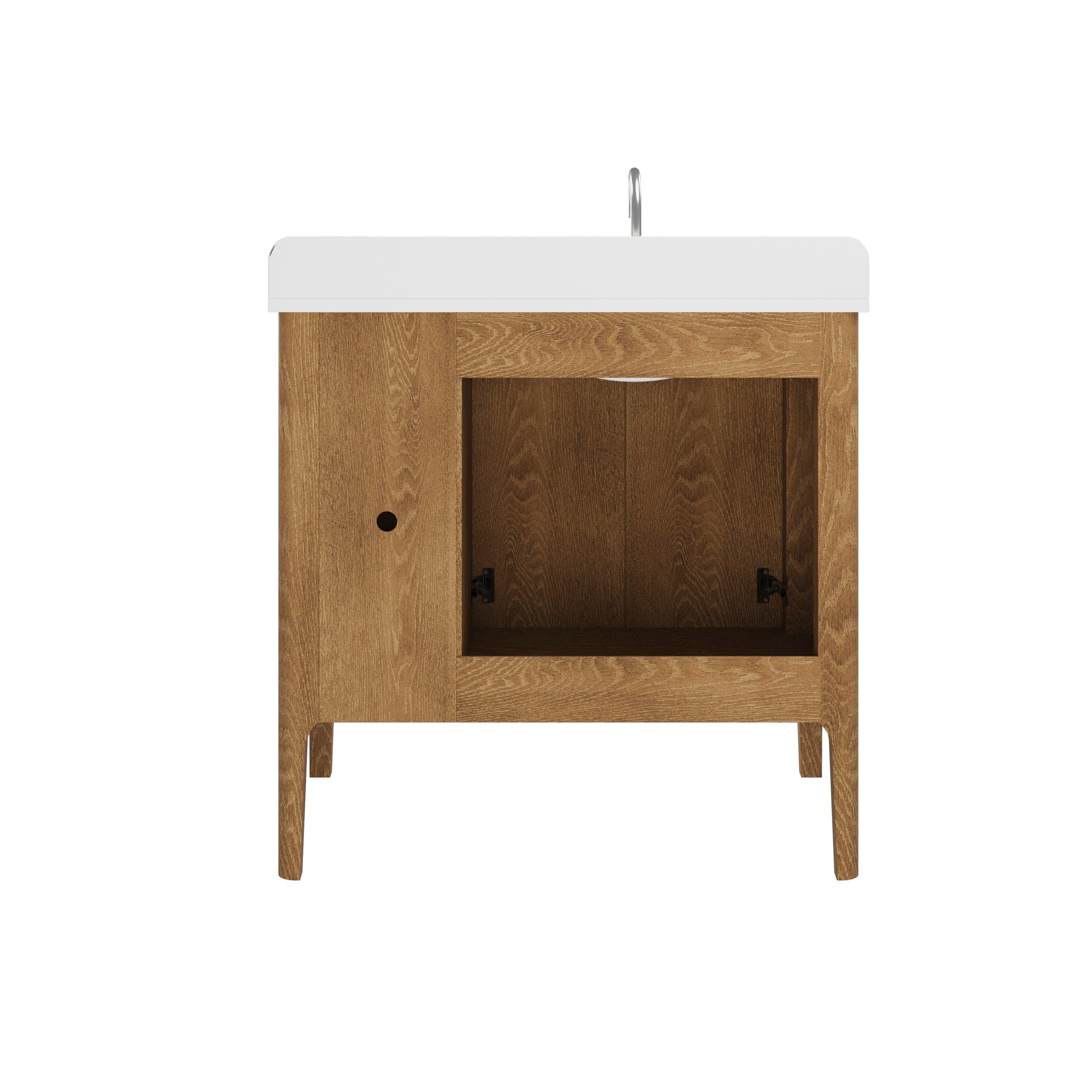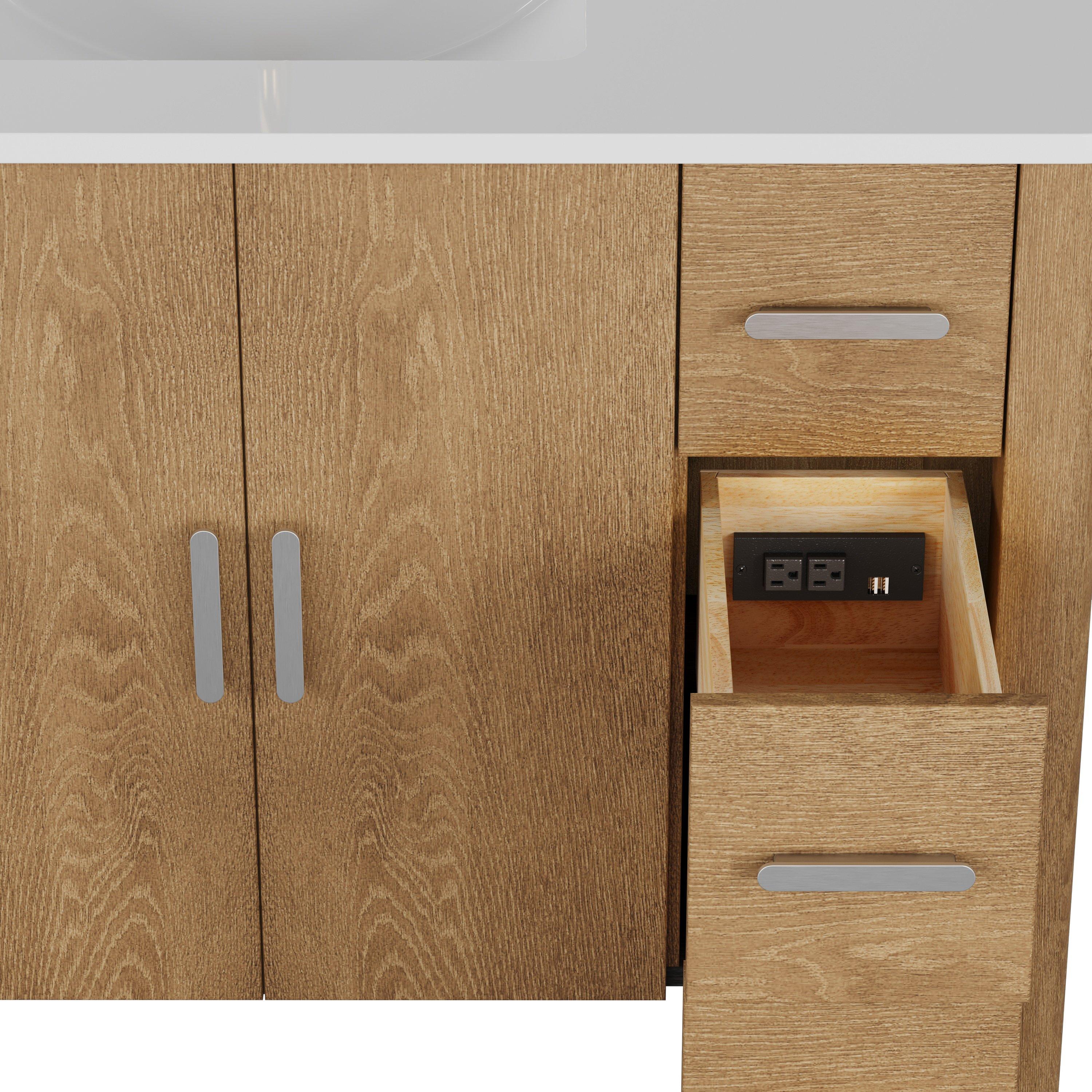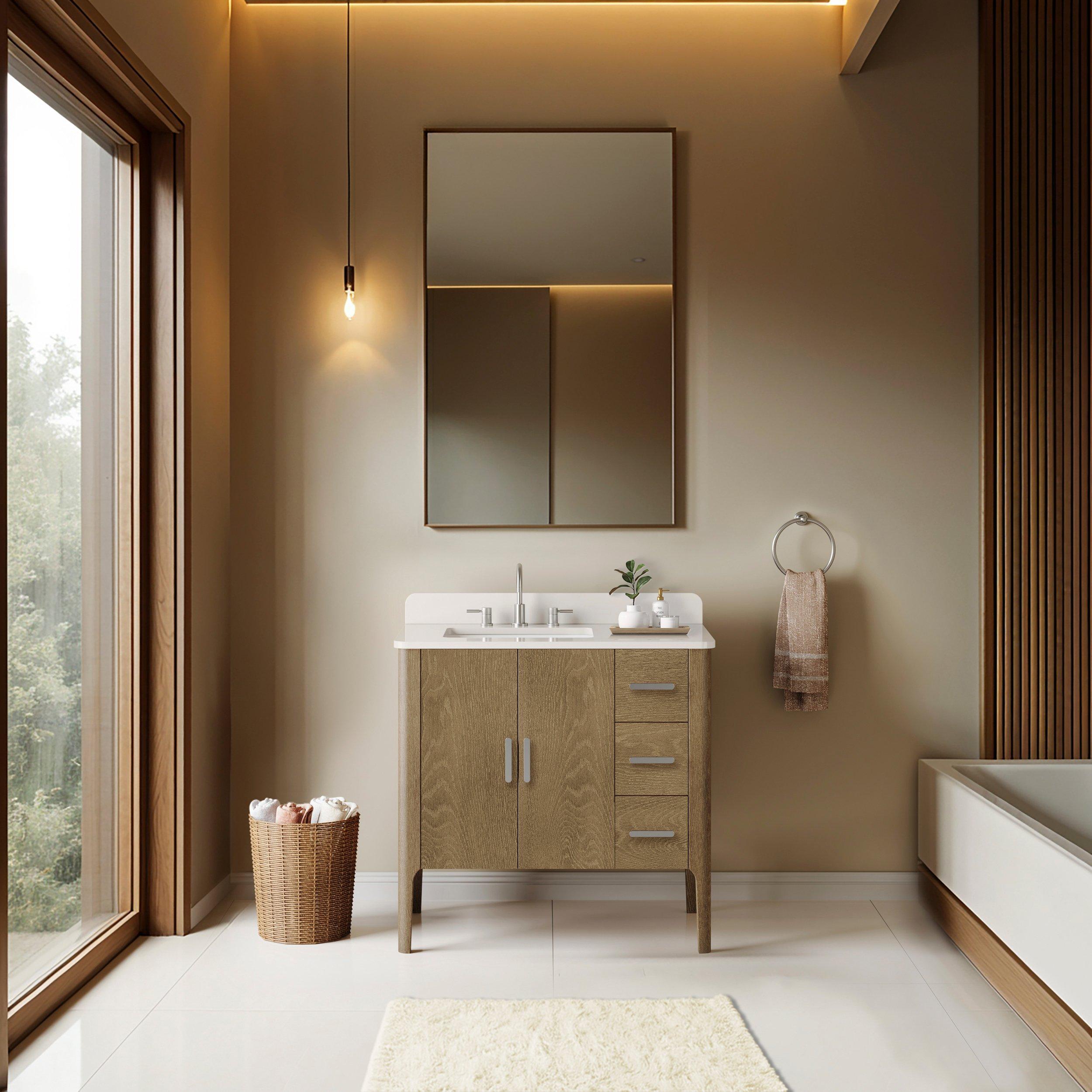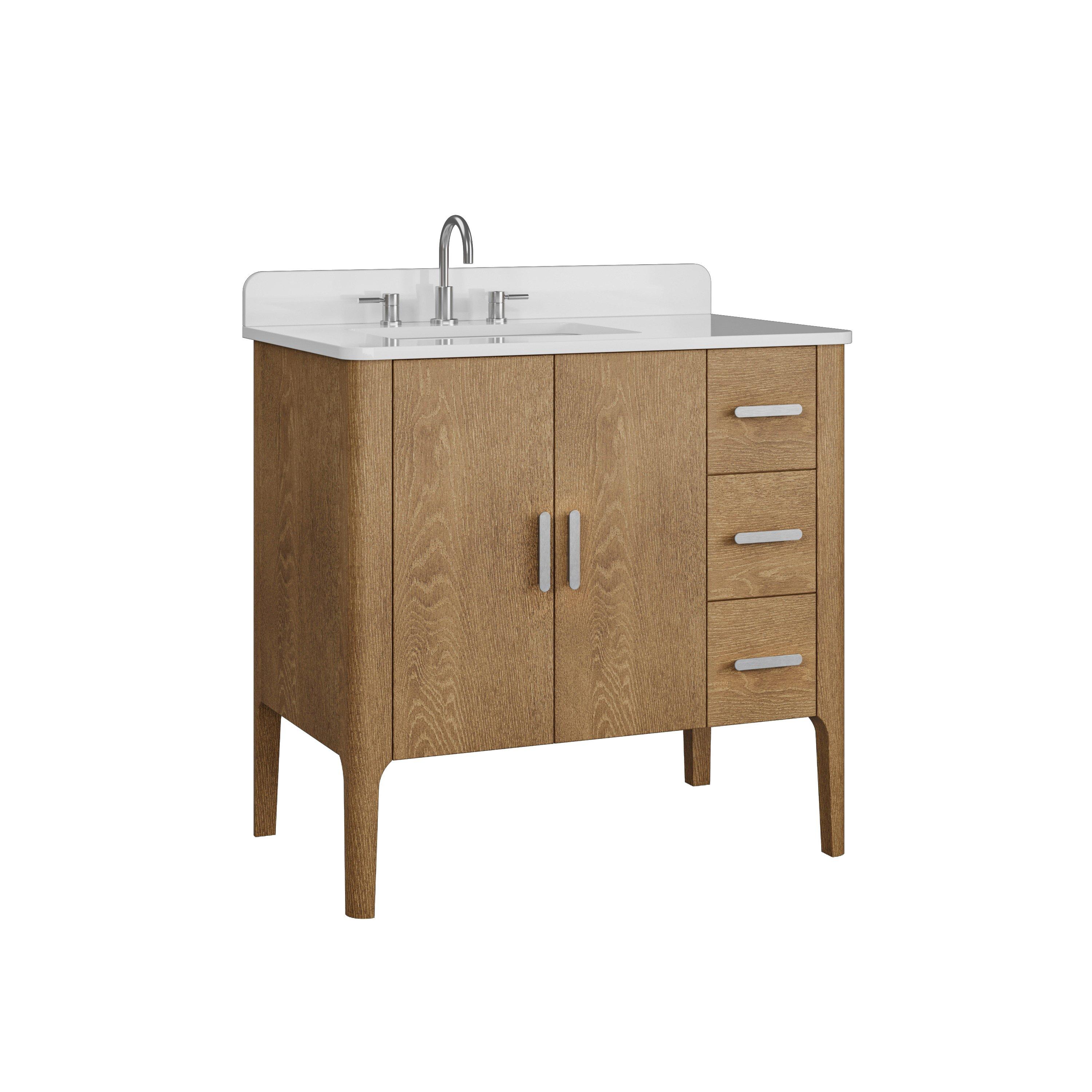 Tailor the look of your bathroom with the Aspen 37 in. Oak Vanity with Quartz Top featuring gorgeous solid wood, mdf in natural with 2 doors, 3 drawers, and 0 shelves. This piece is completed with beautiful brushed nickel hardware and a single undermount white sink. The Aspen 37 in. Oak Vanity with Quartz Top is a stunning addition to any bathroom setting.
