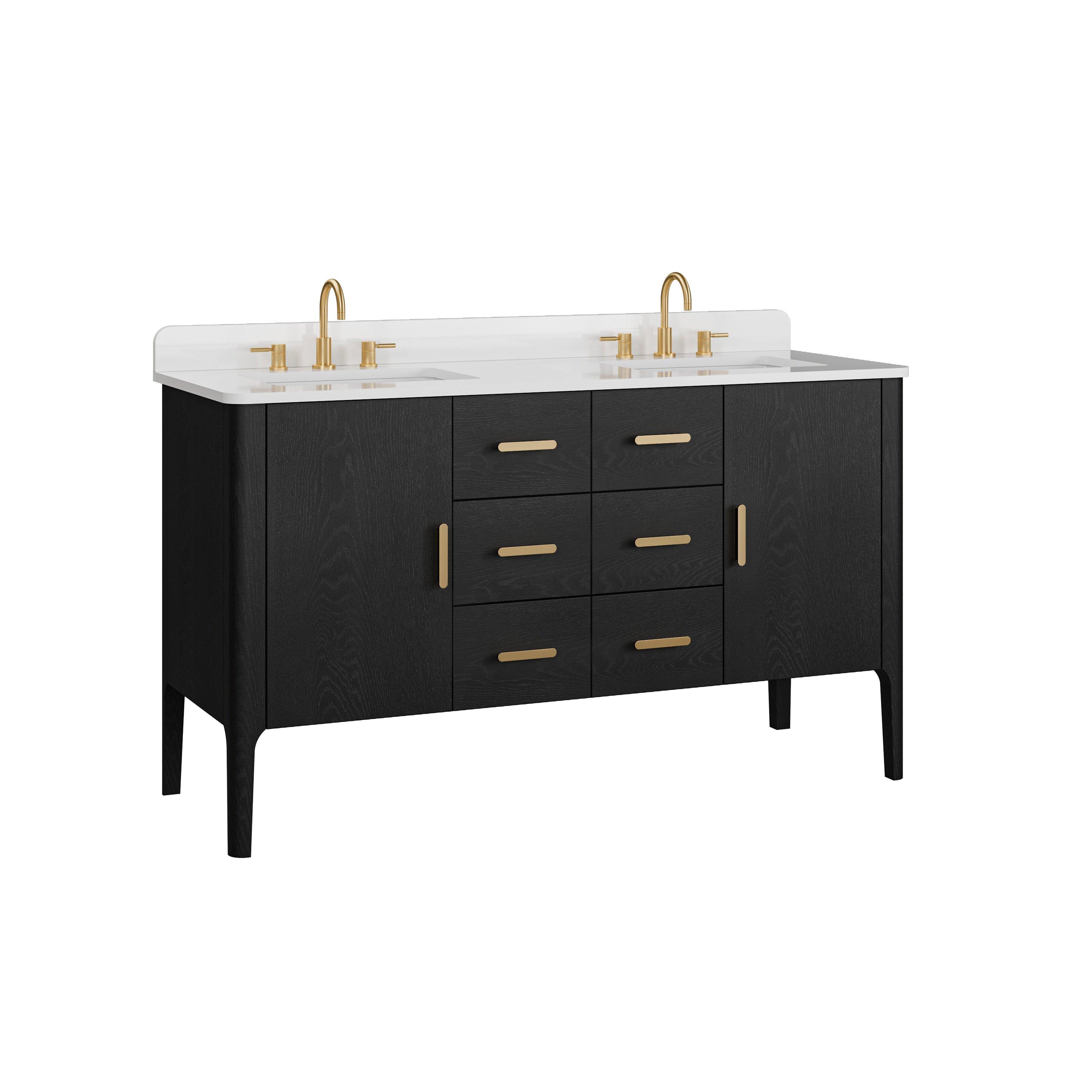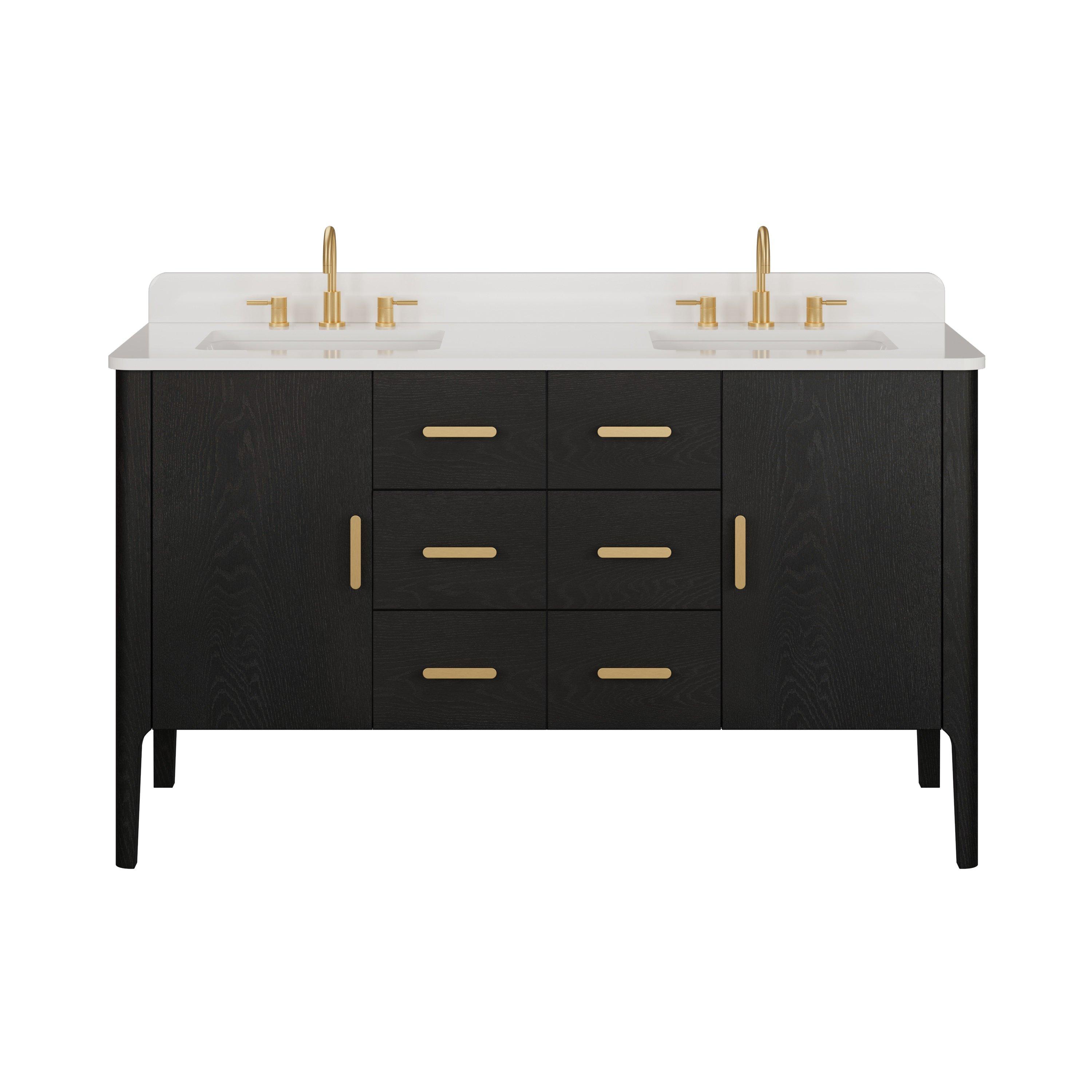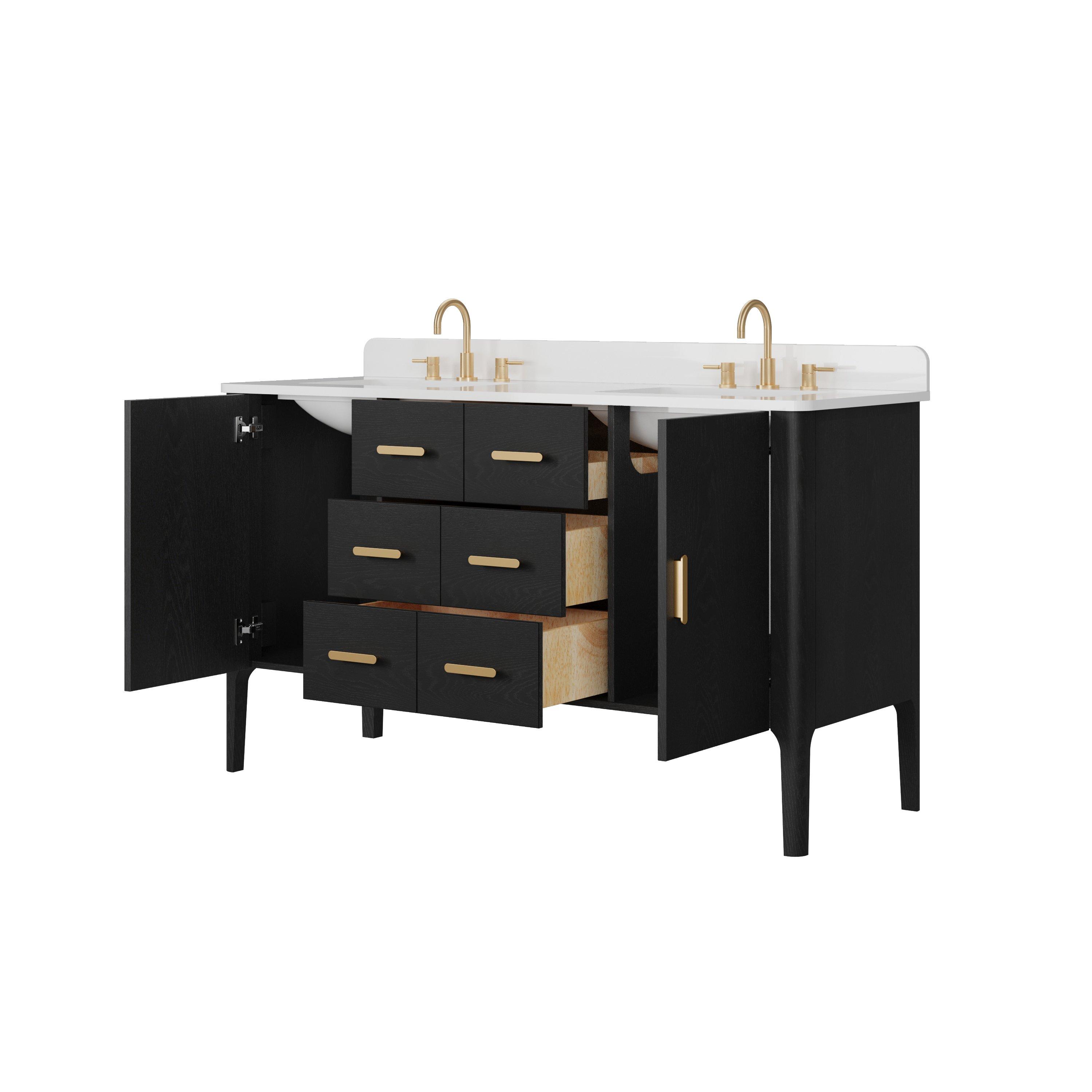 Complete your bathroom with the beautiful Aspen 61 in. Black Vanity with Quartz Top. This freestanding features durable solid wood, mdf cabinets in stunning black with a white quartz vanity top and matte gold hardware. A charming double undermount sink in brilliant white is included. The Aspen 61 in. Black Vanity with Quartz Top is a versatile choice to customize multiple bathroom settings.