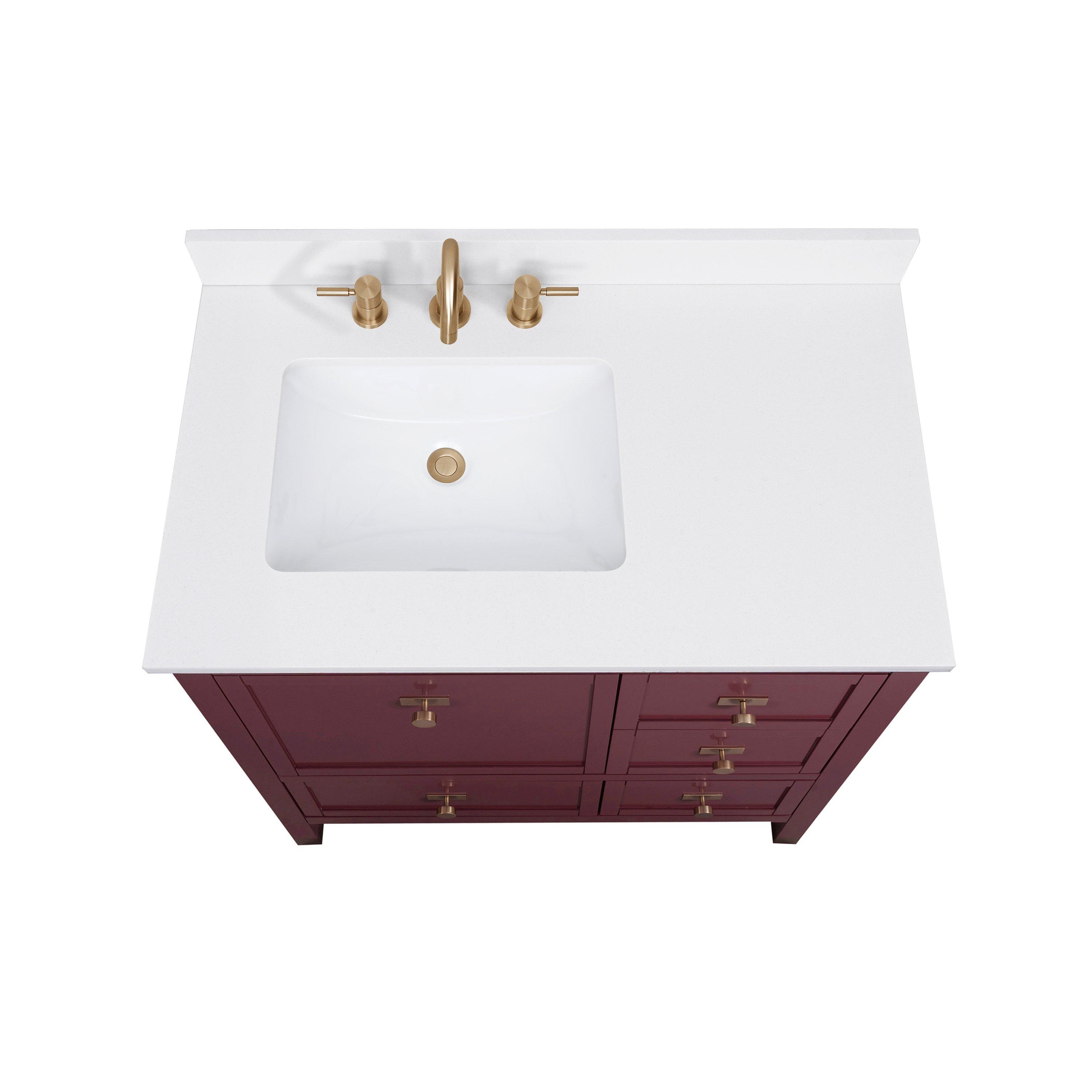 Complete your bathroom with the beautiful Audrey 37 in. Burgundy Red Vanity with Engineered Stone Top. This freestanding features durable solid wood, mdf cabinets in stunning red/ pink with a white engineered stone vanity top and matte gold hardware. A charming single undermount sink in brilliant white is included. The Audrey 37 in. Burgundy Red Vanity with Engineered Stone Top is a versatile choice to customize multiple bathroom settings.