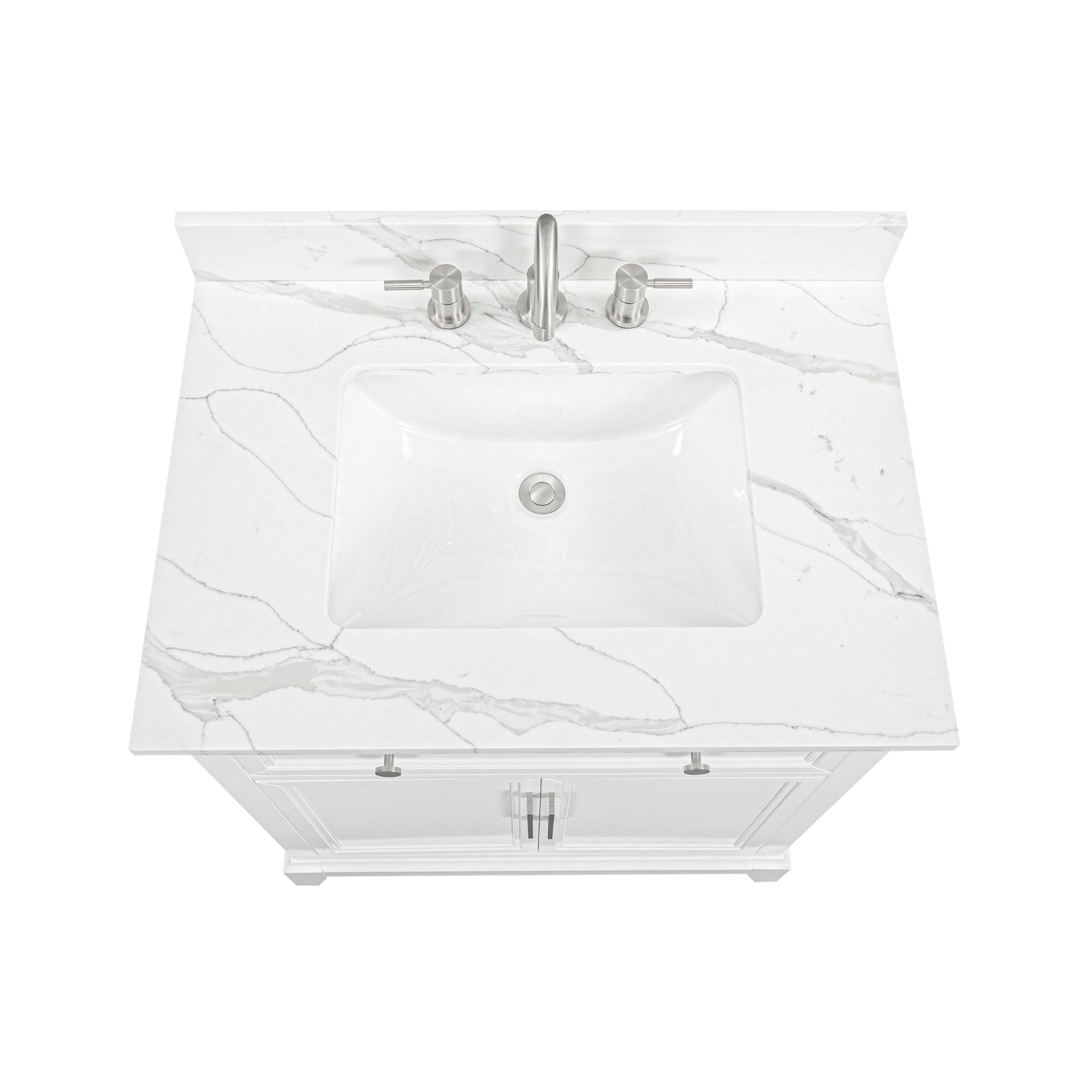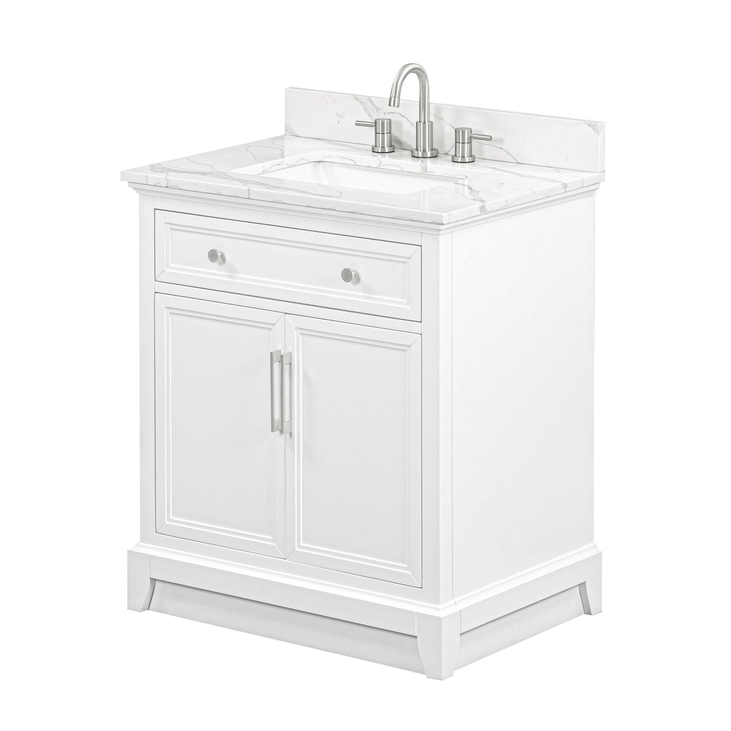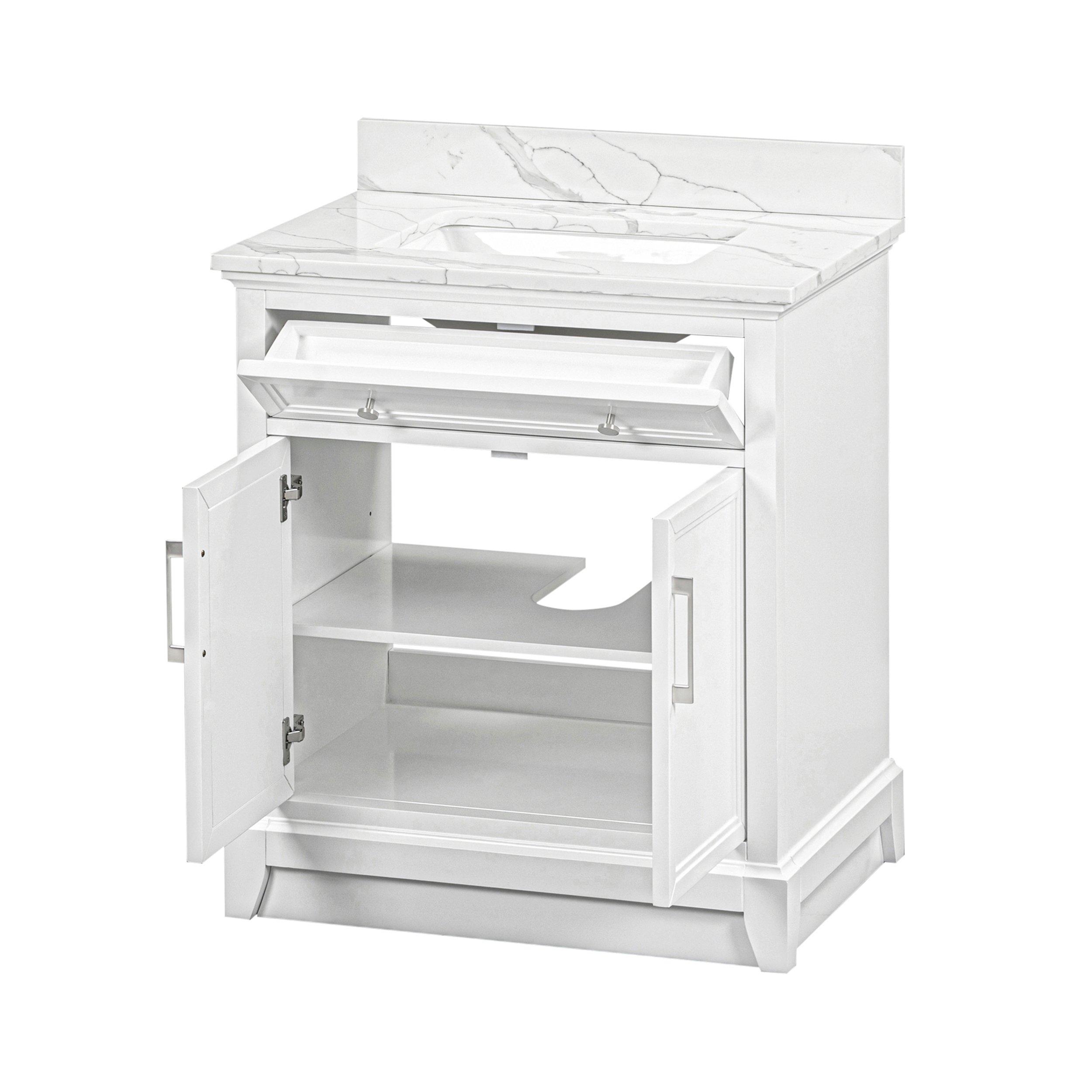 Tailor the look of your bathroom with the Aurora 31 in. White Vanity with Quartz Top featuring gorgeous solid wood, mdf in white with 2 doors, 1 drawers, and 1 shelves. This piece is completed with beautiful brushed nickel hardware and a single undermount white sink. The Aurora 31 in. White Vanity with Quartz Top is a stunning addition to any bathroom setting.
