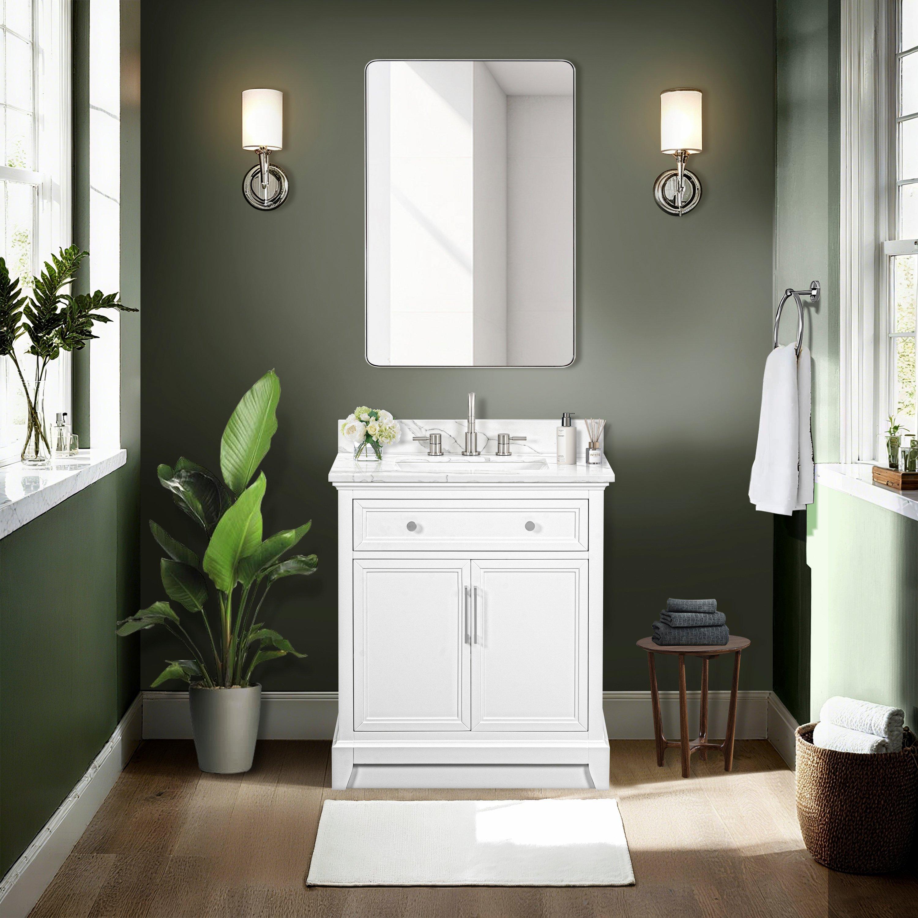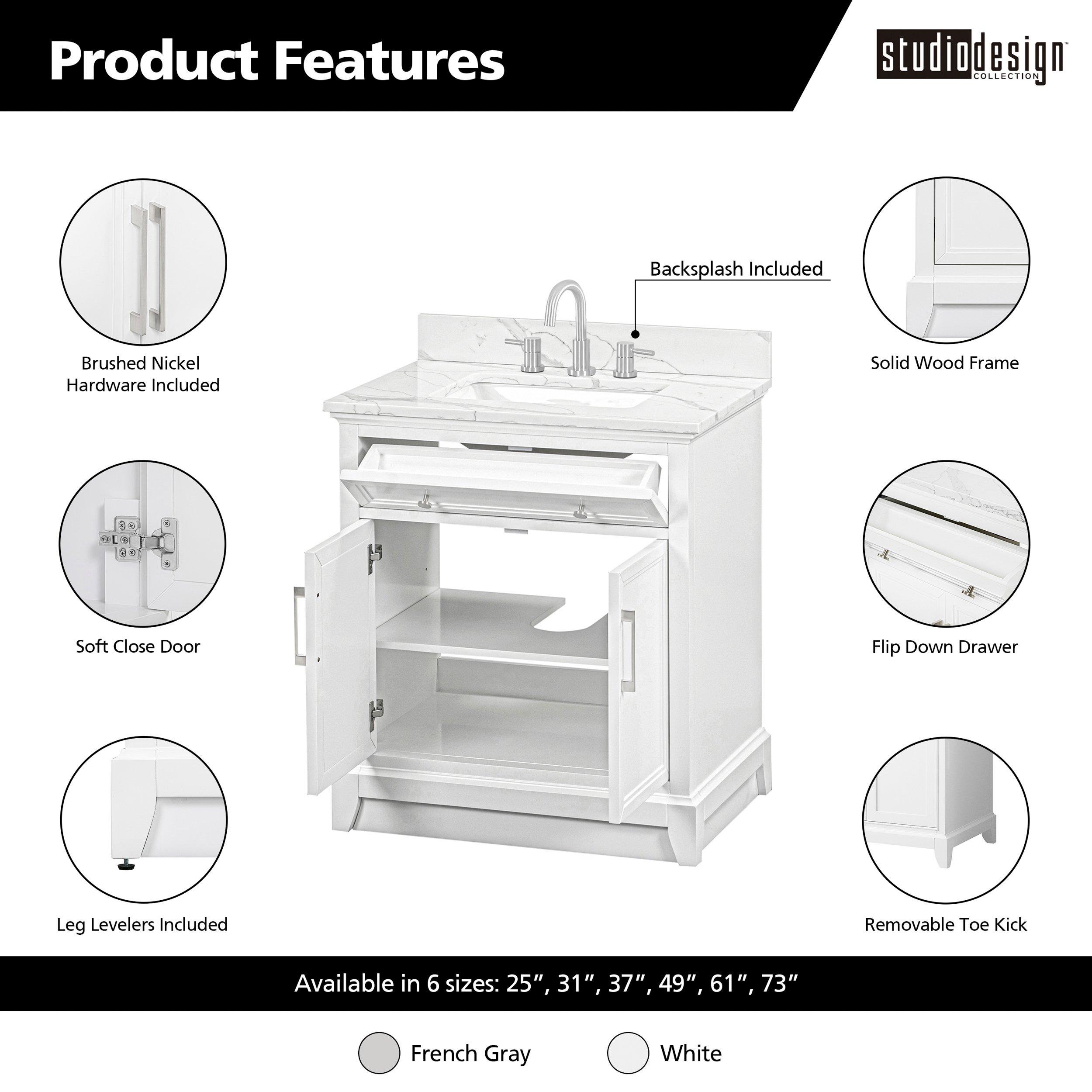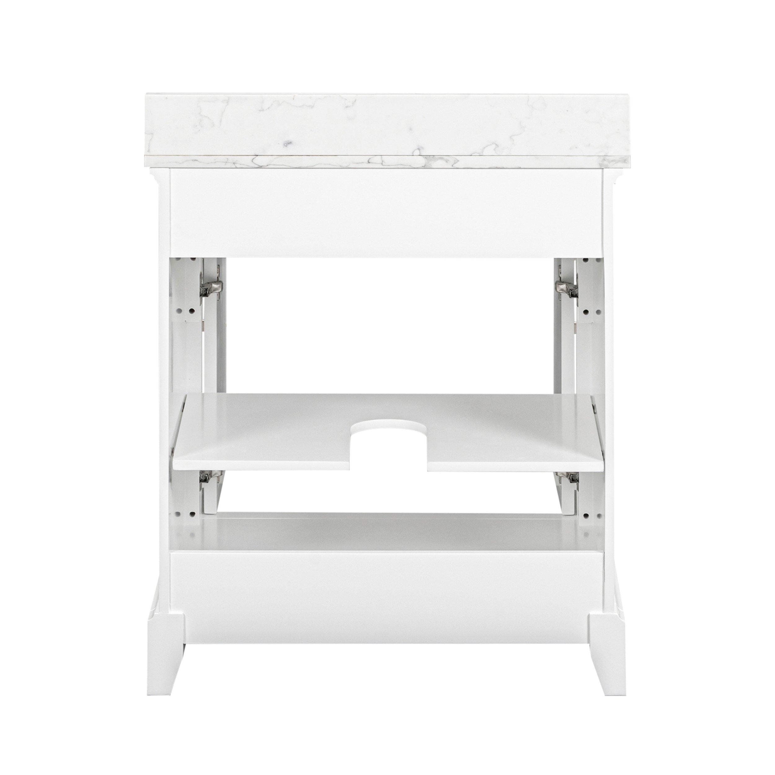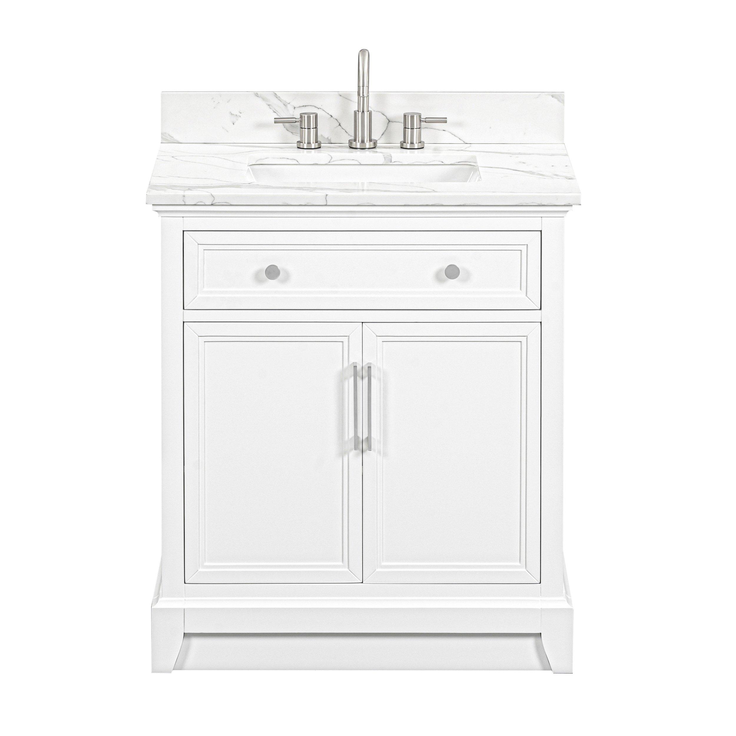 Tailor the look of your bathroom with the Aurora 31 in. White Vanity with Quartz Top featuring gorgeous solid wood, mdf in white with 2 doors, 1 drawers, and 1 shelves. This piece is completed with beautiful brushed nickel hardware and a single undermount white sink. The Aurora 31 in. White Vanity with Quartz Top is a stunning addition to any bathroom setting.