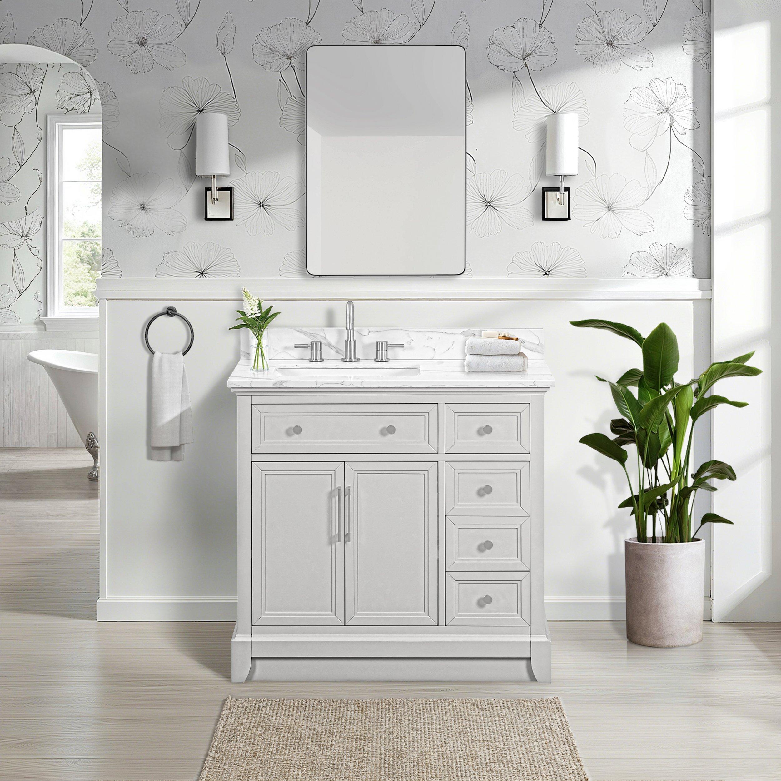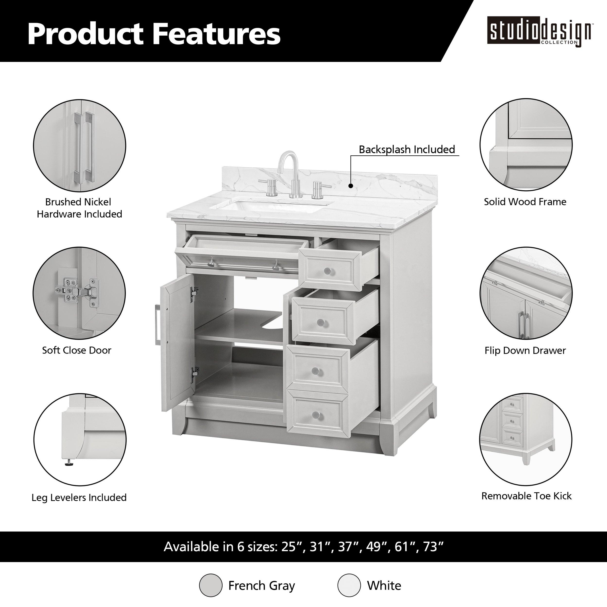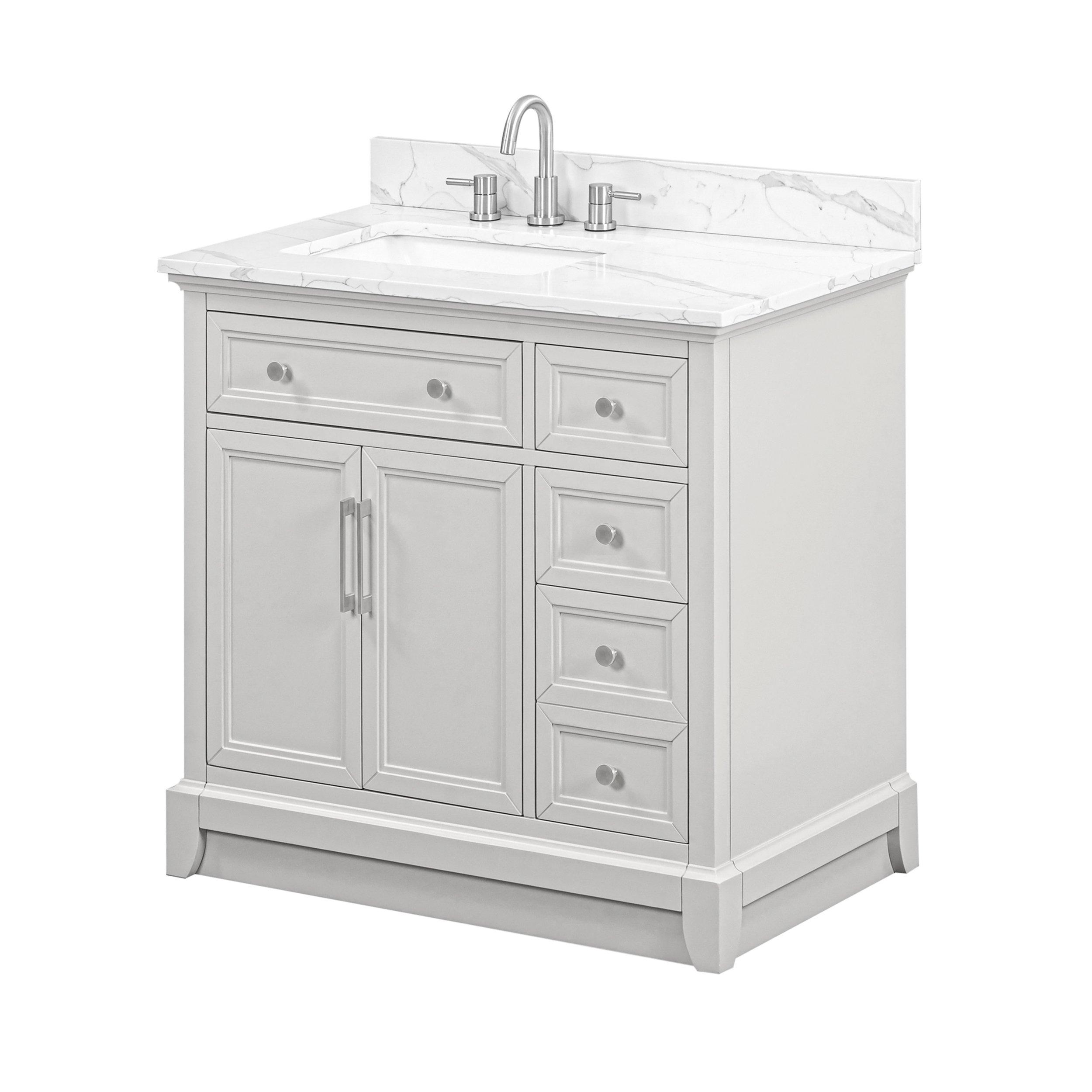 Tailor the look of your bathroom with the Aurora 37 in. Gray Vanity with Quartz Top featuring gorgeous solid wood, mdf in gray with 2 doors, 4 drawers, and 1 shelves. This piece is completed with beautiful brushed nickel hardware and a single undermount white sink. The Aurora 37 in. Gray Vanity with Quartz Top is a stunning addition to any bathroom setting.