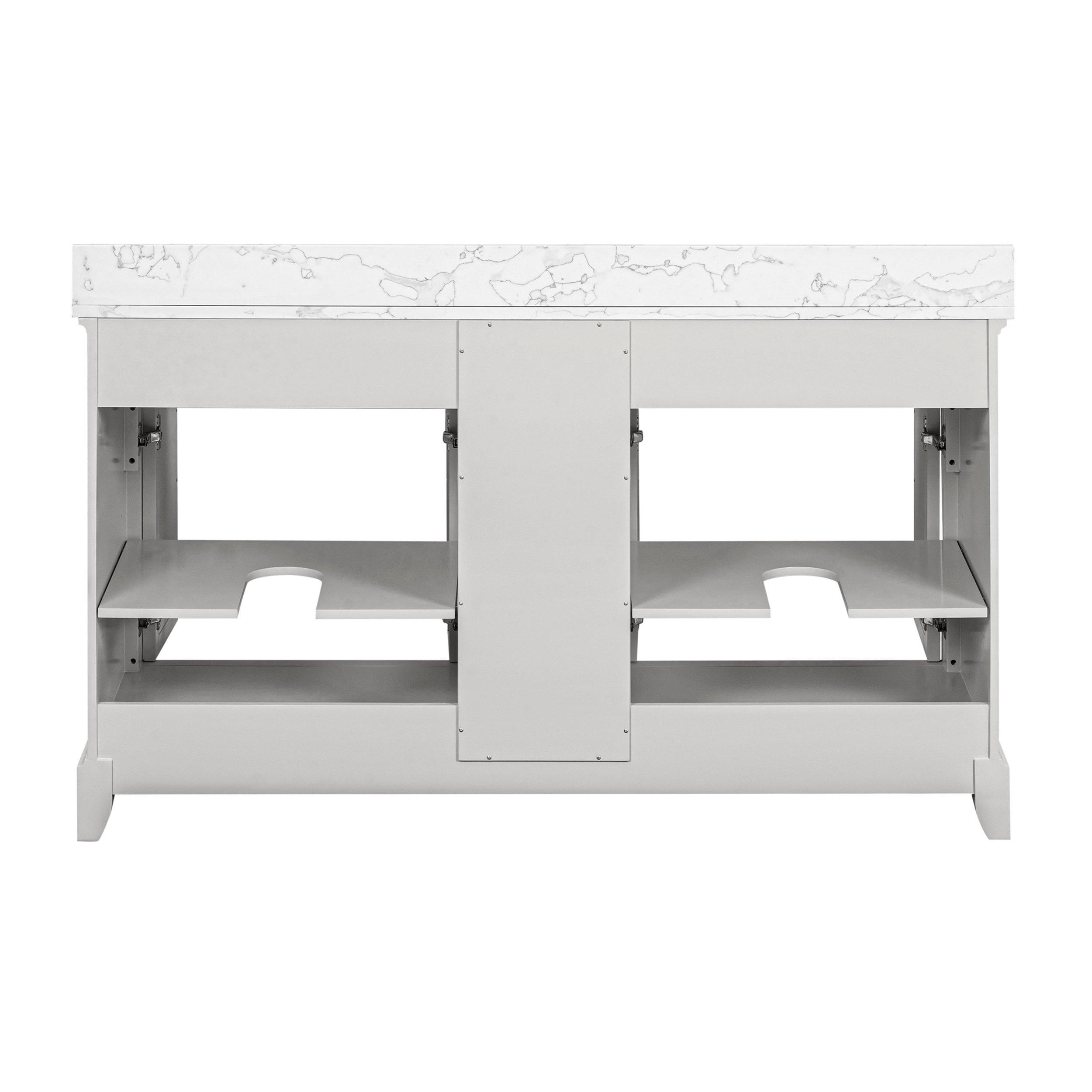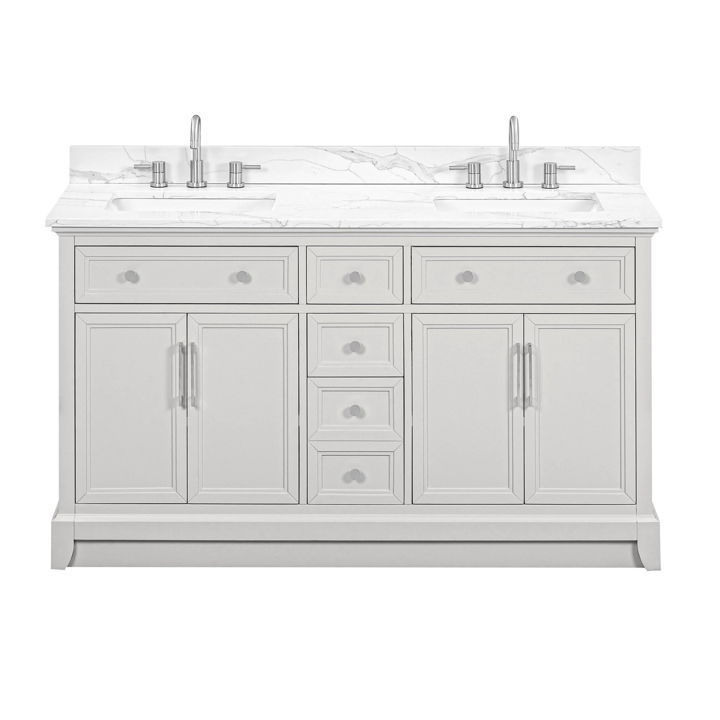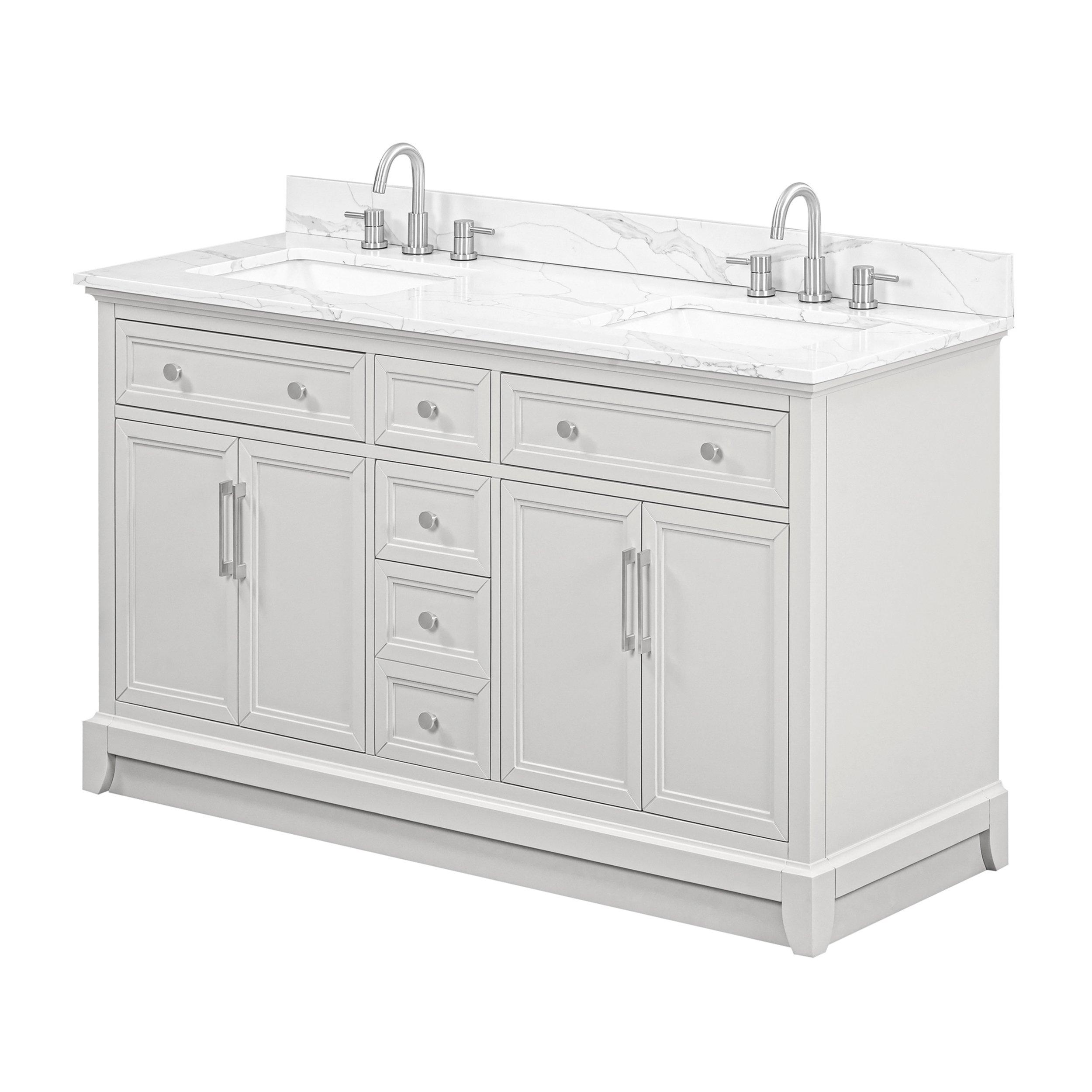Complete your bathroom with the beautiful Aurora 61 in. Gray Vanity with Quartz Top. This freestanding features durable solid wood, mdf cabinets in stunning gray with a white quartz vanity top and brushed nickel hardware. A charming double undermount sink in brilliant white is included. The Aurora 61 in. Gray Vanity with Quartz Top is a versatile choice to customize multiple bathroom settings.