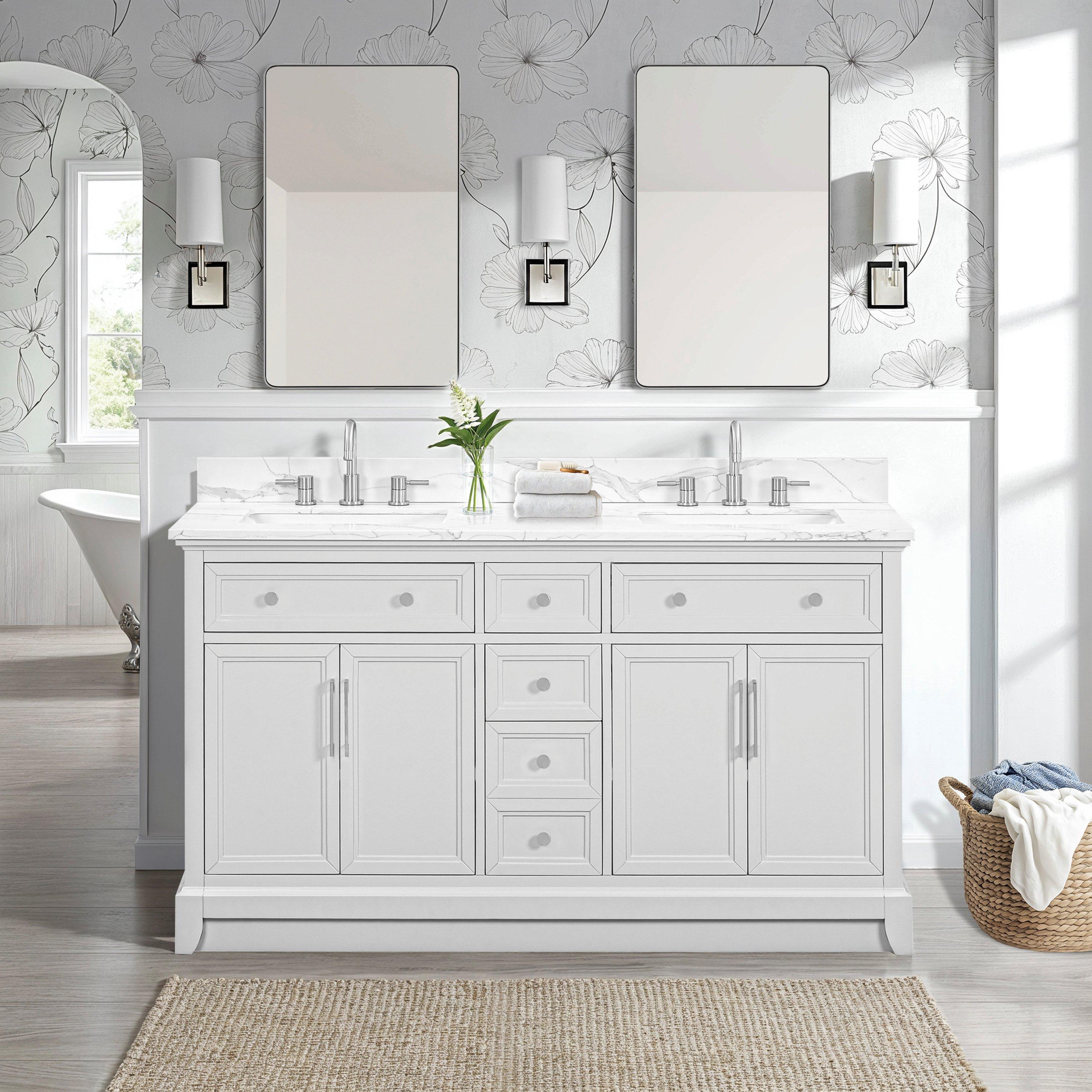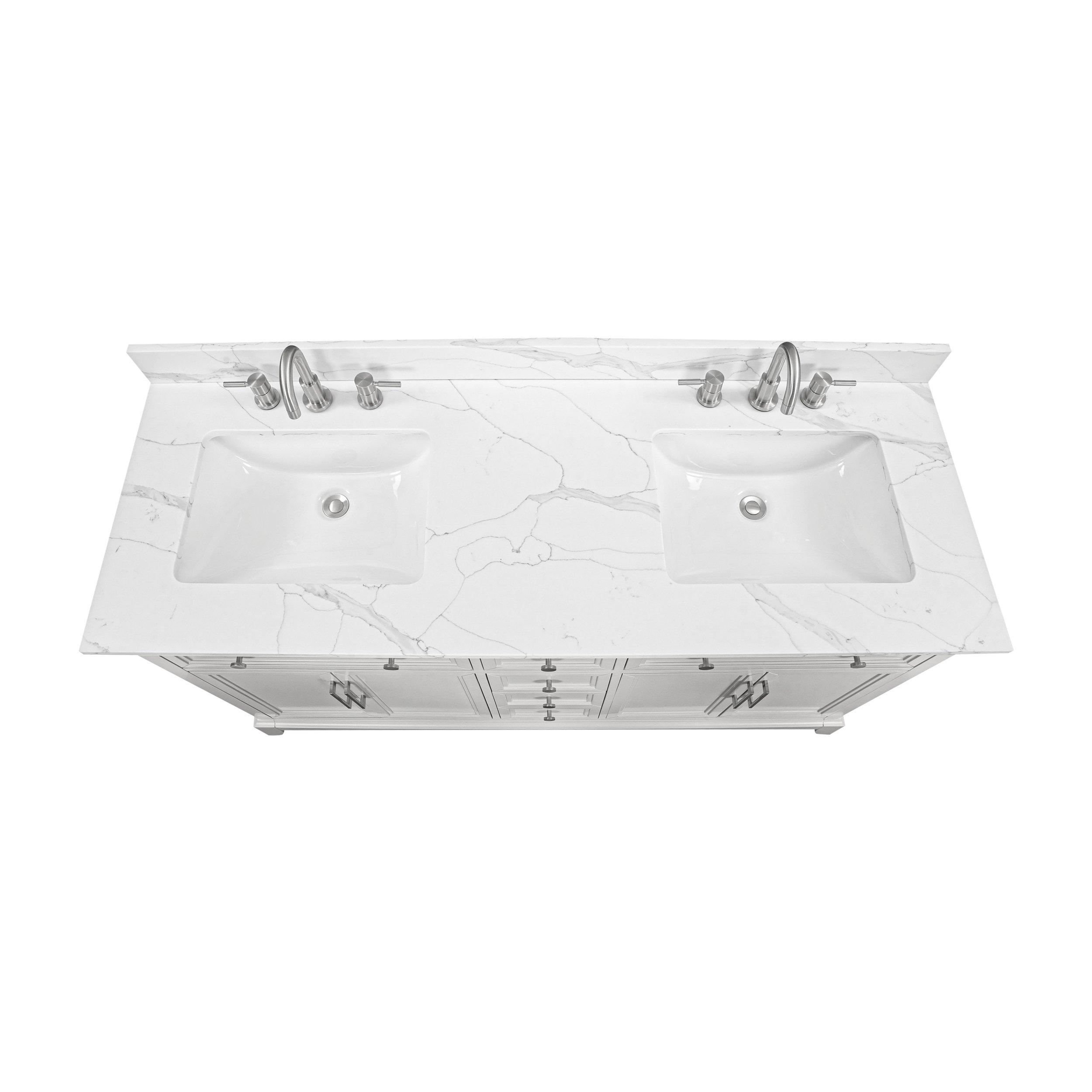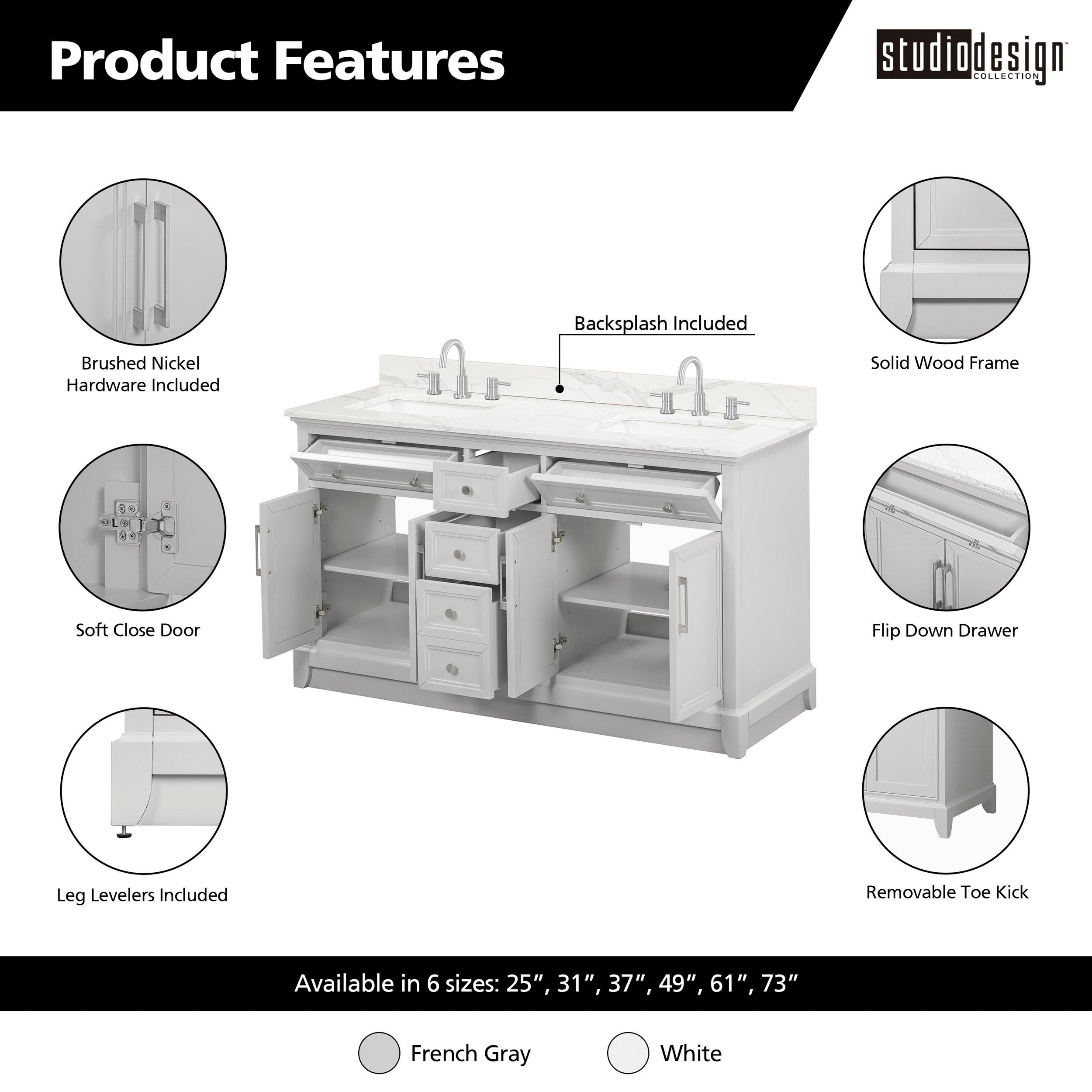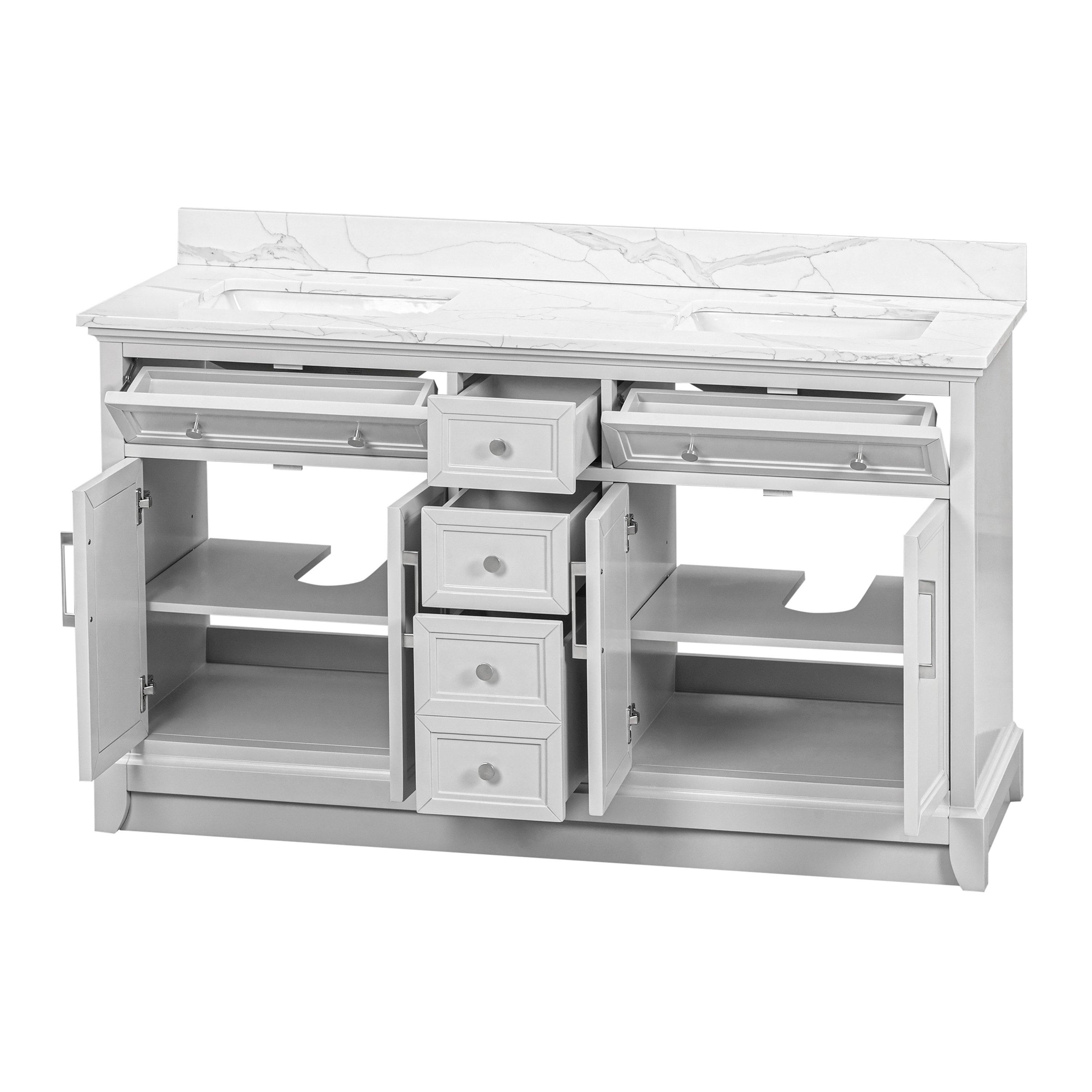 Complete your bathroom with the beautiful Aurora 61 in. Gray Vanity with Quartz Top. This freestanding features durable solid wood, mdf cabinets in stunning gray with a white quartz vanity top and brushed nickel hardware. A charming double undermount sink in brilliant white is included. The Aurora 61 in. Gray Vanity with Quartz Top is a versatile choice to customize multiple bathroom settings.