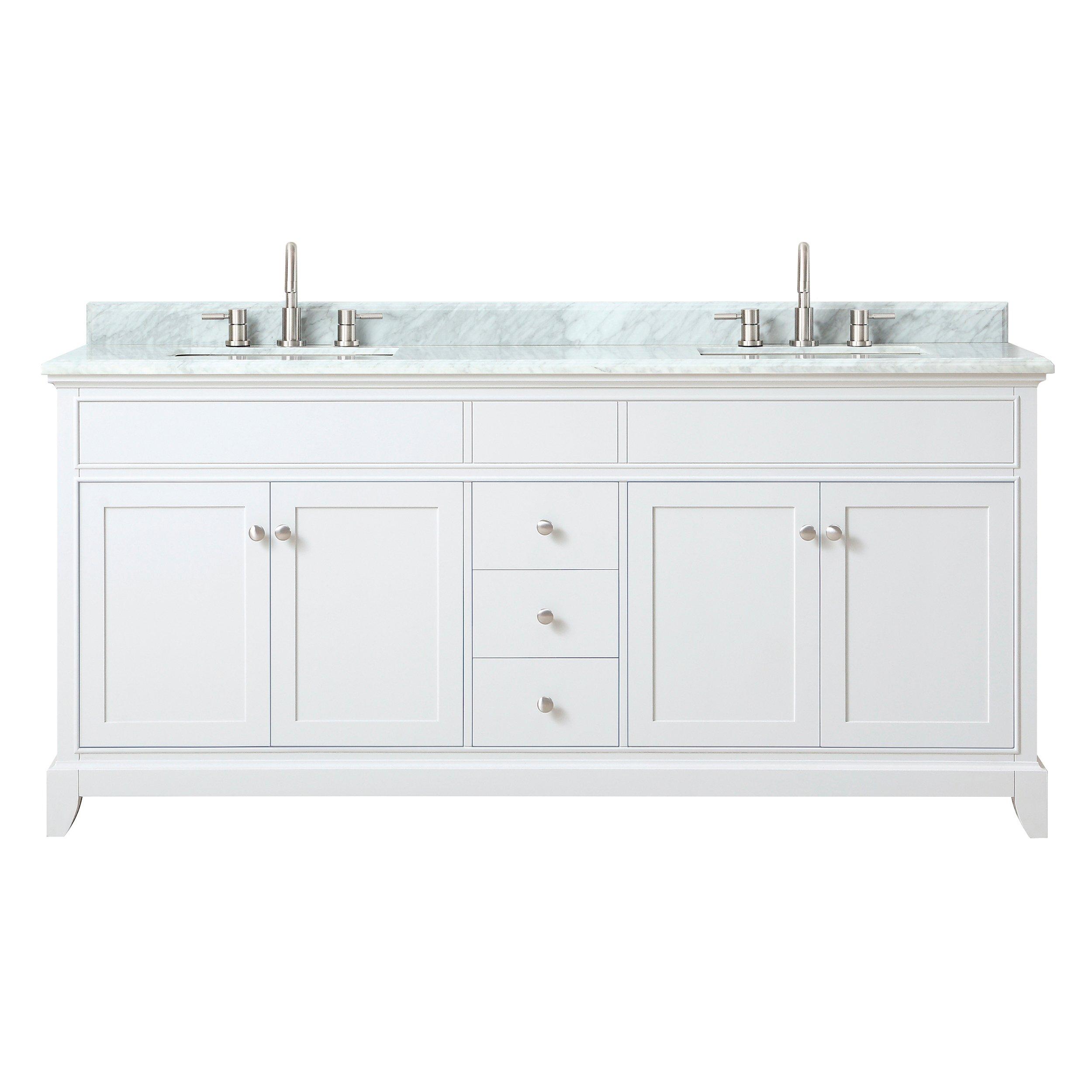 Tailor the look of your bathroom with the Aurora 73 in. White Vanity with Carrara Marble Top featuring gorgeous solid wood, mdf in white with 4 doors, 3 drawers, and 2 shelves. This piece is completed with beautiful brushed nickel hardware and a double undermount white sink. The Aurora 73 in. White Vanity with Carrara Marble Top is a stunning addition to any bathroom setting.