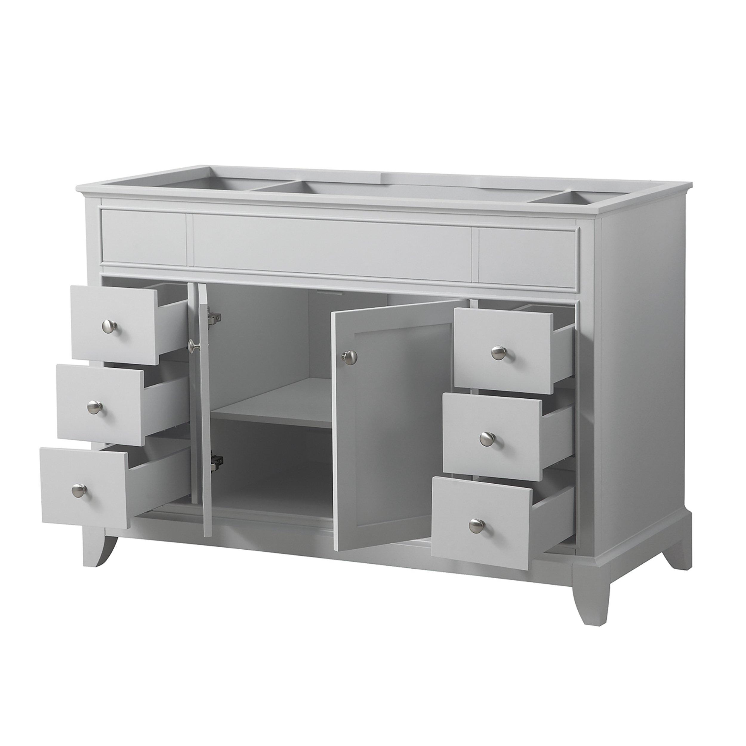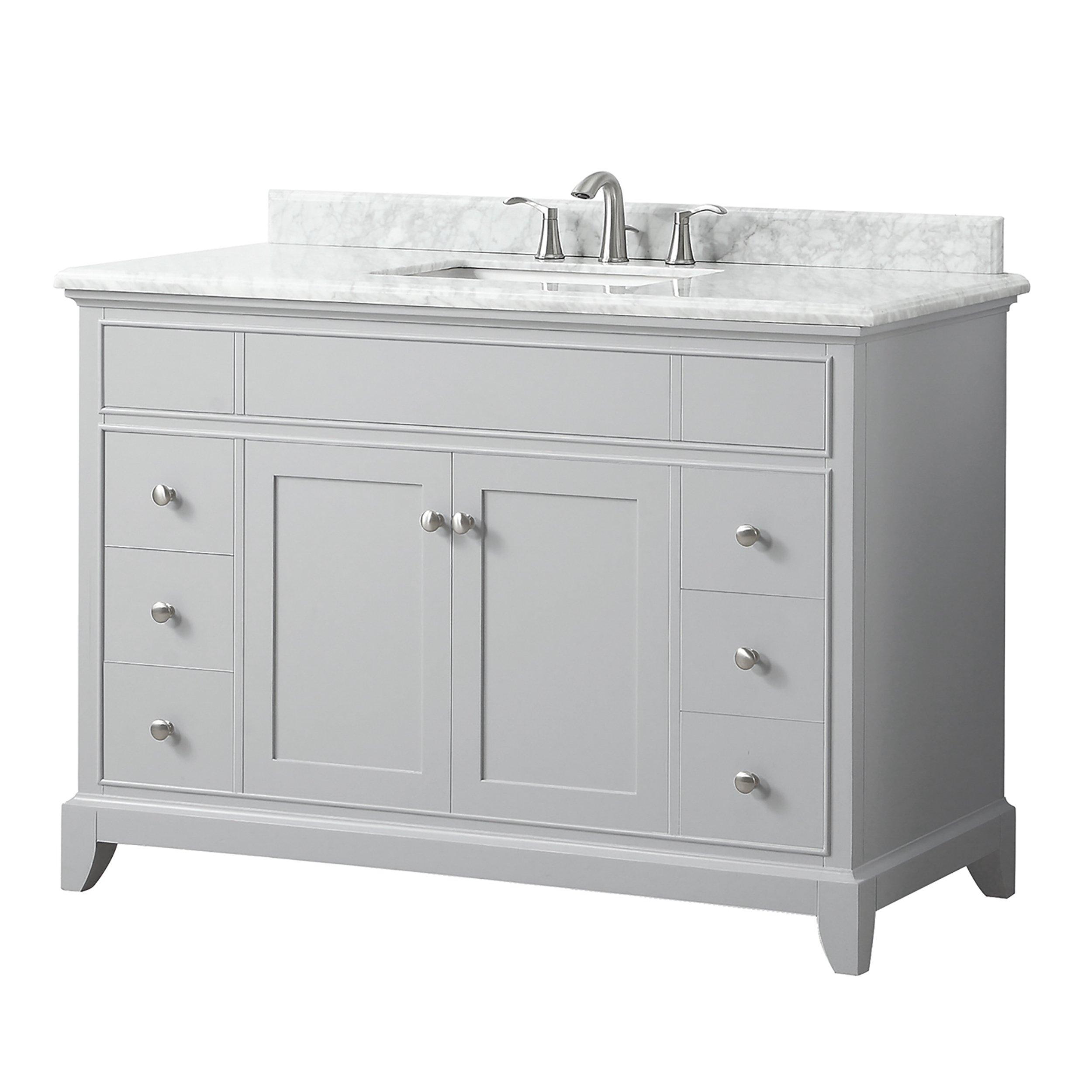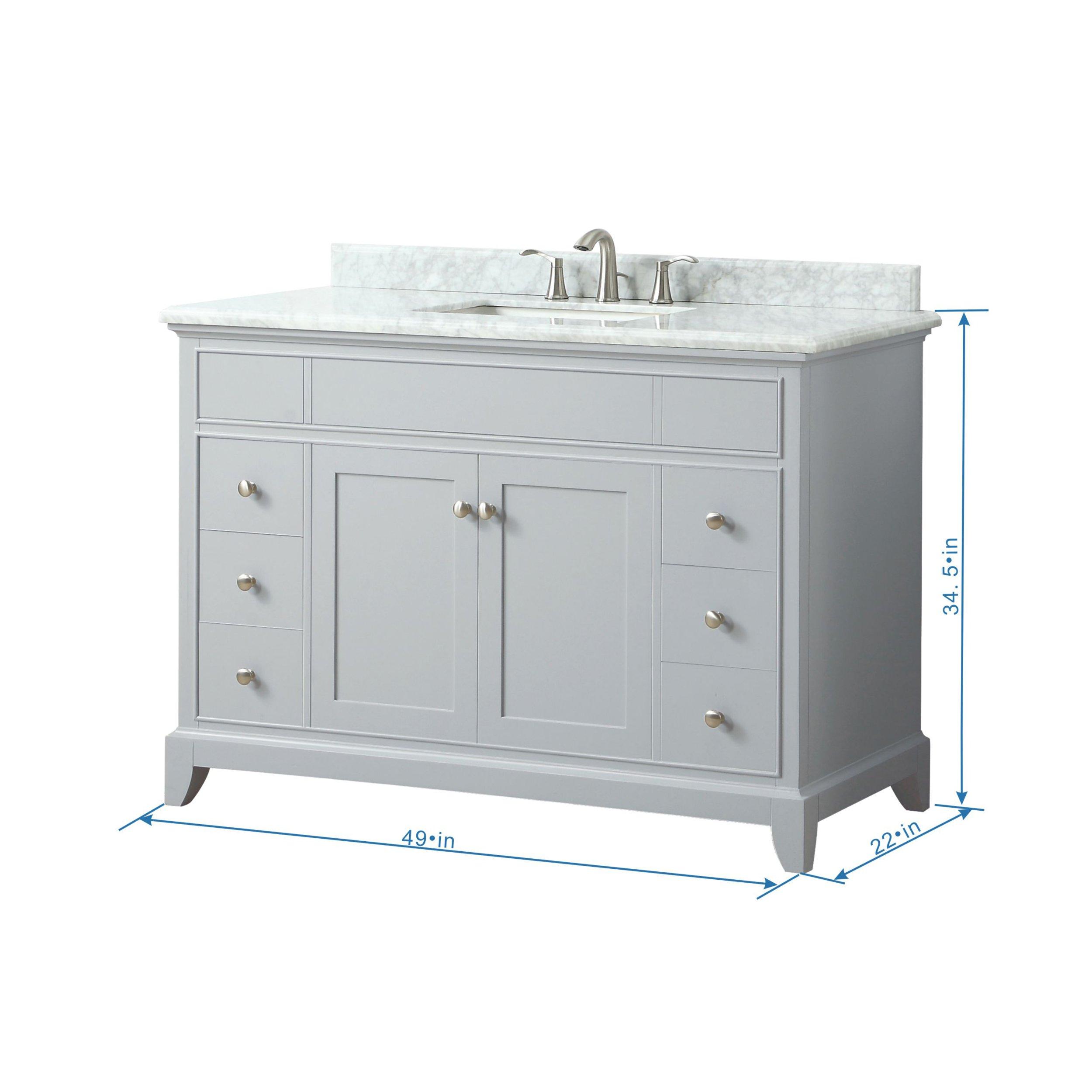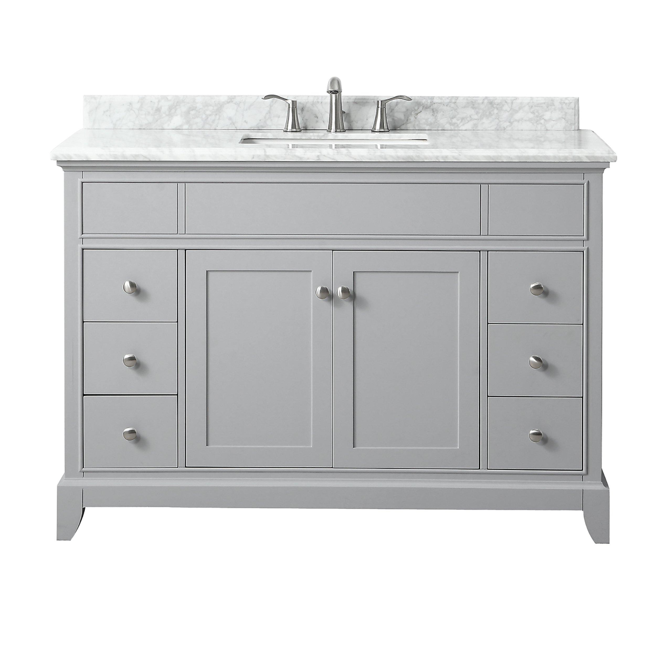 The Aurora 49 in. Gray Vanity with Carrara Marble Top possesses a timeless aesthetic, establishing it as a versatile choice to anchor multiple bathroom settings. This 49in. vanity ensemble features a light gray finish with brushed nickel hardware. It announces its quality with its solid poplar wood frame and soft-close storage compartments. The Aurora vanity combination includes a Carrara marble top and single rectangular undermount sink. Match the vanity with the coordinating mirror and faucet, and Aurora will delight for years to come.• Freestanding Installation• Soft Closing Doors & Drawers• Rectangular Undermount Sink• Adjustable Height Levelers• Warranty: 1 Year Limited• Faucet Sold SeparatelyVANITY DETAILS• Cabinet Color: Light Gray• Cabinet Materials: Hardwood & MDF• Vanity Top Materials: Carrara White Marble• Number of Drawers: 6• Number of Doors: 2• Number of Shelves: 1
