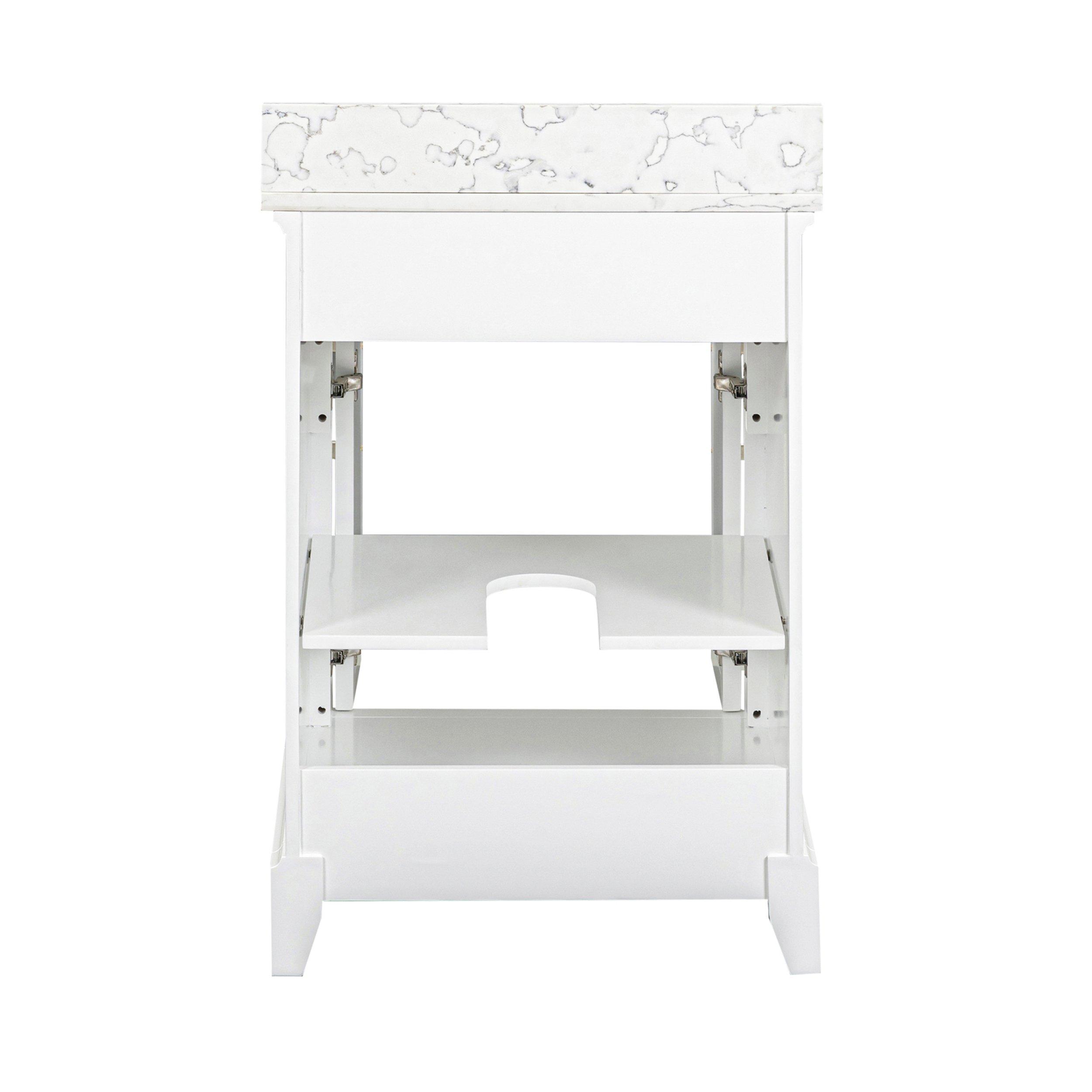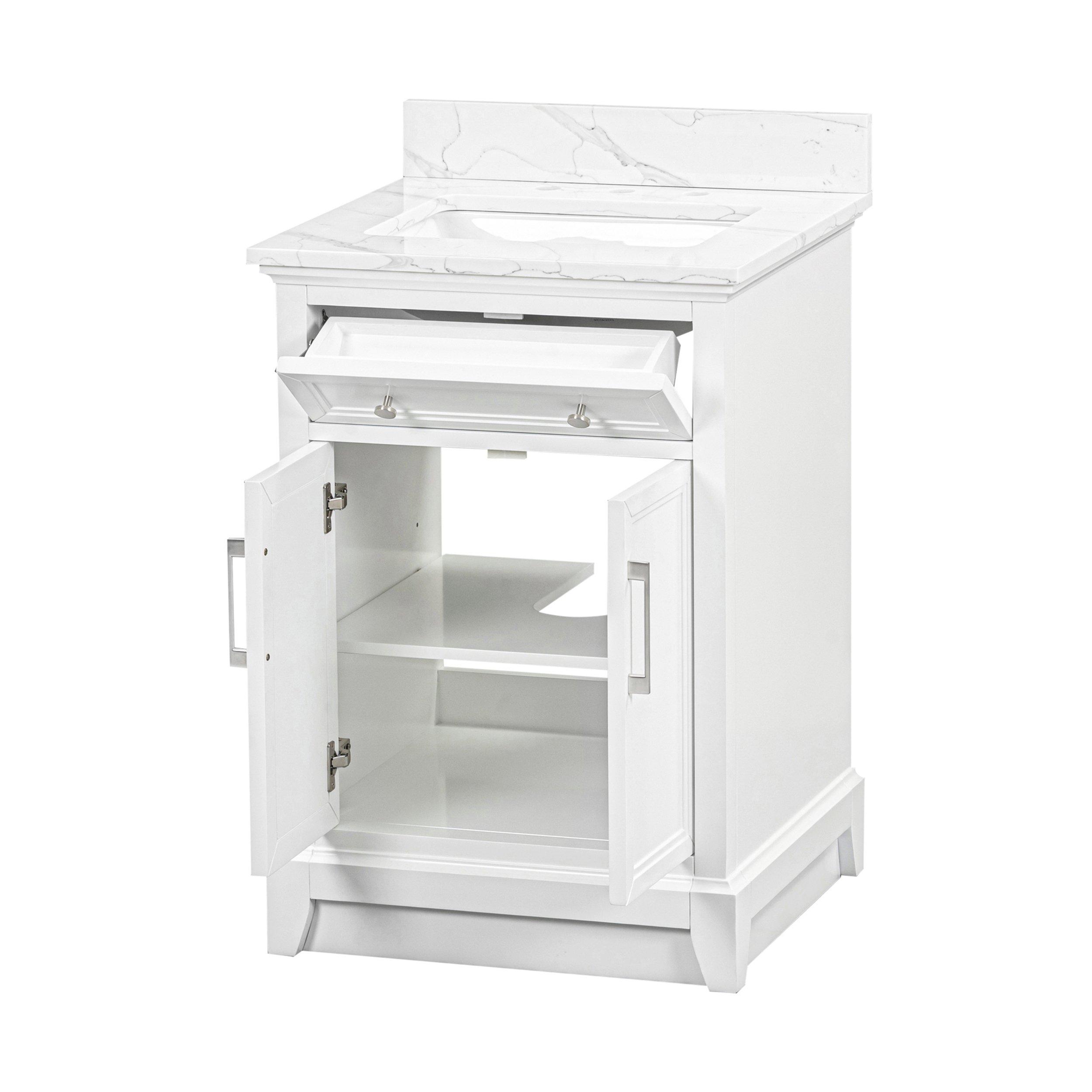 Tailor the look of your bathroom with the Aurora 25 in. White Vanity with Quartz Top featuring gorgeous solid wood, mdf in white with 2 doors, 1 drawers, and 1 shelves. This piece is completed with beautiful brushed nickel hardware and a single undermount white sink. The Aurora 25 in. White Vanity with Quartz Top is a stunning addition to any bathroom setting.