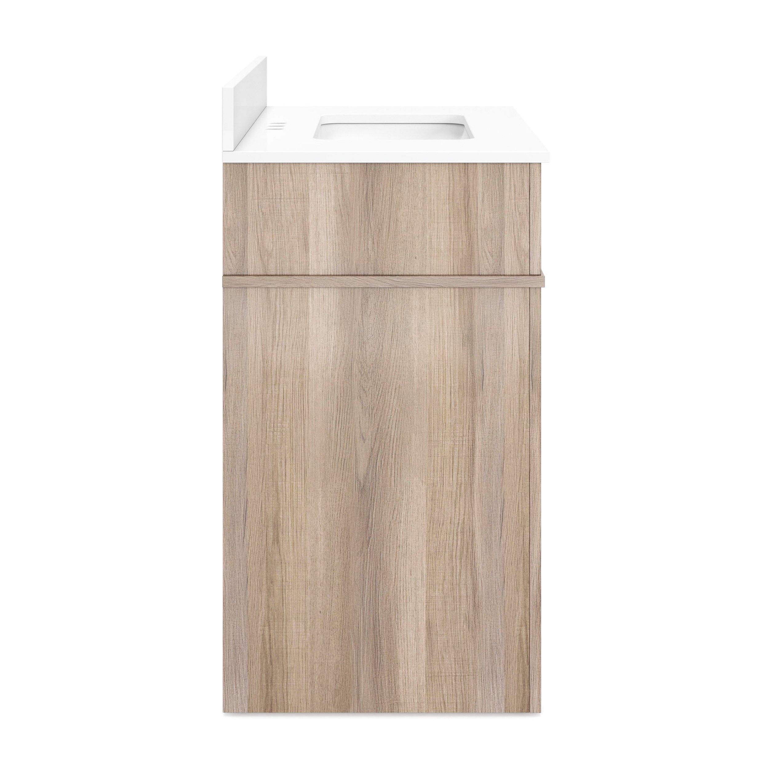 Complete your bathroom with the beautiful Bellville 31 in. Oak Finish Vanity with Engineered Stone Top. This freestanding features durable mdf cabinets in stunning natural with a white composite vanity top and matte black hardware. A charming single undermount sink in brilliant white is included. The Bellville 31 in. Oak Finish Vanity with Engineered Stone Top is a versatile choice to customize multiple bathroom settings.