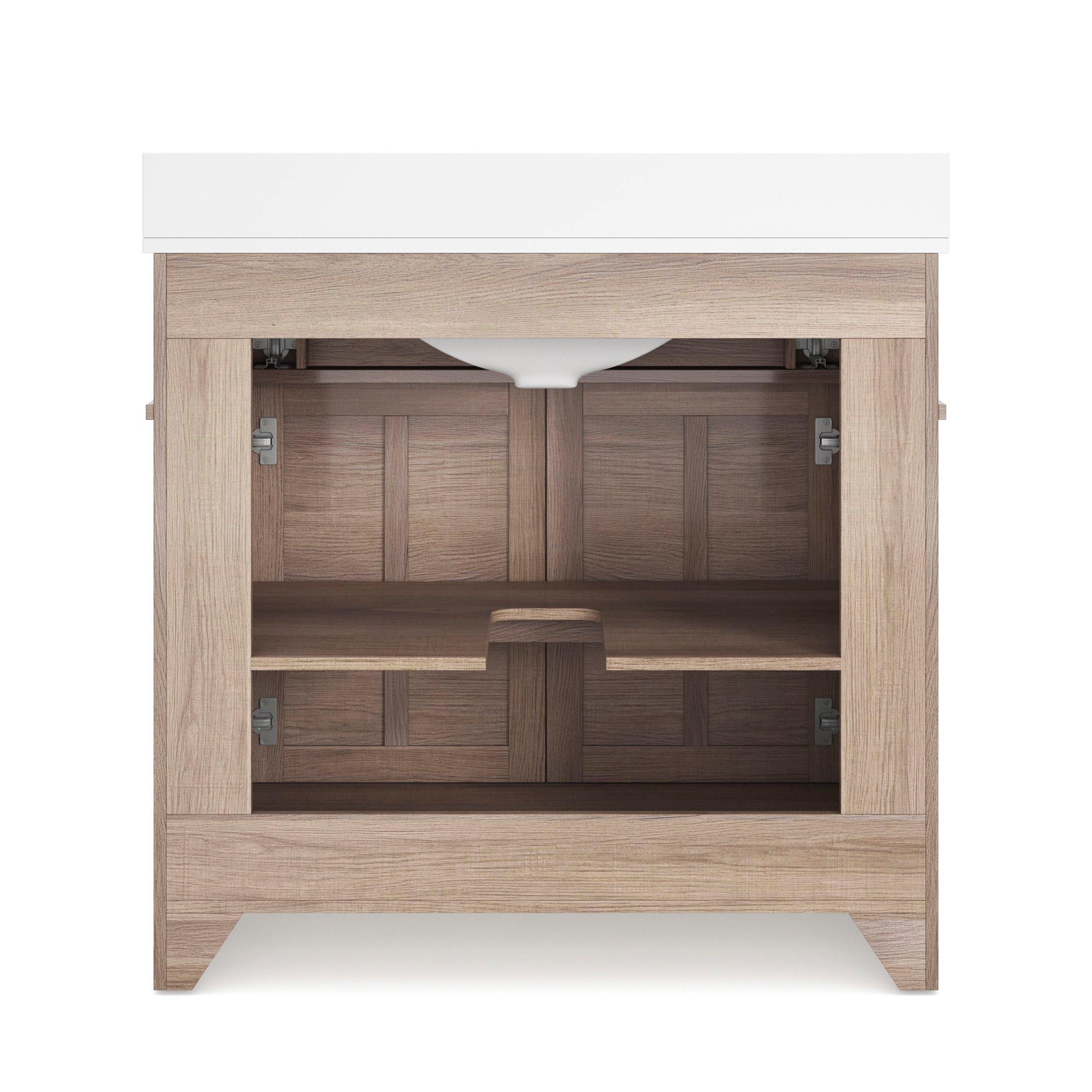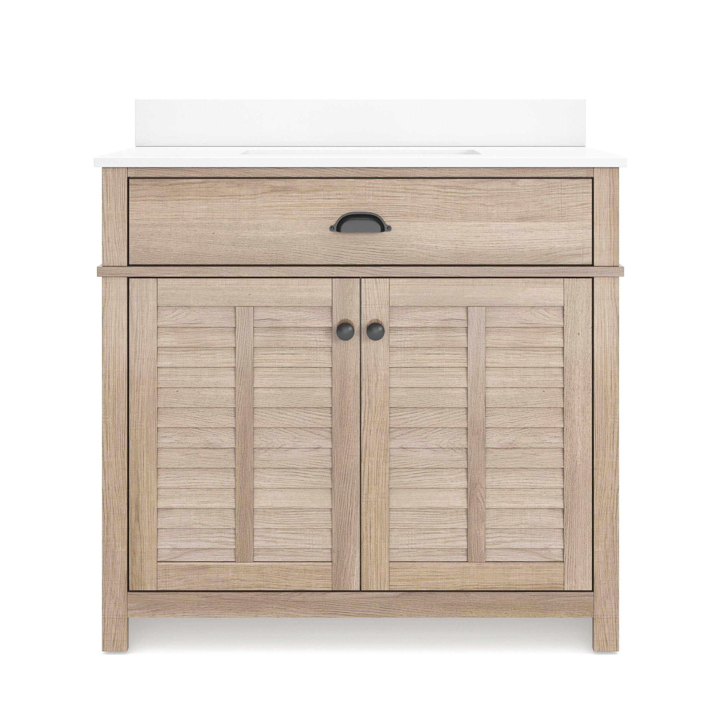 Tailor the look of your bathroom with the Bellville 37 in. Oak Finish Vanity with Engineered Stone Top featuring gorgeous mdf in natural with 2 doors, 1 drawers, and 1 shelves. This piece is completed with beautiful matte black hardware and a single undermount white sink. The Bellville 37 in. Oak Finish Vanity with Engineered Stone Top is a stunning addition to any bathroom setting.