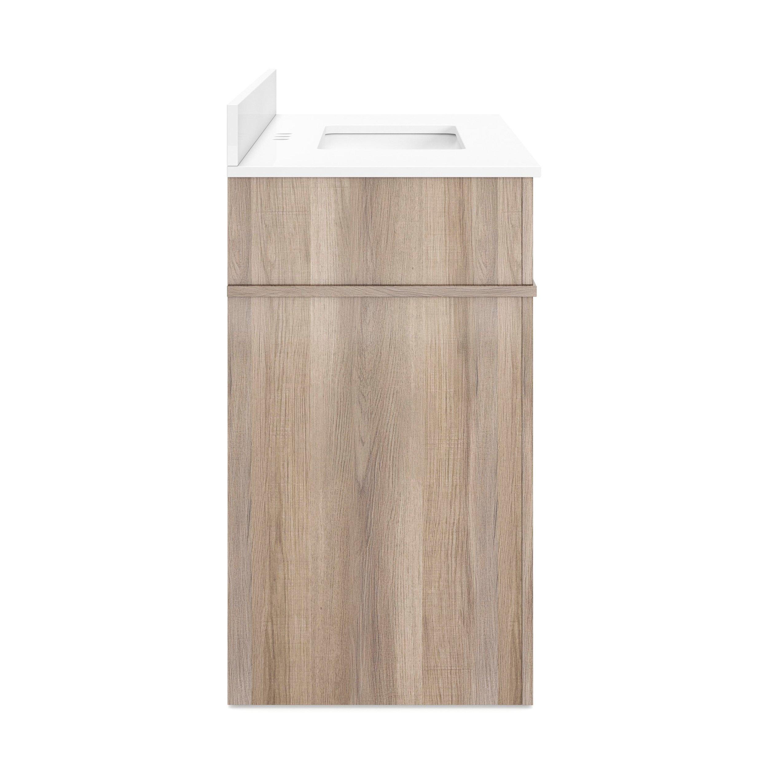 Tailor the look of your bathroom with the Bellville 37 in. Oak Finish Vanity with Engineered Stone Top featuring gorgeous mdf in natural with 2 doors, 1 drawers, and 1 shelves. This piece is completed with beautiful matte black hardware and a single undermount white sink. The Bellville 37 in. Oak Finish Vanity with Engineered Stone Top is a stunning addition to any bathroom setting.