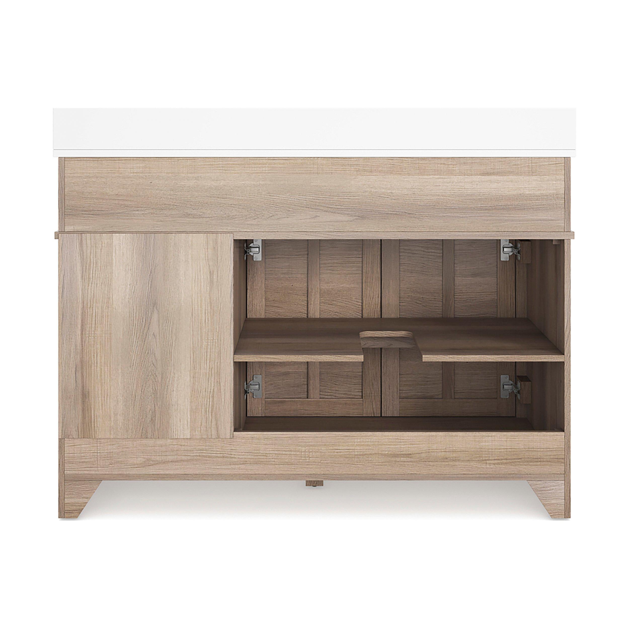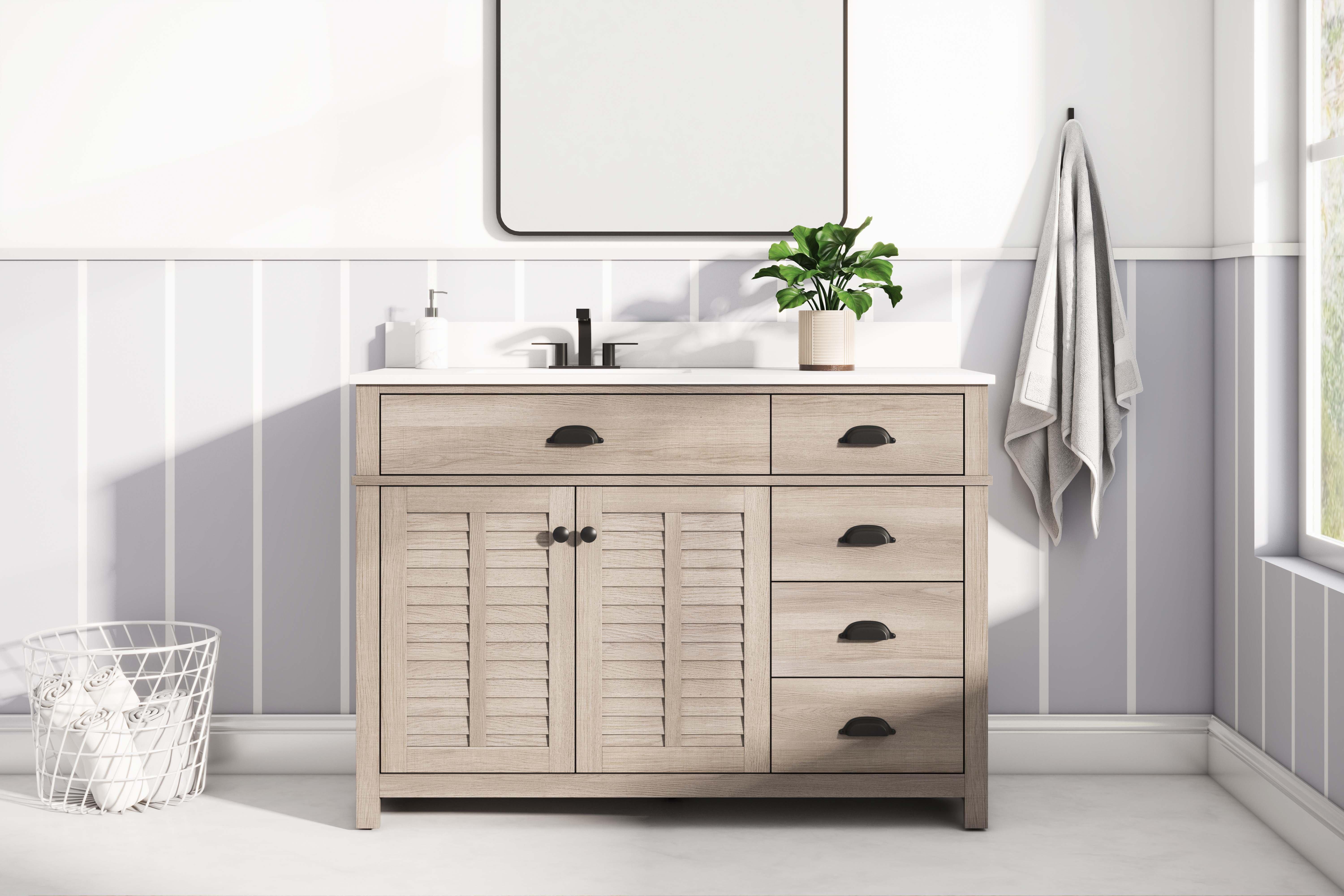Complete your bathroom with the beautiful Bellville 49 in. Oak Finish Vanity with Engineered Stone Top. This freestanding features durable mdf cabinets in stunning natural with a white composite vanity top and matte black hardware. A charming single undermount sink in brilliant white is included. The Bellville 49 in. Oak Finish Vanity with Engineered Stone Top is a versatile choice to customize multiple bathroom settings.