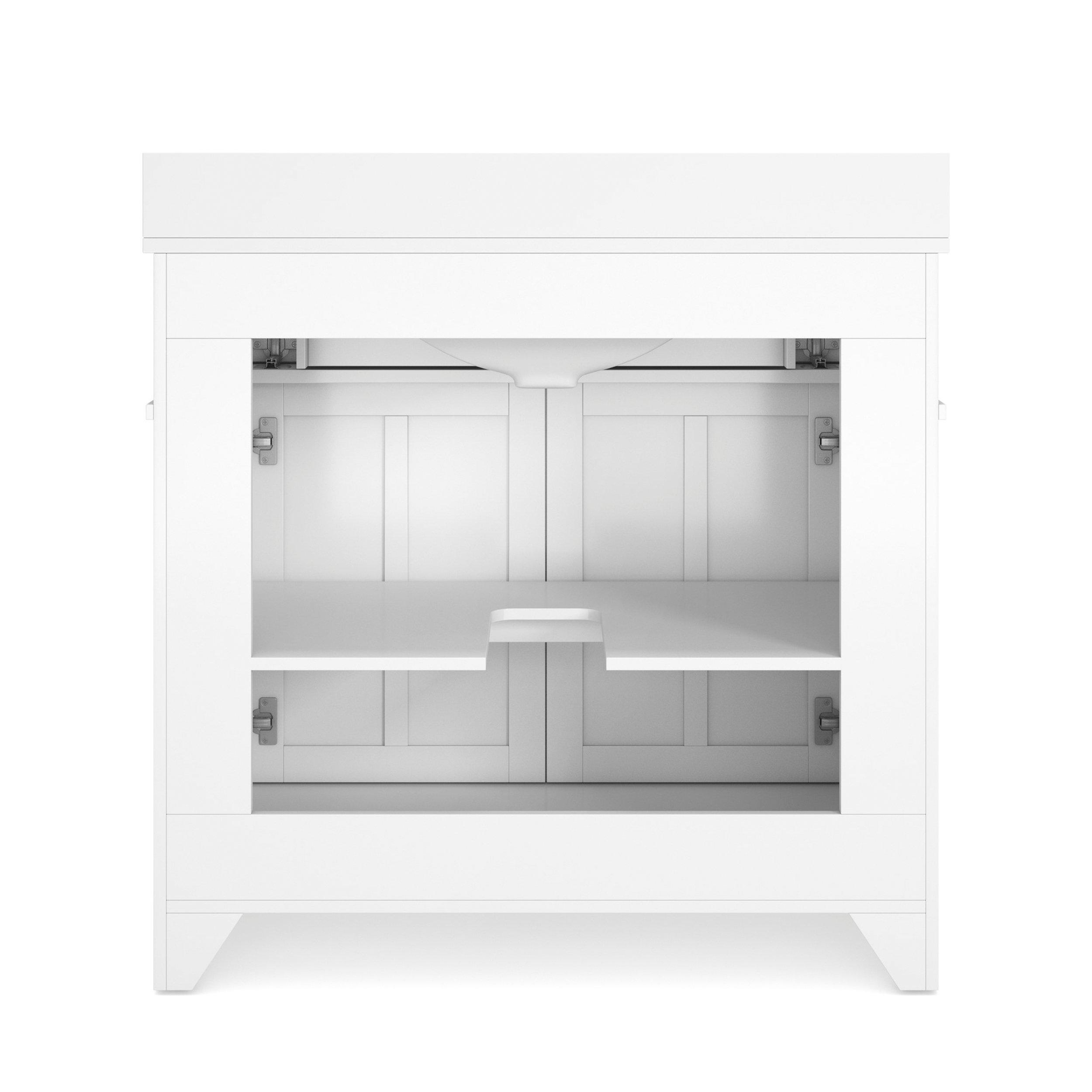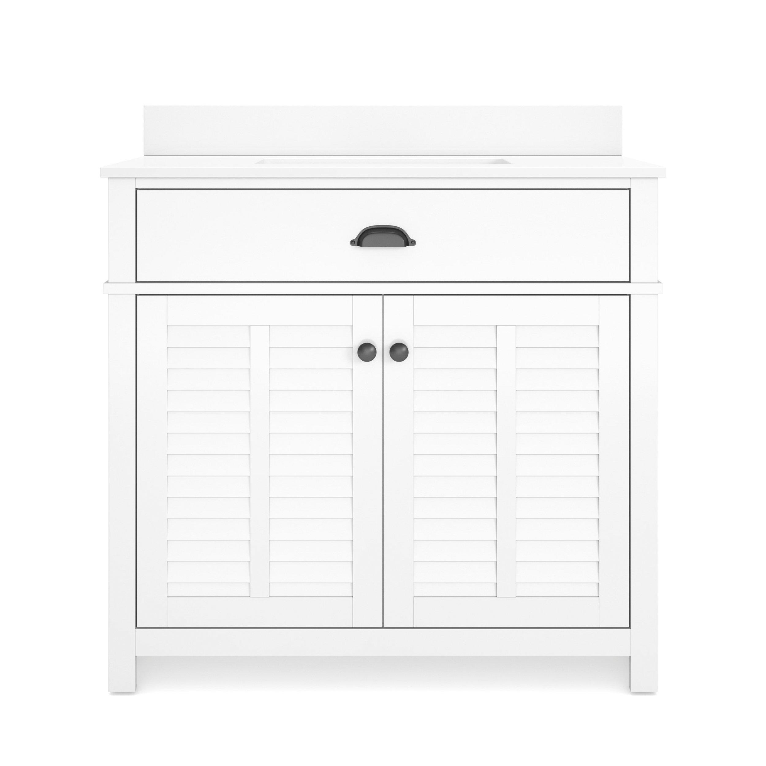 Complete your bathroom with the beautiful Bellville 37 in. White Vanity with Engineered Stone Top. This freestanding features durable mdf cabinets in stunning white with a white composite vanity top and matte black hardware. A charming single undermount sink in brilliant white is included. The Bellville 37 in. White Vanity with Engineered Stone Top is a versatile choice to customize multiple bathroom settings.