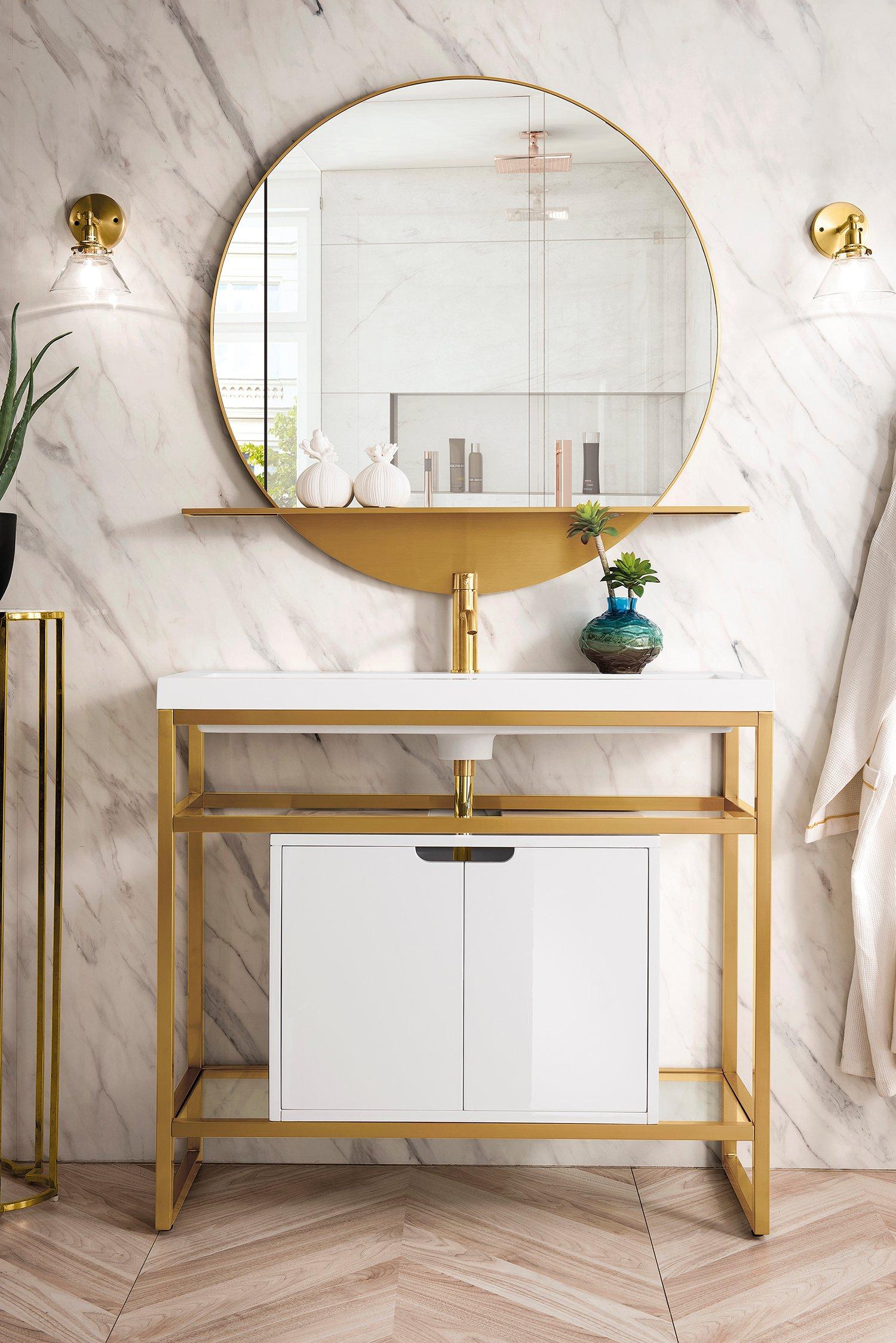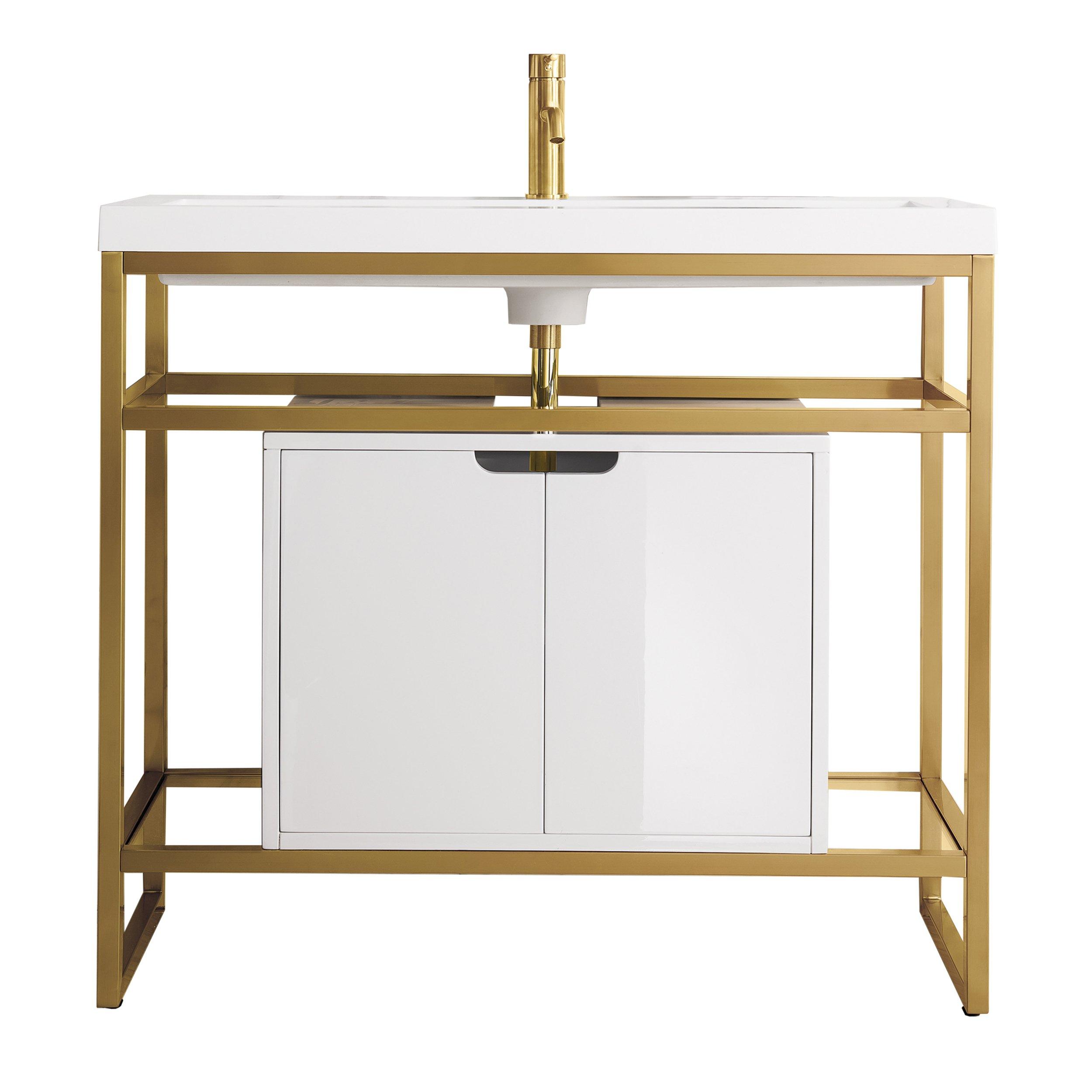 The Boston 39.5-inch Stainless Steel Console by James Martin Vanities is a striking and bold addition that can transform the look of any bathroom. Crafted with meticulous attention to detail, this console boasts a durable stainless-steel base with a radiant gold finish. The result is clean lines and a modern aesthetic that effortlessly complements a wide range of decor styles.