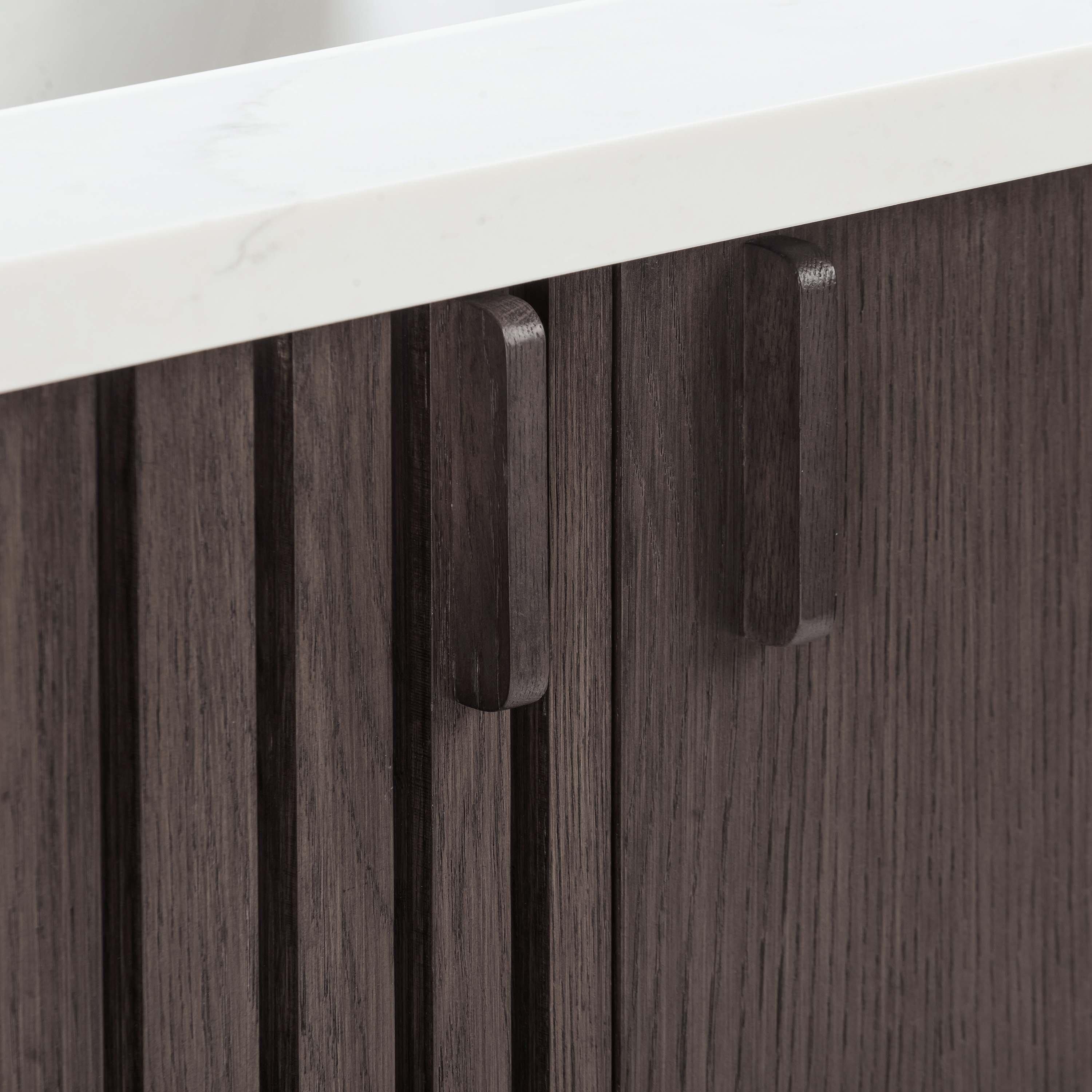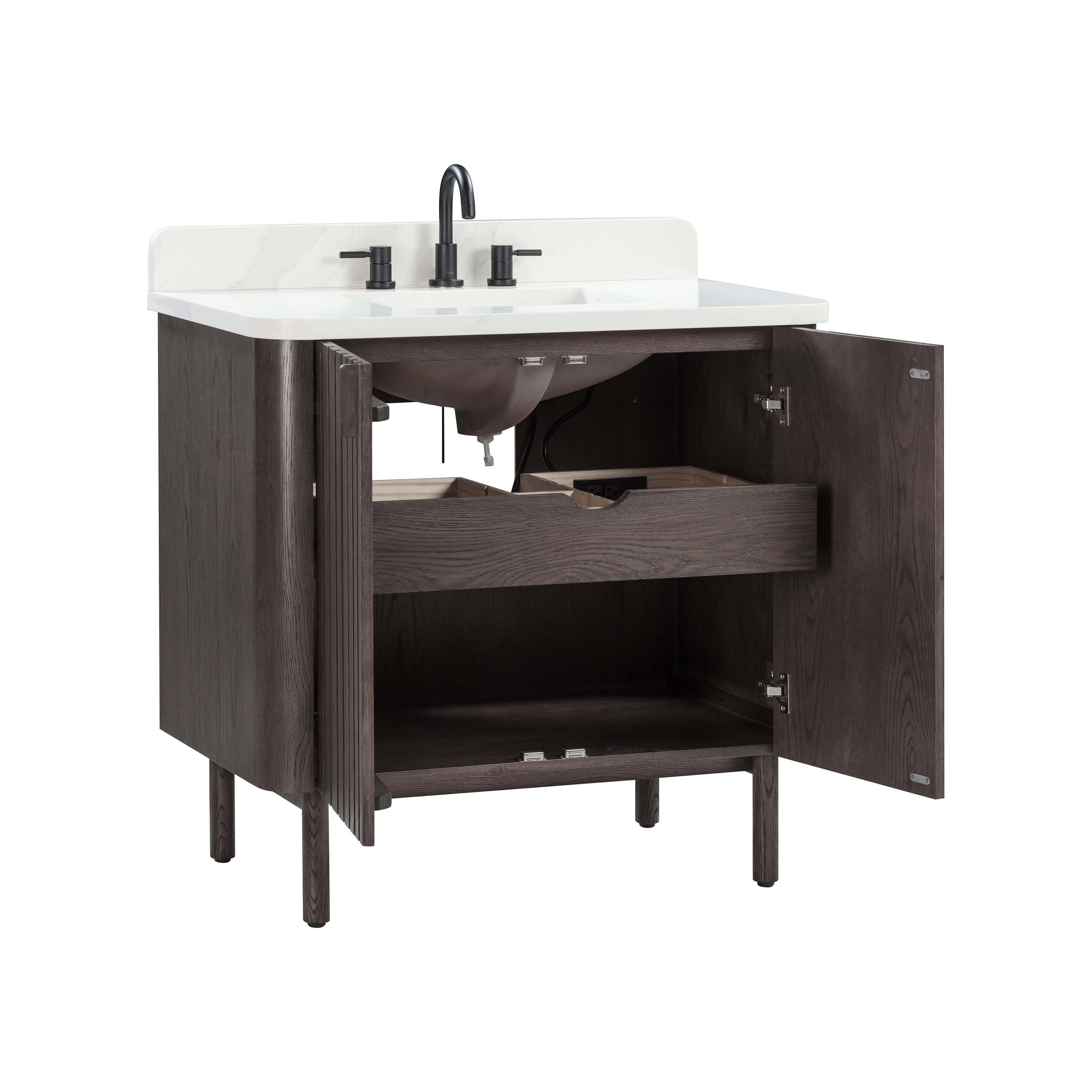 Complete your bathroom with the beautiful Bradley 37 in. Brown Oak Vanity with Calacatta Quartz Top. This freestanding features durable solid wood, mdf cabinets in stunning brown with a white quartz vanity top and n/a n/a hardware. A charming single undermount sink in brilliant white is included. The Bradley 37 in. Brown Oak Vanity with Calacatta Quartz Top is a versatile choice to customize multiple bathroom settings.