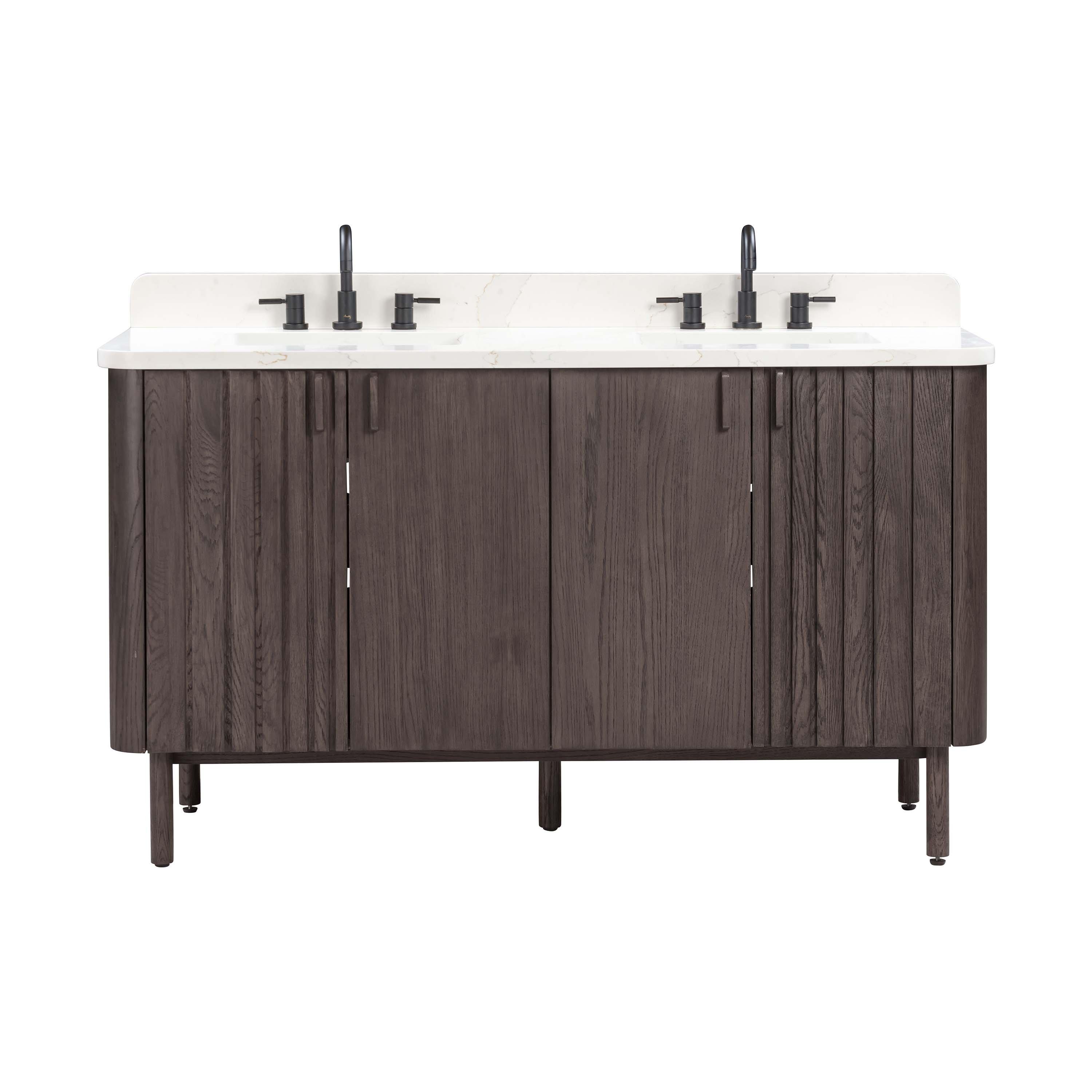 Tailor the look of your bathroom with the Bradley 61 in. Brown Oak Vanity with Calacatta Quartz Top featuring gorgeous solid wood, mdf in brown with 4 doors, 2 drawers, and 0 shelves. This piece is completed with beautiful n/a n/a hardware and a double undermount white sink. The Bradley 61 in. Brown Oak Vanity with Calacatta Quartz Top is a stunning addition to any bathroom setting.