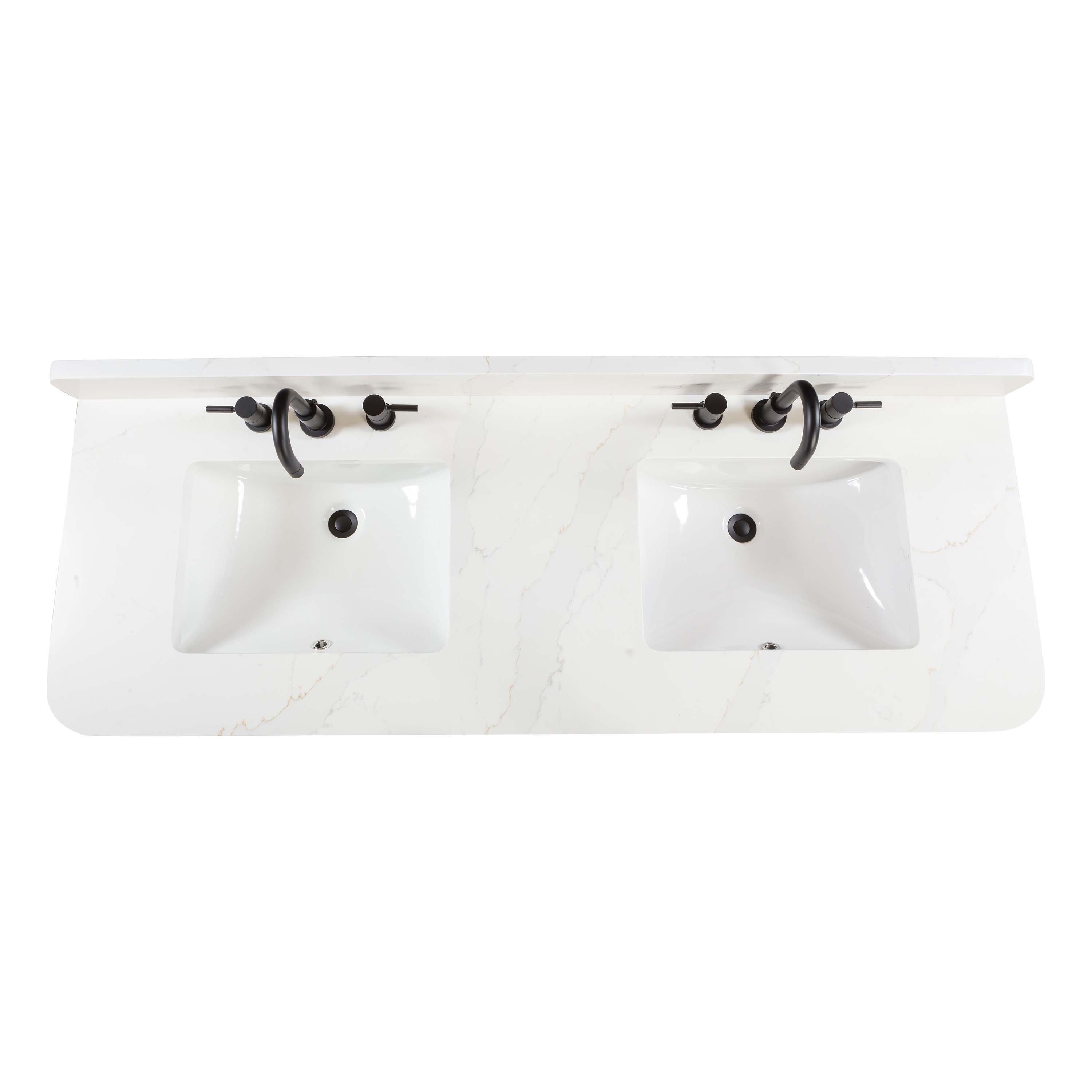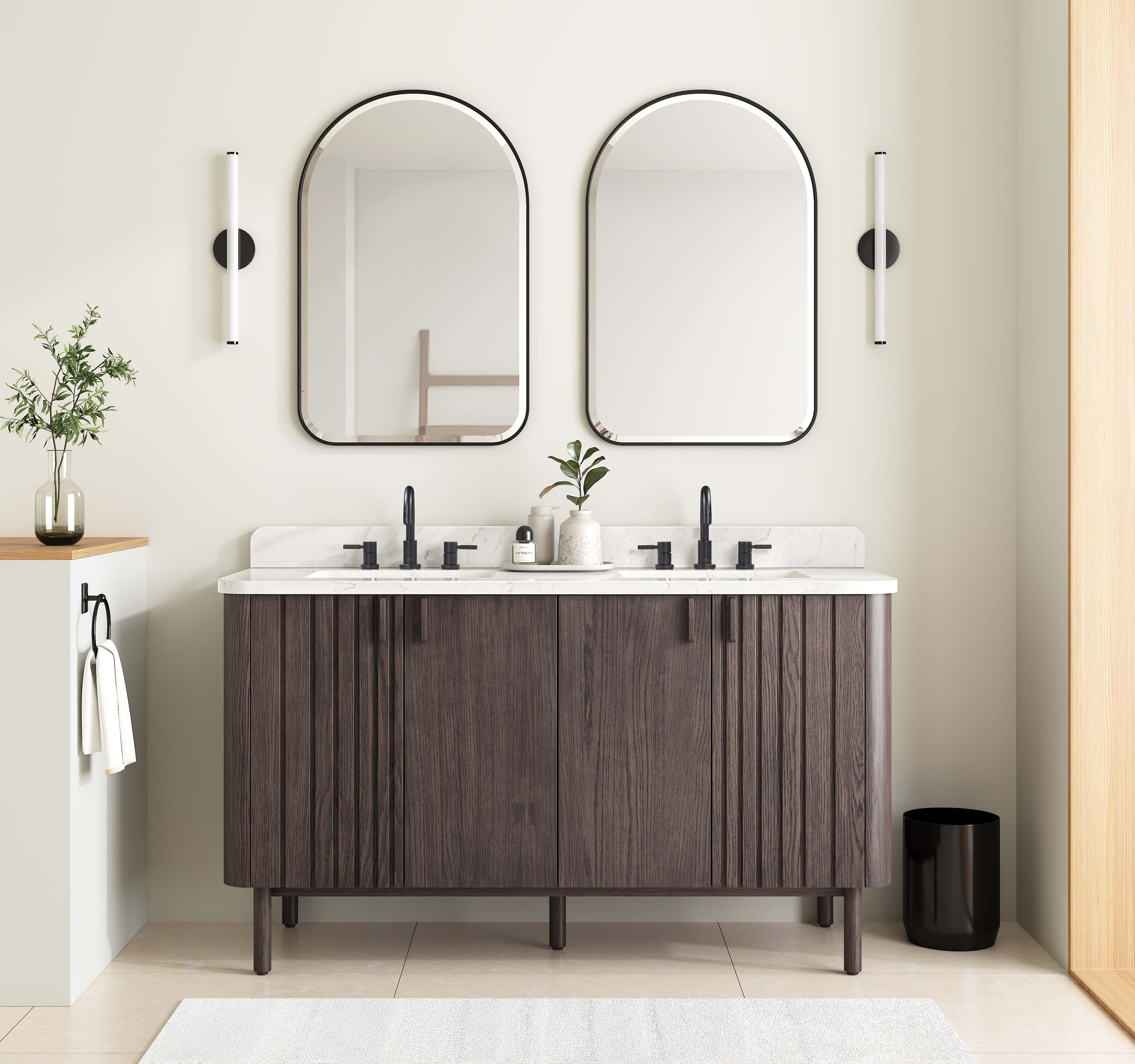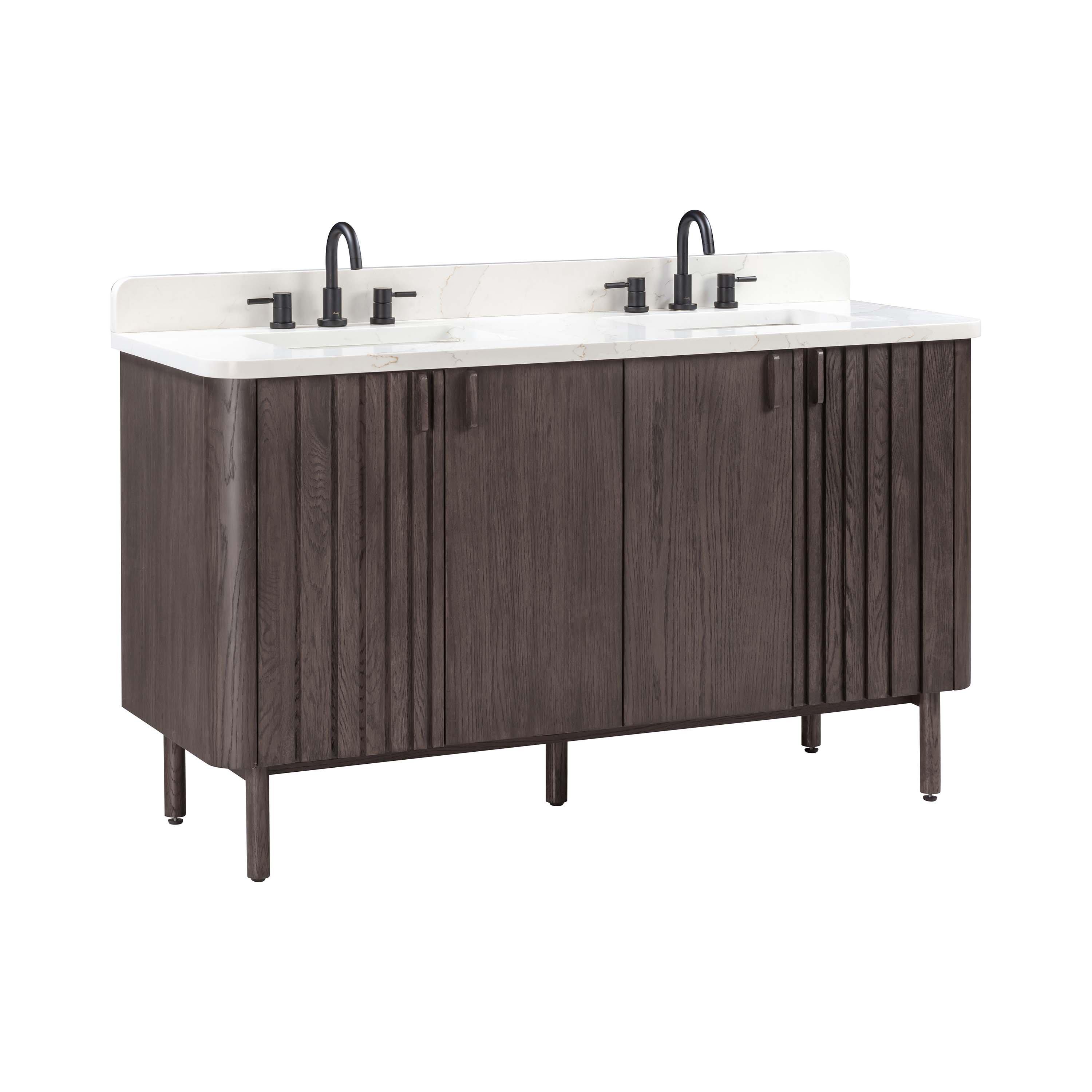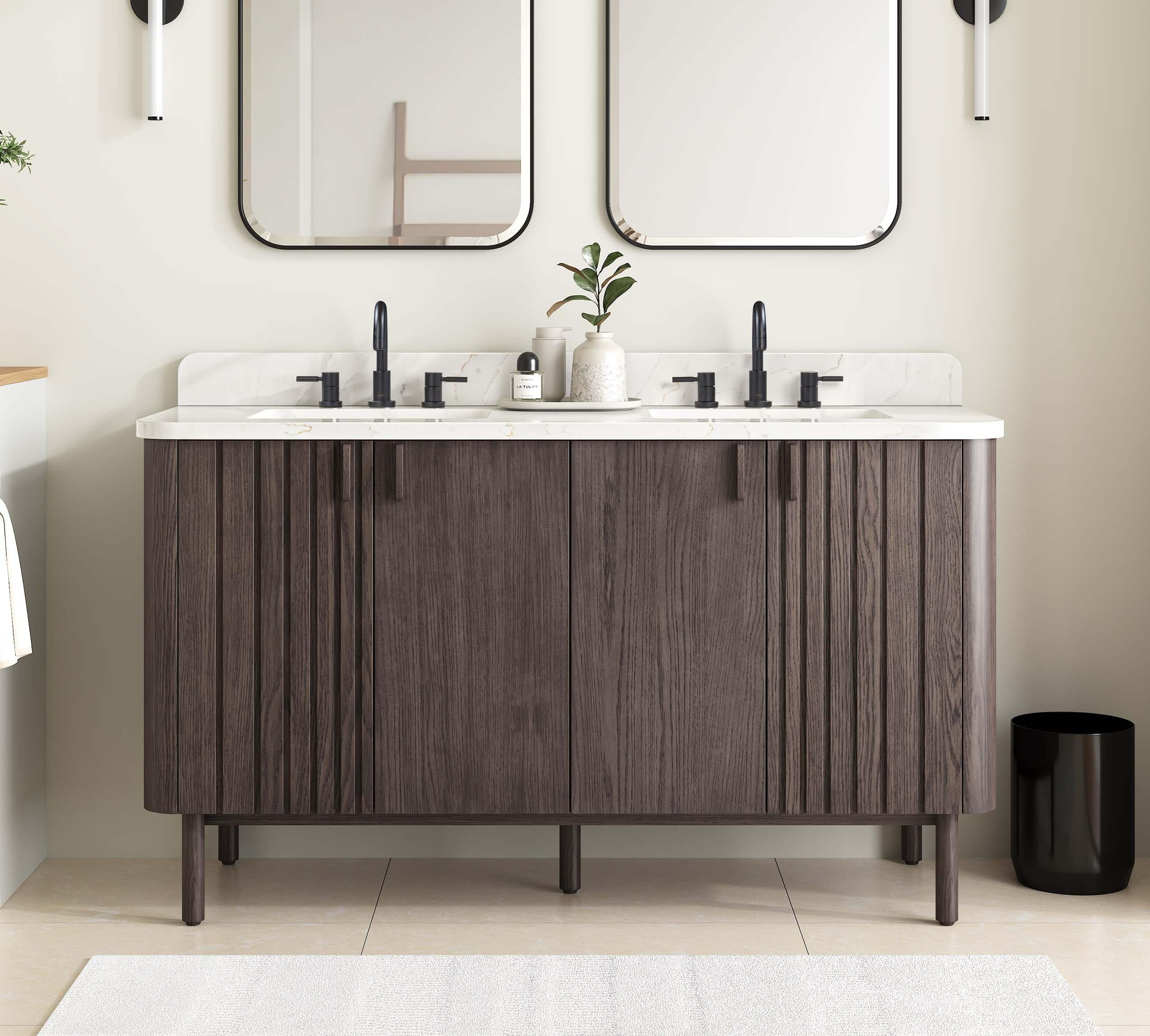 Tailor the look of your bathroom with the Bradley 61 in. Brown Oak Vanity with Calacatta Quartz Top featuring gorgeous solid wood, mdf in brown with 4 doors, 2 drawers, and 0 shelves. This piece is completed with beautiful n/a n/a hardware and a double undermount white sink. The Bradley 61 in. Brown Oak Vanity with Calacatta Quartz Top is a stunning addition to any bathroom setting.