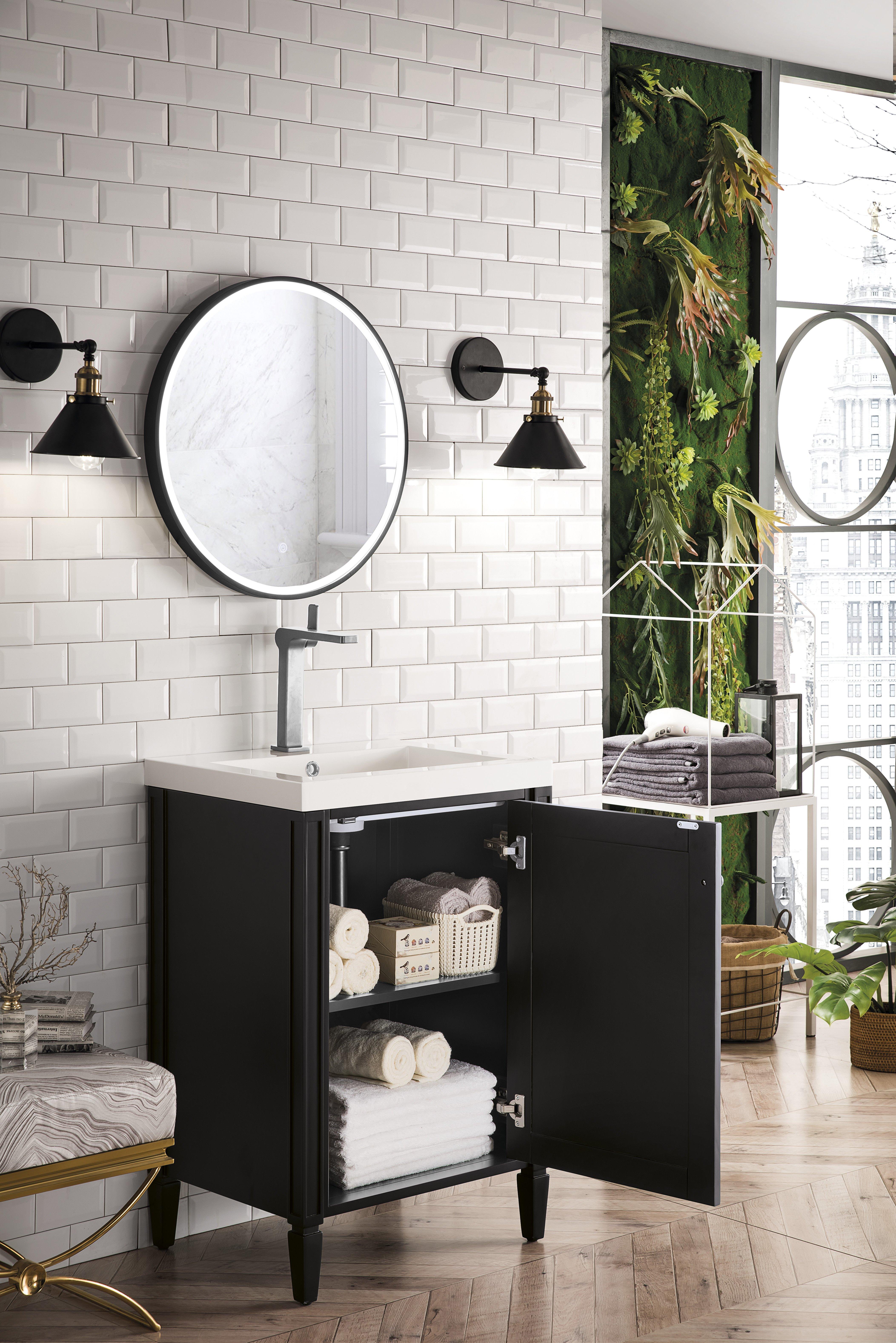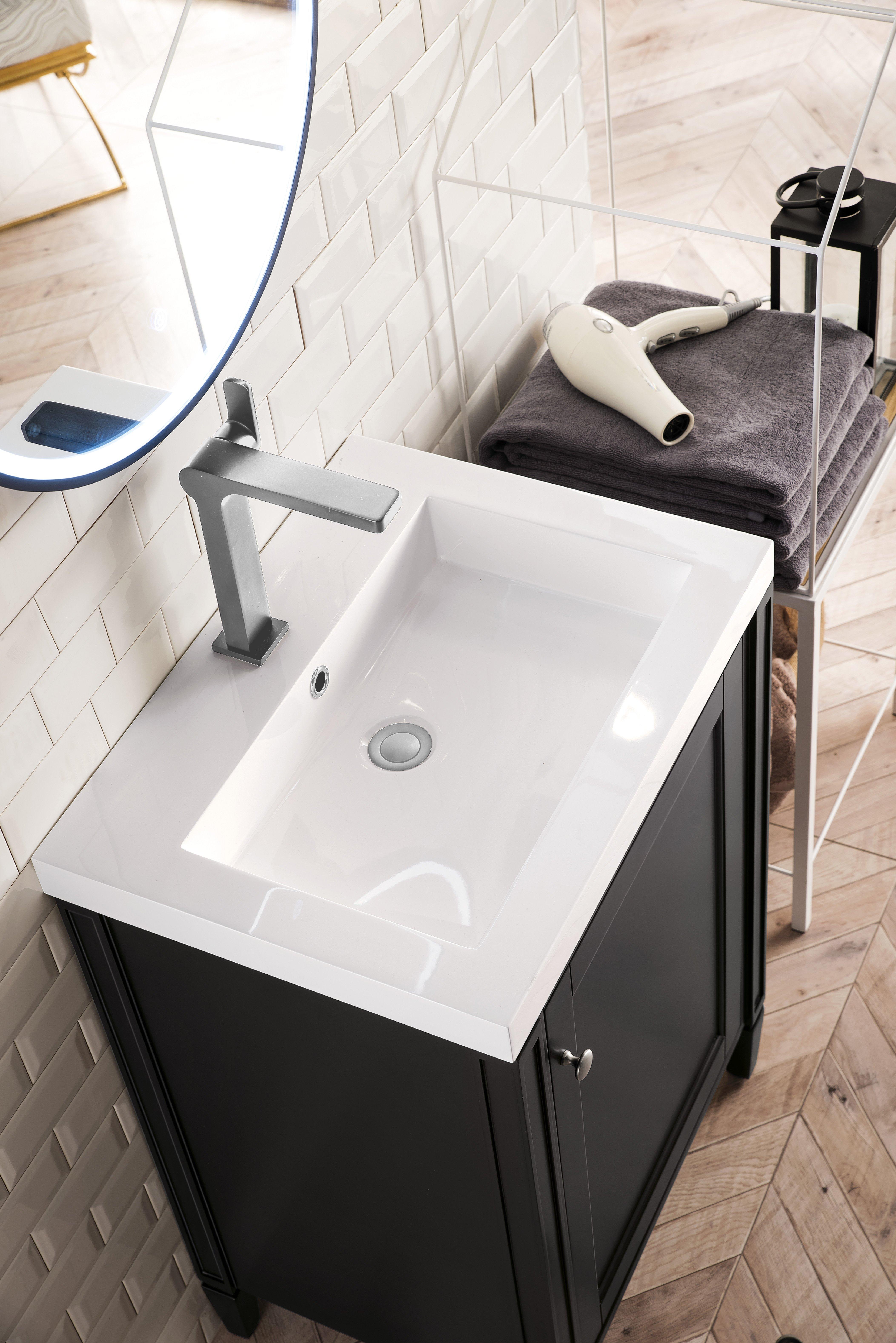 Complete your bathroom with the beautiful Britana 24 in. Black and Nickel Vanity with Engineered Stone Top. This freestanding features durable solid wood, plywood cabinets in stunning black with a white manufactured stone vanity top and satin nickel hardware. A charming single integral sink in brilliant white is included. The Britana 24 in. Black and Nickel Vanity with Engineered Stone Top is a versatile choice to customize multiple bathroom settings.