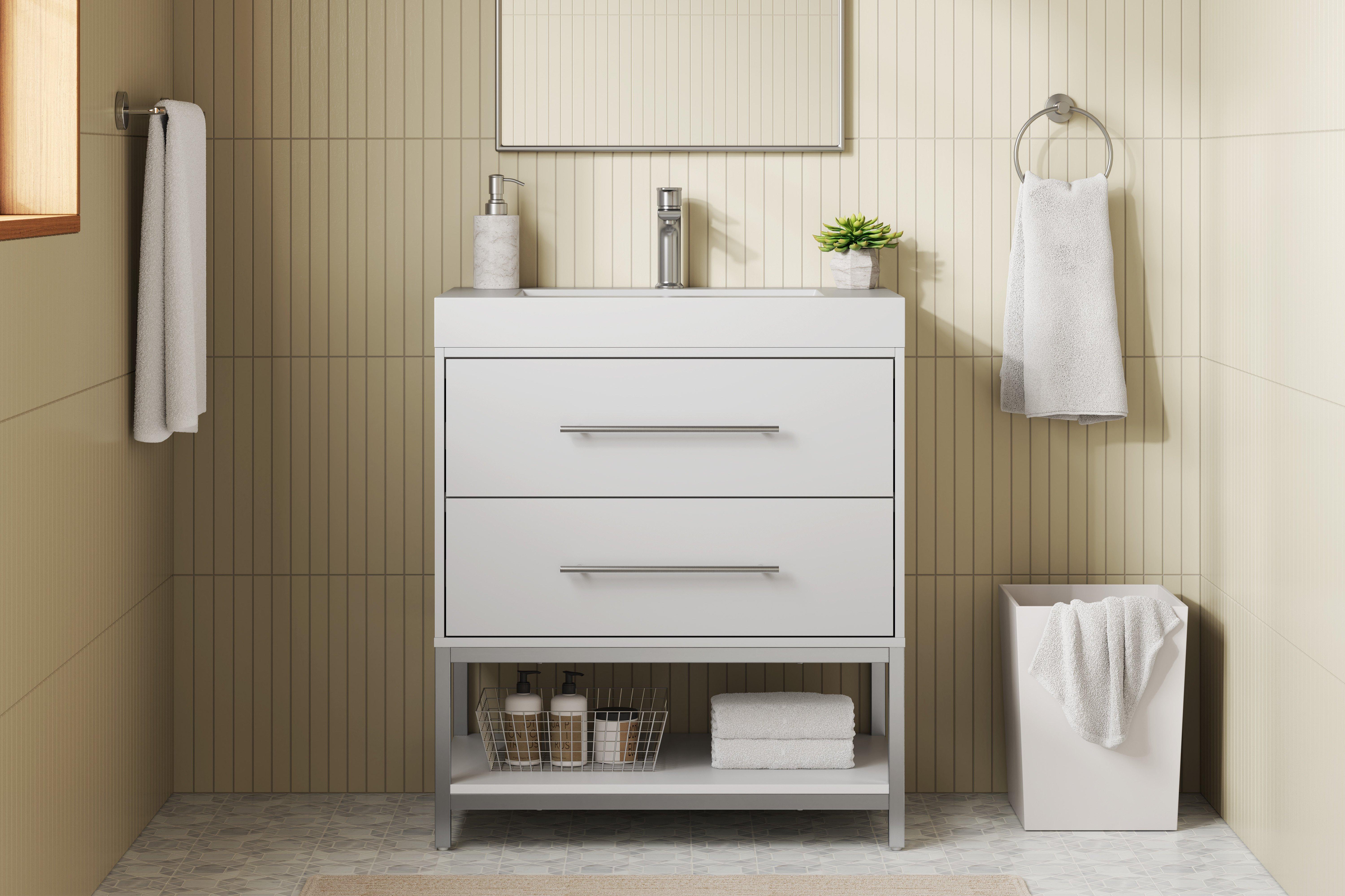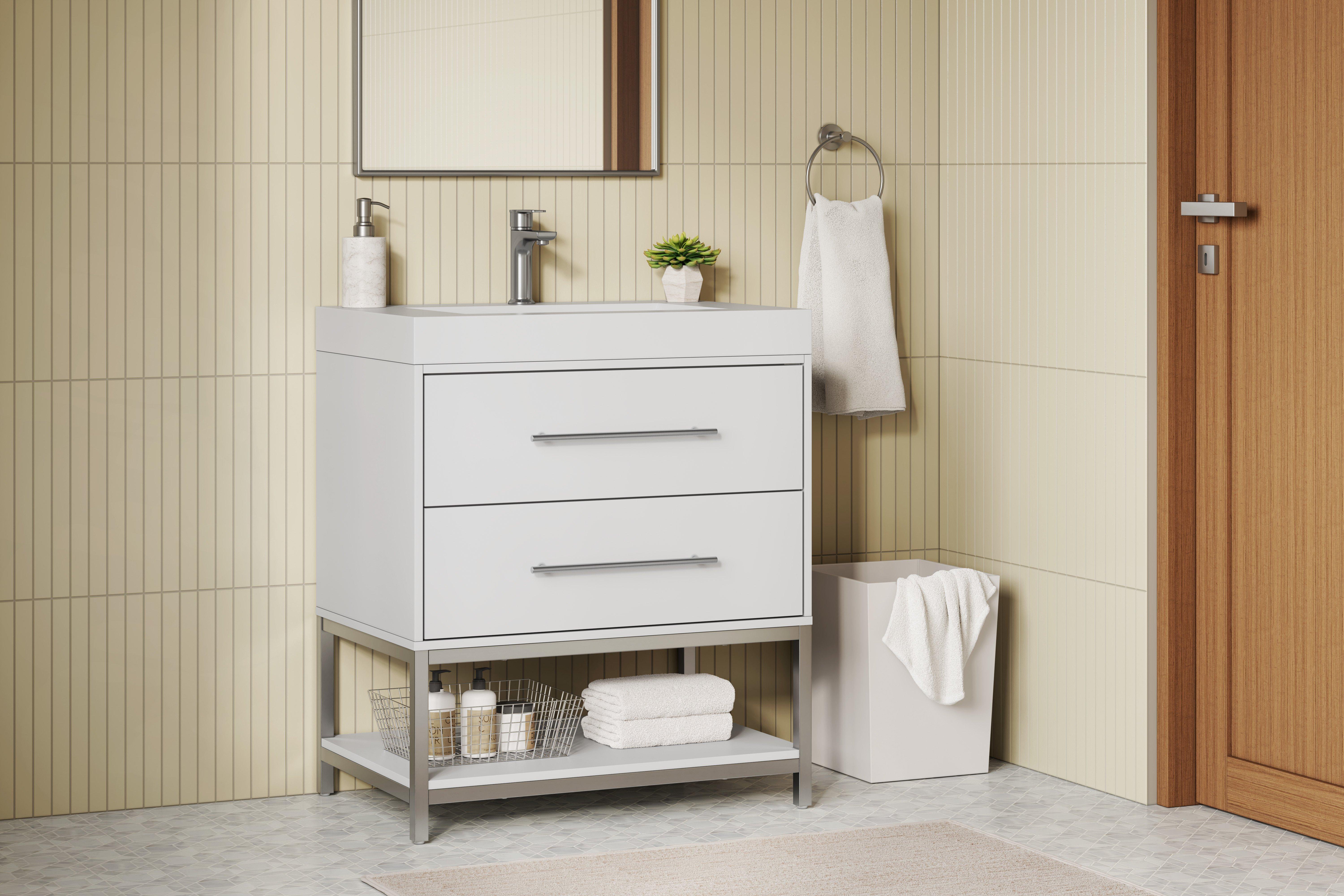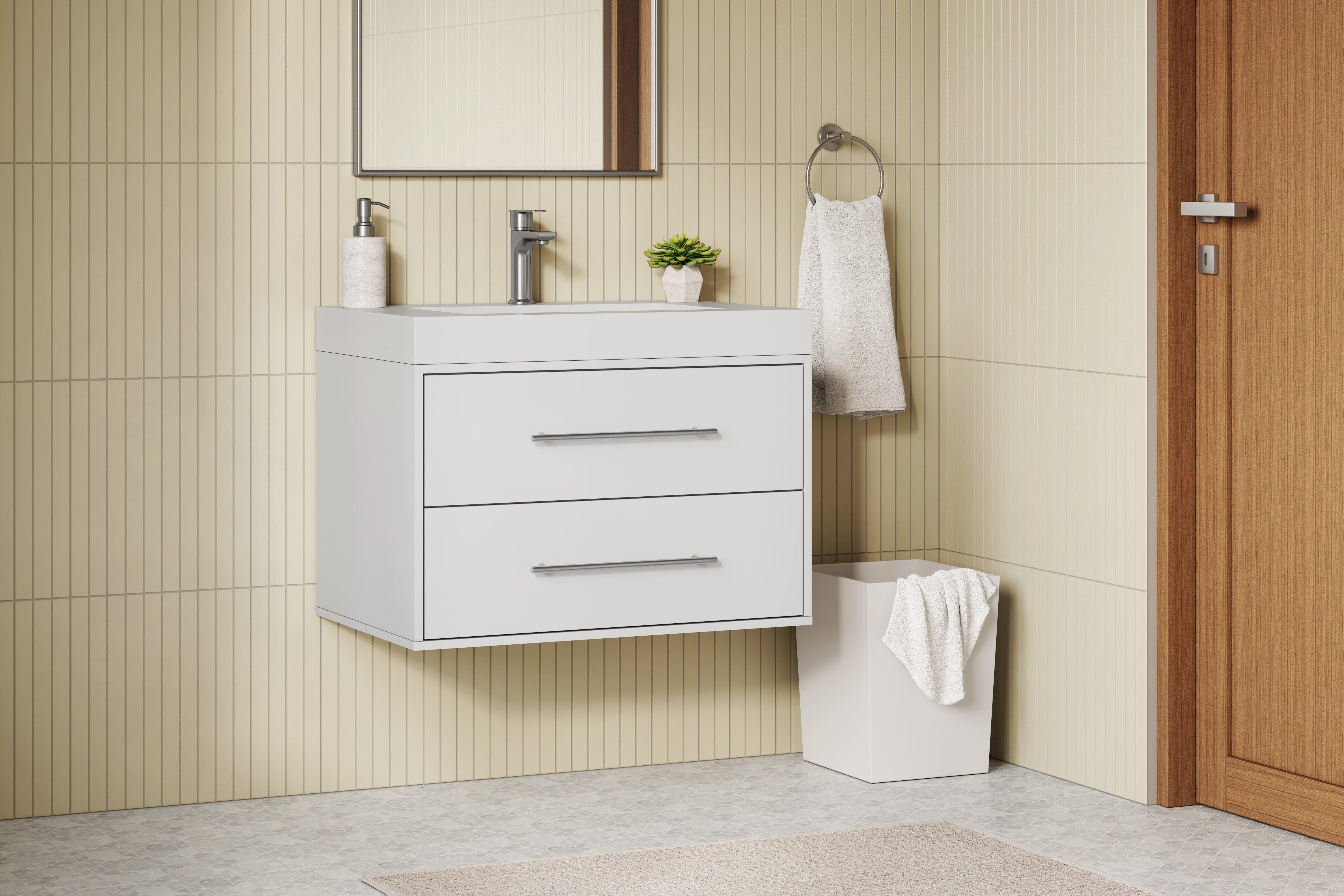 Complete your bathroom with the beautiful Brookwood 30 in. White Vanity with Engineered Stone Top. This wall mounted or freestanding features durable mdf cabinets in stunning white with a white composite vanity top and brushed n/a hardware. A charming single wall mounted sink in brilliant white is included. The Brookwood 30 in. White Vanity with Engineered Stone Top is a versatile choice to customize multiple bathroom settings.