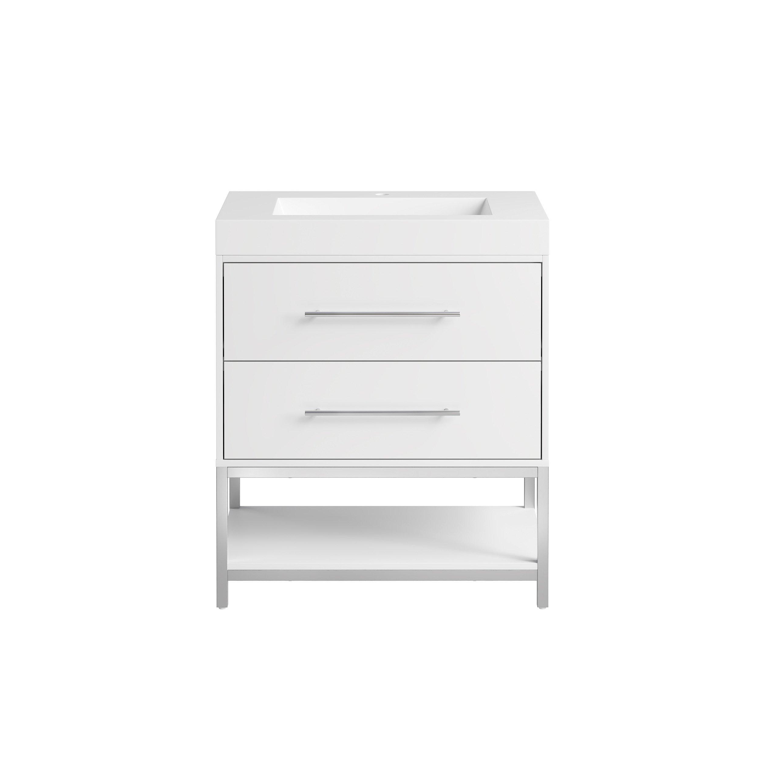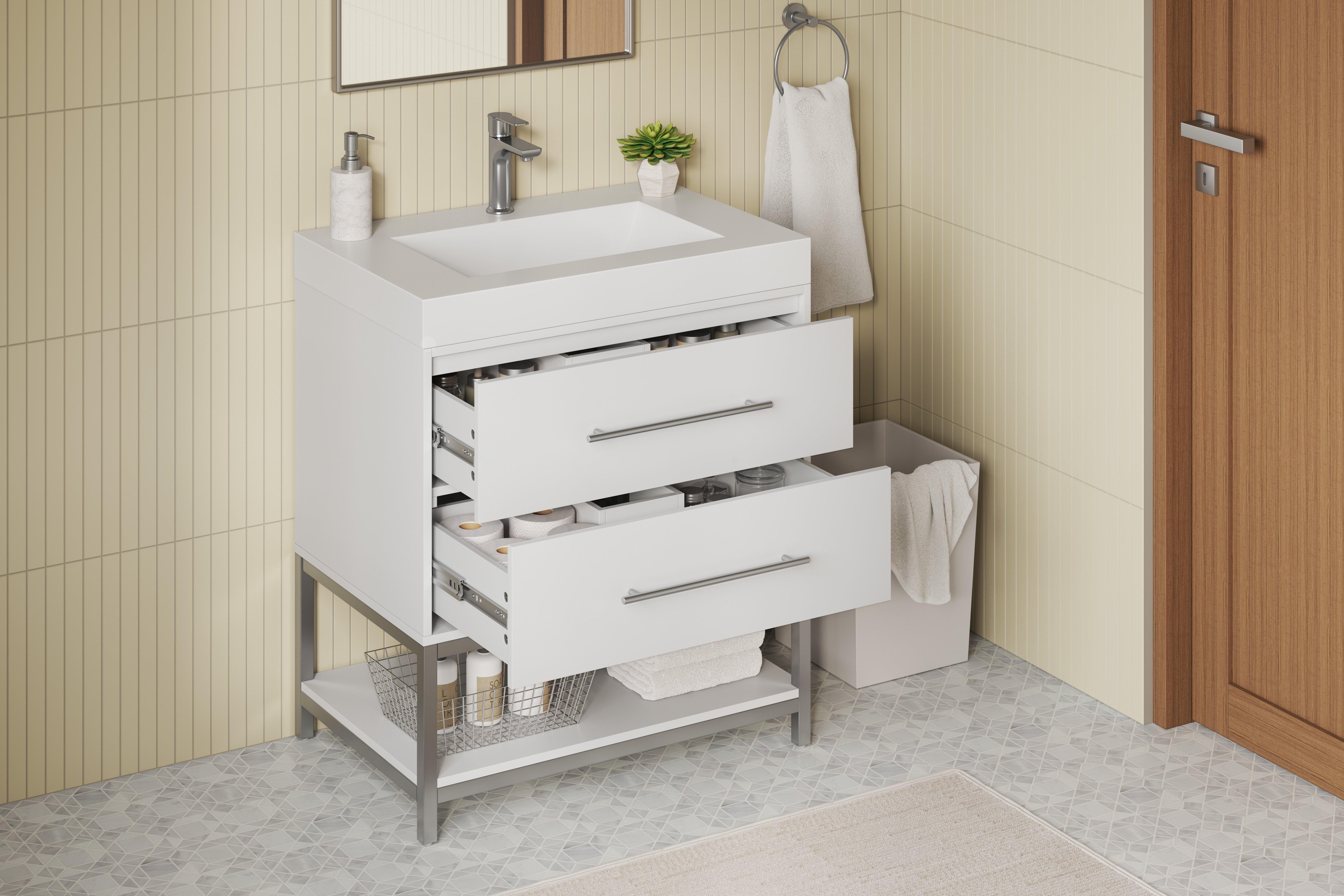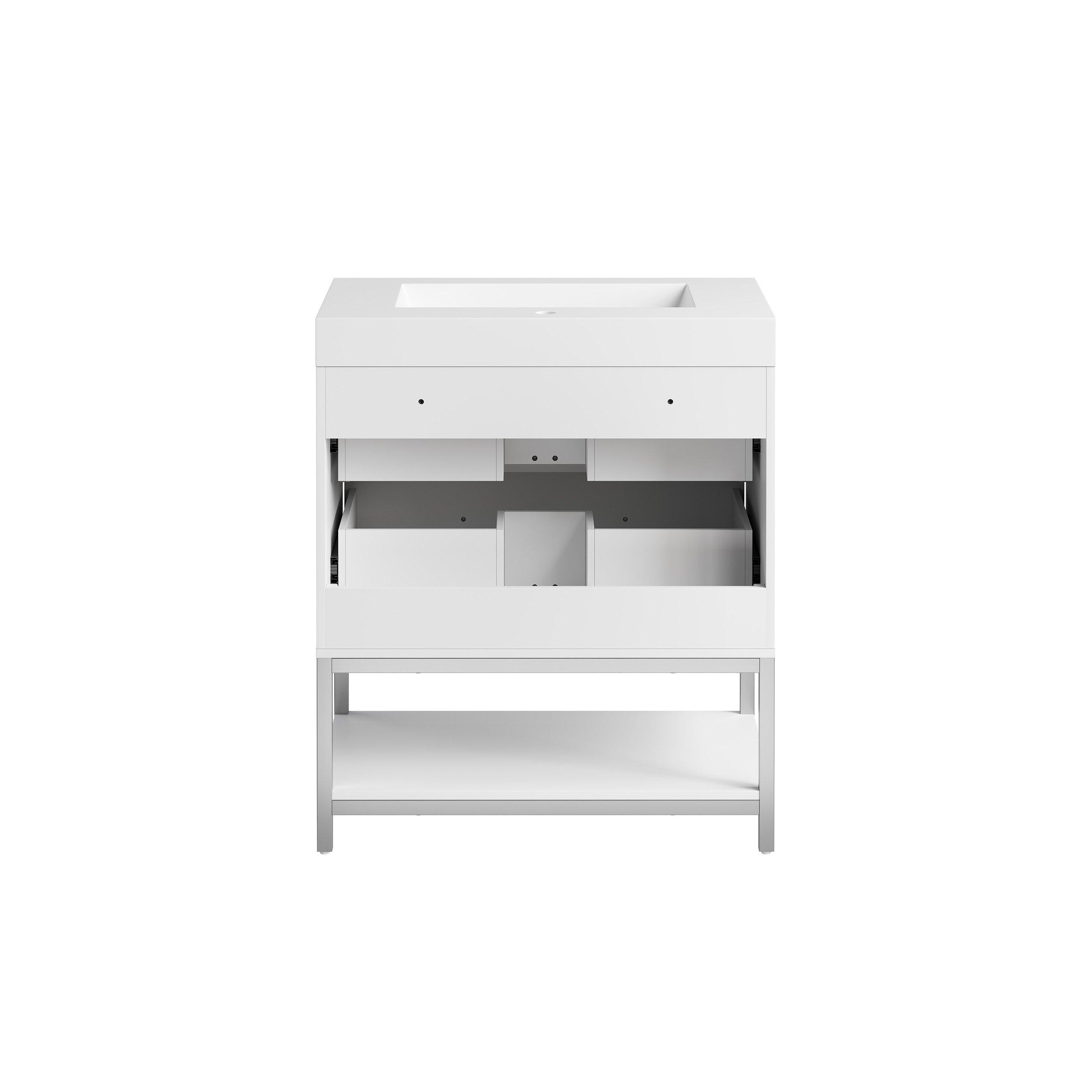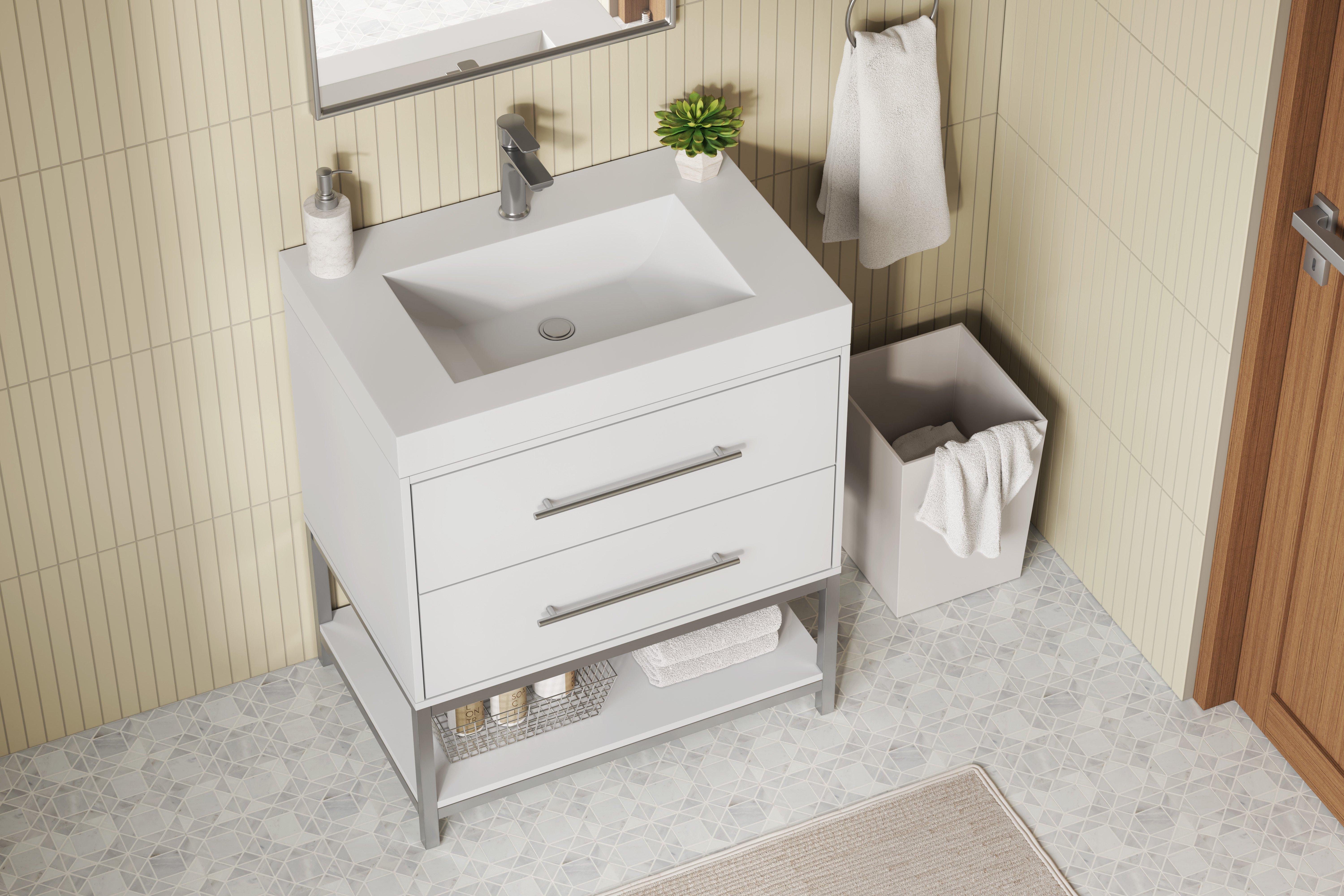 Complete your bathroom with the beautiful Brookwood 30 in. White Vanity with Engineered Stone Top. This wall mounted or freestanding features durable mdf cabinets in stunning white with a white composite vanity top and brushed n/a hardware. A charming single wall mounted sink in brilliant white is included. The Brookwood 30 in. White Vanity with Engineered Stone Top is a versatile choice to customize multiple bathroom settings.