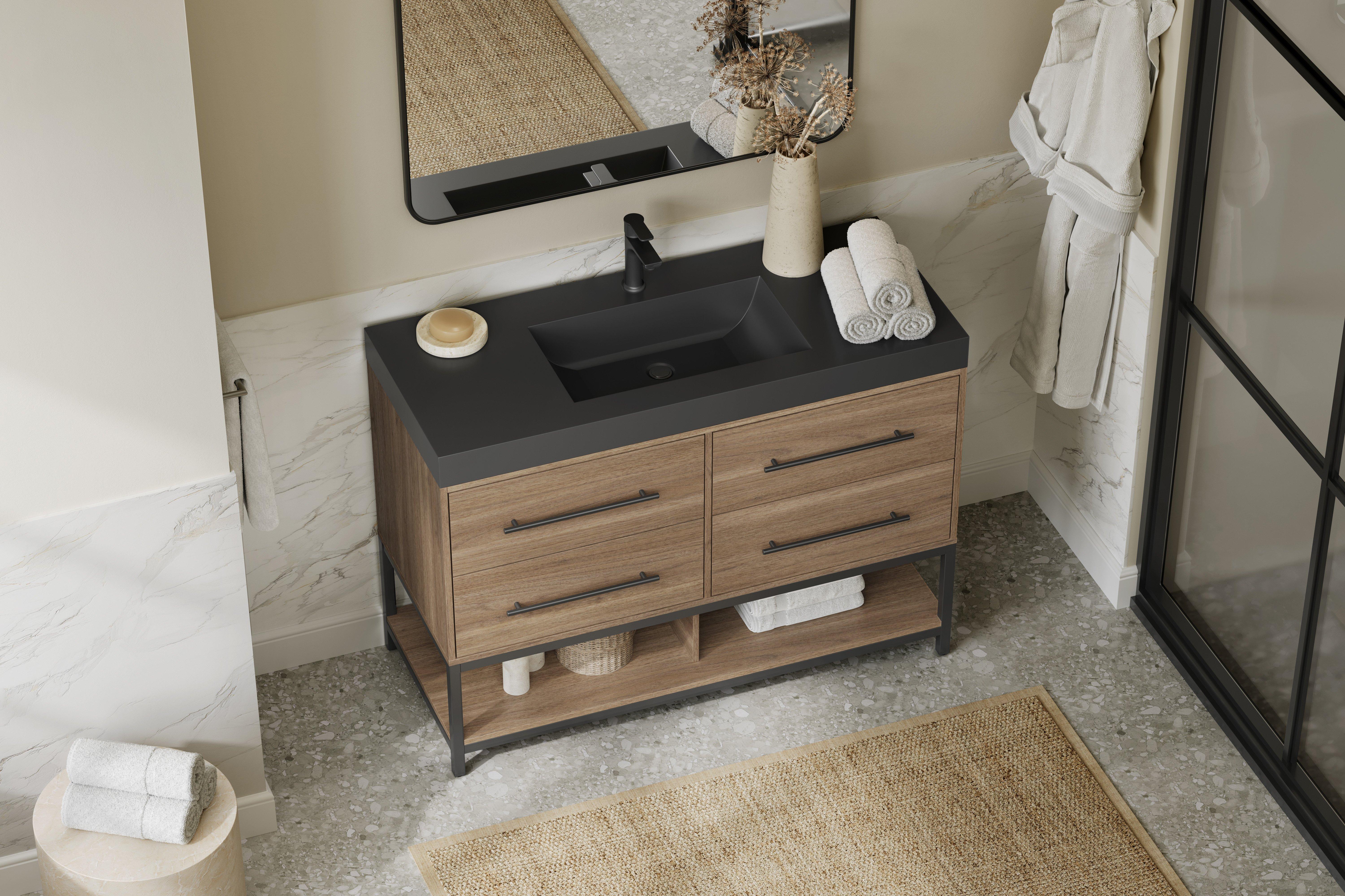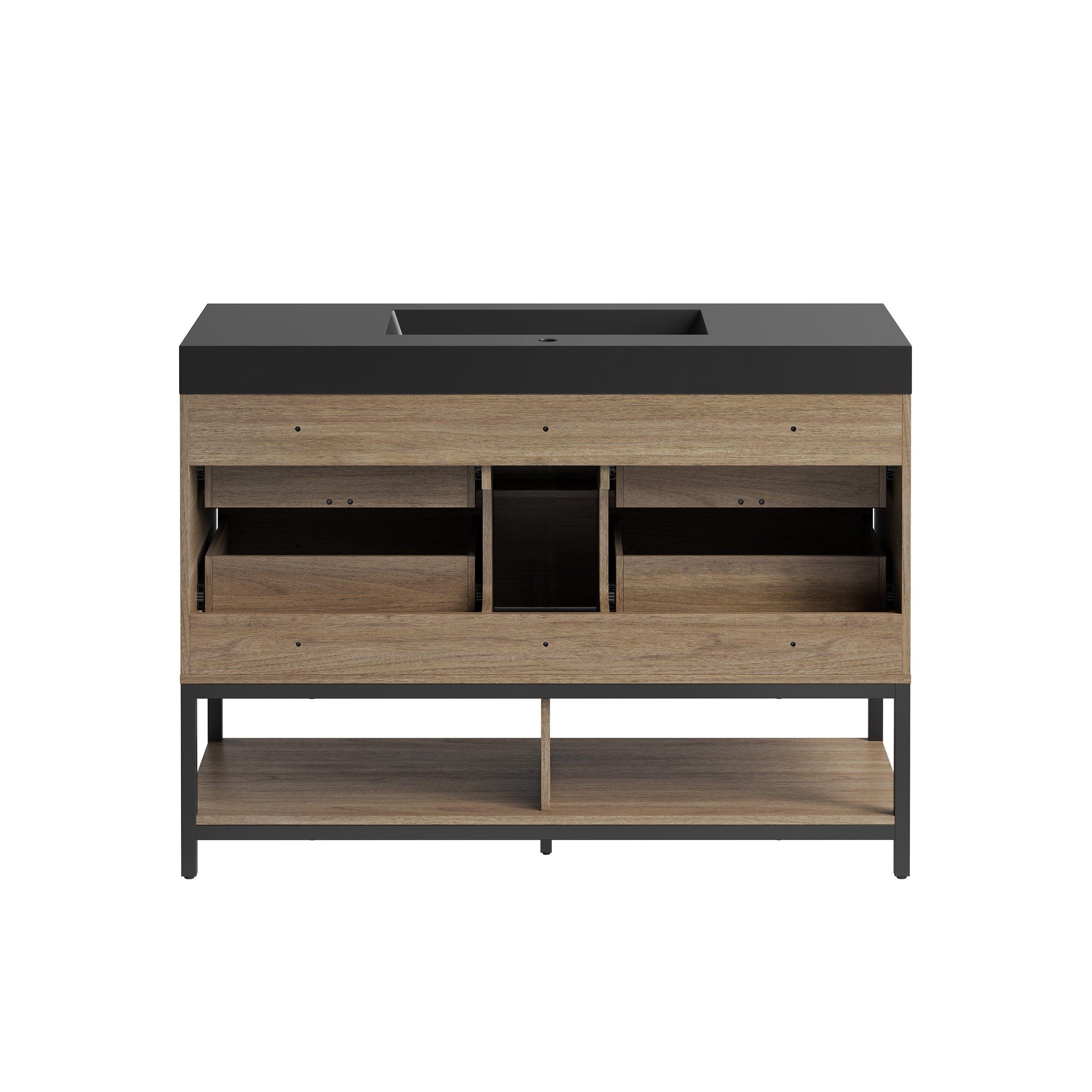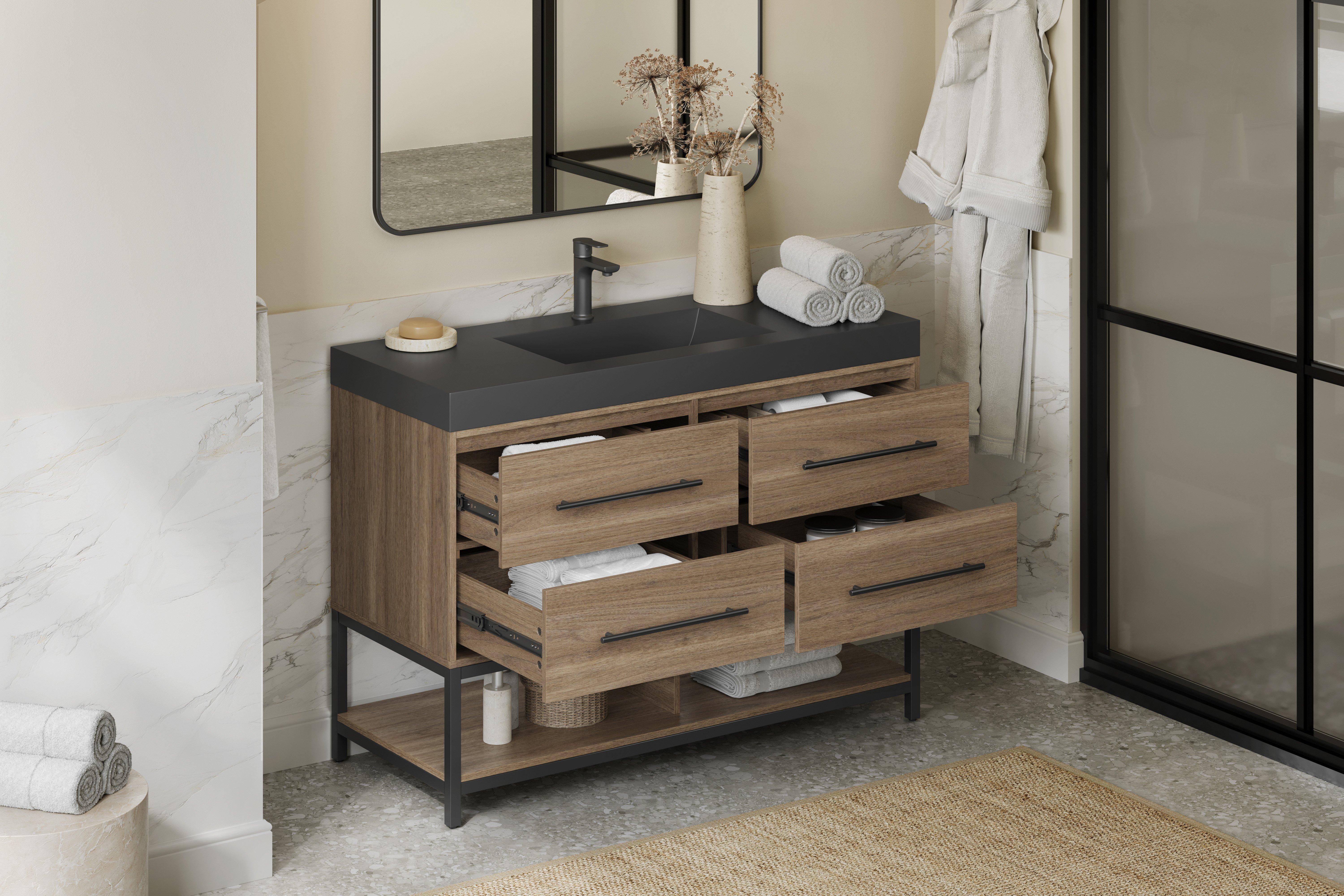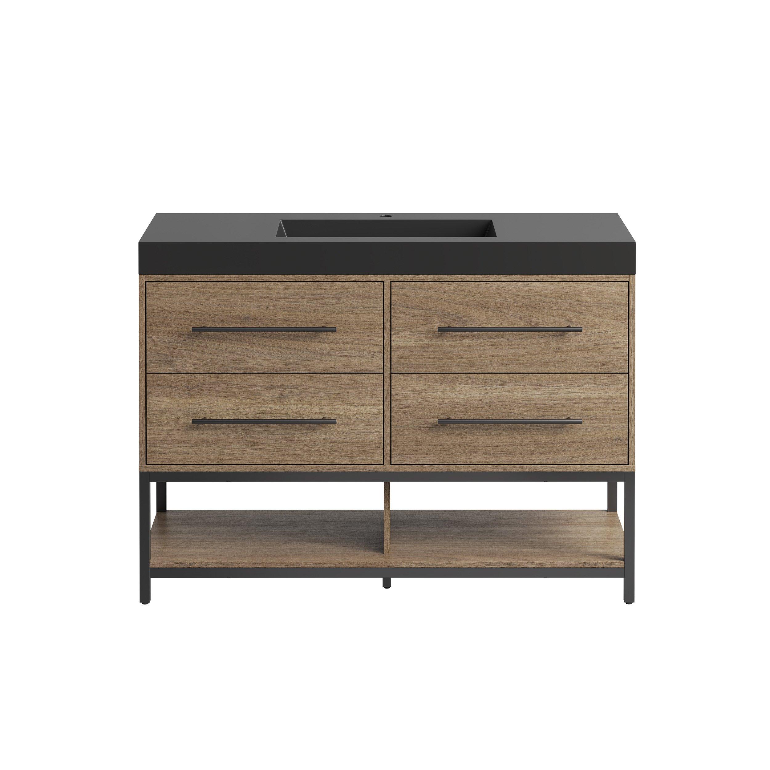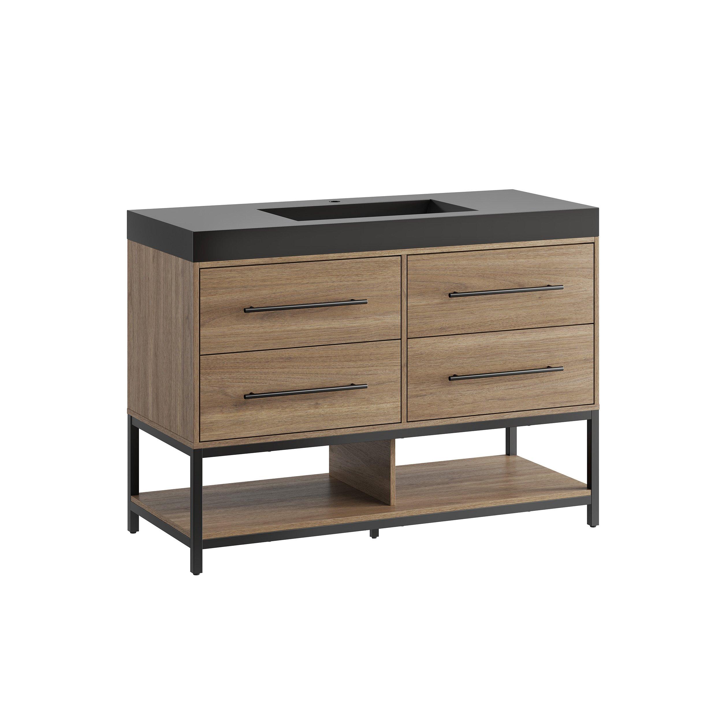 Tailor the look of your bathroom with the Brookwood 48 in. Natural Brown Vanity with Engineered Stone Top featuring gorgeous mdf in brown with 0 doors, 4 drawers, and 1 shelves. This piece is completed with beautiful matte black hardware and a single wall mounted black sink. The Brookwood 48 in. Natural Brown Vanity with Engineered Stone Top is a stunning addition to any bathroom setting.