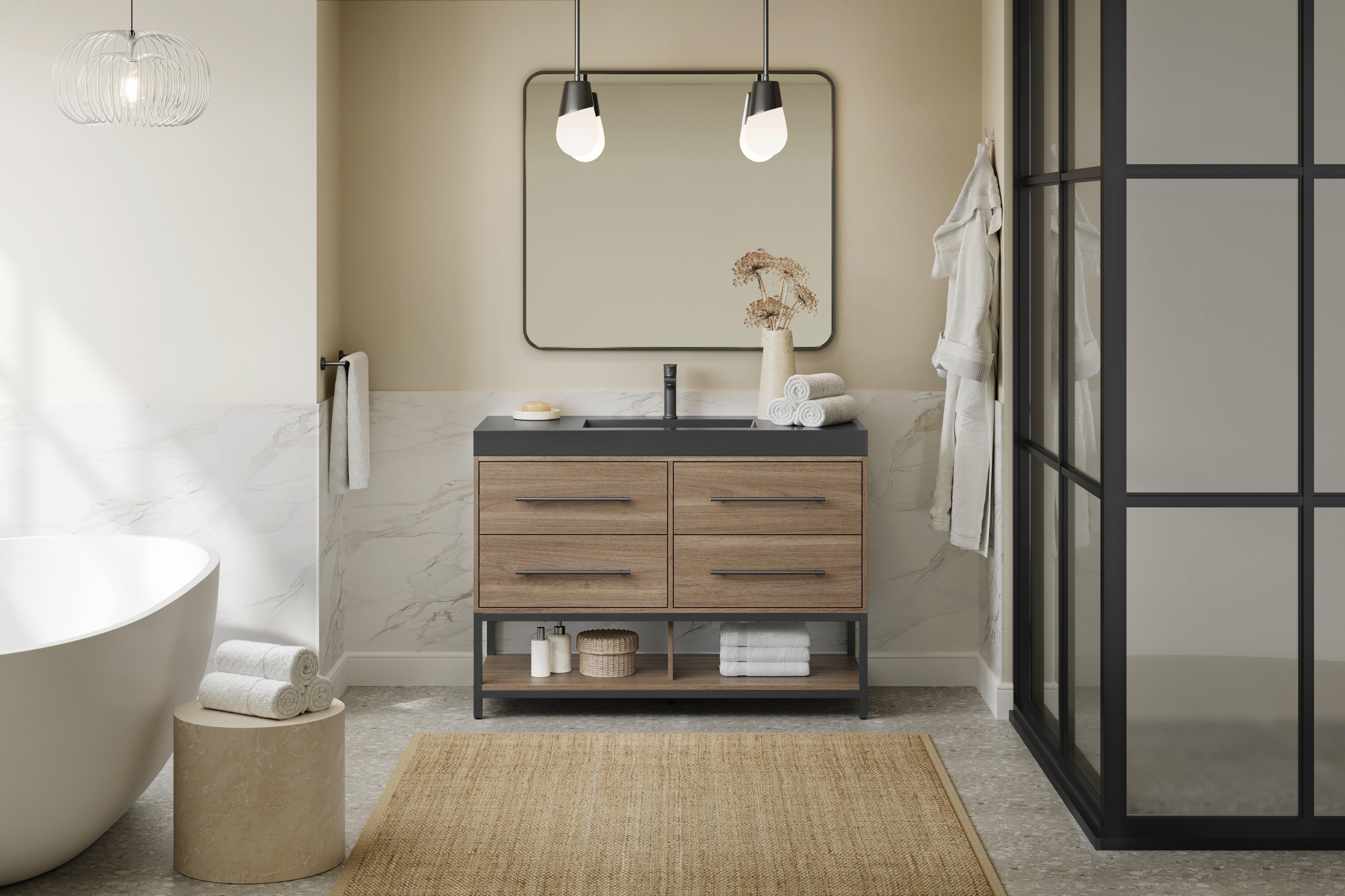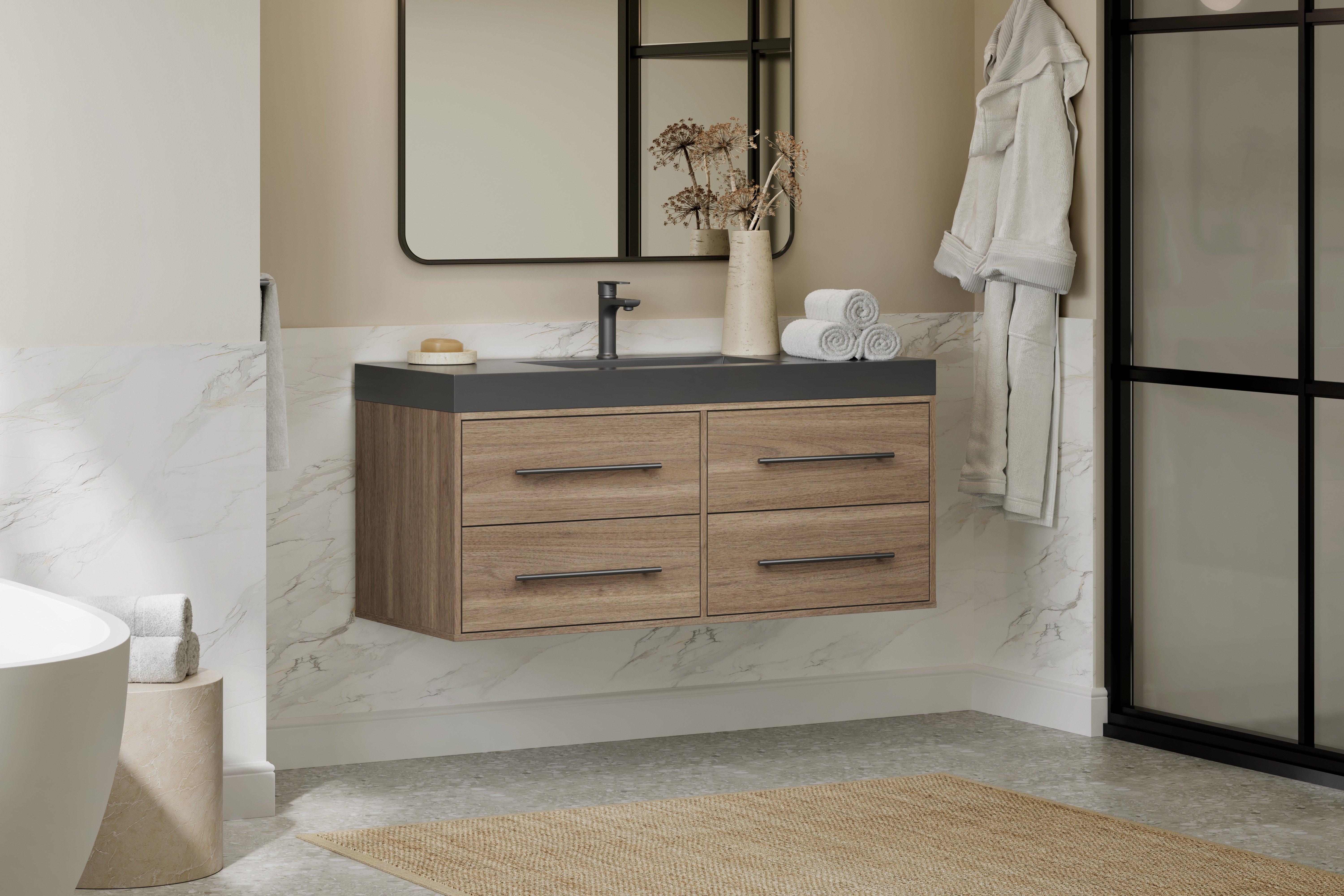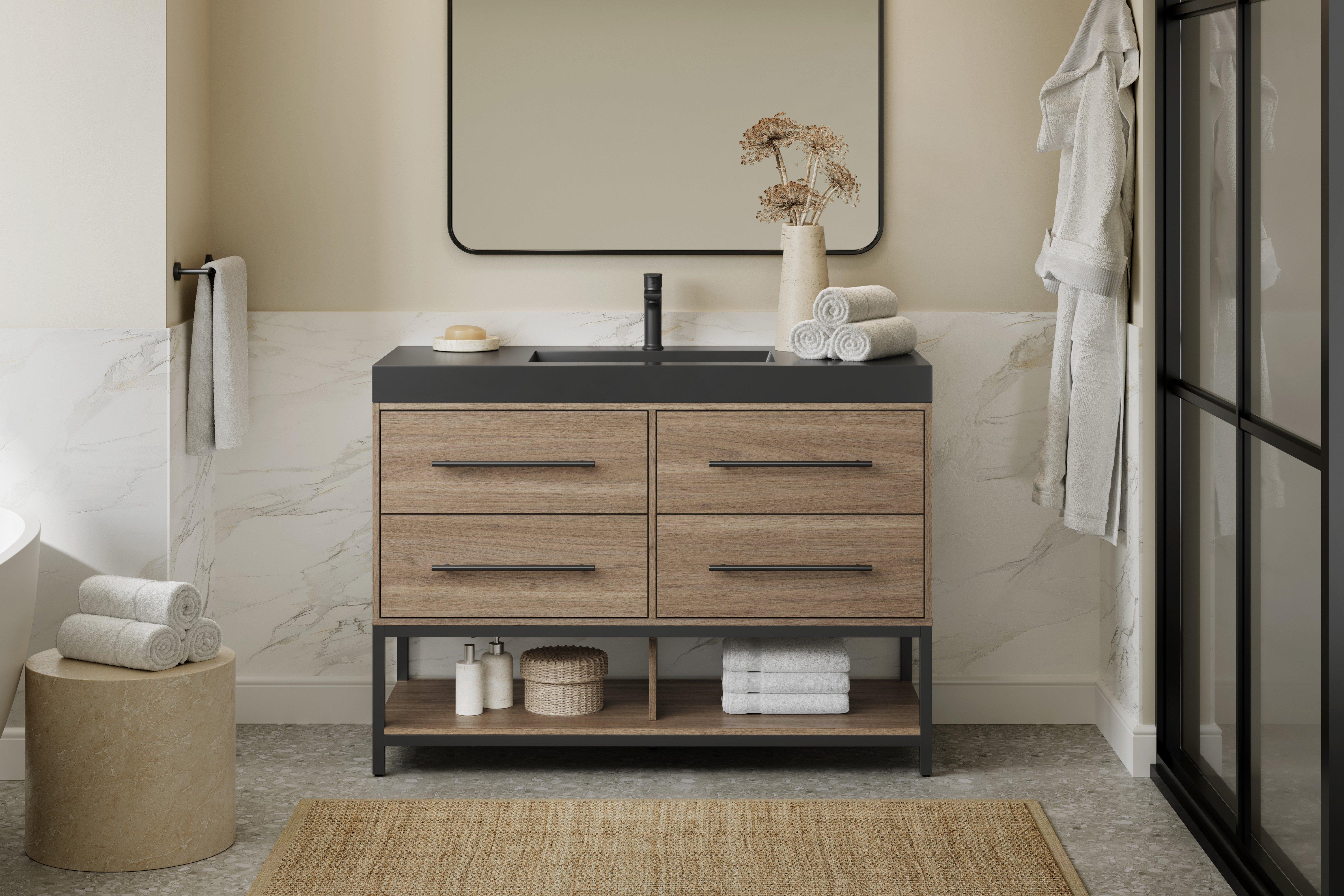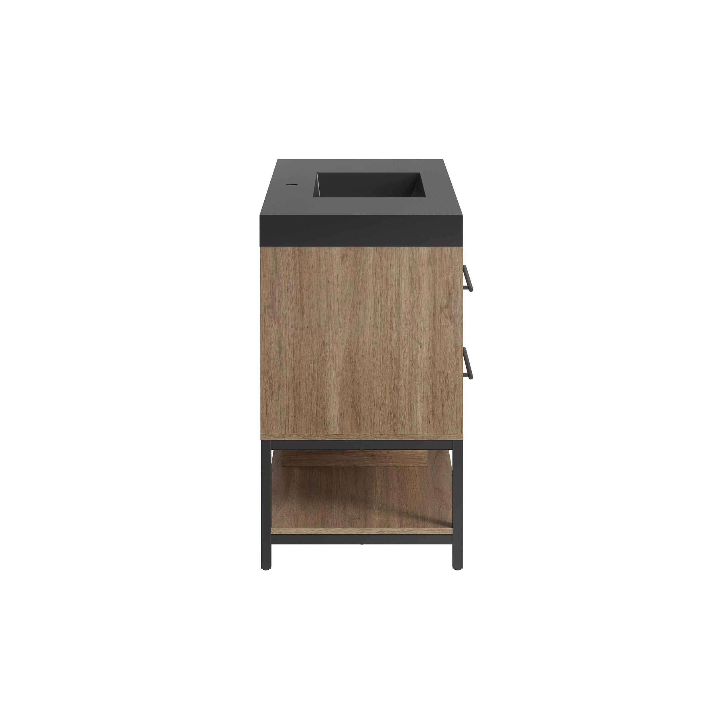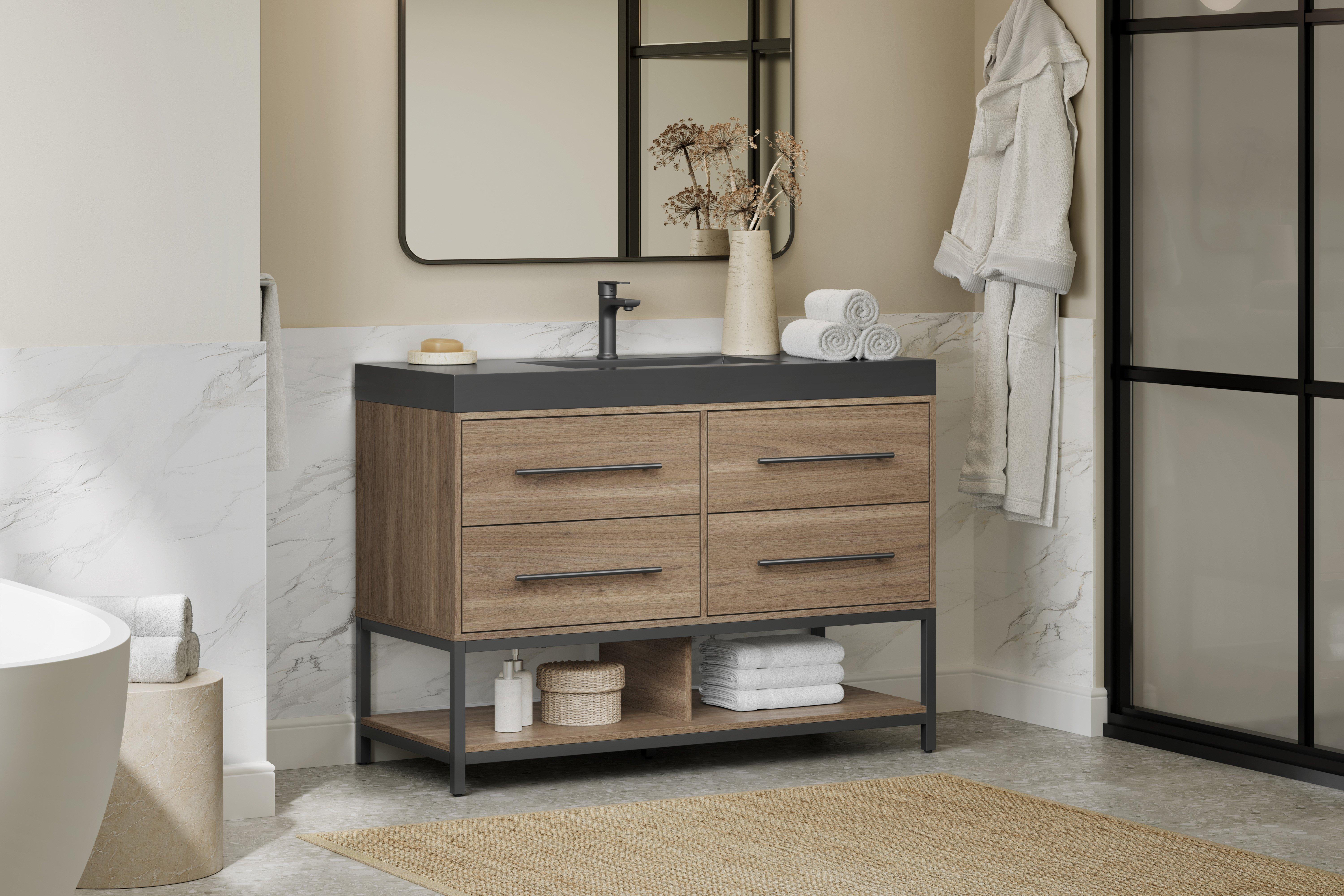 Tailor the look of your bathroom with the Brookwood 48 in. Natural Brown Vanity with Engineered Stone Top featuring gorgeous mdf in brown with 0 doors, 4 drawers, and 1 shelves. This piece is completed with beautiful matte black hardware and a single wall mounted black sink. The Brookwood 48 in. Natural Brown Vanity with Engineered Stone Top is a stunning addition to any bathroom setting.