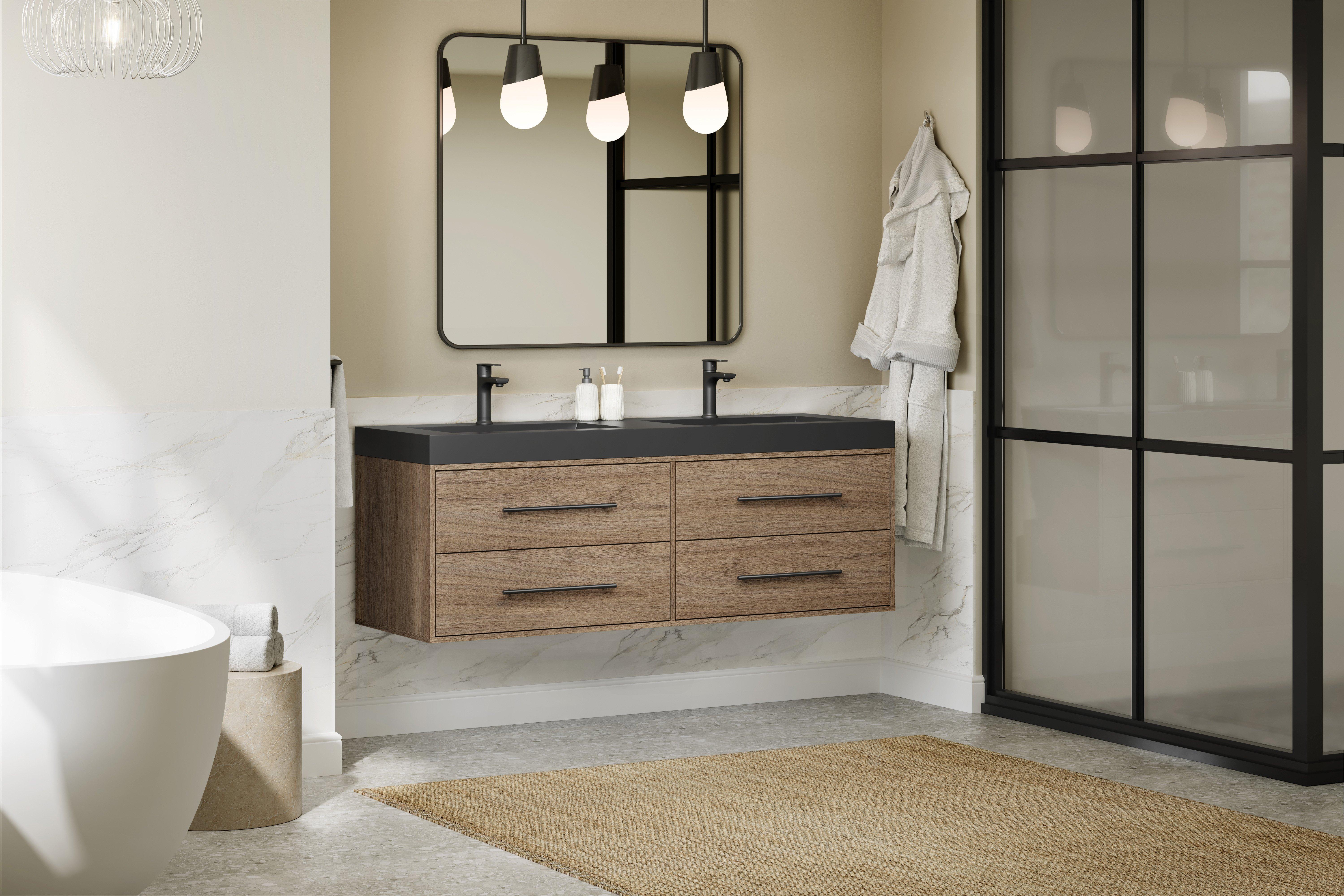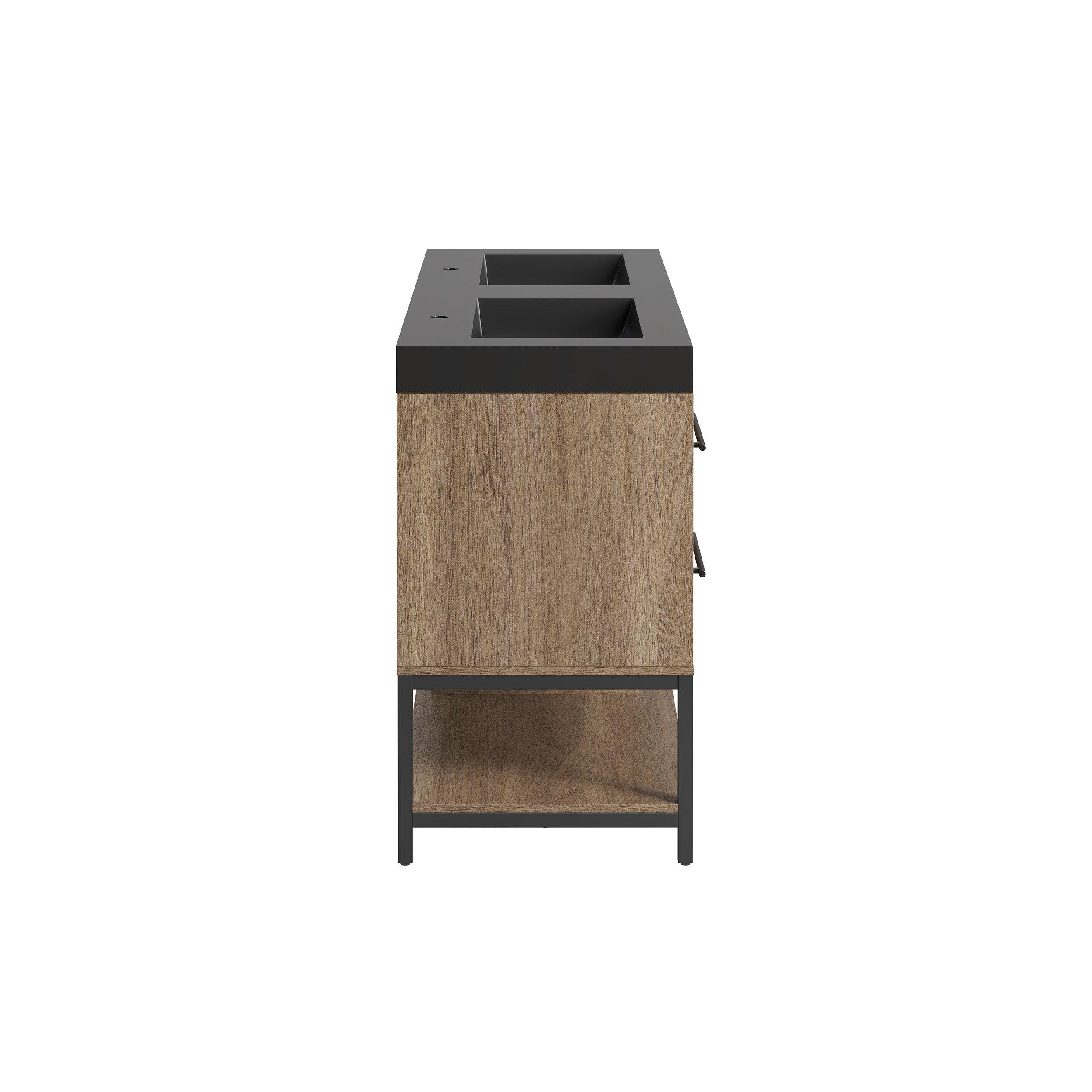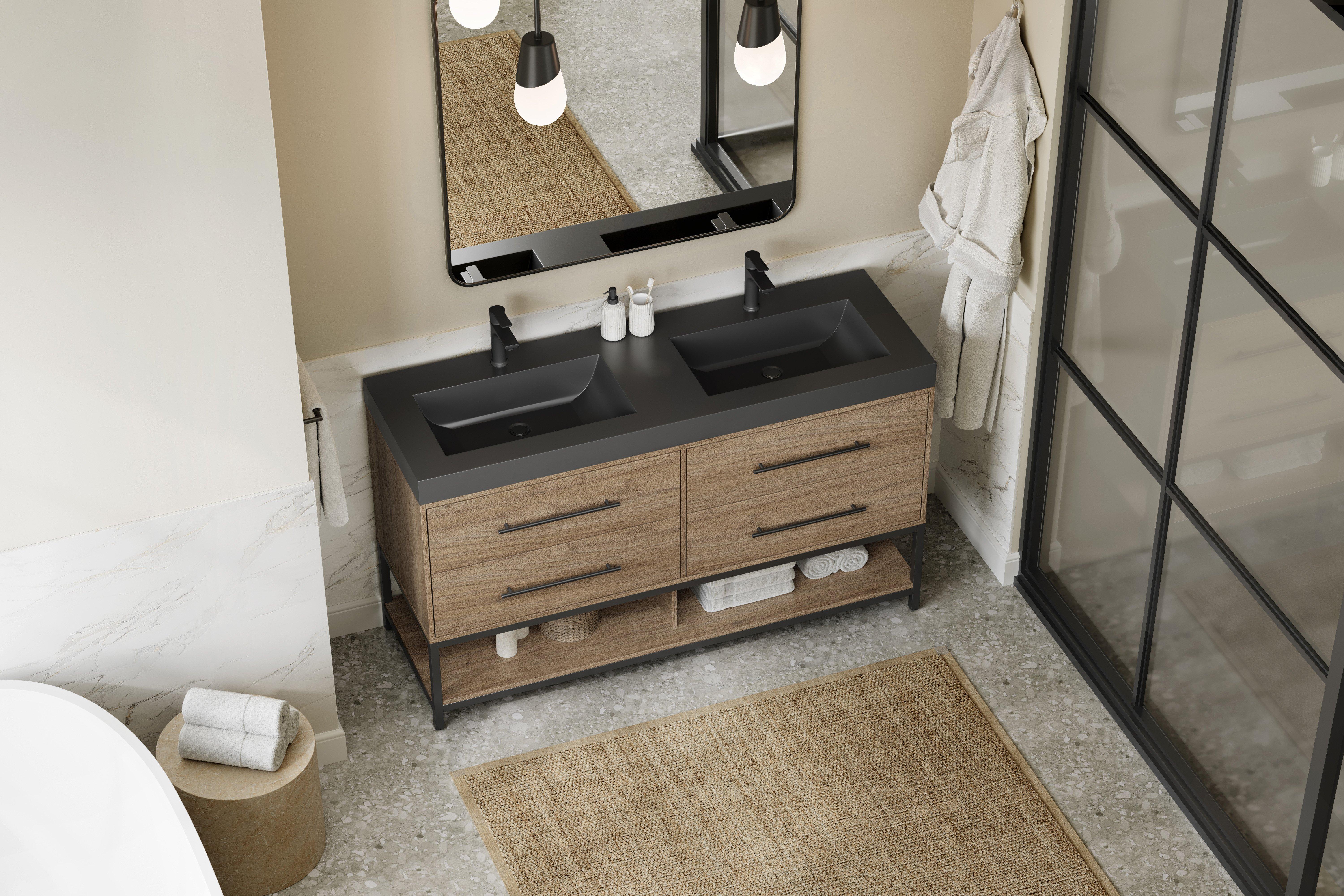 Complete your bathroom with the beautiful Brookwood 60 in. Natural Brown Vanity with Engineered Stone Top. This wall mounted or freestanding features durable mdf cabinets in stunning brown with a black composite vanity top and matte black hardware. A charming double wall mounted sink in brilliant black is included. The Brookwood 60 in. Natural Brown Vanity with Engineered Stone Top is a versatile choice to customize multiple bathroom settings.