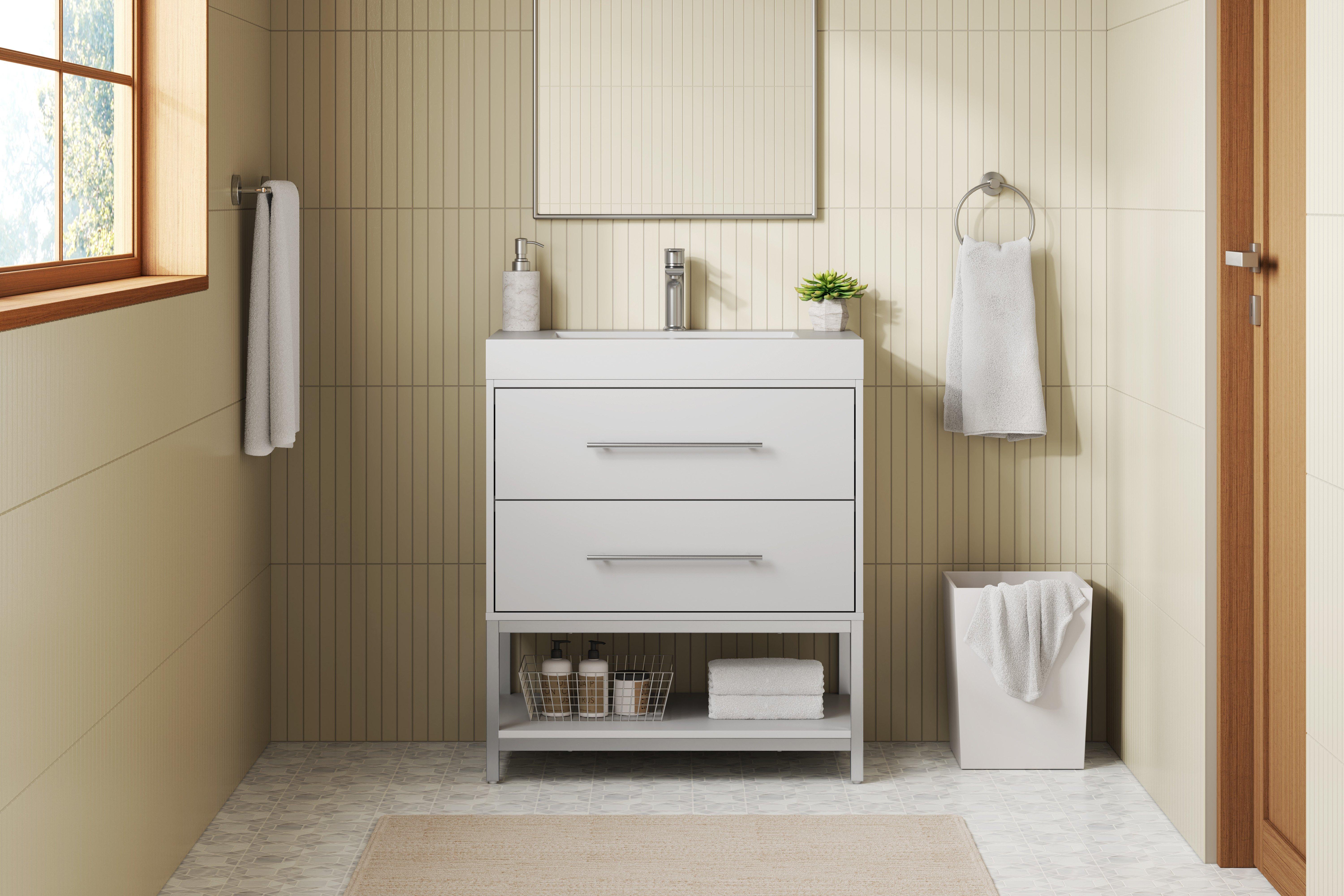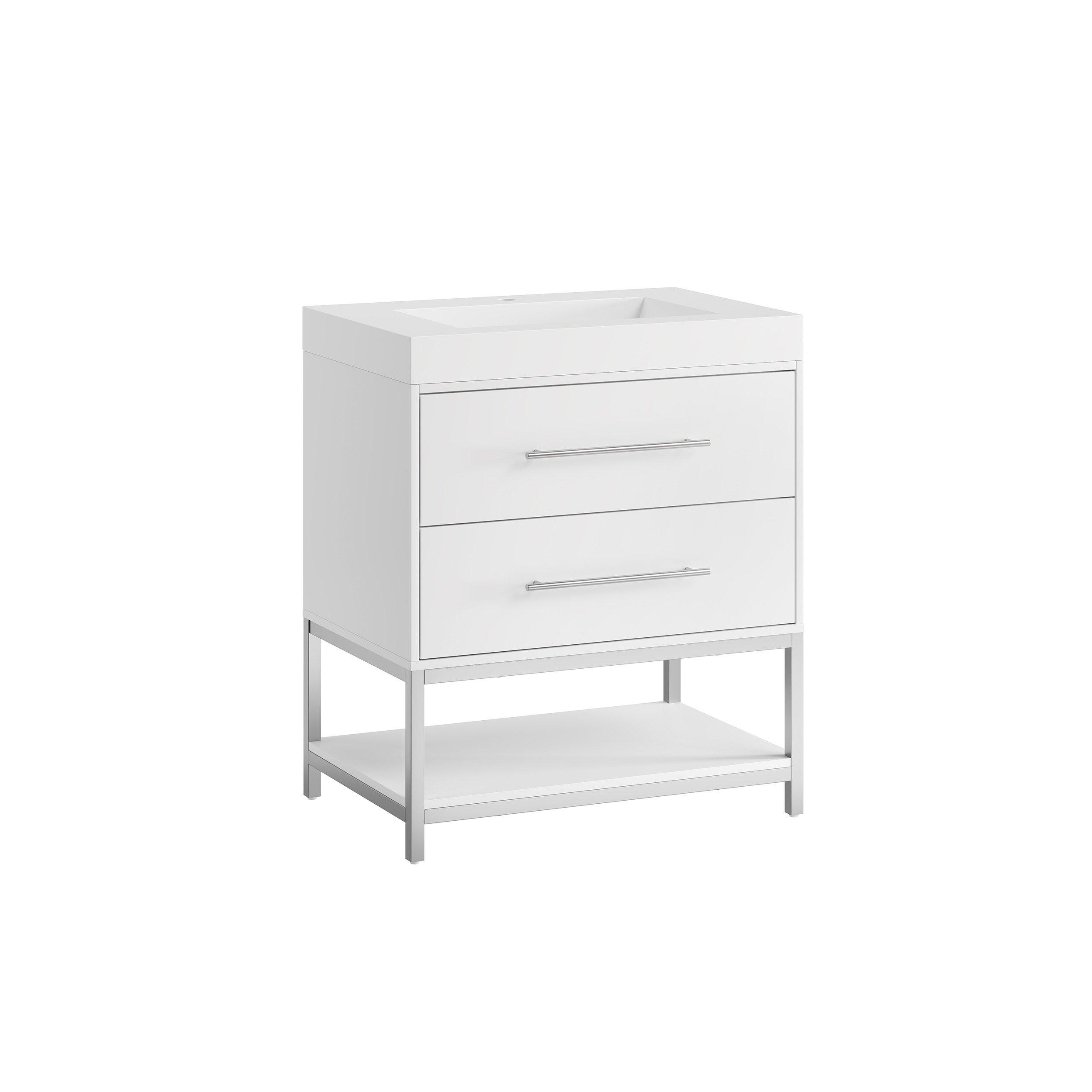 Complete your bathroom with the beautiful Brookwood 30 in. White Vanity with Engineered Stone Top. This wall mounted or freestanding features durable mdf cabinets in stunning white with a white composite vanity top and brushed n/a hardware. A charming single wall mounted sink in brilliant white is included. The Brookwood 30 in. White Vanity with Engineered Stone Top is a versatile choice to customize multiple bathroom settings.