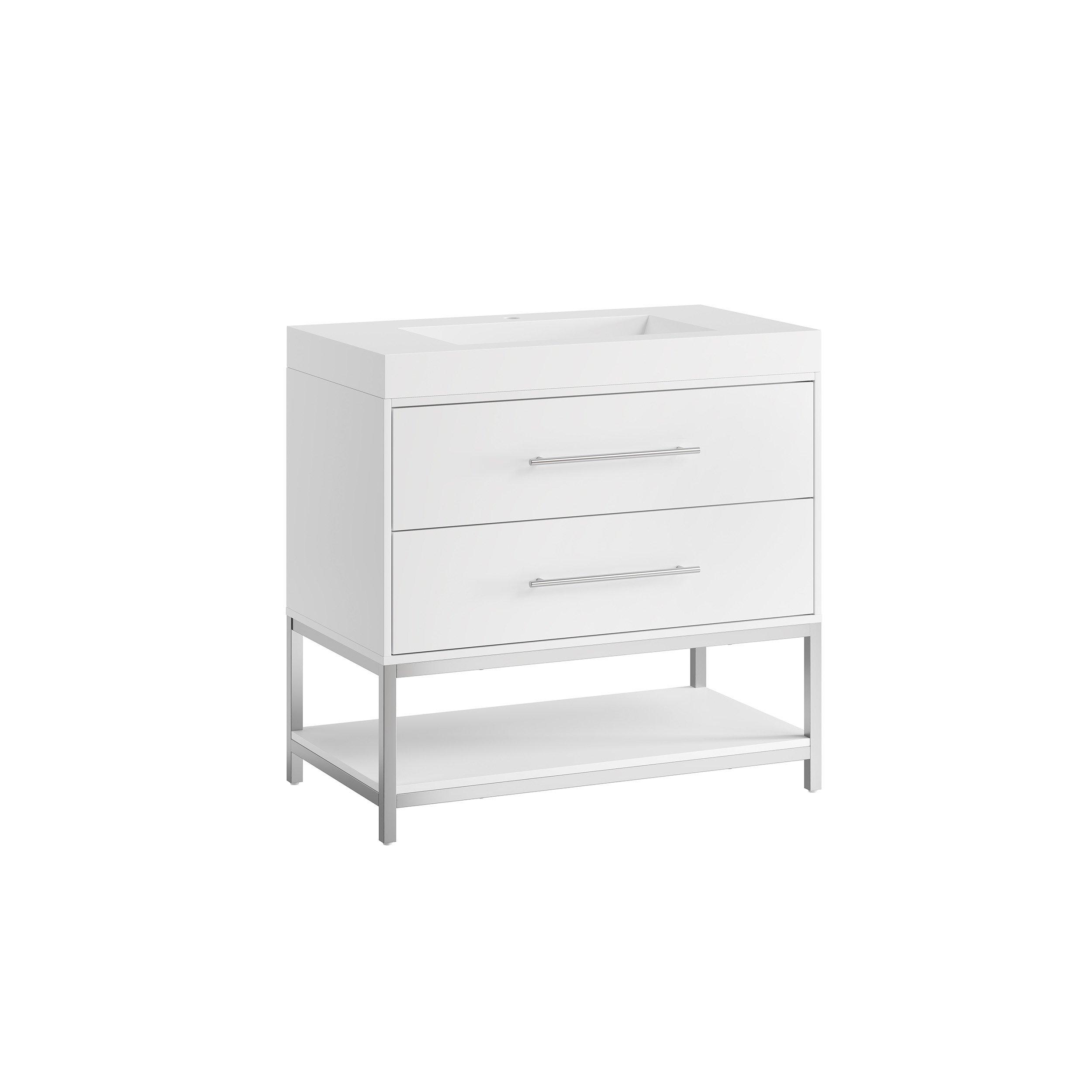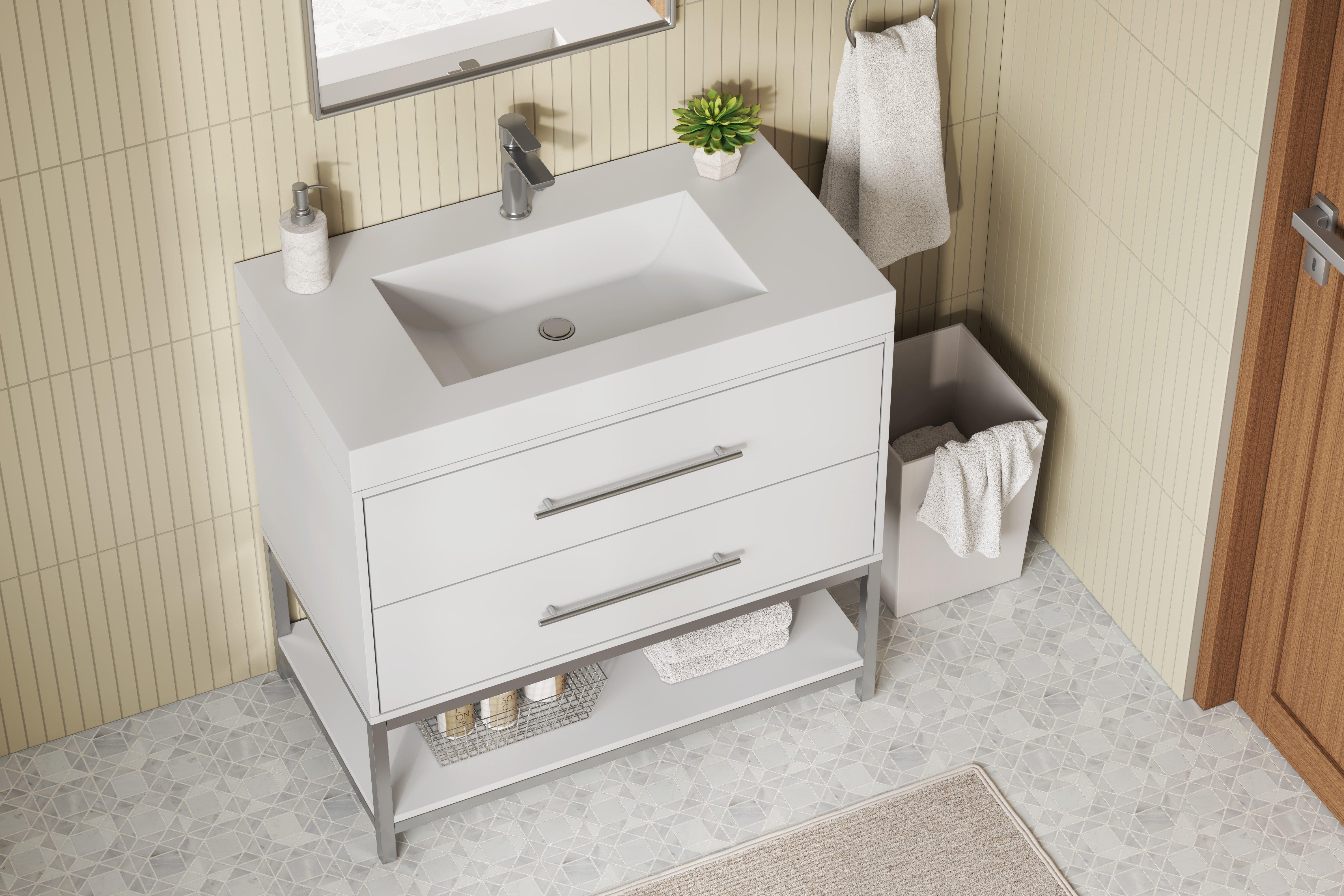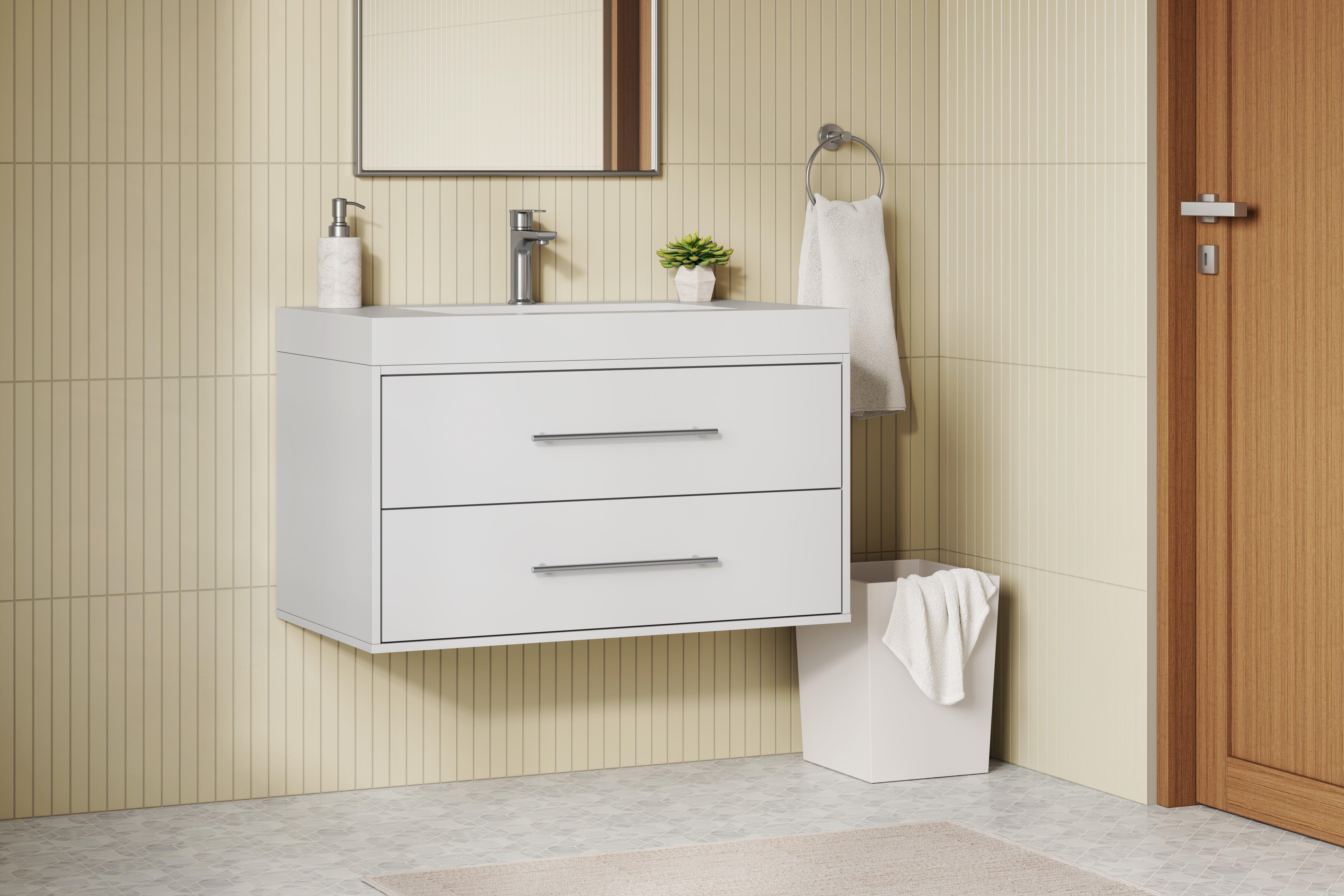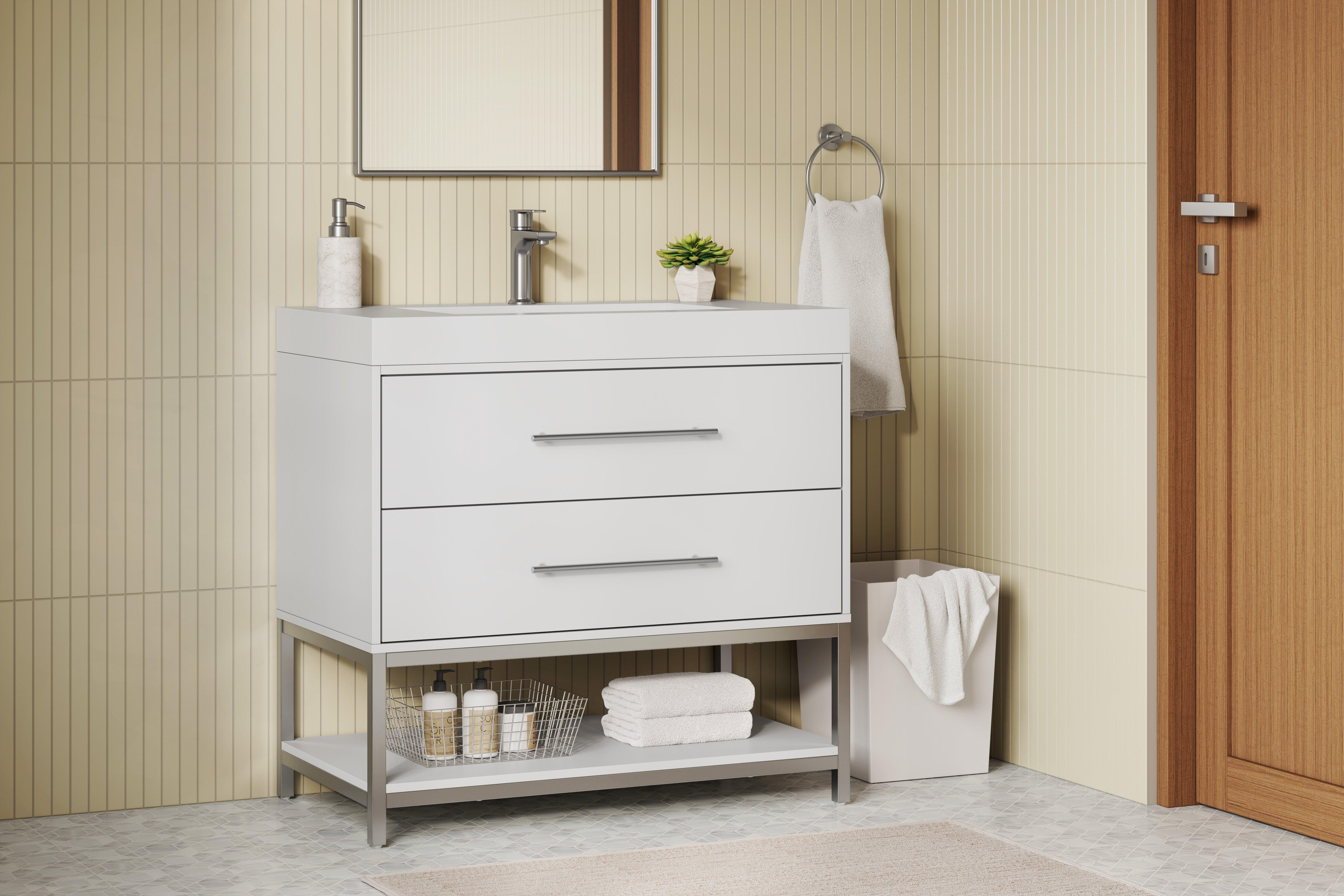 Tailor the look of your bathroom with the Brookwood 36 in. White Vanity with Engineered Stone Top featuring gorgeous mdf in white with 0 doors, 2 drawers, and 1 shelves. This piece is completed with beautiful brushed nickel hardware and a single wall mounted white sink. The Brookwood 36 in. White Vanity with Engineered Stone Top is a stunning addition to any bathroom setting.