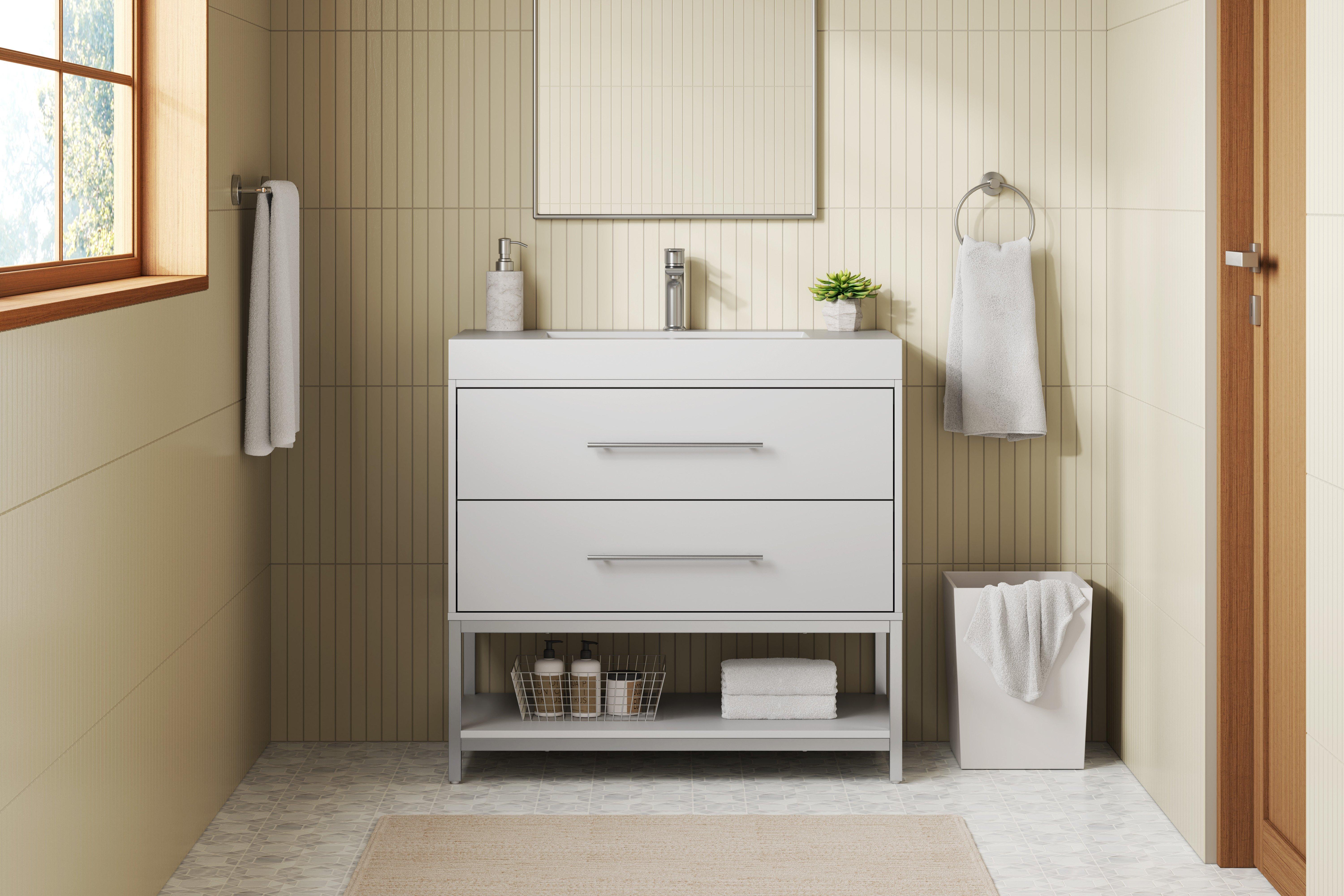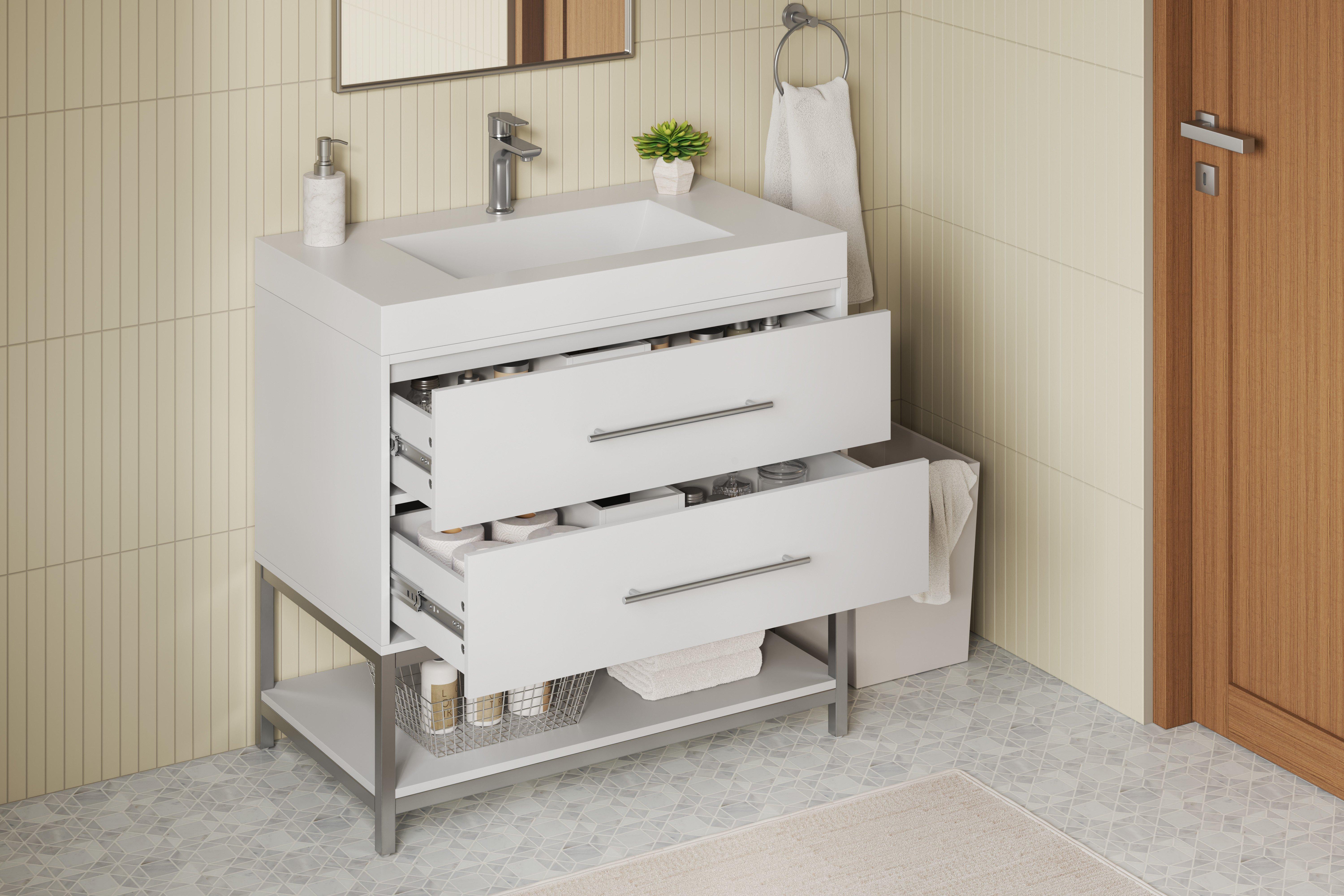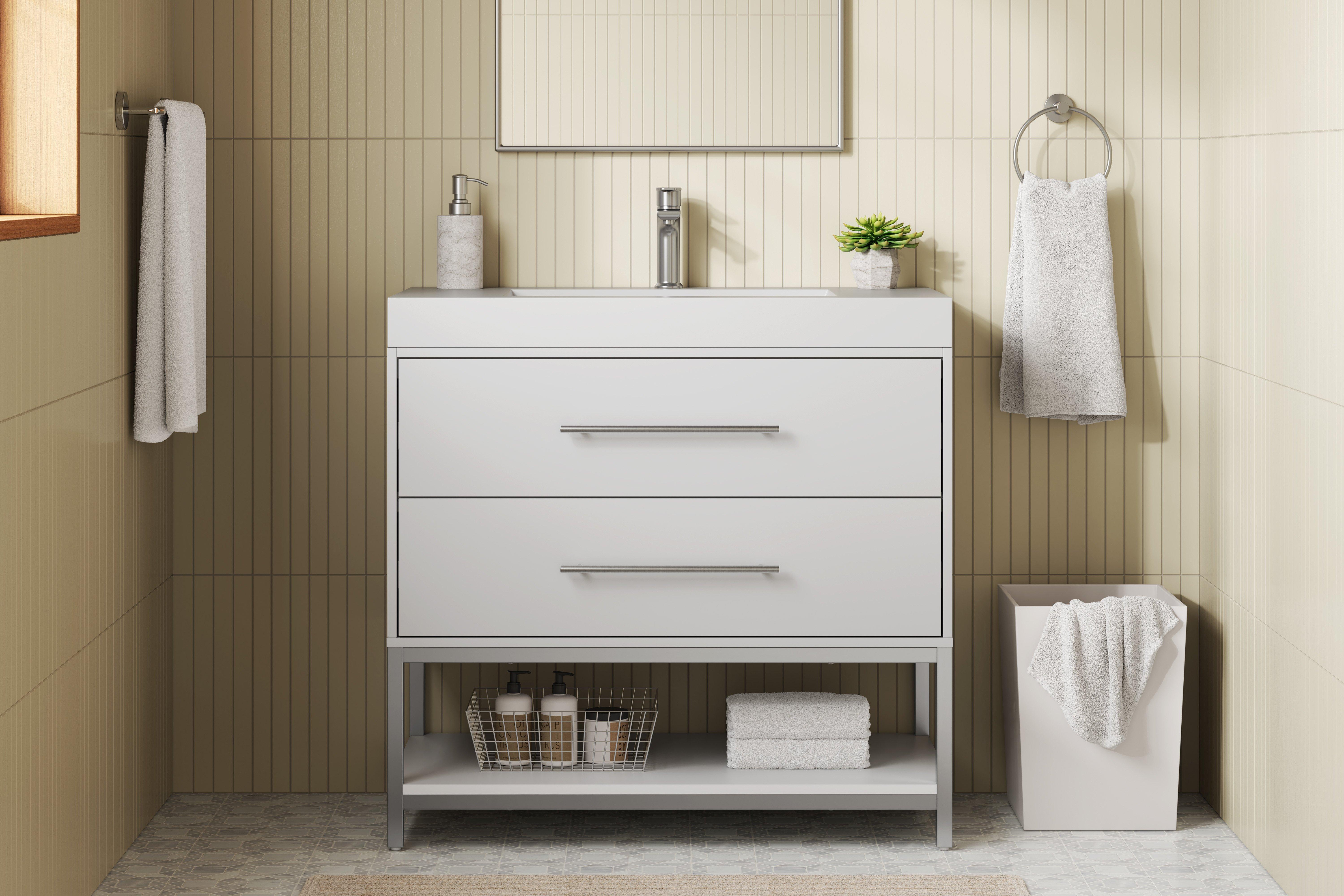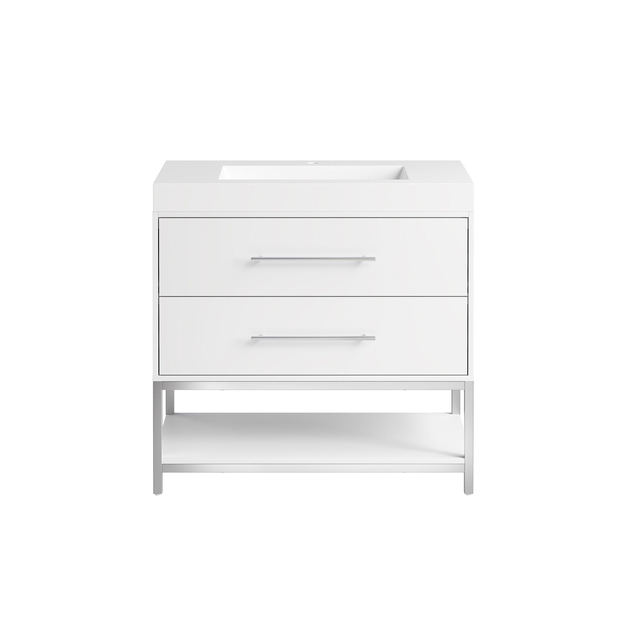 Tailor the look of your bathroom with the Brookwood 36 in. White Vanity with Engineered Stone Top featuring gorgeous mdf in white with 0 doors, 2 drawers, and 1 shelves. This piece is completed with beautiful brushed nickel hardware and a single wall mounted white sink. The Brookwood 36 in. White Vanity with Engineered Stone Top is a stunning addition to any bathroom setting.
