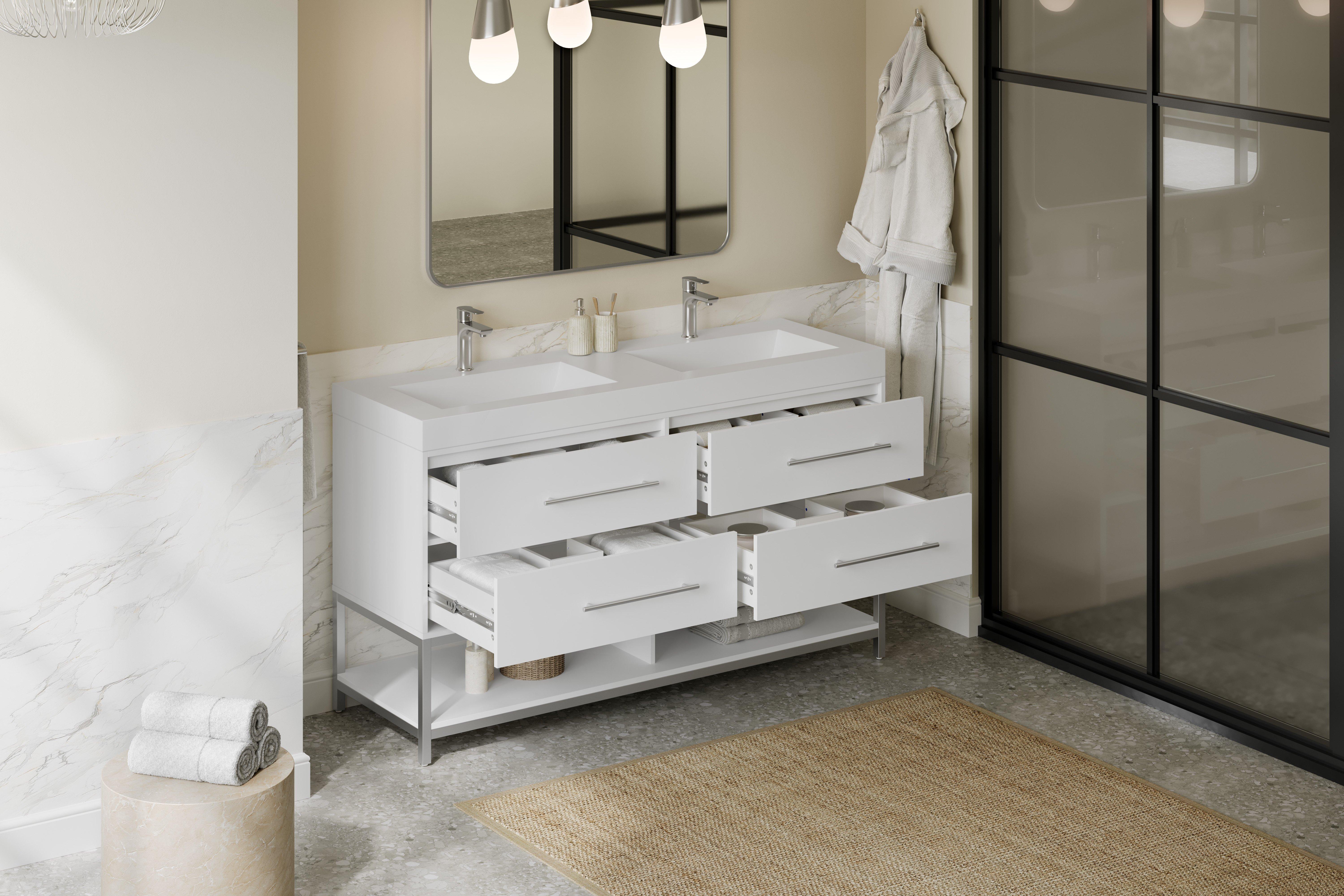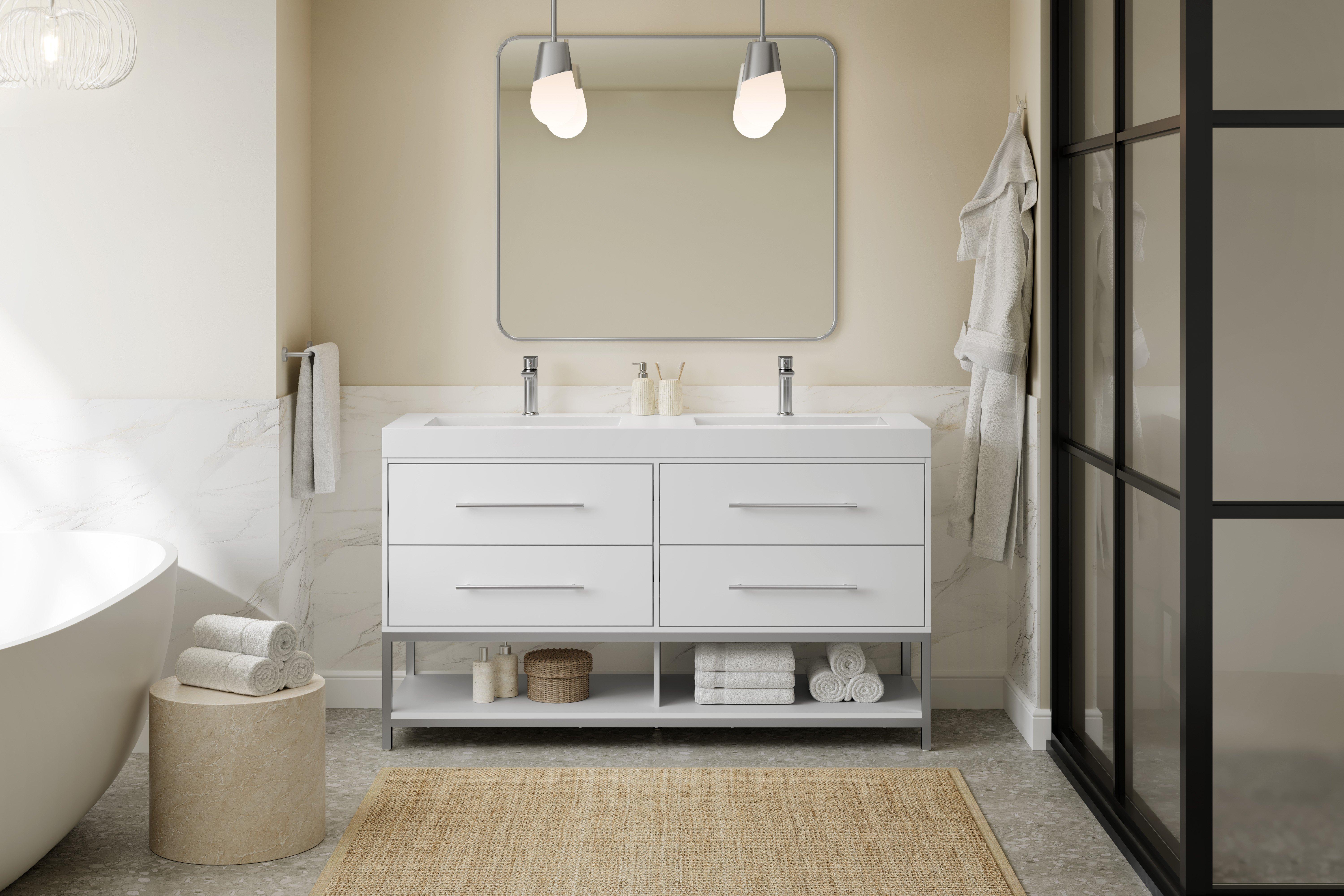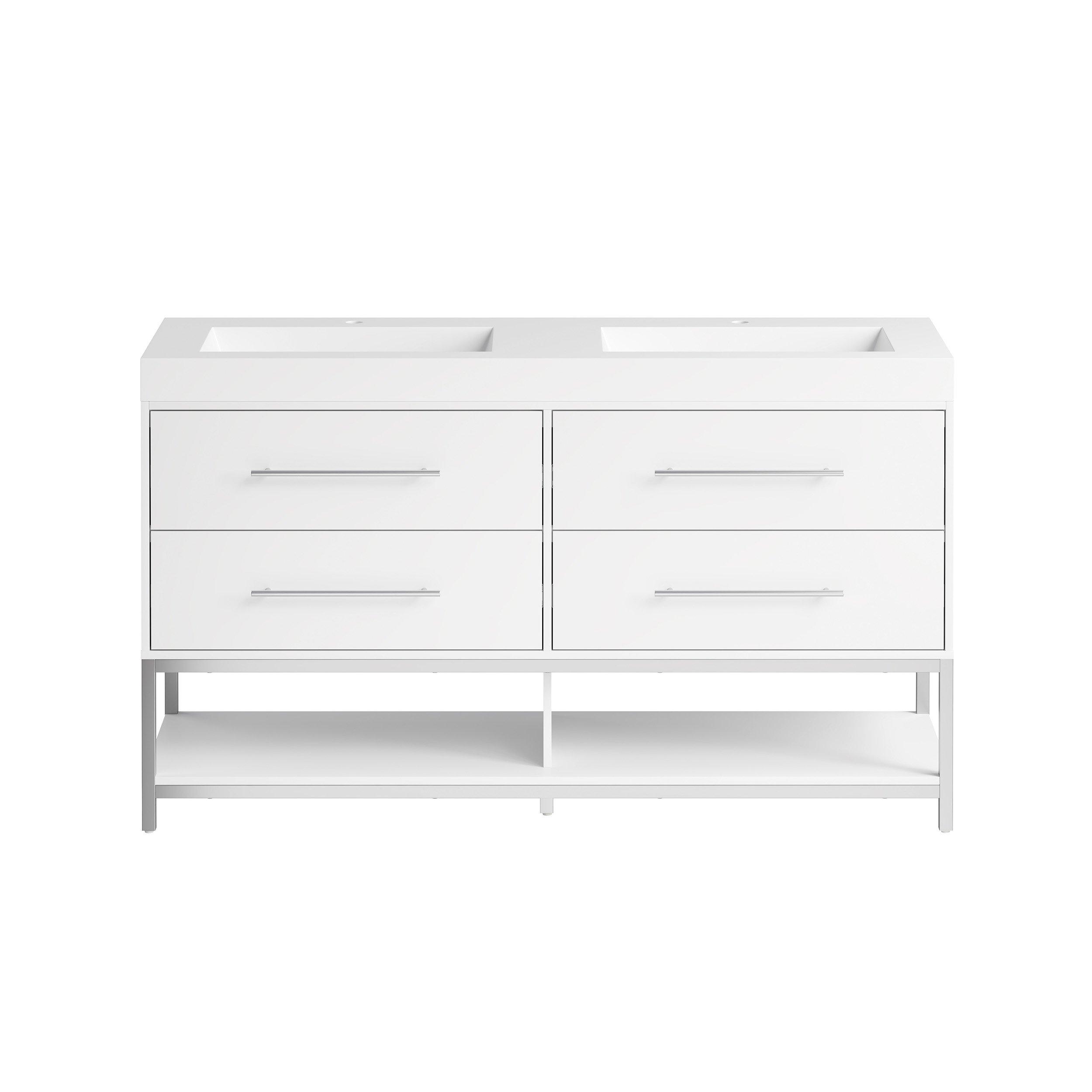 Complete your bathroom with the beautiful Brookwood 60 in. White Vanity with Engineered Stone Top. This wall mounted or freestanding features durable mdf cabinets in stunning white with a white composite vanity top and brushed n/a hardware. A charming double wall mounted sink in brilliant white is included. The Brookwood 60 in. White Vanity with Engineered Stone Top is a versatile choice to customize multiple bathroom settings.
