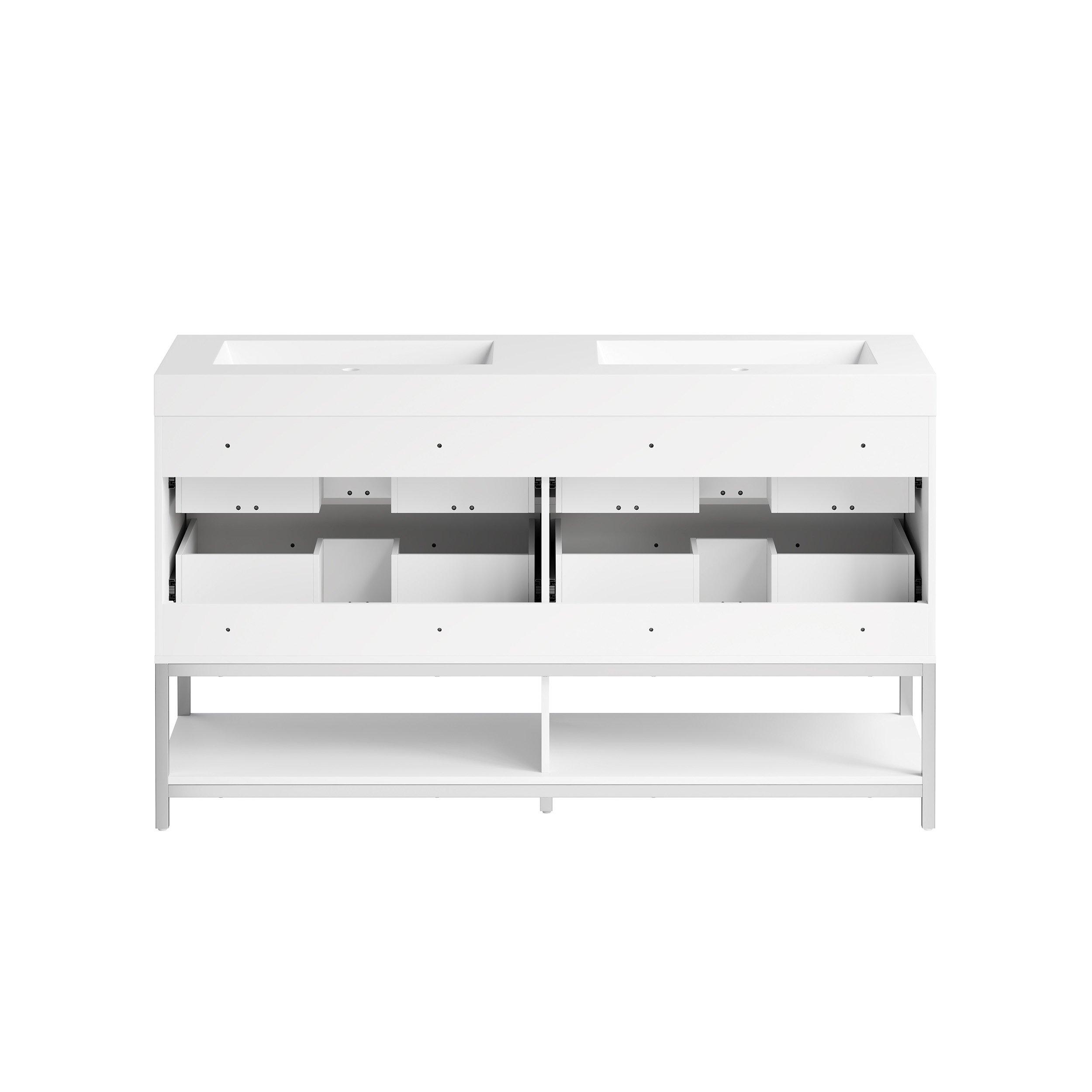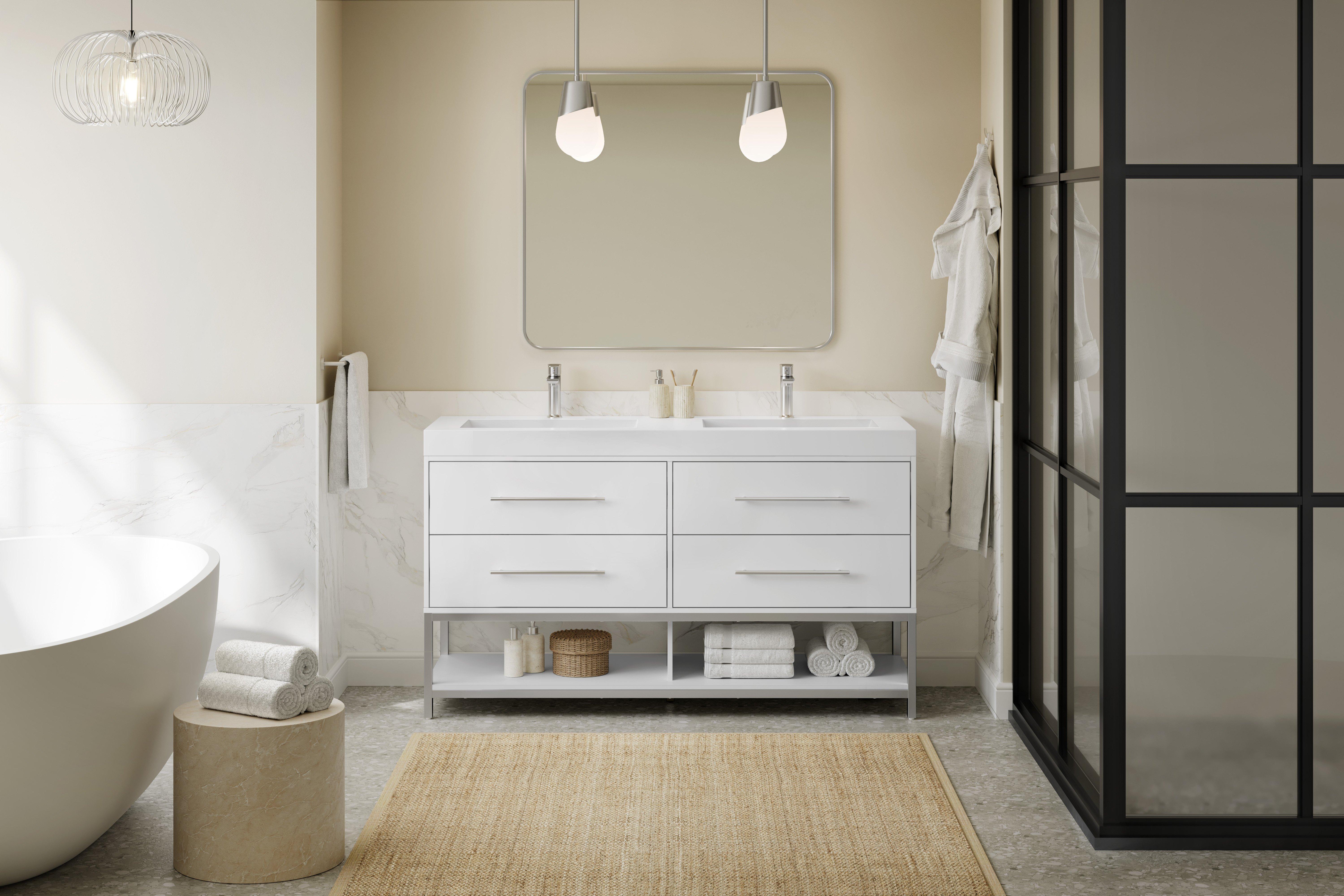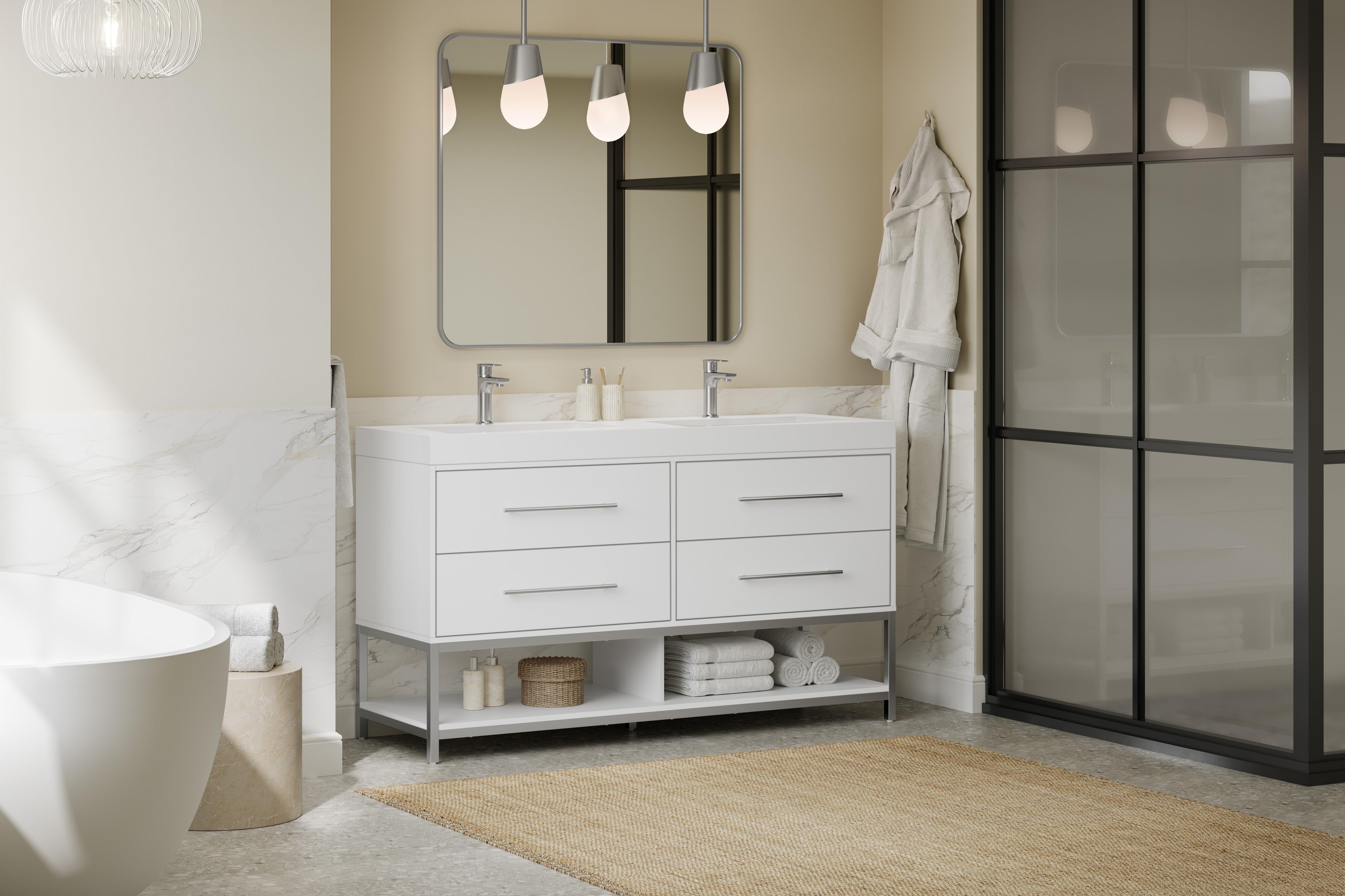 Complete your bathroom with the beautiful Brookwood 60 in. White Vanity with Engineered Stone Top. This wall mounted or freestanding features durable mdf cabinets in stunning white with a white composite vanity top and brushed n/a hardware. A charming double wall mounted sink in brilliant white is included. The Brookwood 60 in. White Vanity with Engineered Stone Top is a versatile choice to customize multiple bathroom settings.