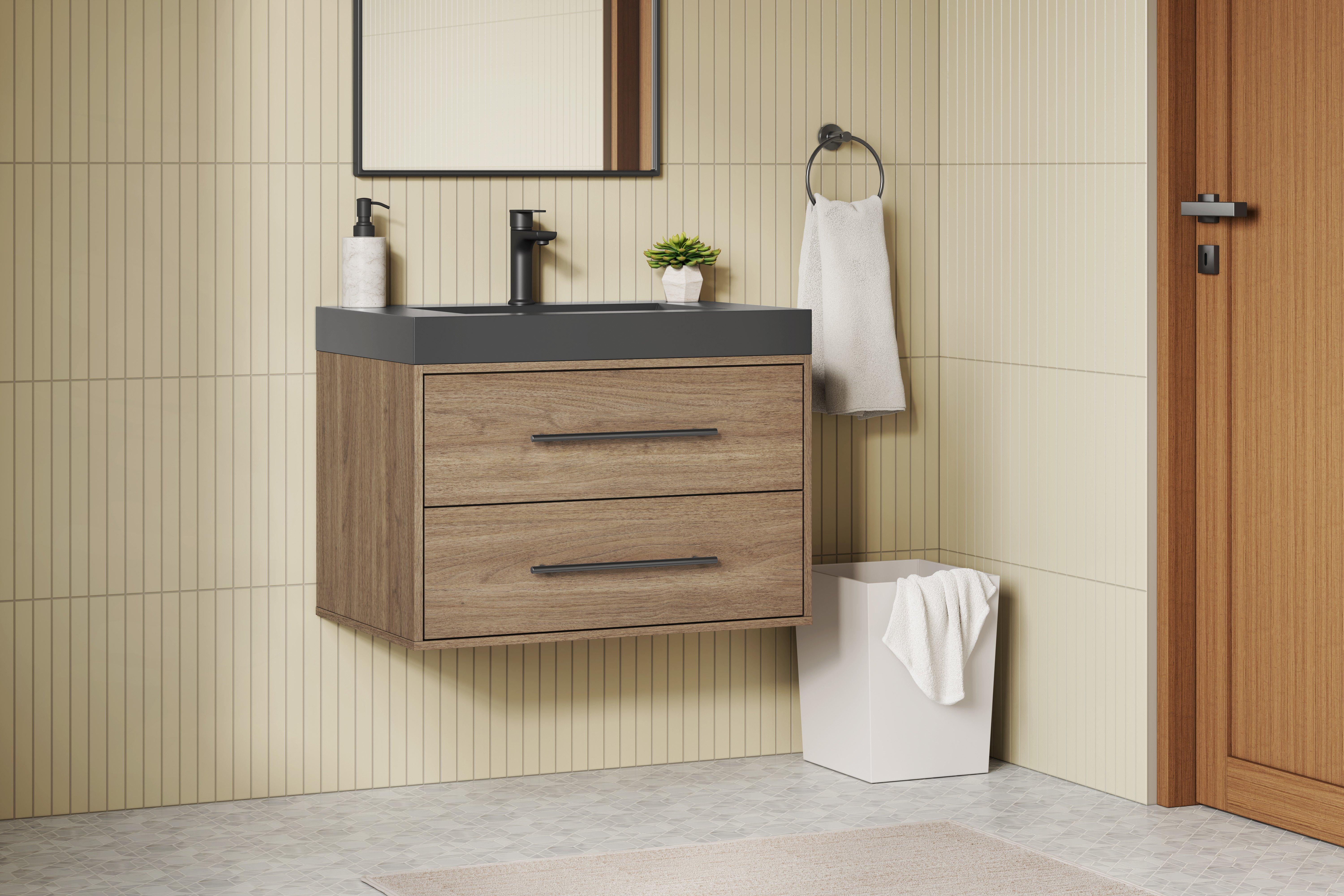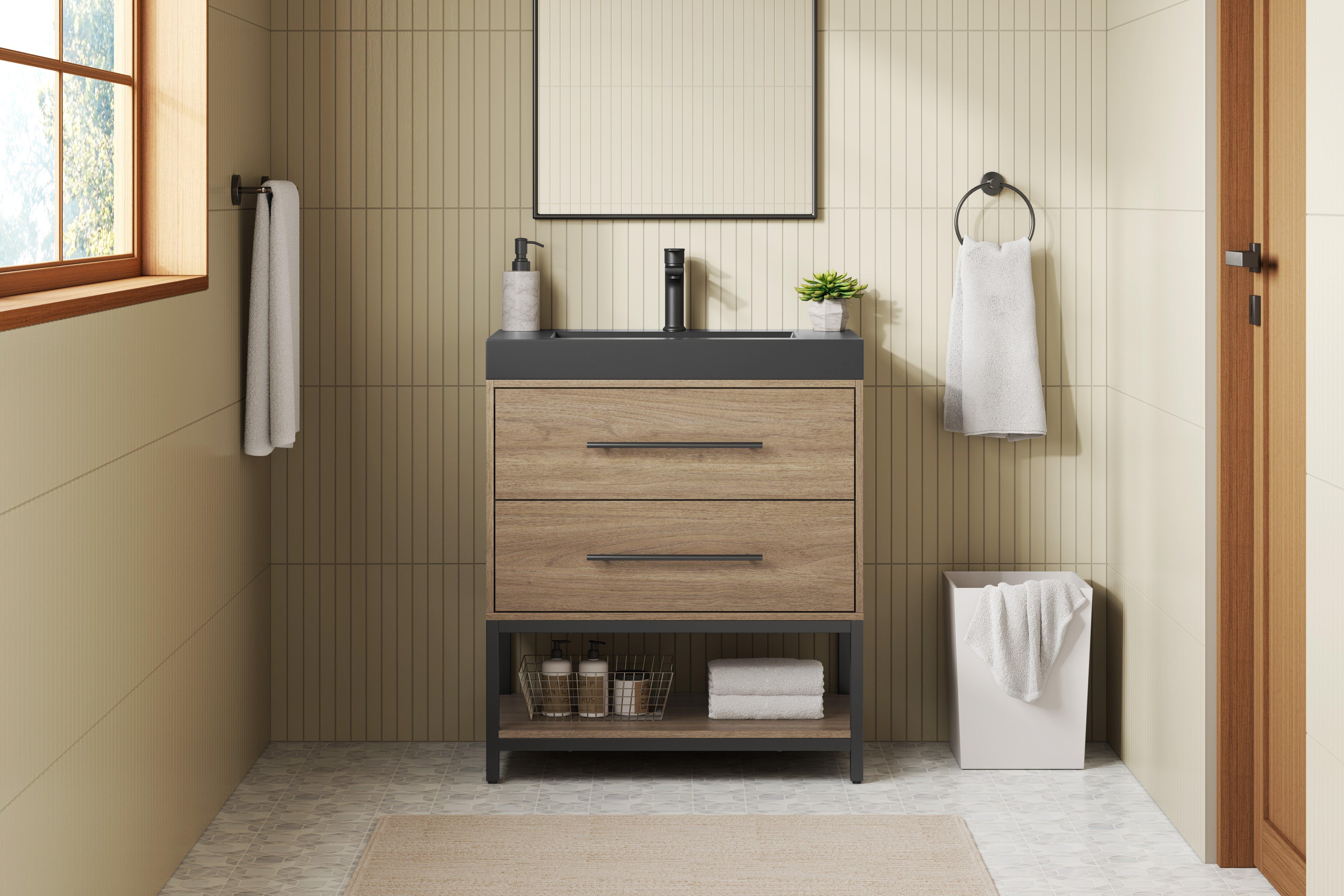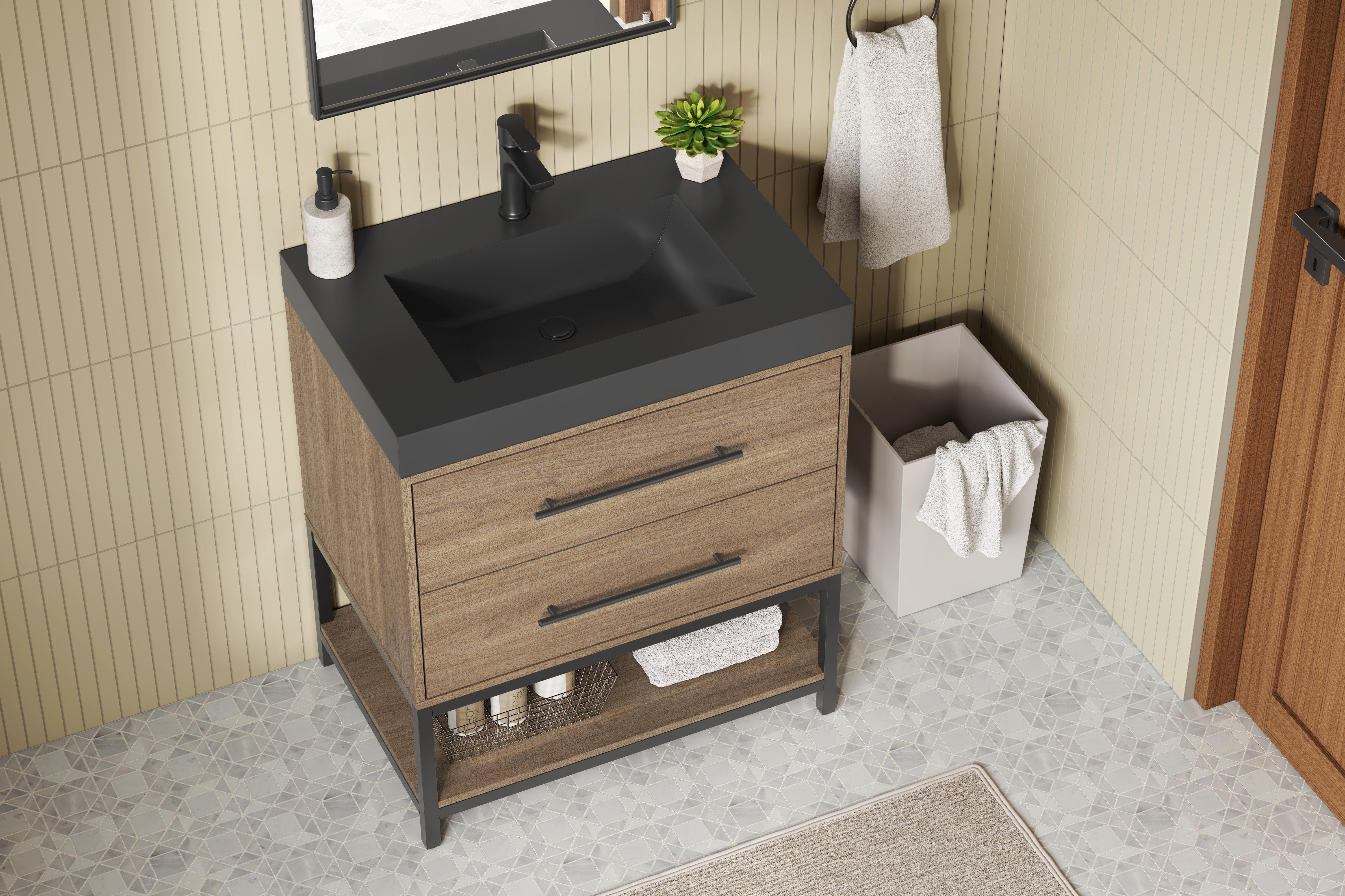 Tailor the look of your bathroom with the Brookwood 30 in. Natural Brown Vanity with Engineered Stone Top featuring gorgeous mdf in brown with 0 doors, 2 drawers, and 1 shelves. This piece is completed with beautiful matte black hardware and a single wall mounted black sink. The Brookwood 30 in. Natural Brown Vanity with Engineered Stone Top is a stunning addition to any bathroom setting.
