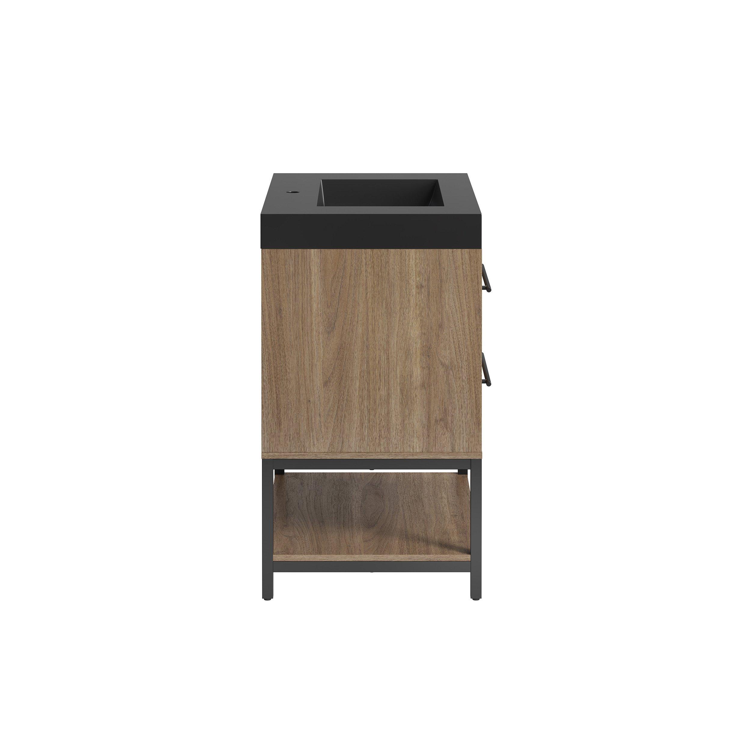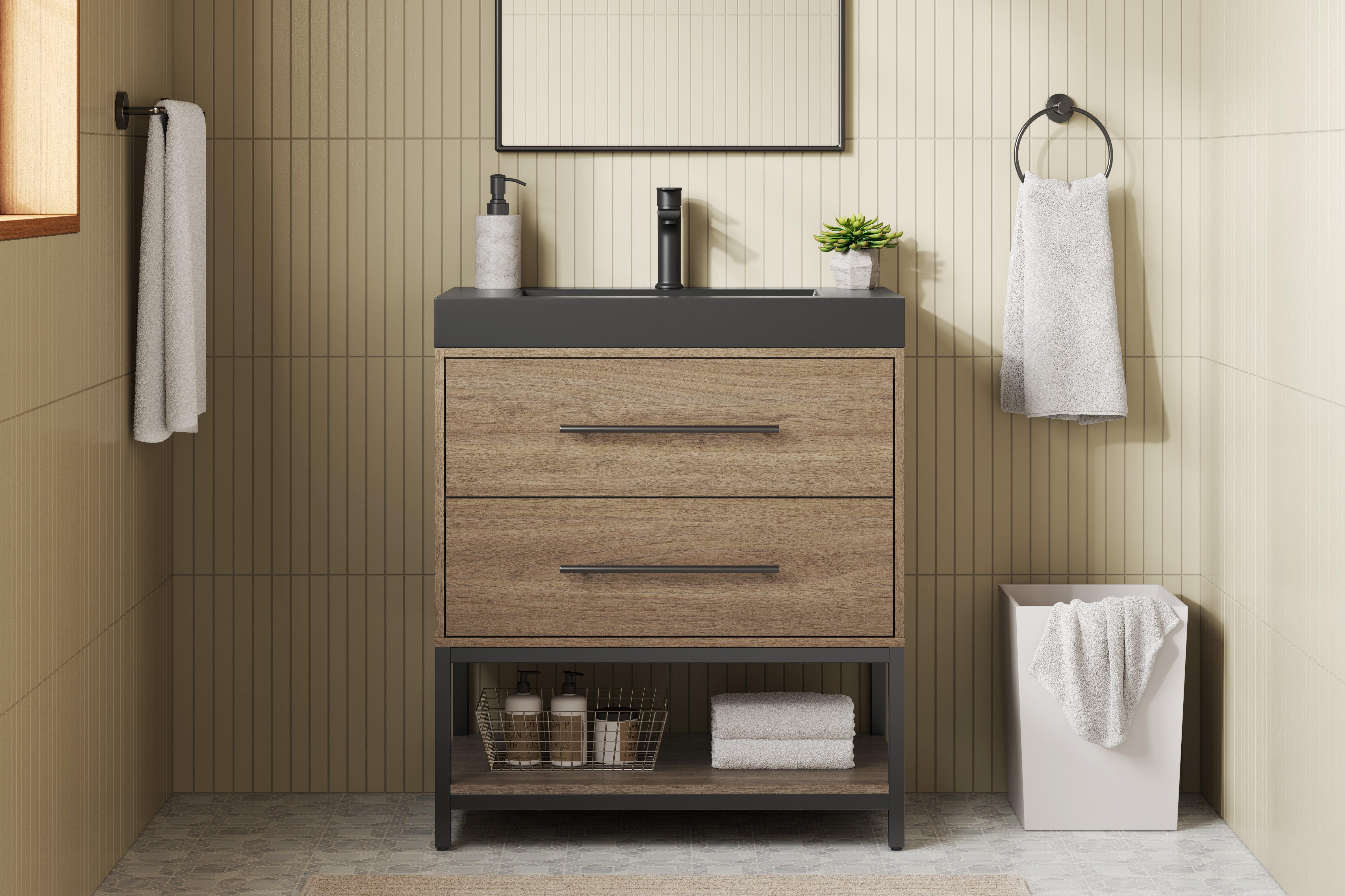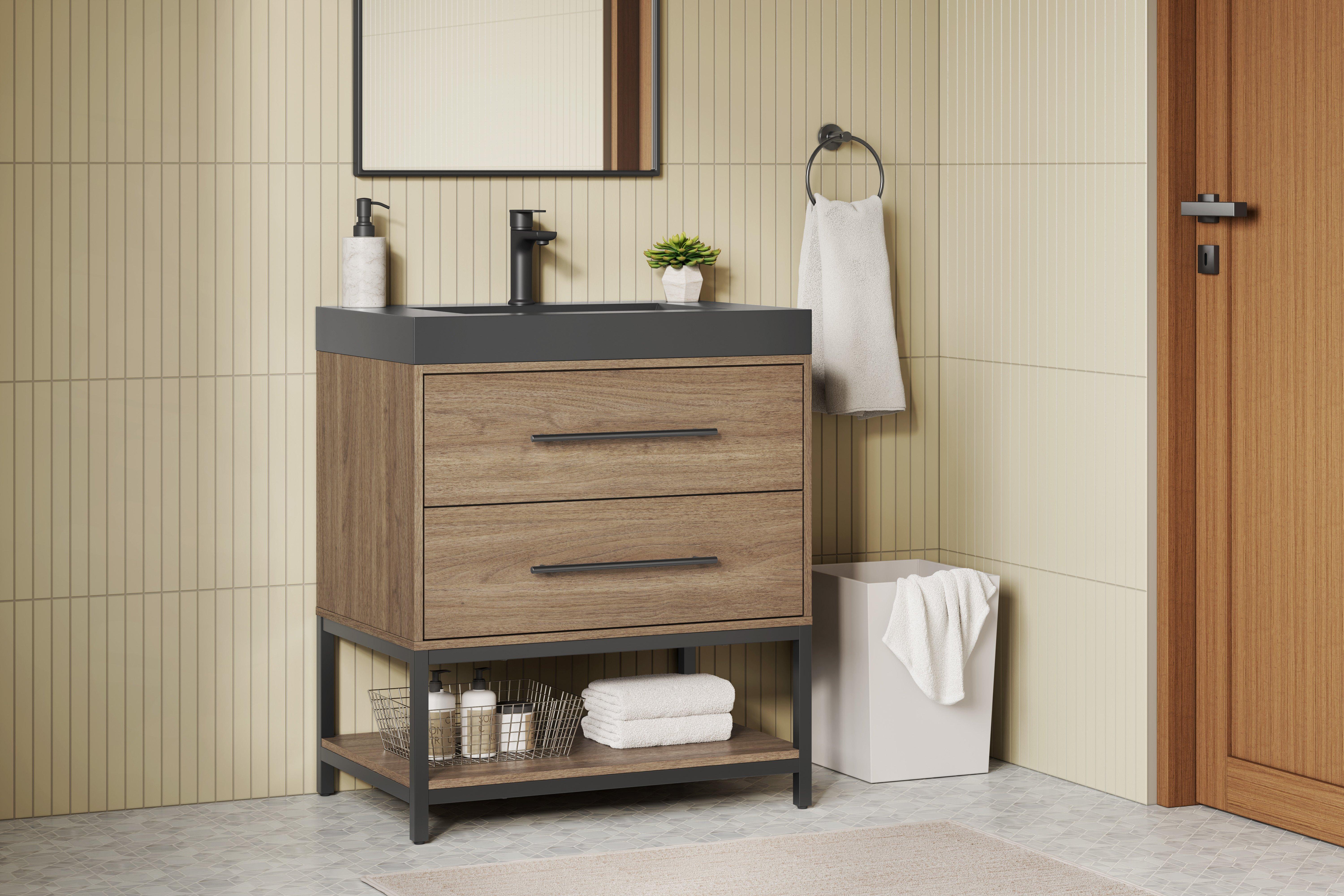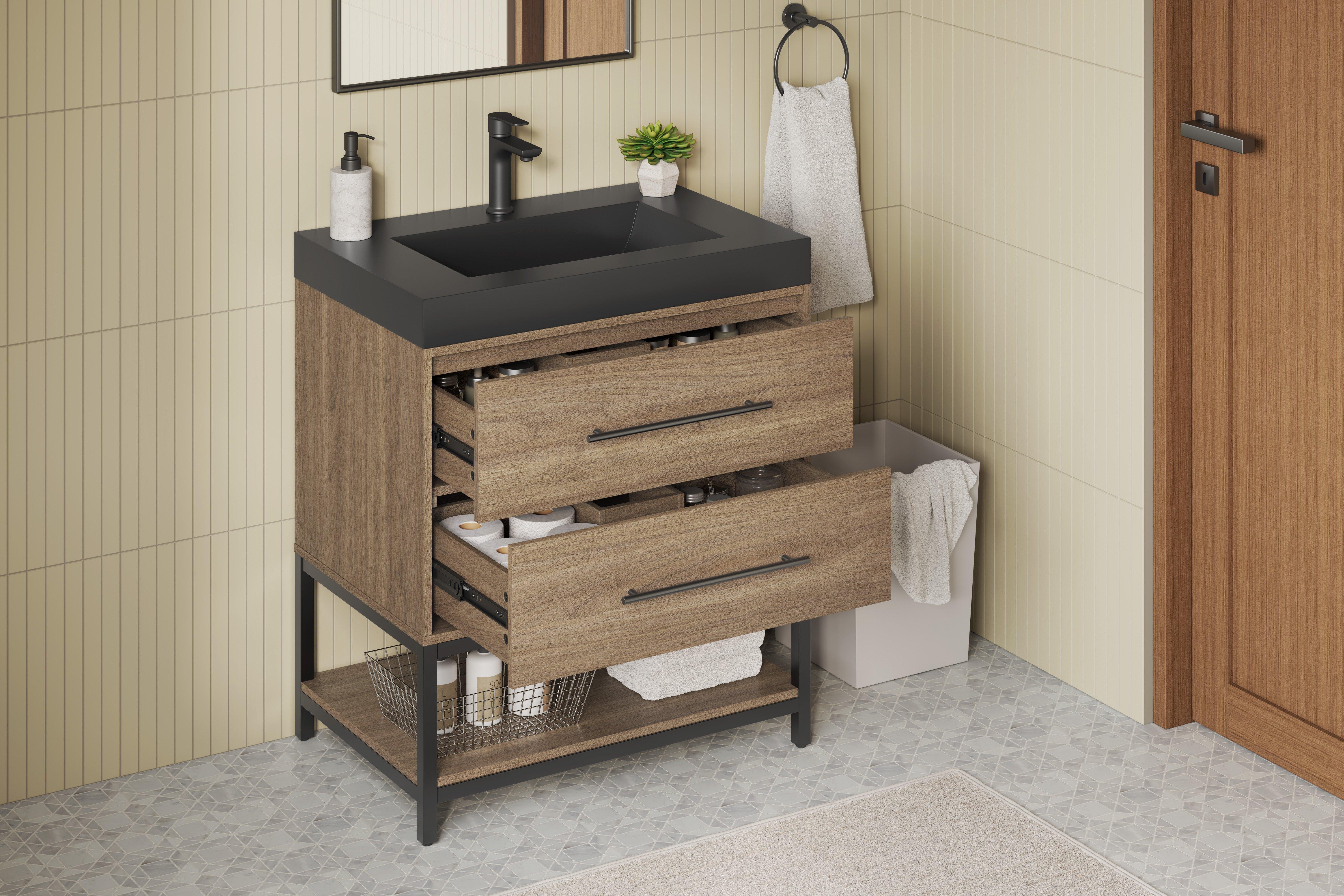 Tailor the look of your bathroom with the Brookwood 30 in. Natural Brown Vanity with Engineered Stone Top featuring gorgeous mdf in brown with 0 doors, 2 drawers, and 1 shelves. This piece is completed with beautiful matte black hardware and a single wall mounted black sink. The Brookwood 30 in. Natural Brown Vanity with Engineered Stone Top is a stunning addition to any bathroom setting.
